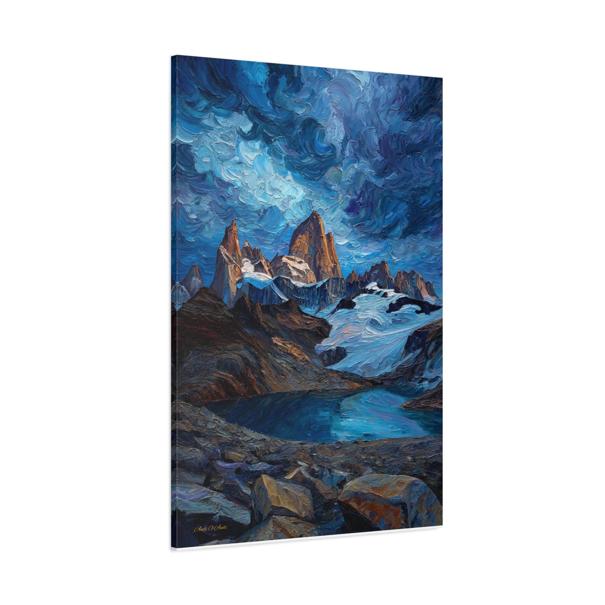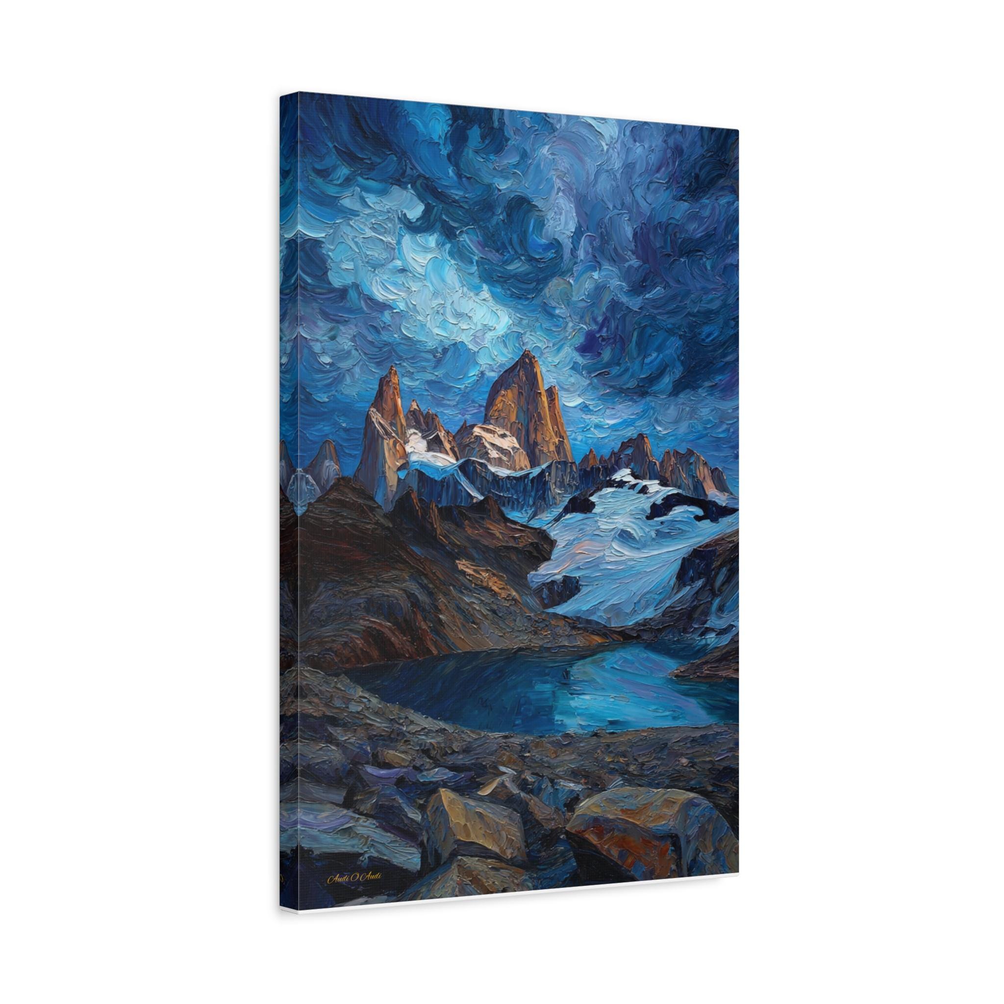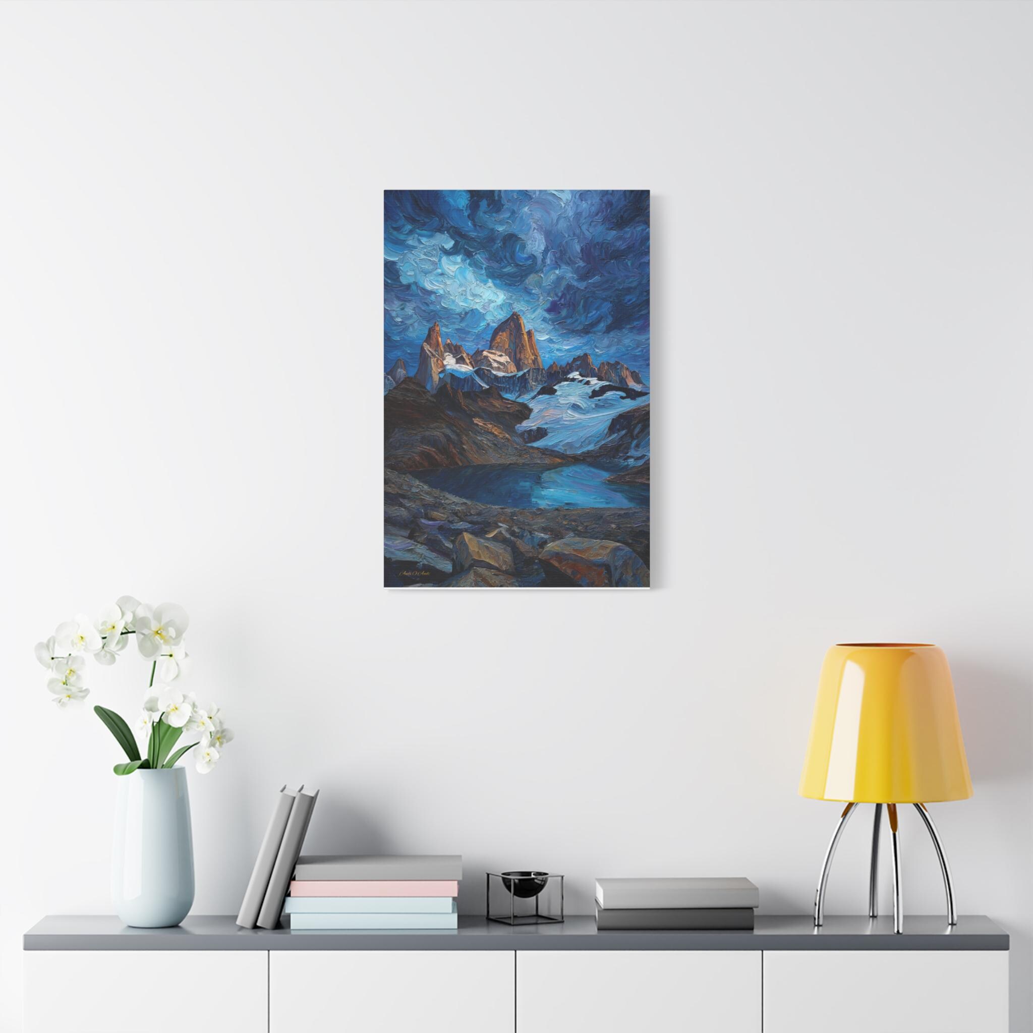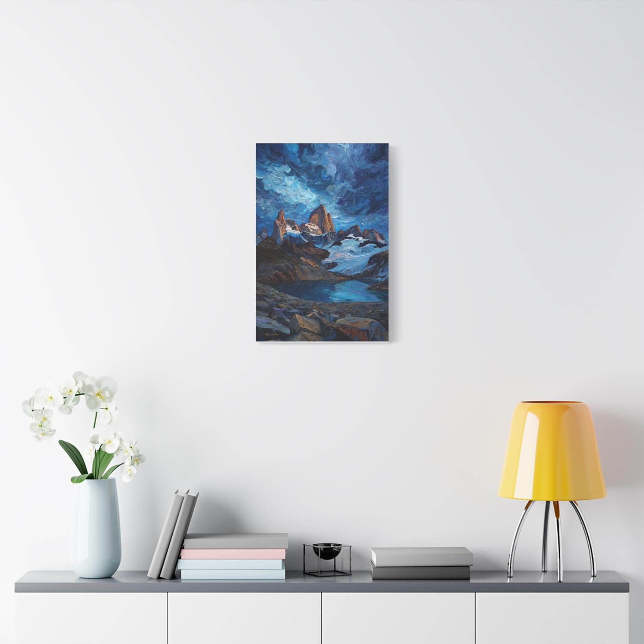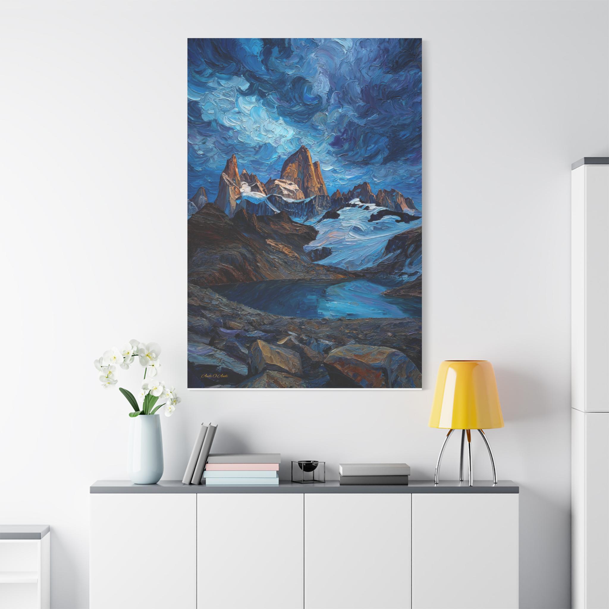 Bring the spirit of adventure into your home with this epic canvas print of a mountain wilderness. This dramatic vertical artwork captures a jagged mountain range piercing a swirling, Van Gogh-style sky, with the peaks glowing in the warm light of sunrise. Below, a crystal-clear glacial lake reflects the deep blues and turquoises of the scene, framed by a rugged, rocky foreground.