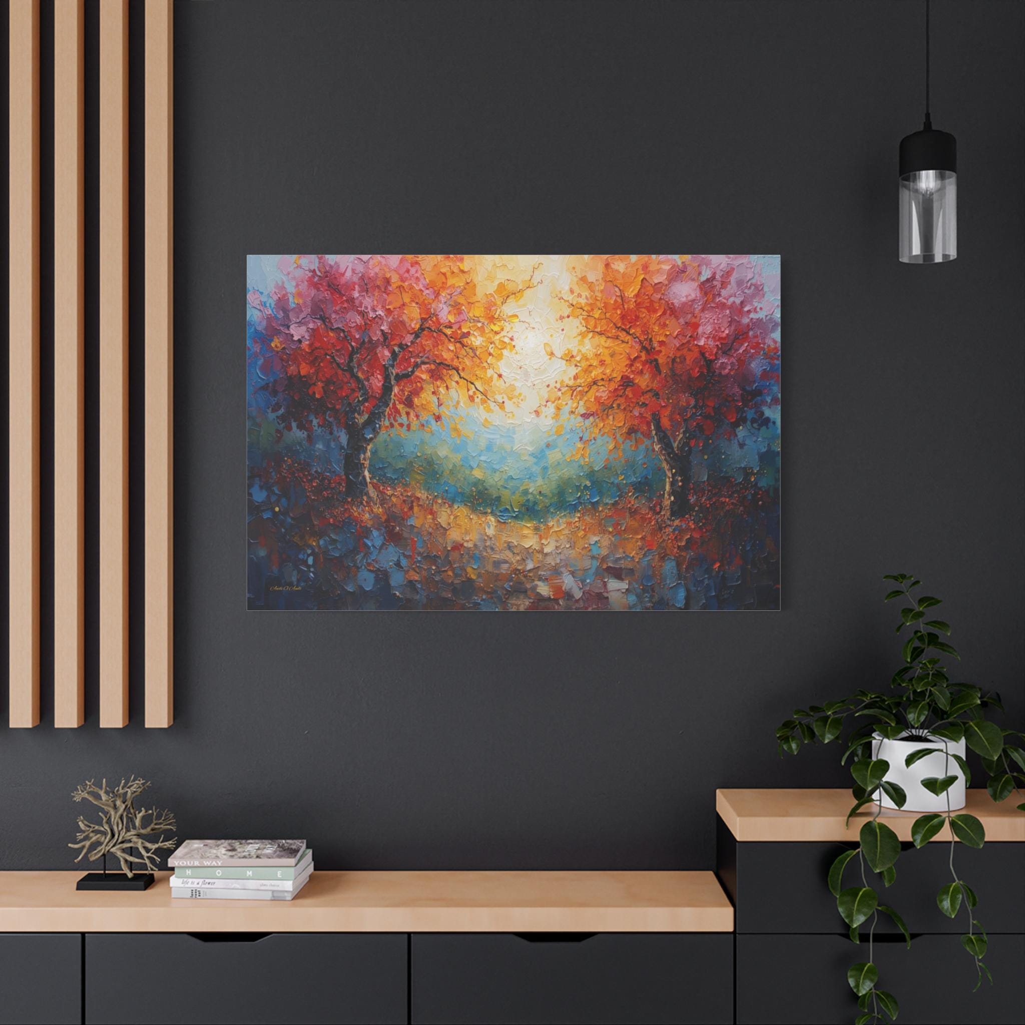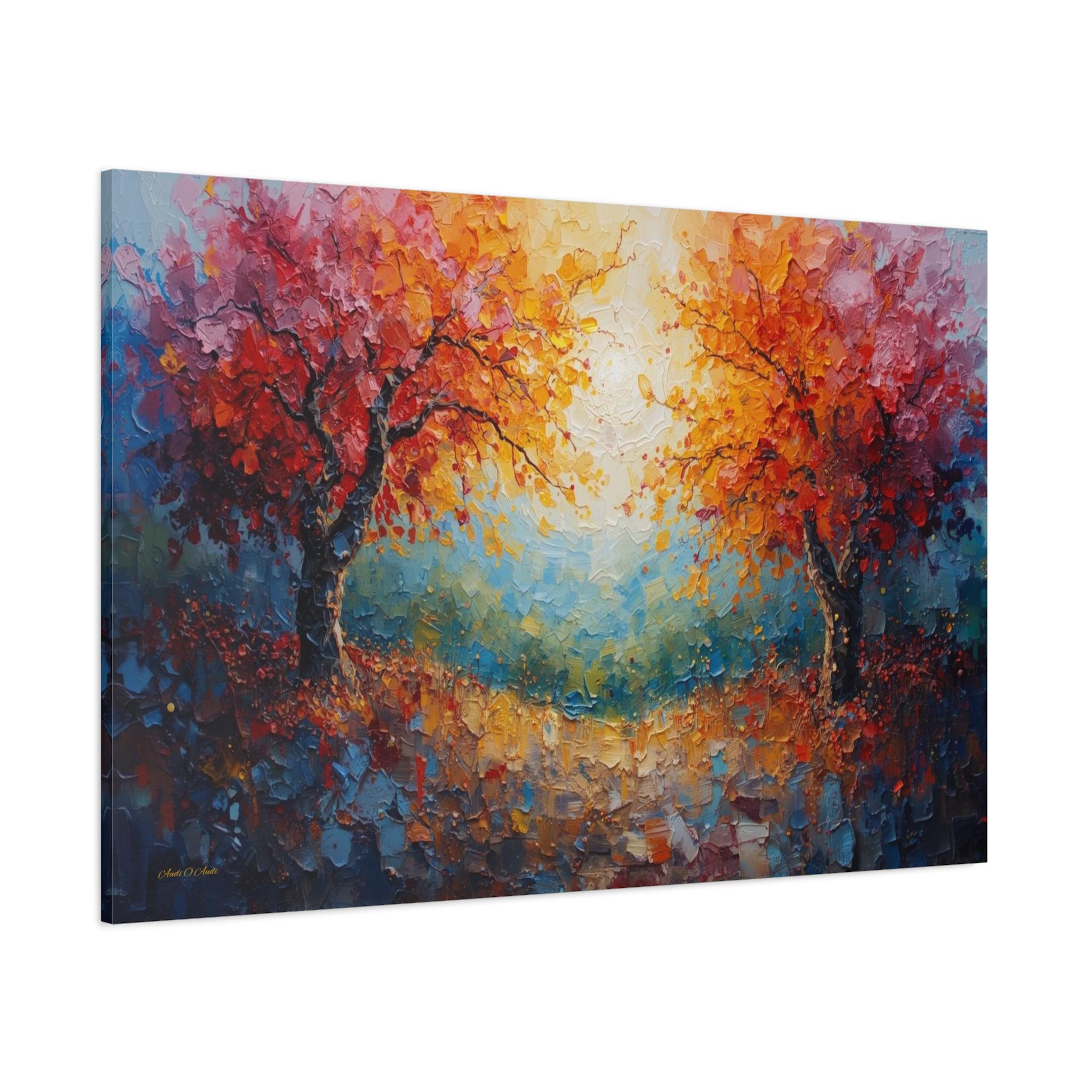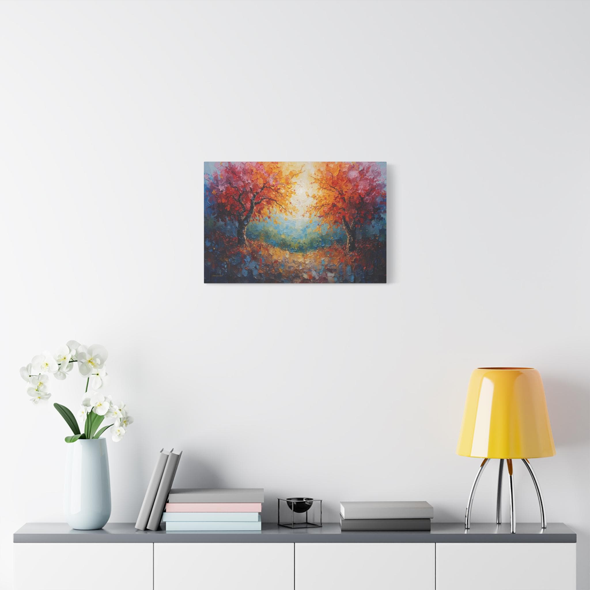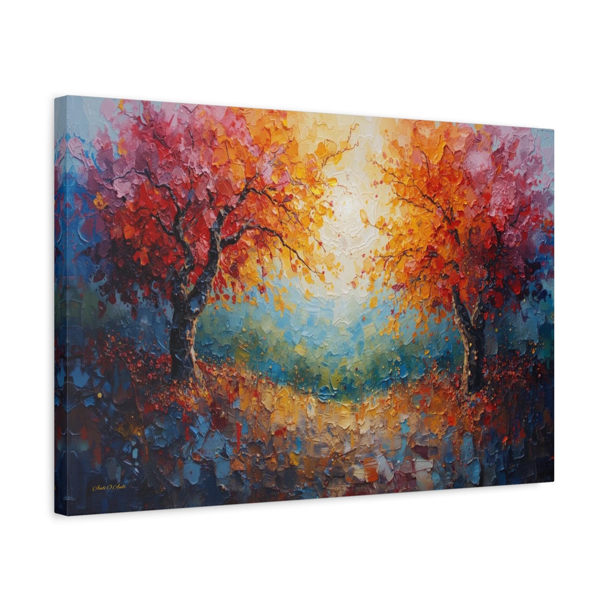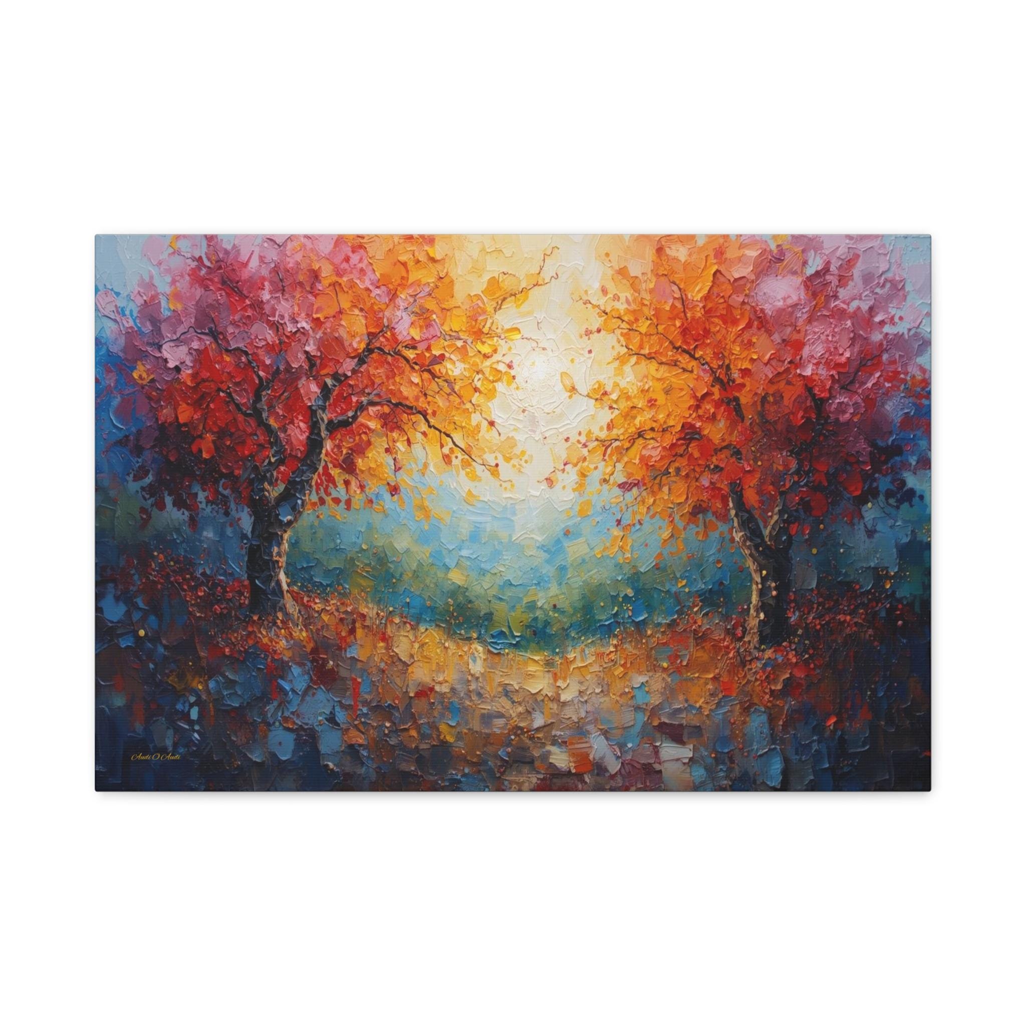 Celebrate connection and harmony with this radiant canvas print of twin trees entwined in light. This stunning abstract landscape features two majestic trees with vibrant autumn foliage—one in fiery reds and the other in golden oranges—arching towards each other to frame a glowing, sunlit center.