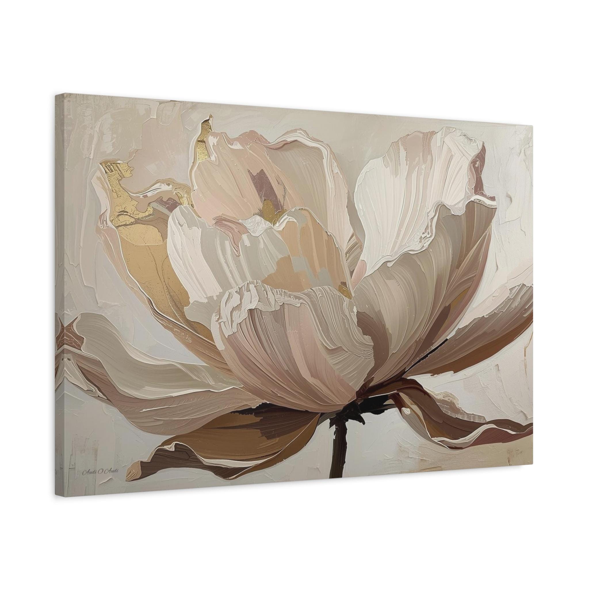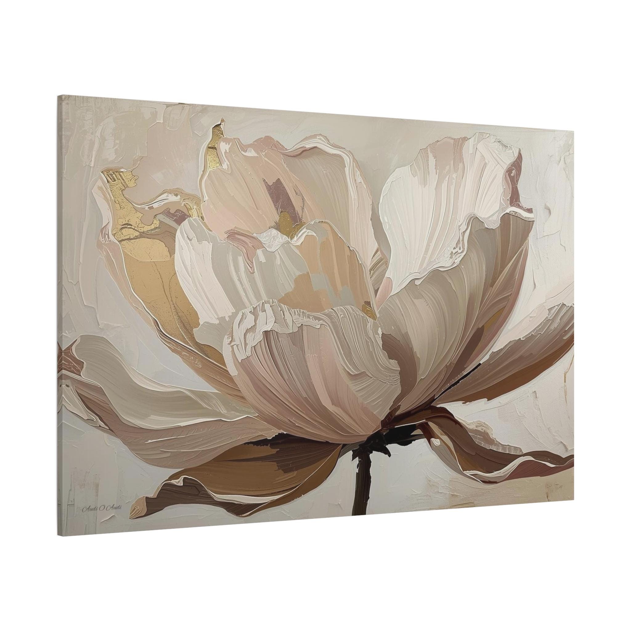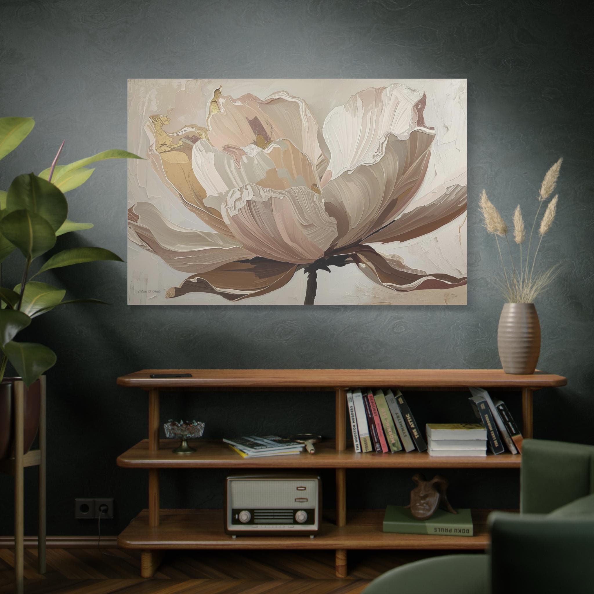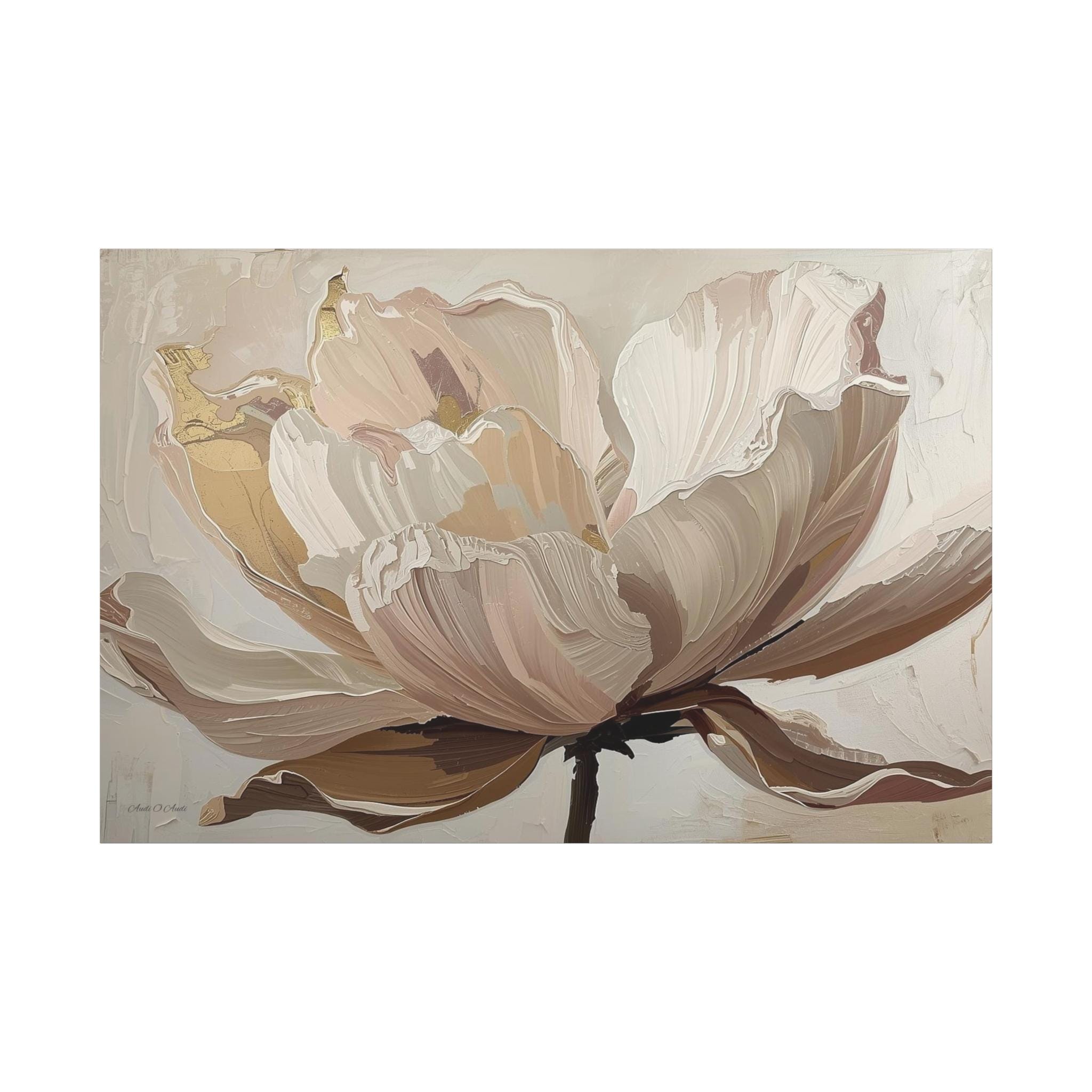 Create a stunning, peaceful focal point in your master bedroom or living room with this panoramic canvas print of an abstract cream flower. Designed specifically for wide wall spaces, this elegant artwork features a sweeping, blooming flower in soft shades of beige, champagne, and blush pink, accented with touches of gold leaf.