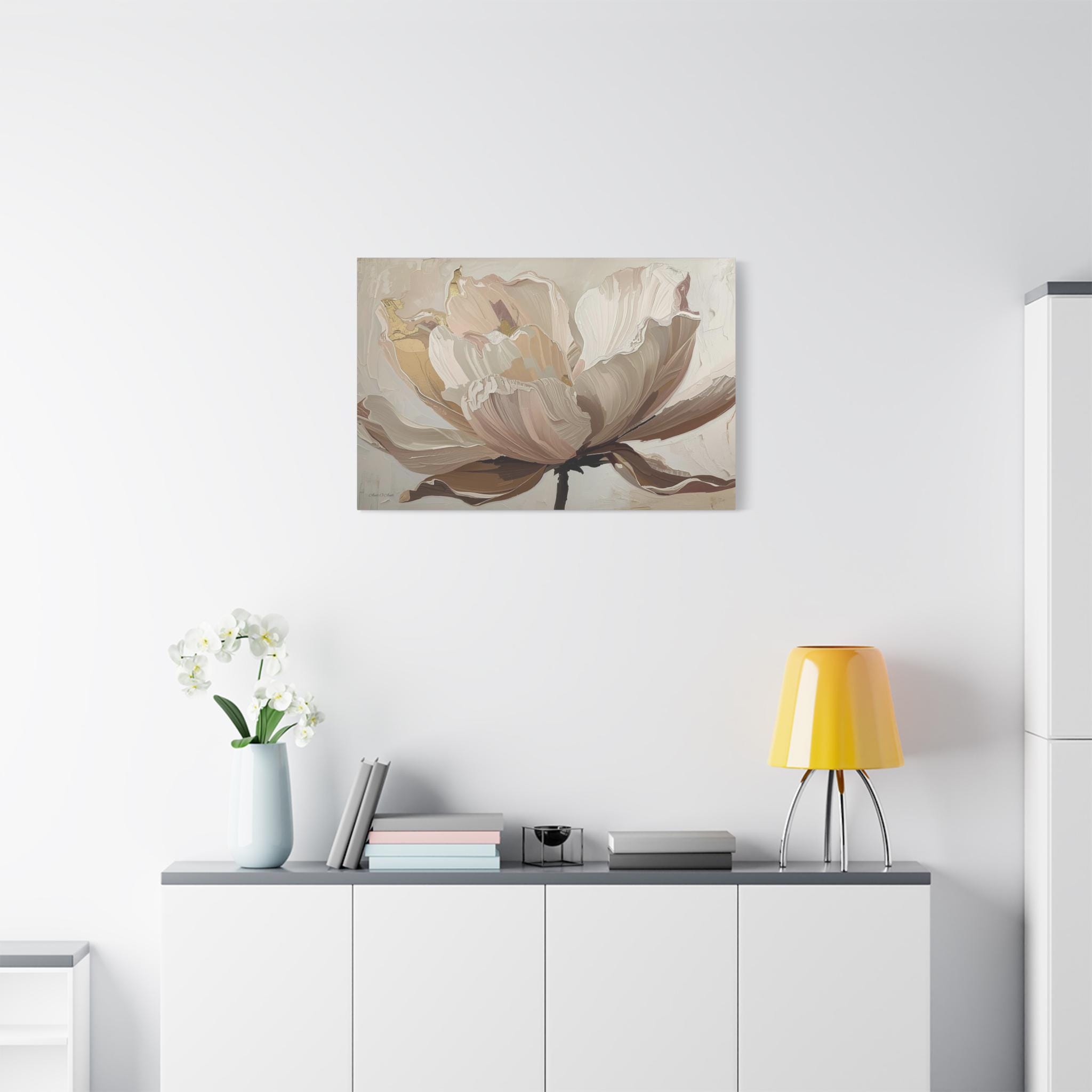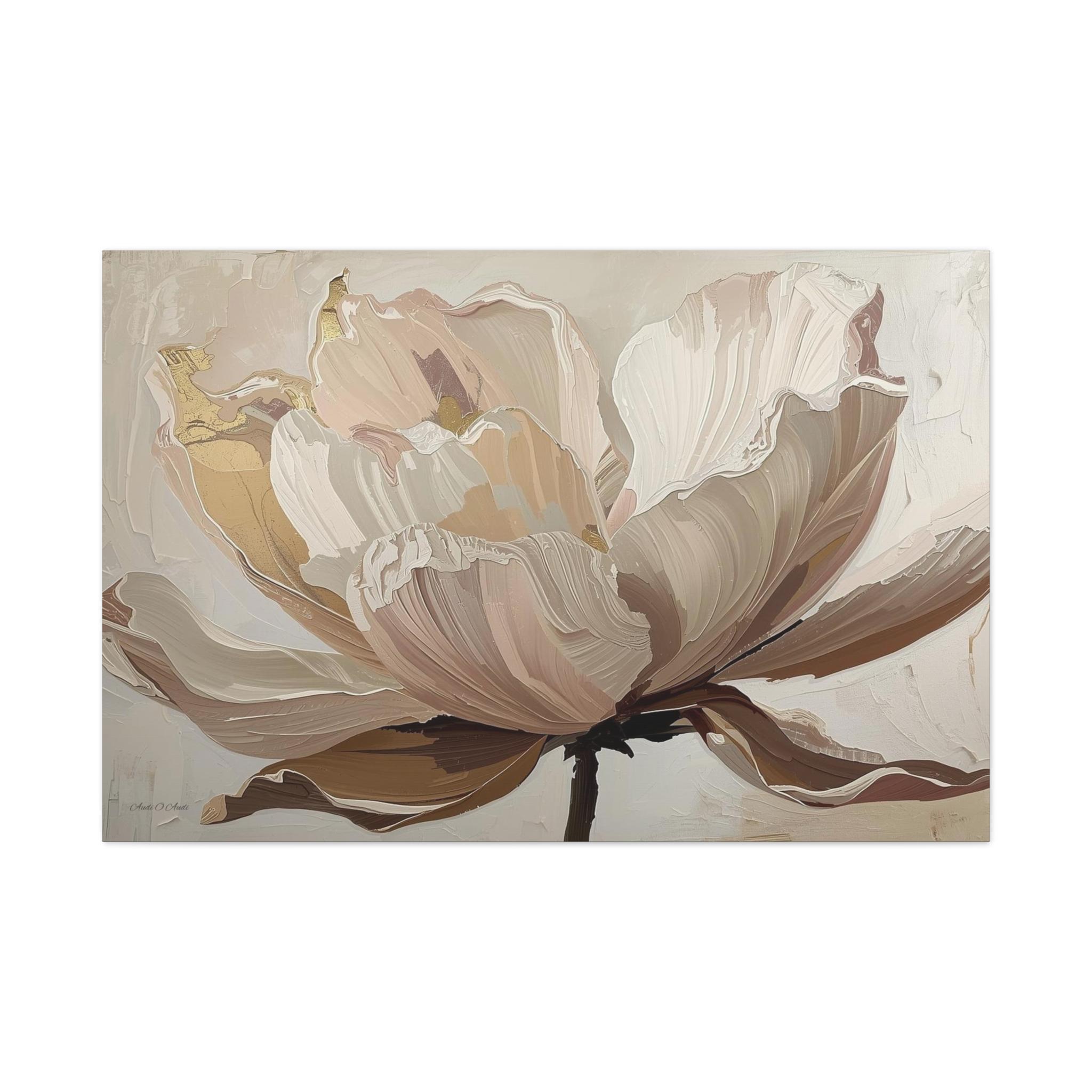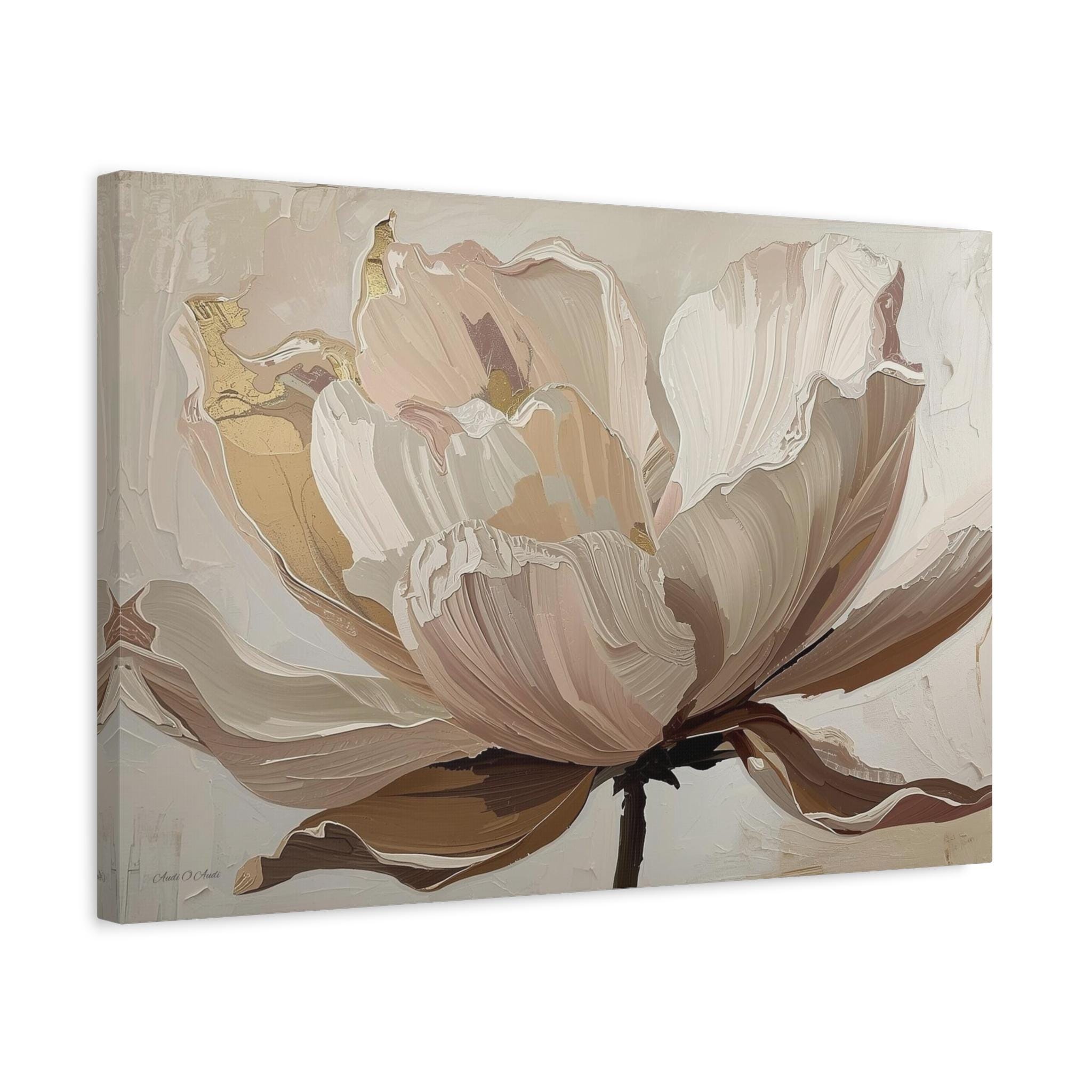 Create a stunning, peaceful focal point in your master bedroom or living room with this panoramic canvas print of an abstract cream flower. Designed specifically for wide wall spaces, this elegant artwork features a sweeping, blooming flower in soft shades of beige, champagne, and blush pink, accented with touches of gold leaf.