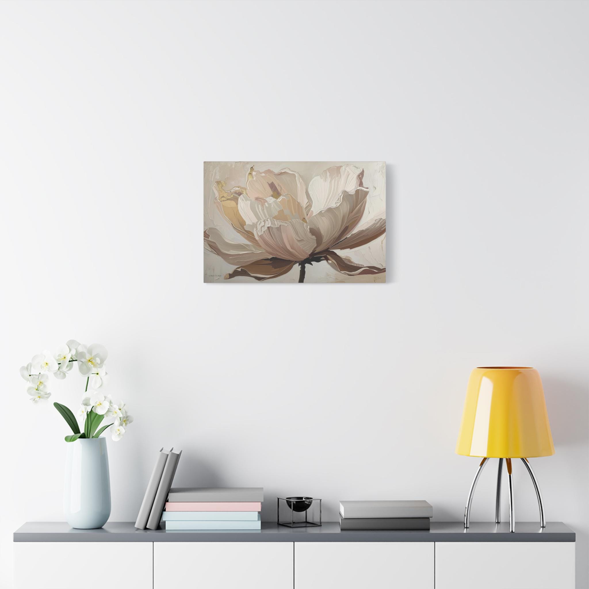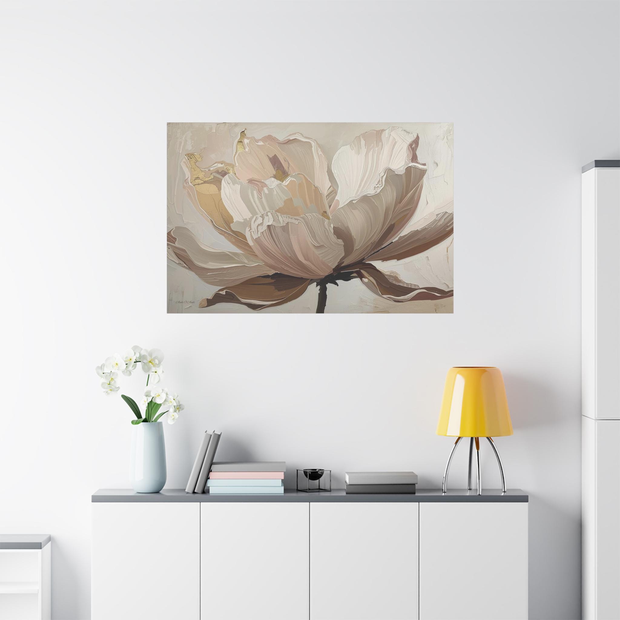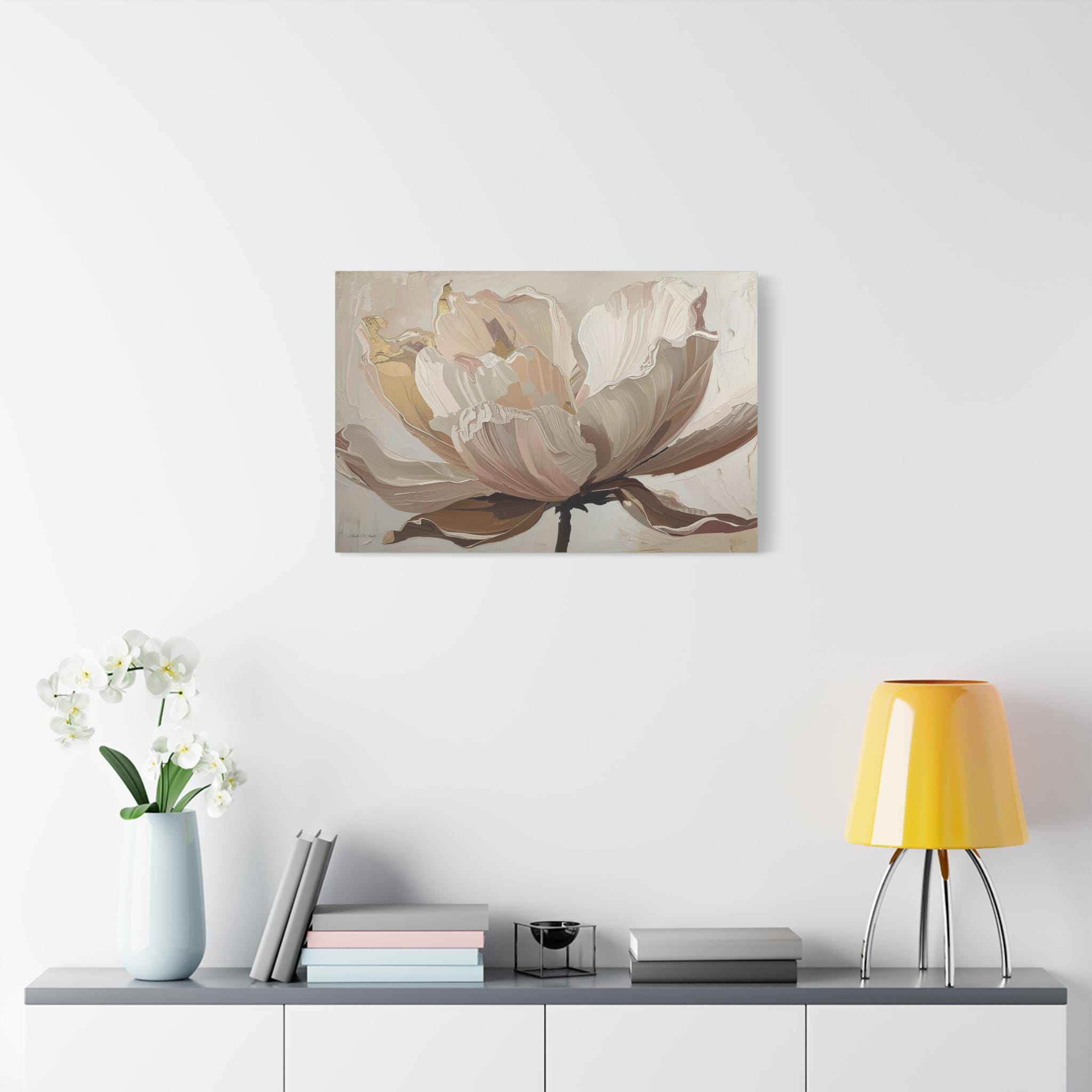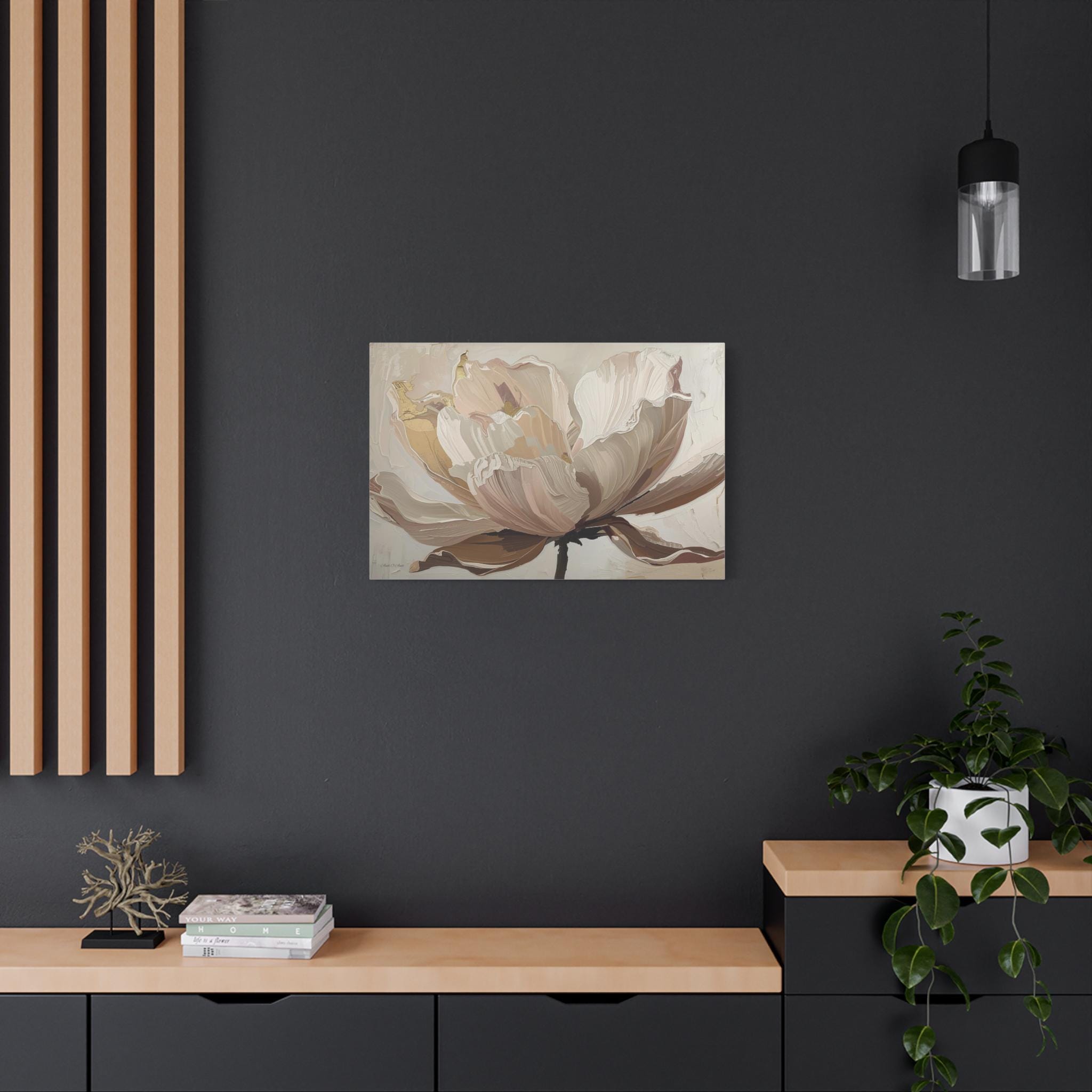 Create a stunning, peaceful focal point in your master bedroom or living room with this panoramic canvas print of an abstract cream flower. Designed specifically for wide wall spaces, this elegant artwork features a sweeping, blooming flower in soft shades of beige, champagne, and blush pink, accented with touches of gold leaf.