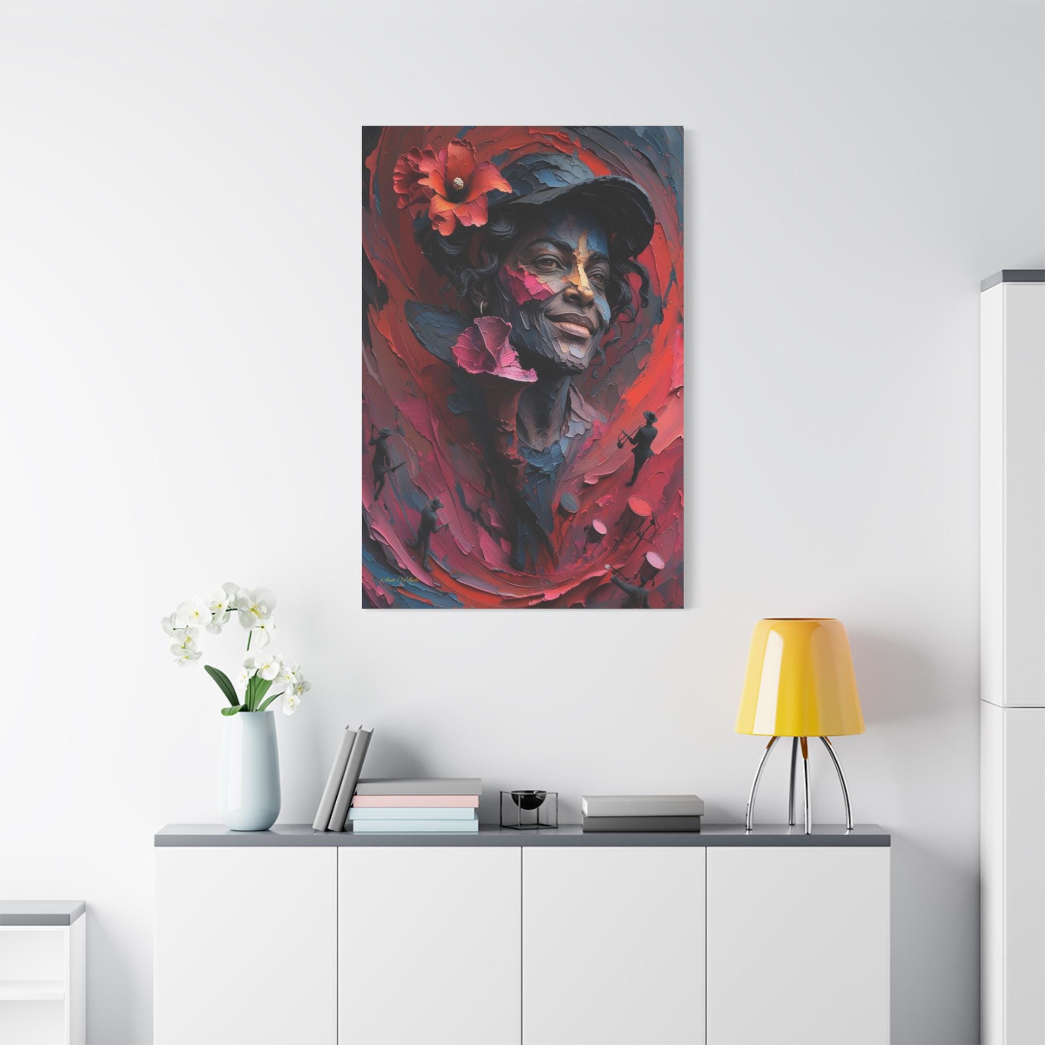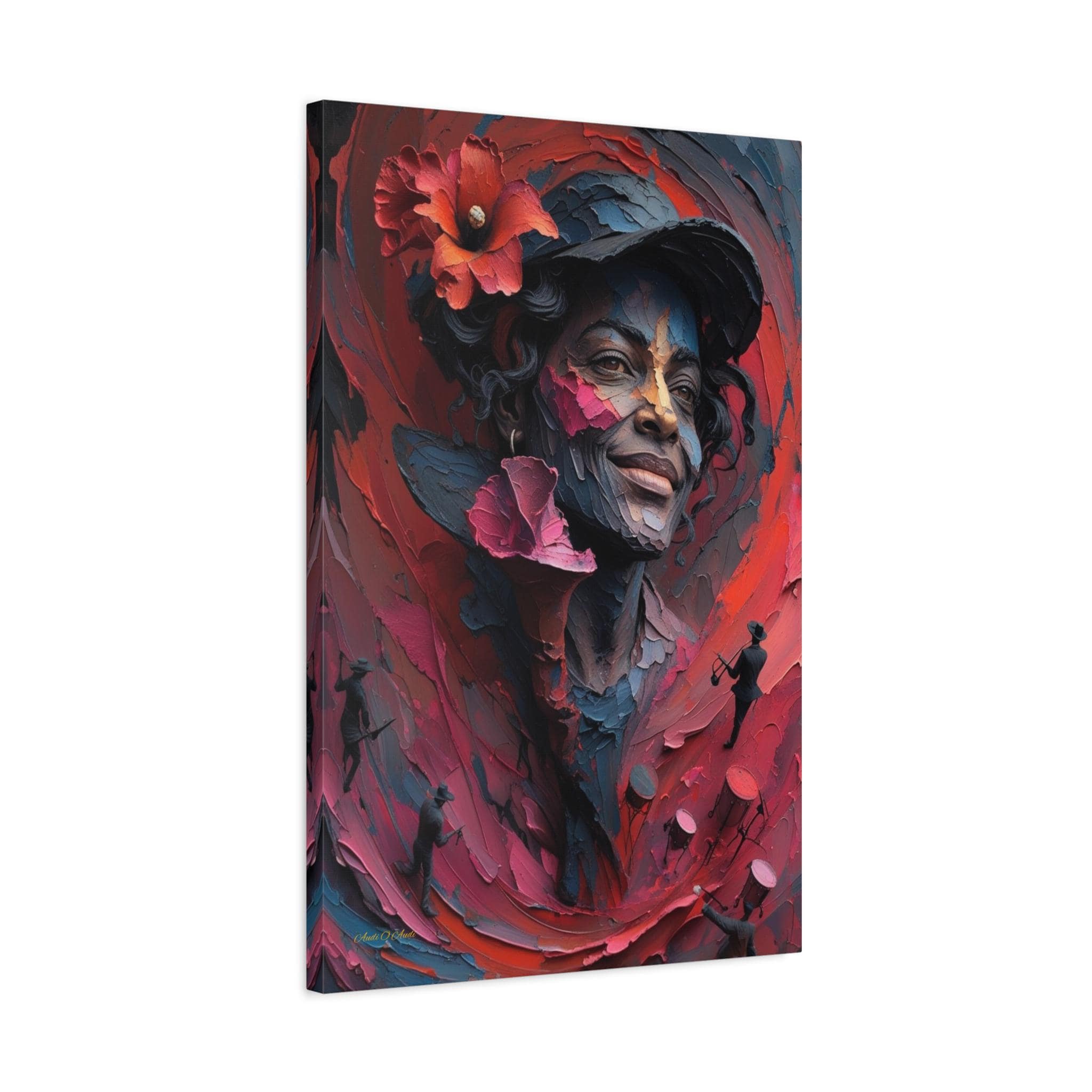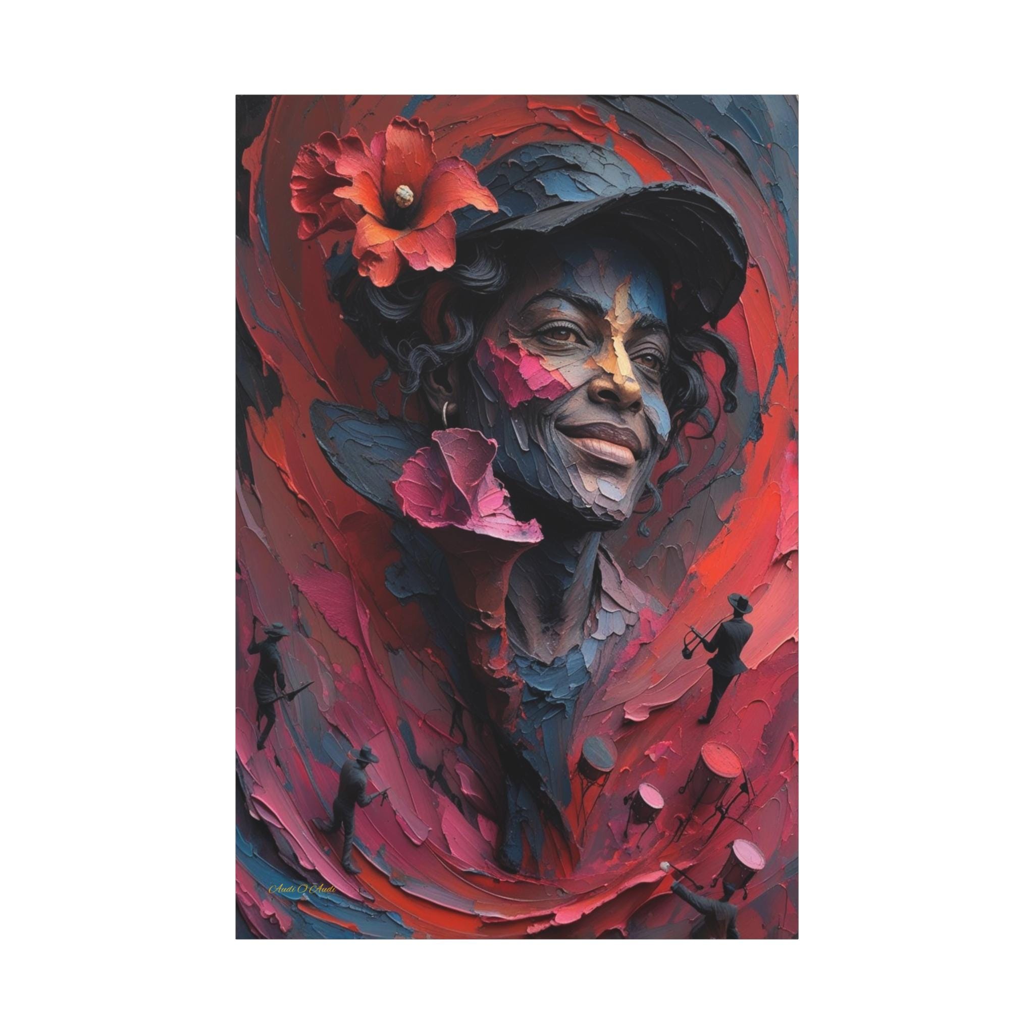 Feel the rhythm and joy of the islands with this spectacular canvas print of a musical muse. This vibrant artwork features a stunning portrait of a smiling woman wearing a hat adorned with a bold red hibiscus flower. But look closer—swirling around her in a sea of red and pink brushstrokes are energetic silhouettes of musicians playing trumpets and drums.