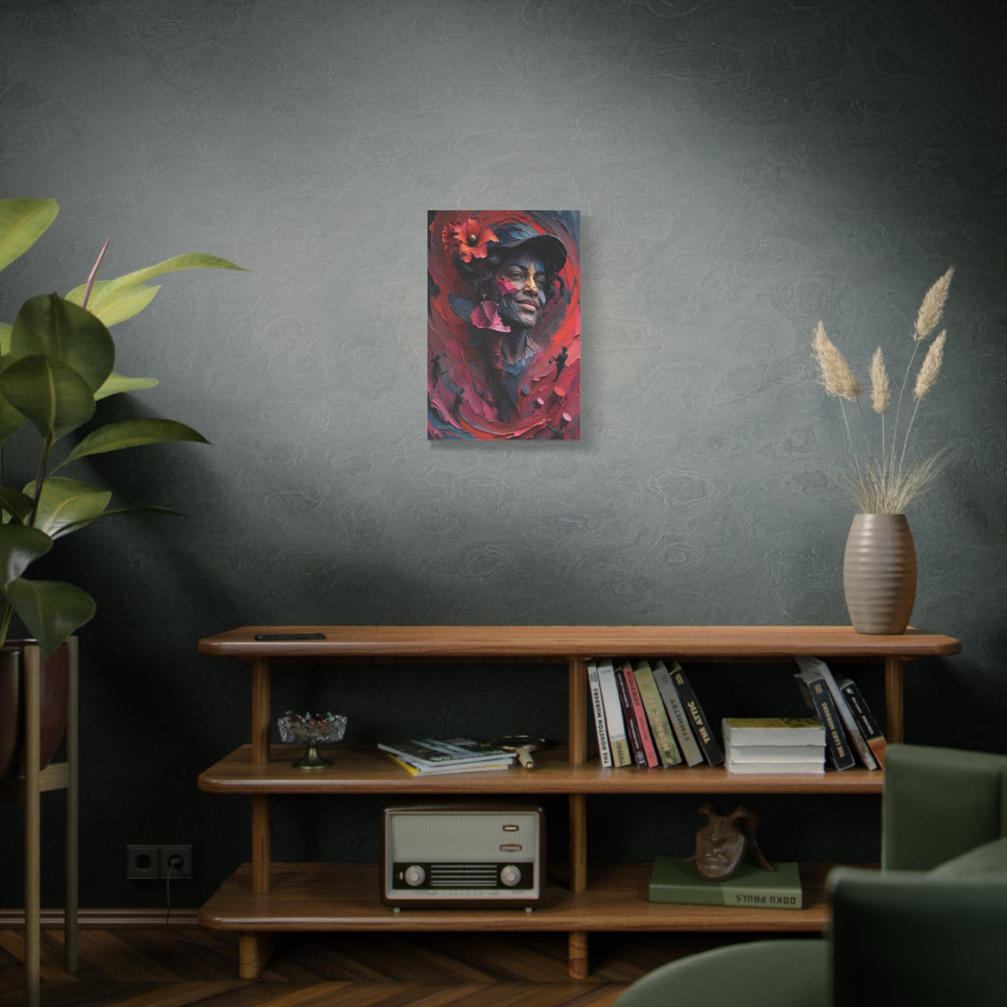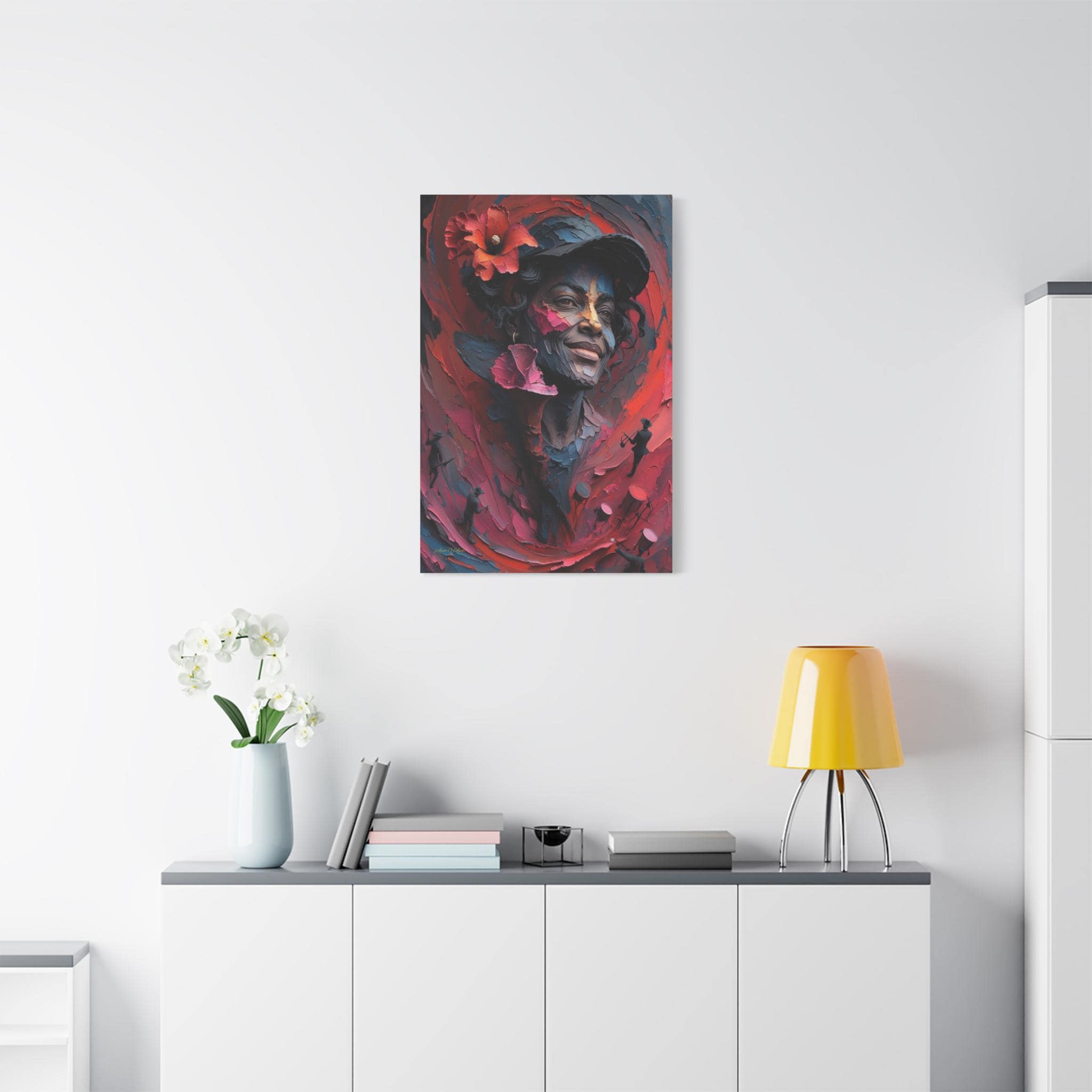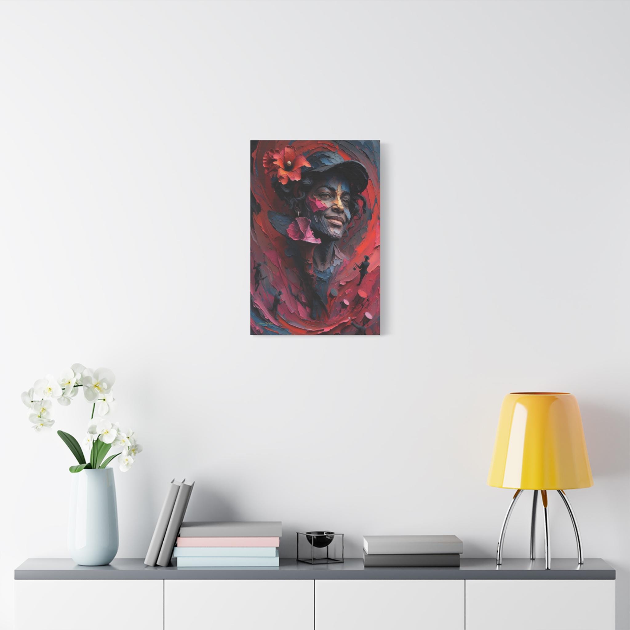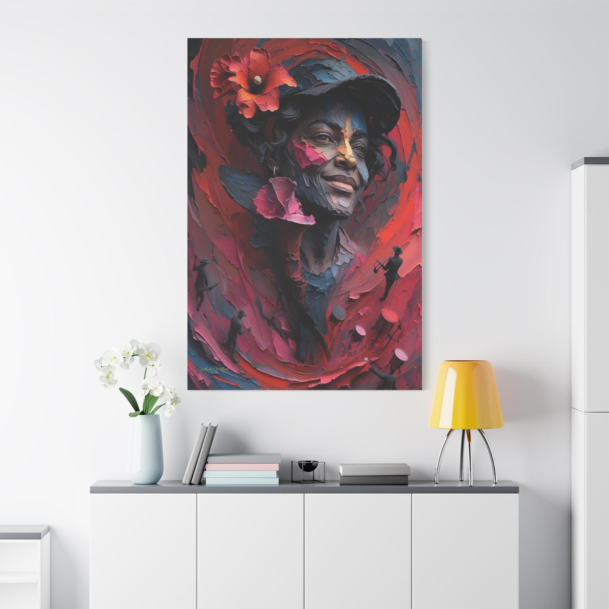 Feel the rhythm and joy of the islands with this spectacular canvas print of a musical muse. This vibrant artwork features a stunning portrait of a smiling woman wearing a hat adorned with a bold red hibiscus flower. But look closer—swirling around her in a sea of red and pink brushstrokes are energetic silhouettes of musicians playing trumpets and drums.