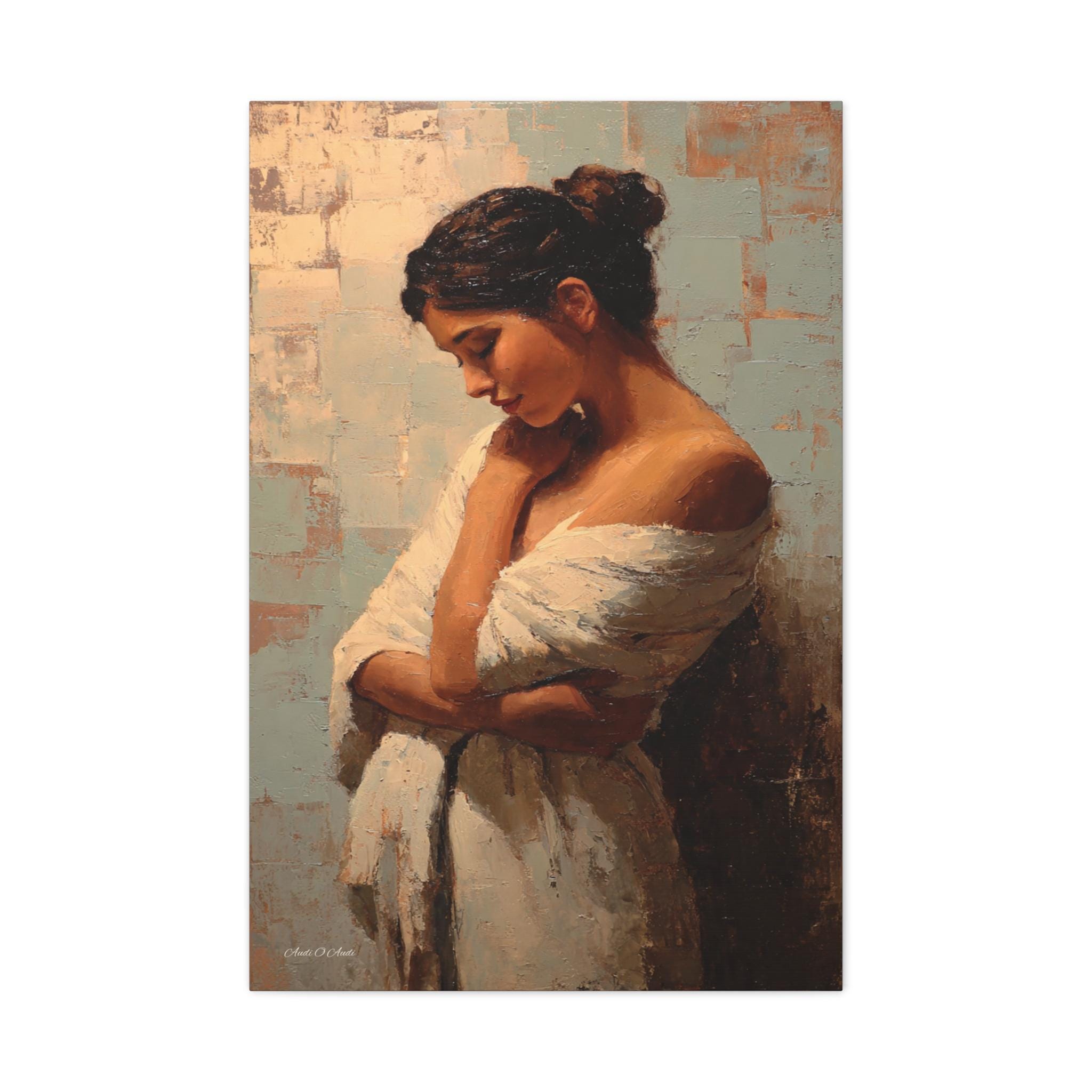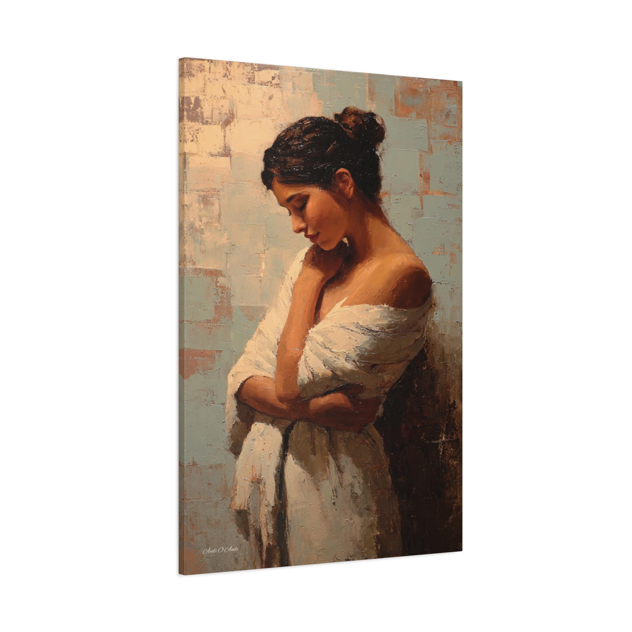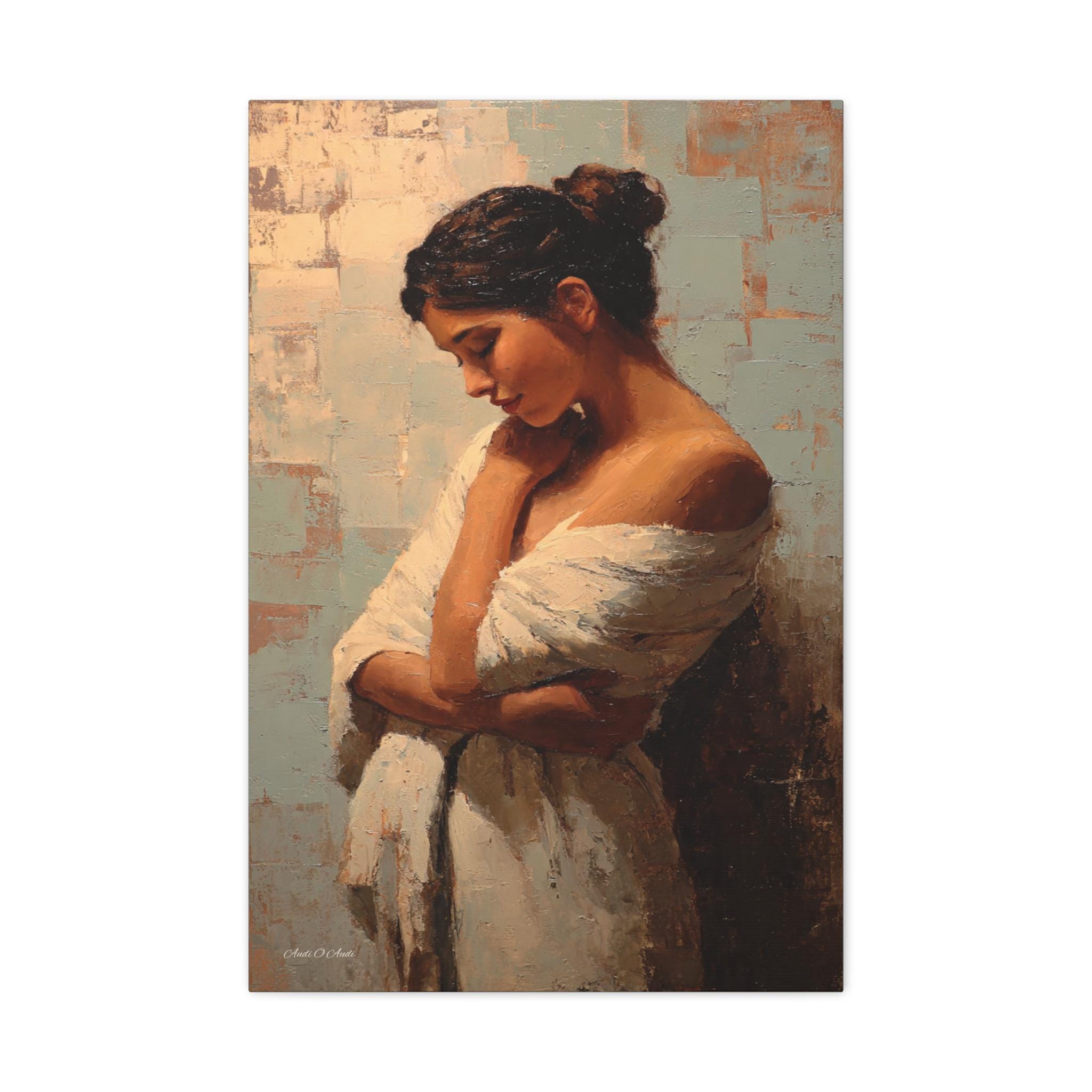 Create a sanctuary of peace and self-acceptance in your home with this gentle canvas print of a woman in a moment of quiet reflection. This intimate artwork features a beautiful female figure wrapped in a textured white cloth, her eyes closed in a peaceful embrace of the self.