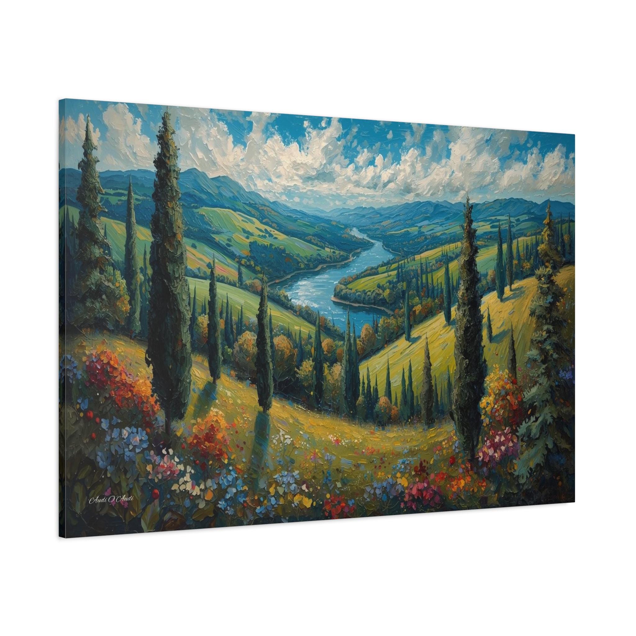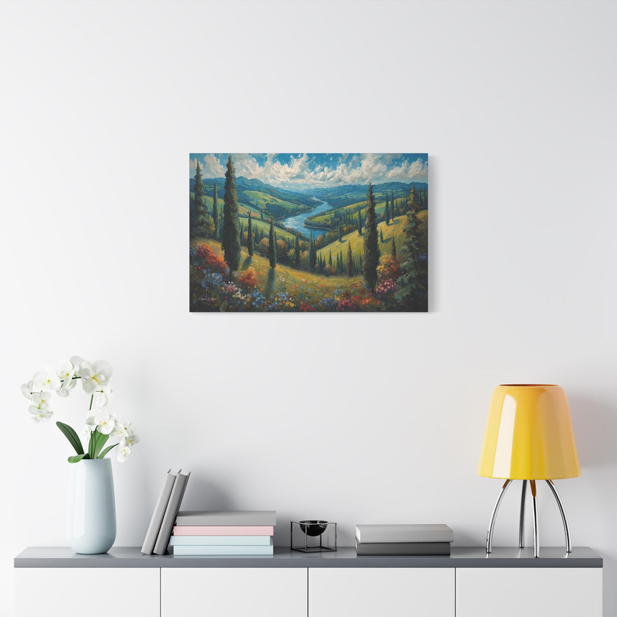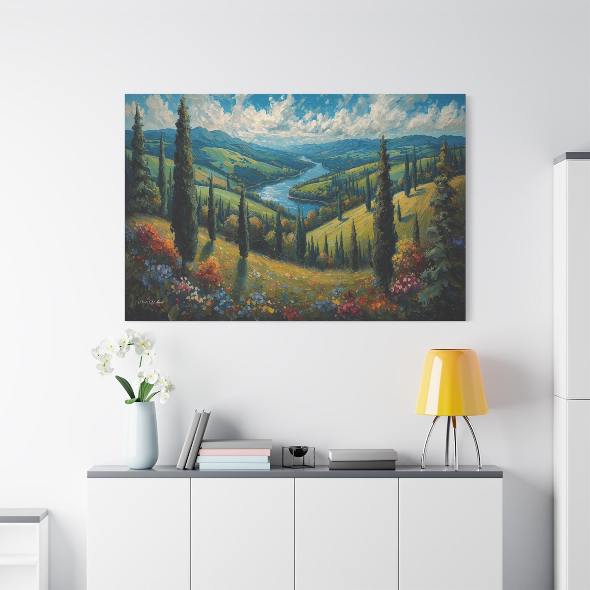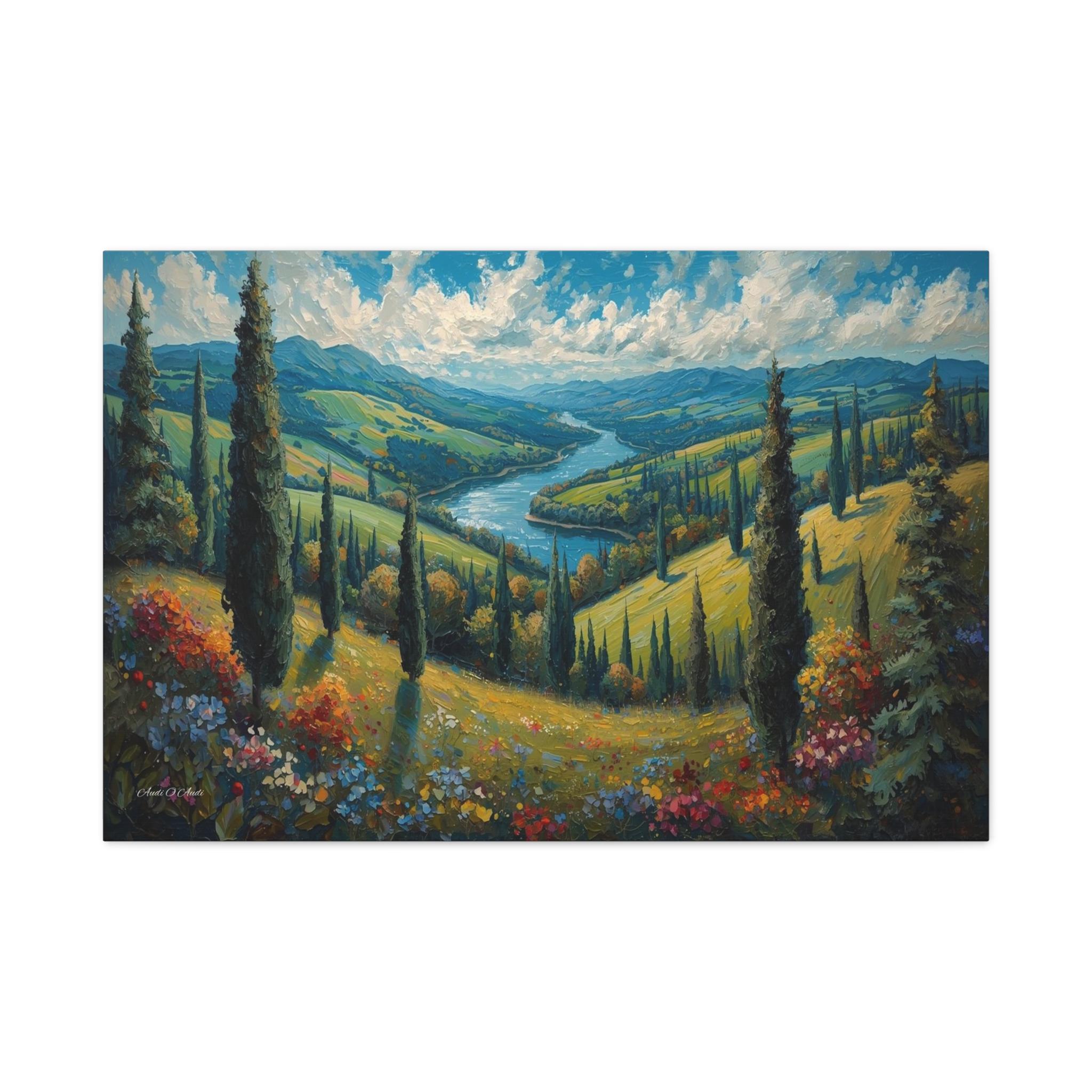 Escape to the rolling hills of Italy with this breathtaking canvas print of a Tuscan summer landscape. This scenic artwork captures a lush green valley where tall cypress trees stand like sentinels over a winding blue river that meanders toward distant mountains.