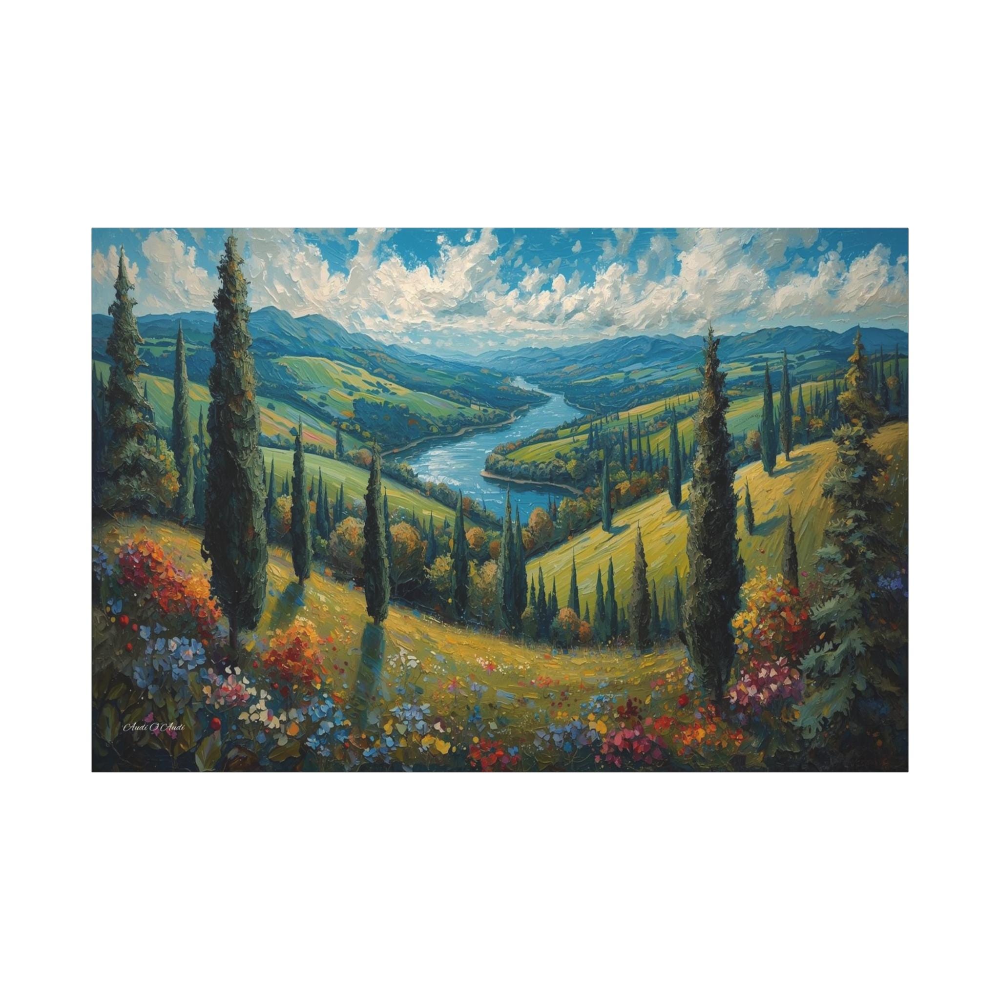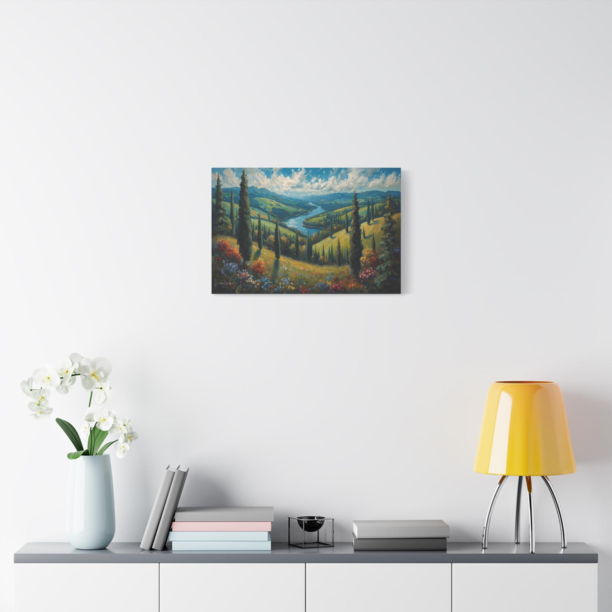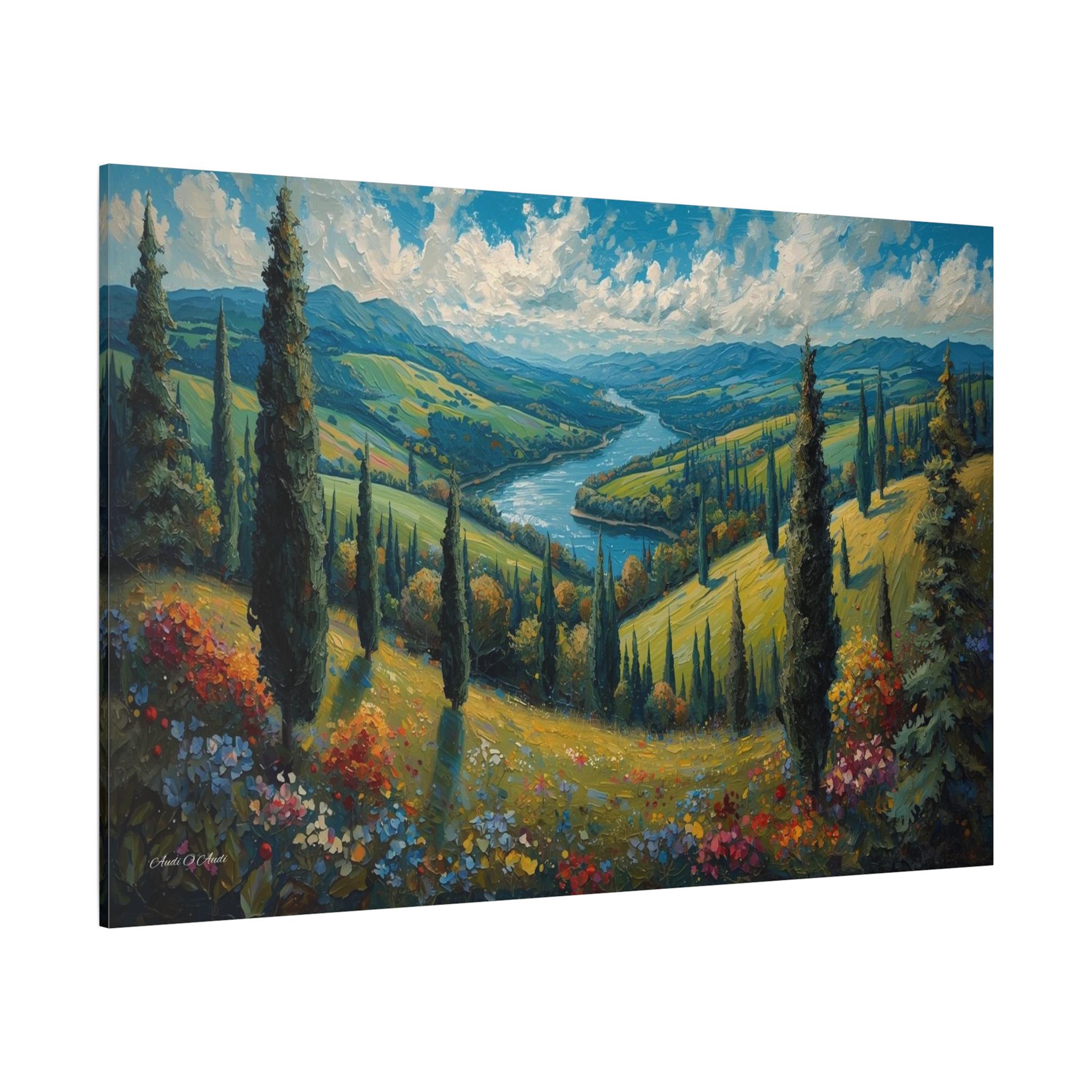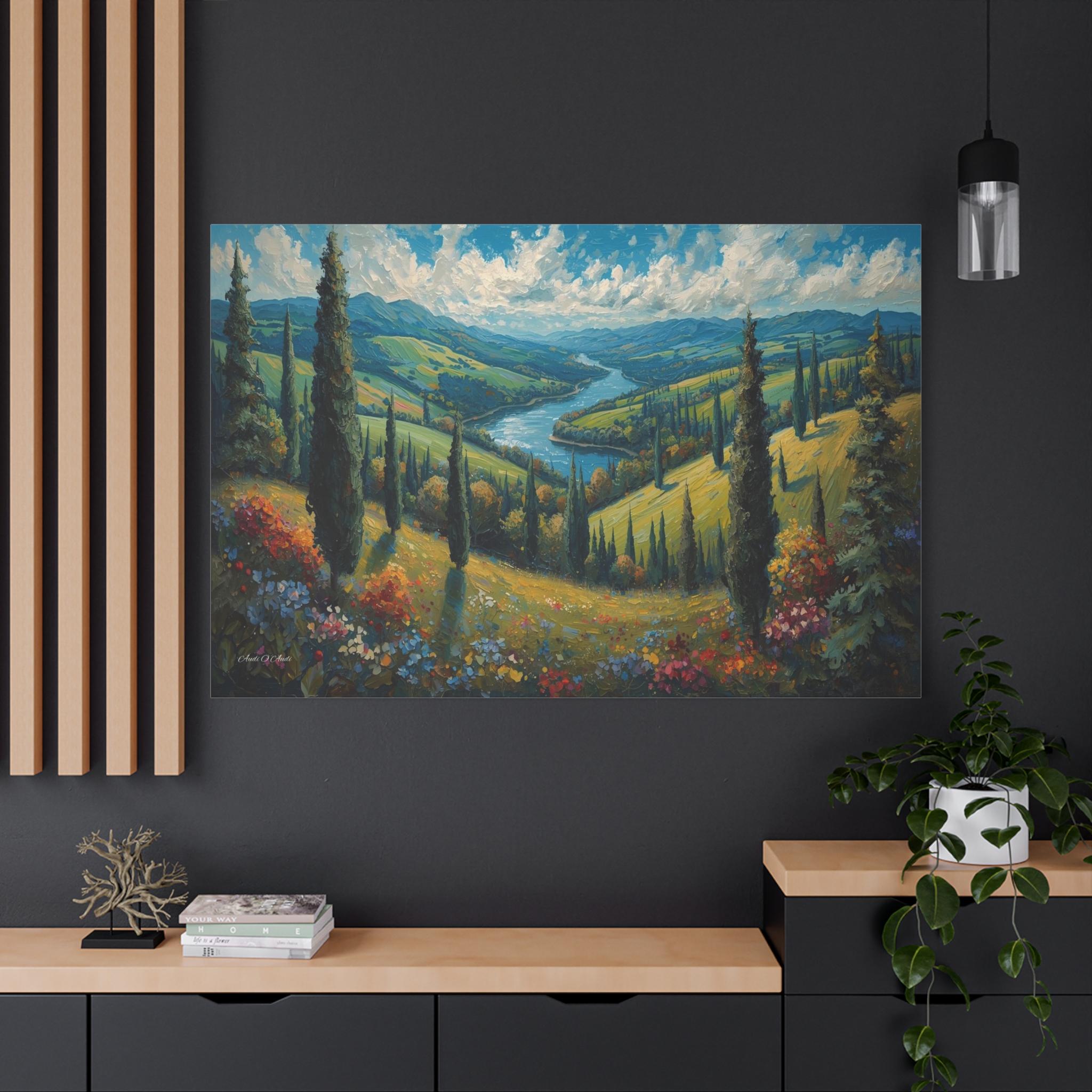Escape to the rolling hills of Italy with this breathtaking canvas print of a Tuscan summer landscape. This scenic artwork captures a lush green valley where tall cypress trees stand like sentinels over a winding blue river that meanders toward distant mountains.