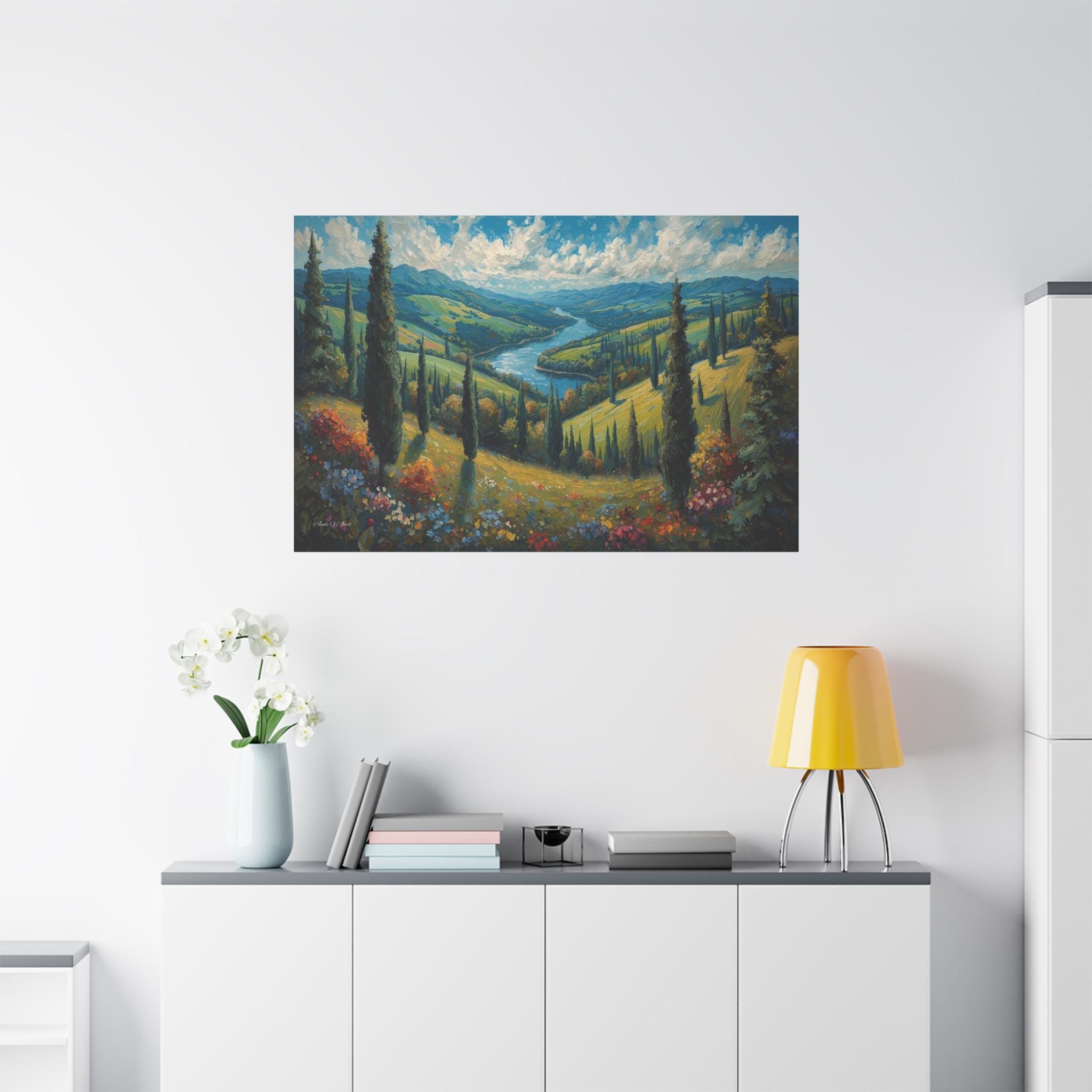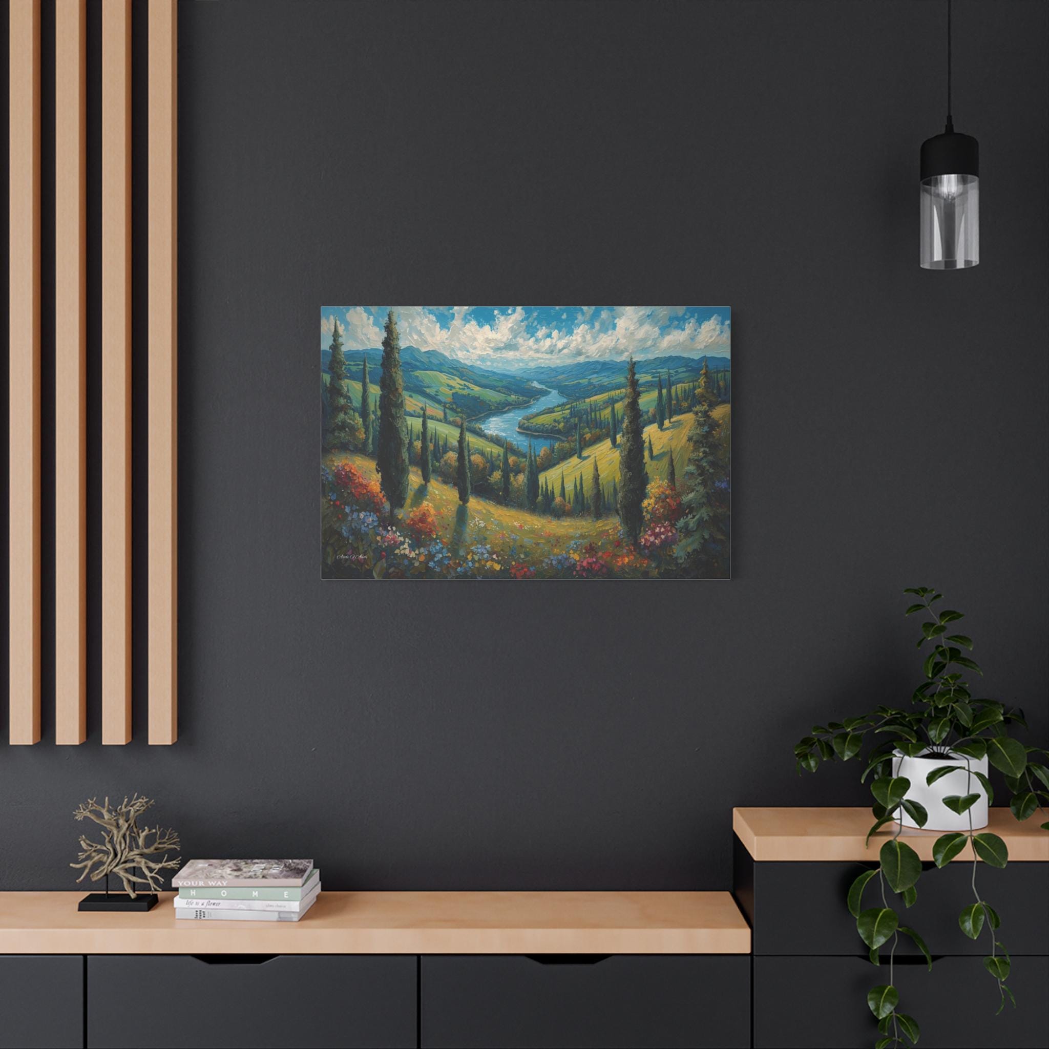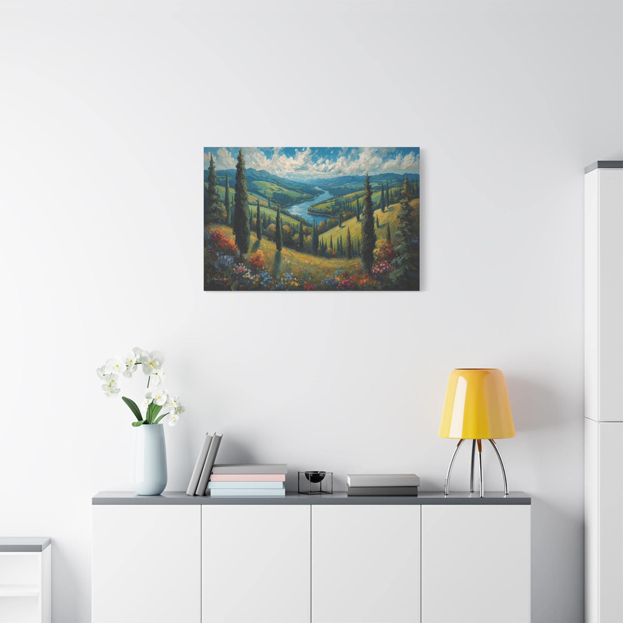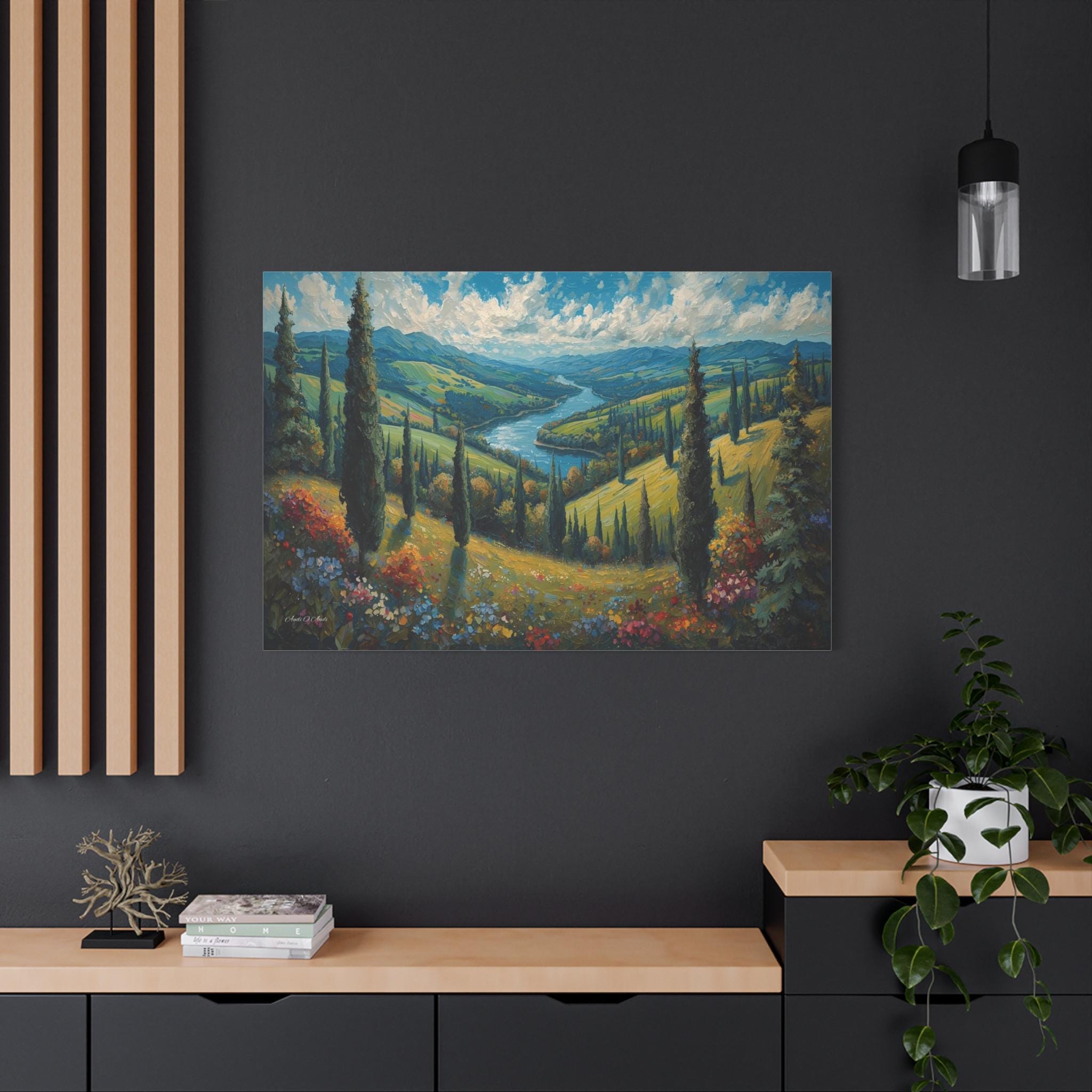 Escape to the rolling hills of Italy with this breathtaking canvas print of a Tuscan summer landscape. This scenic artwork captures a lush green valley where tall cypress trees stand like sentinels over a winding blue river that meanders toward distant mountains.