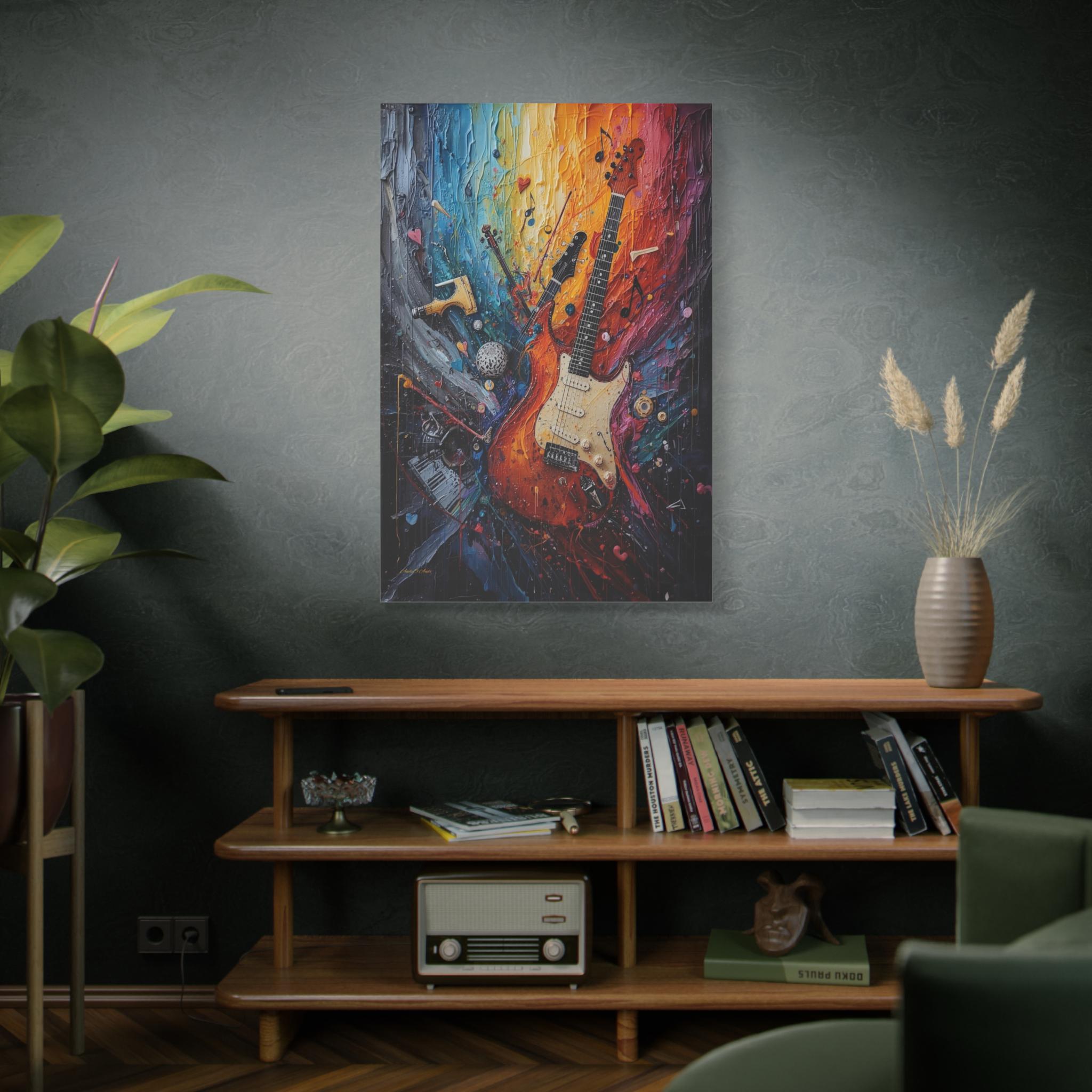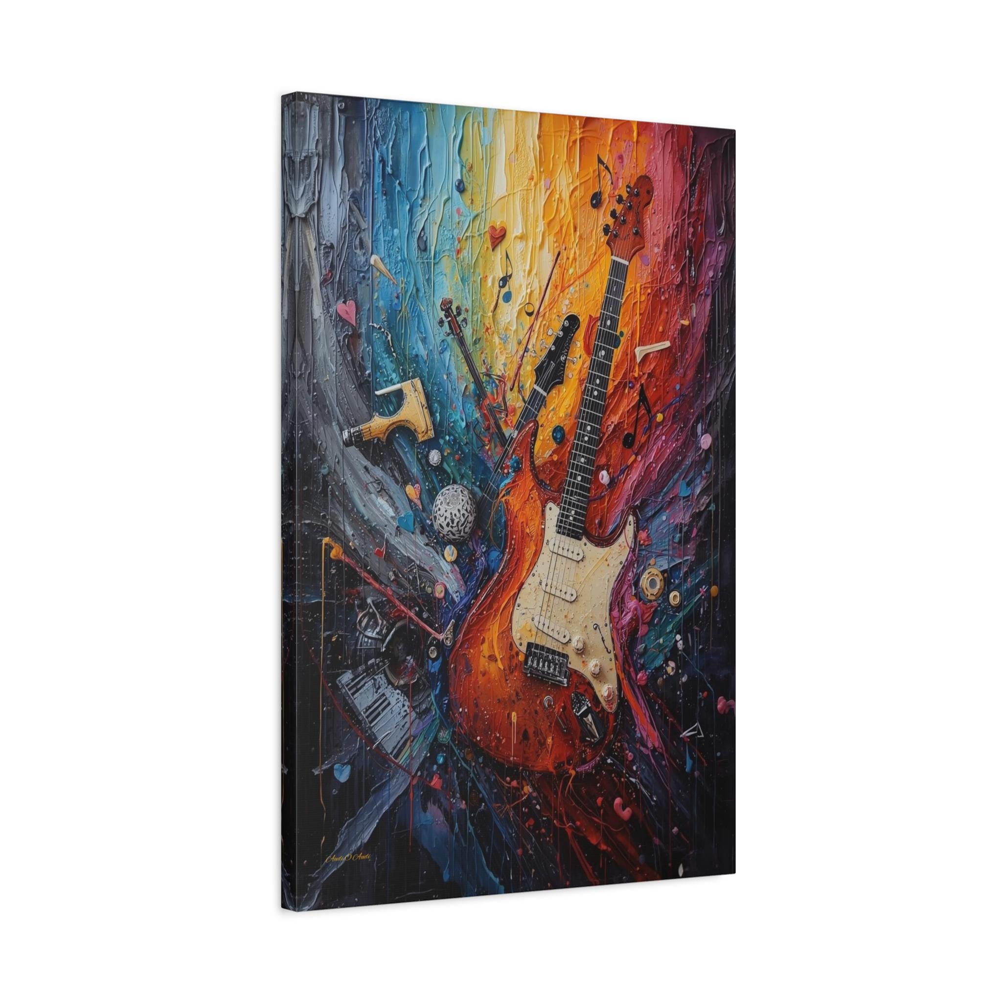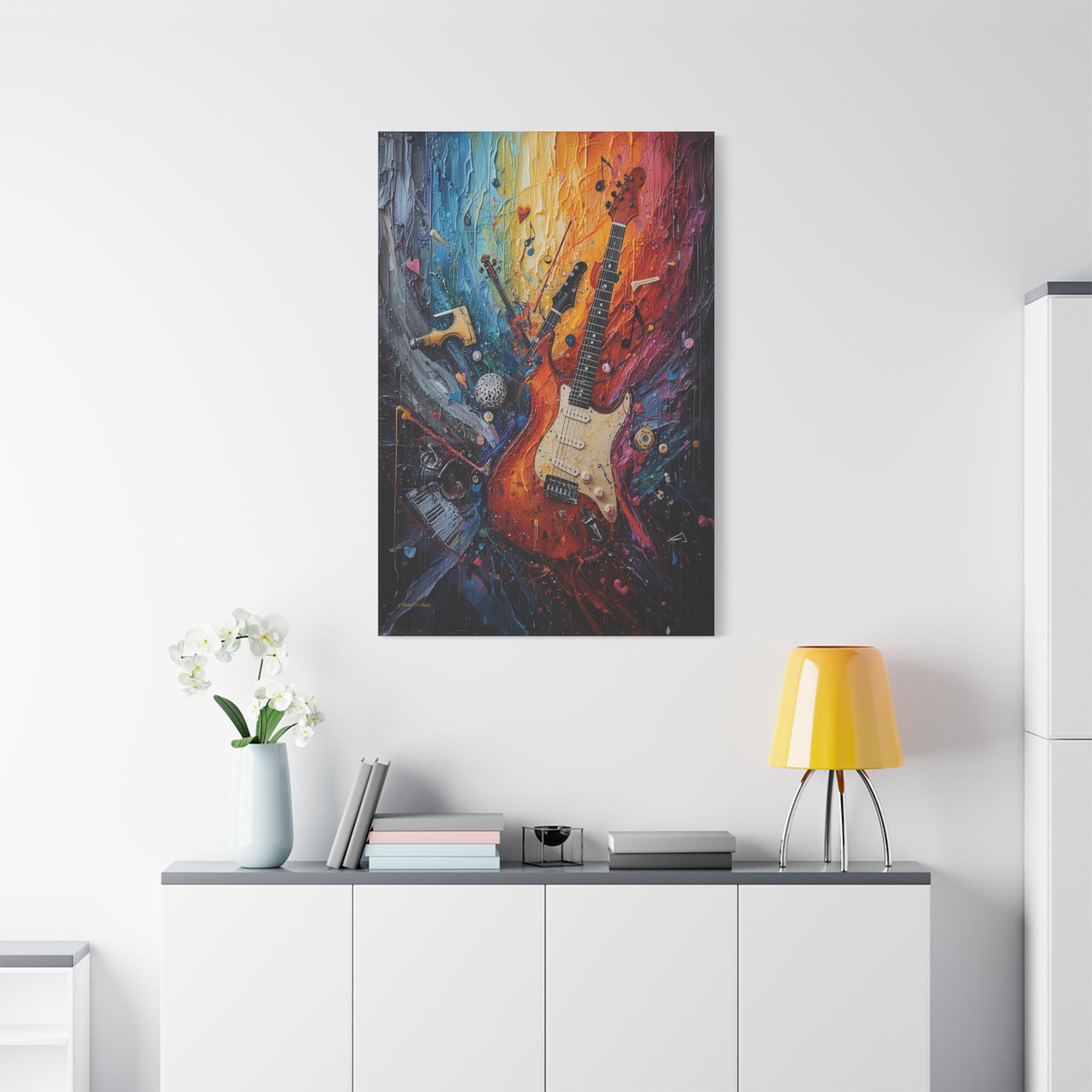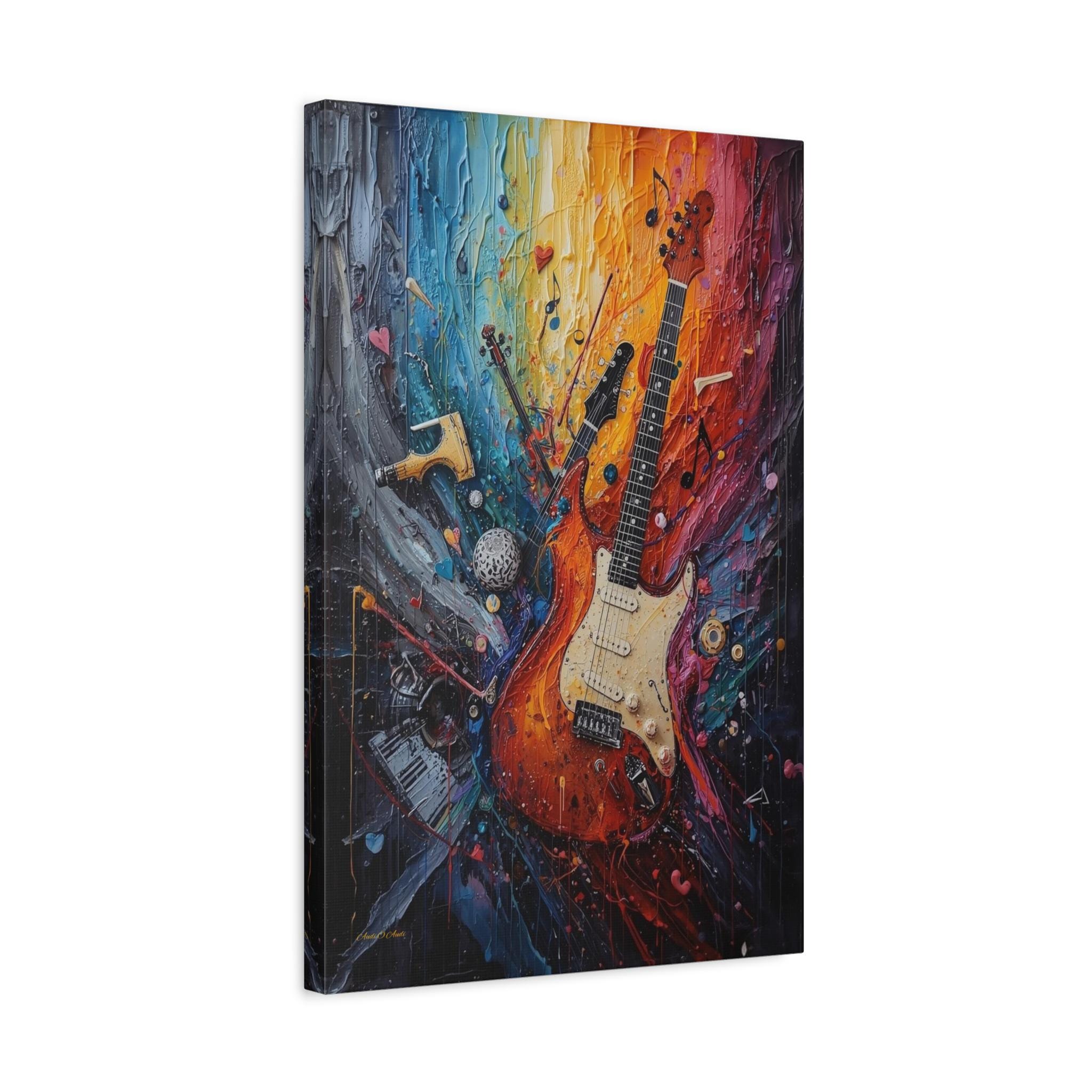 Turn the volume up on your wall decor with this electrifying canvas print of an abstract guitar. This high-energy artwork captures the soul of rock and roll, featuring a classic electric guitar that seems to be exploding into a psychedelic swirl of musical notes, piano keys, and violin fragments.