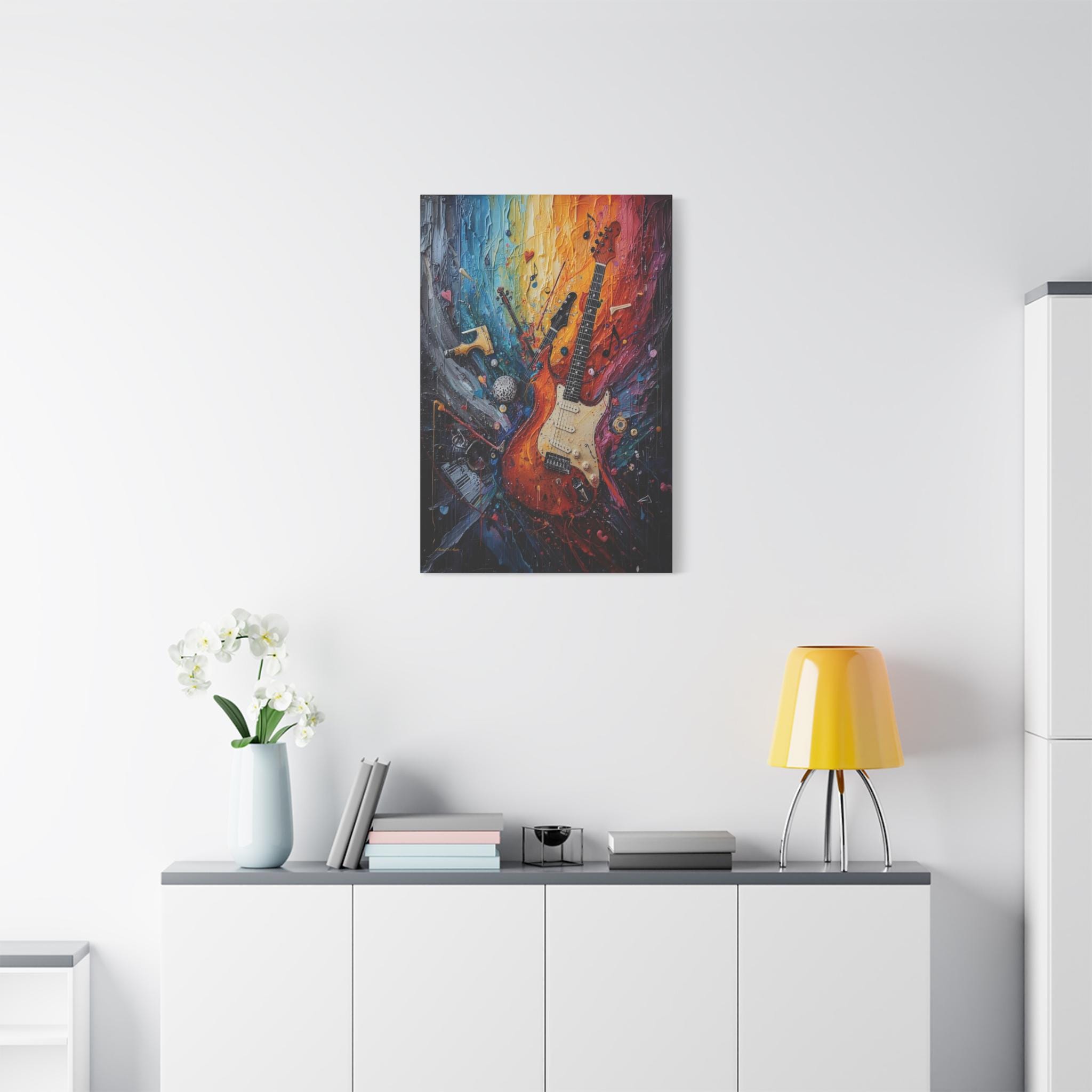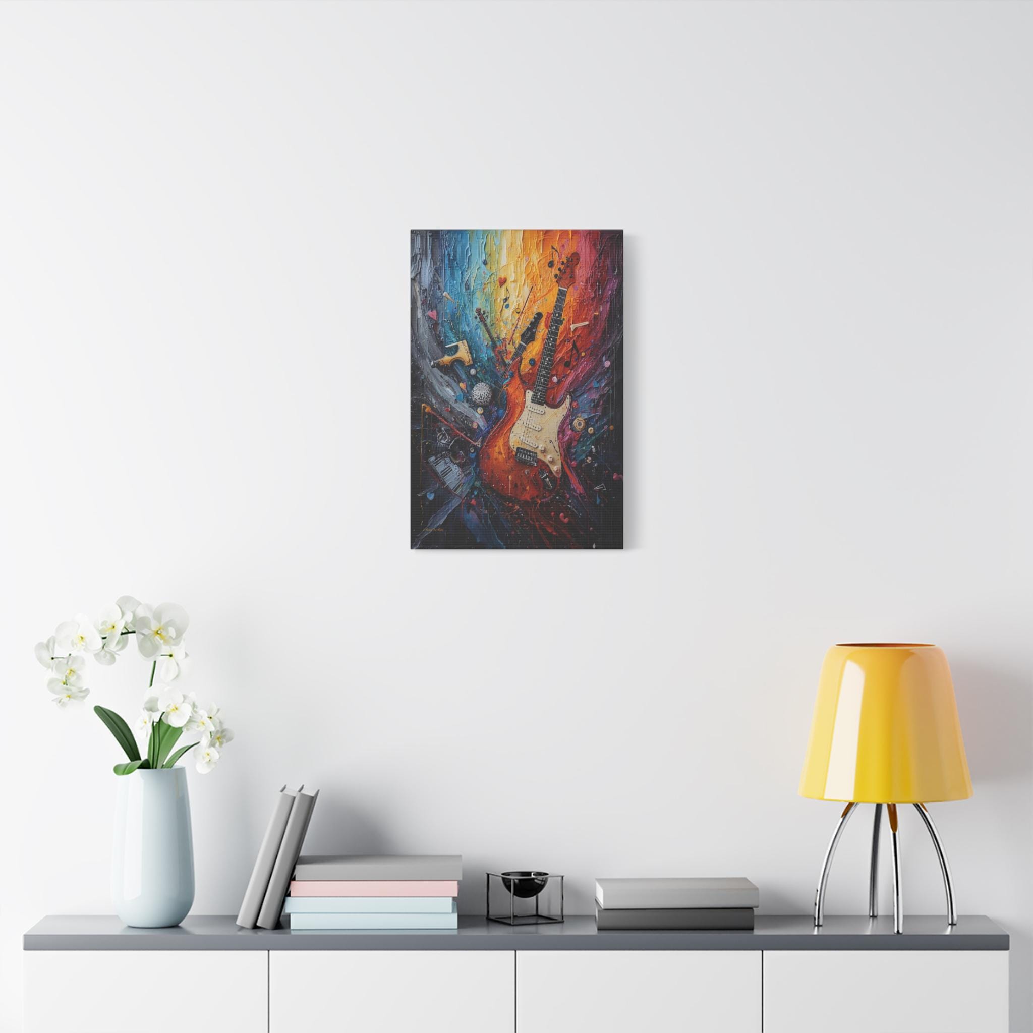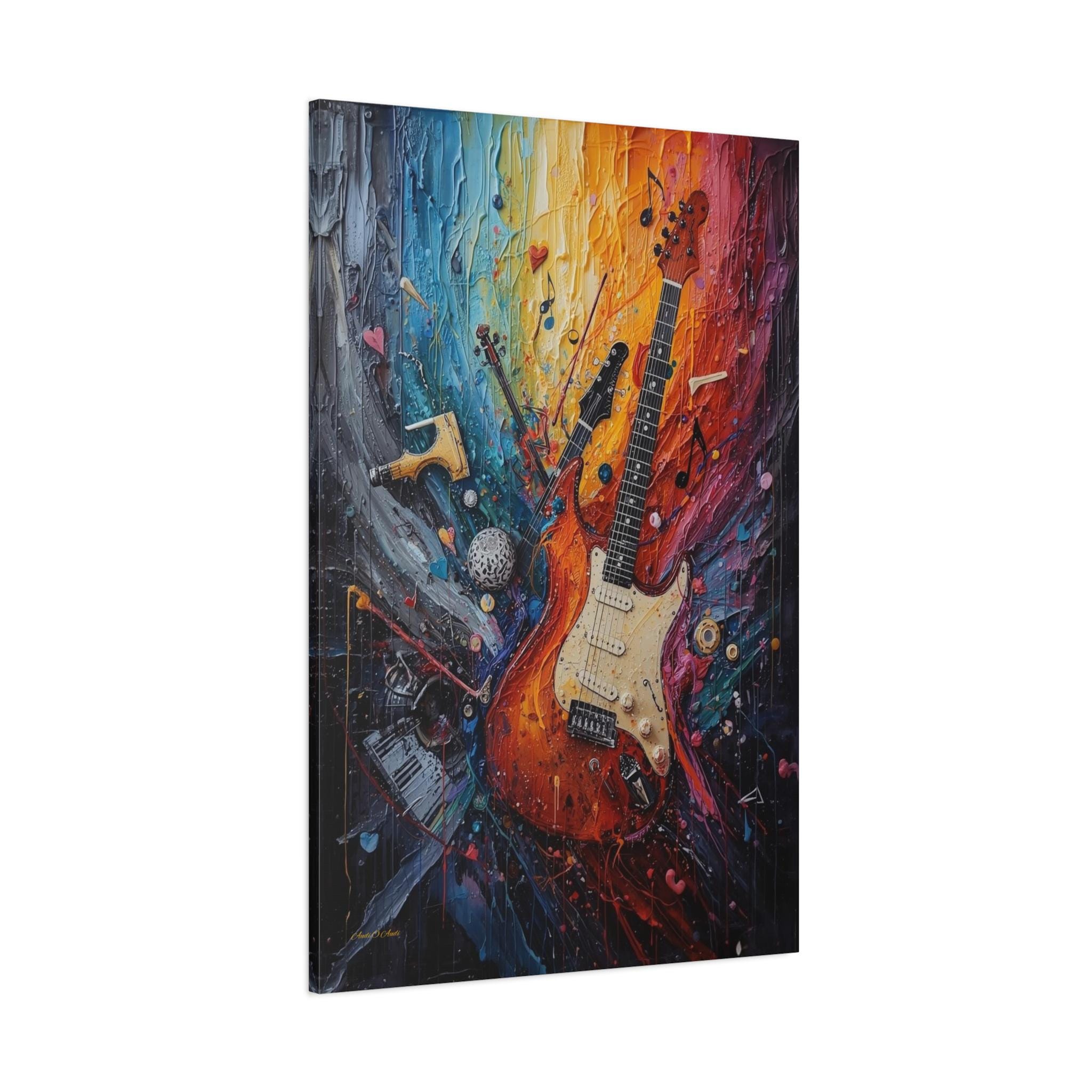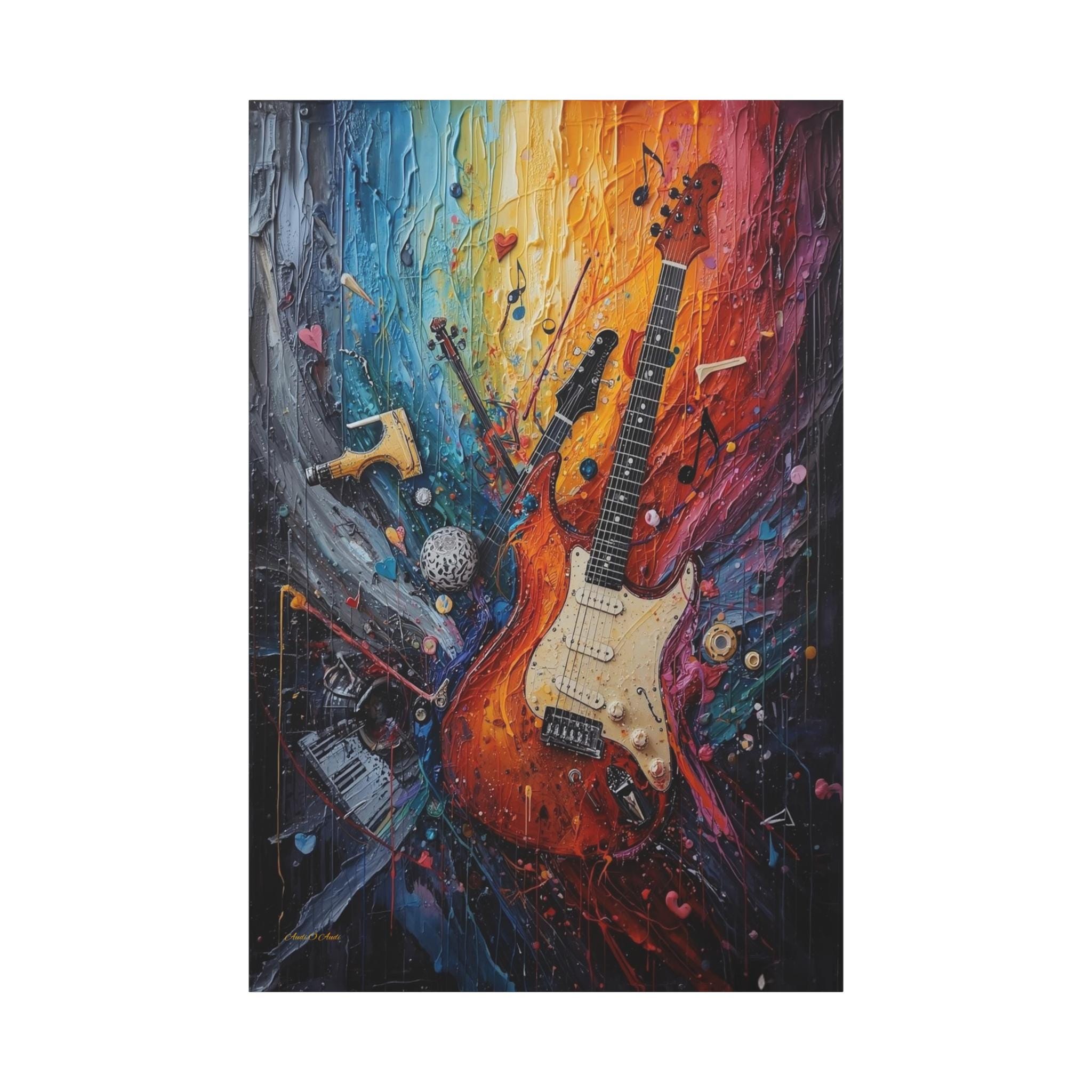 Turn the volume up on your wall decor with this electrifying canvas print of an abstract guitar. This high-energy artwork captures the soul of rock and roll, featuring a classic electric guitar that seems to be exploding into a psychedelic swirl of musical notes, piano keys, and violin fragments.