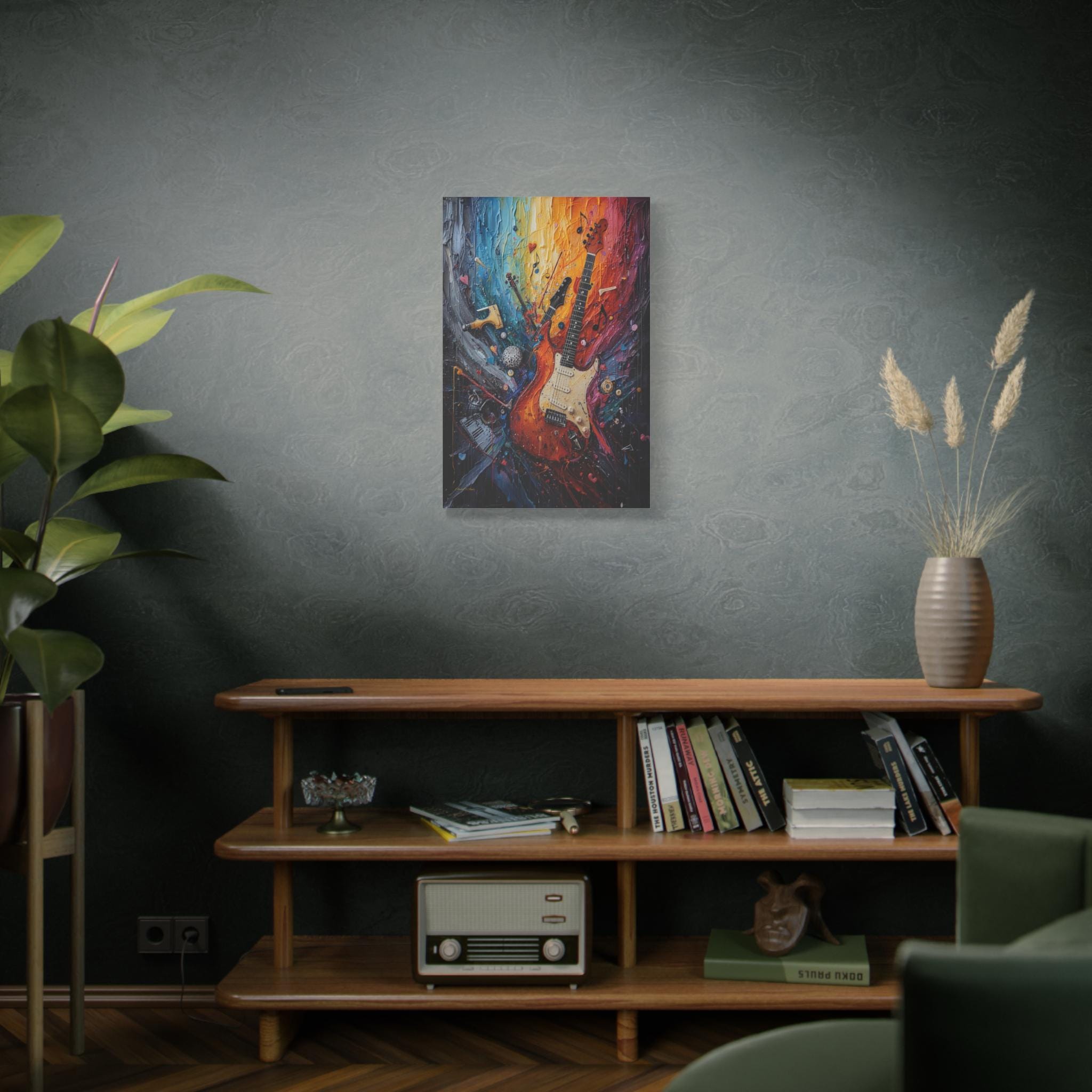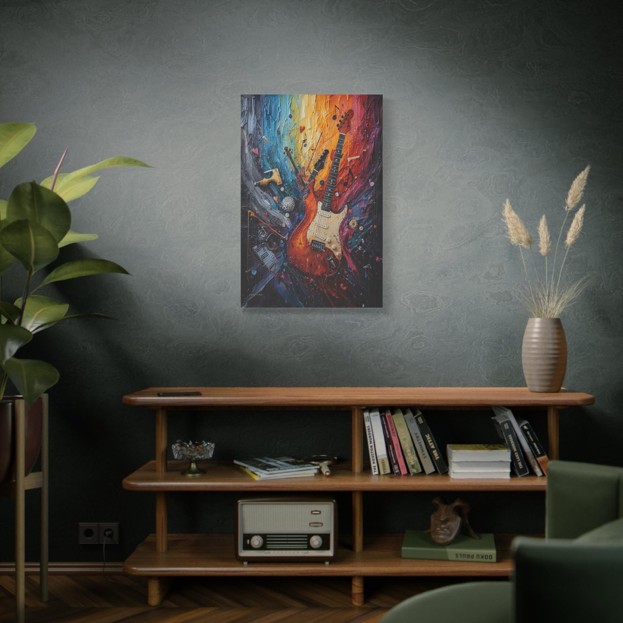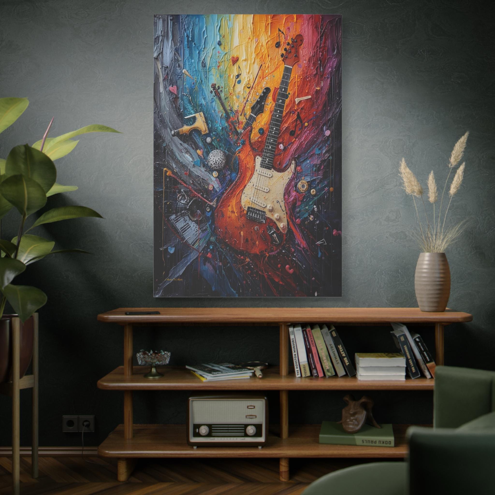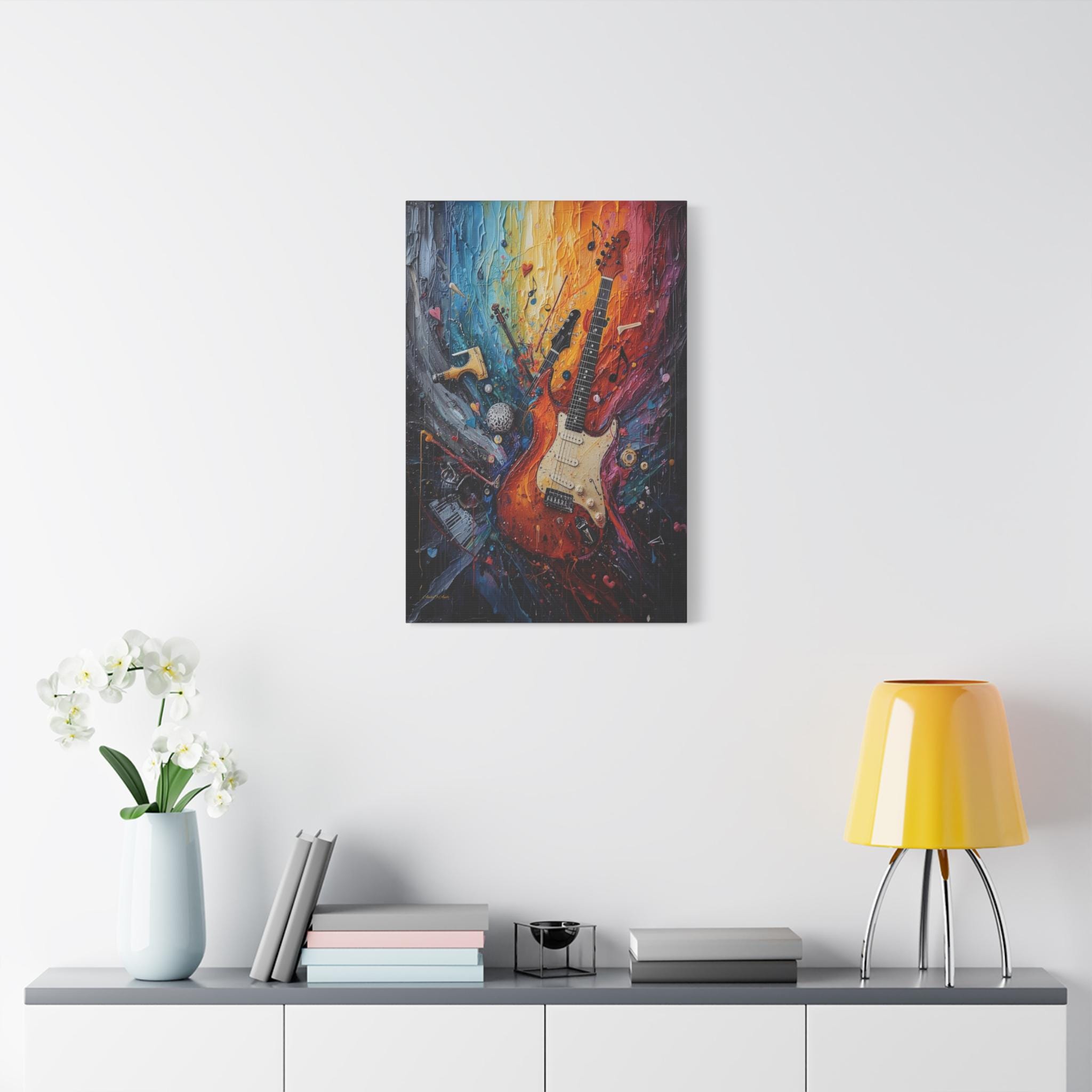 Turn the volume up on your wall decor with this electrifying canvas print of an abstract guitar. This high-energy artwork captures the soul of rock and roll, featuring a classic electric guitar that seems to be exploding into a psychedelic swirl of musical notes, piano keys, and violin fragments.