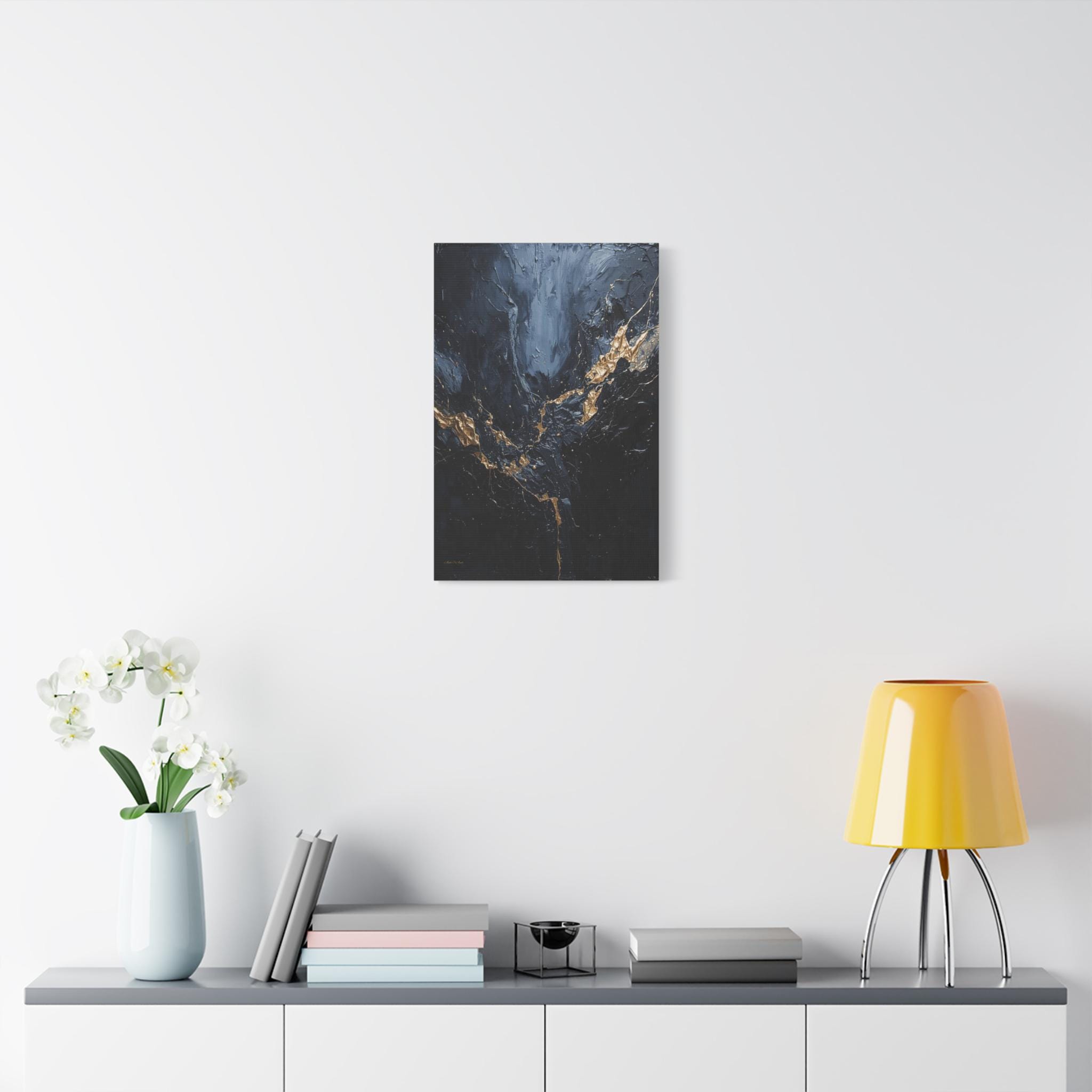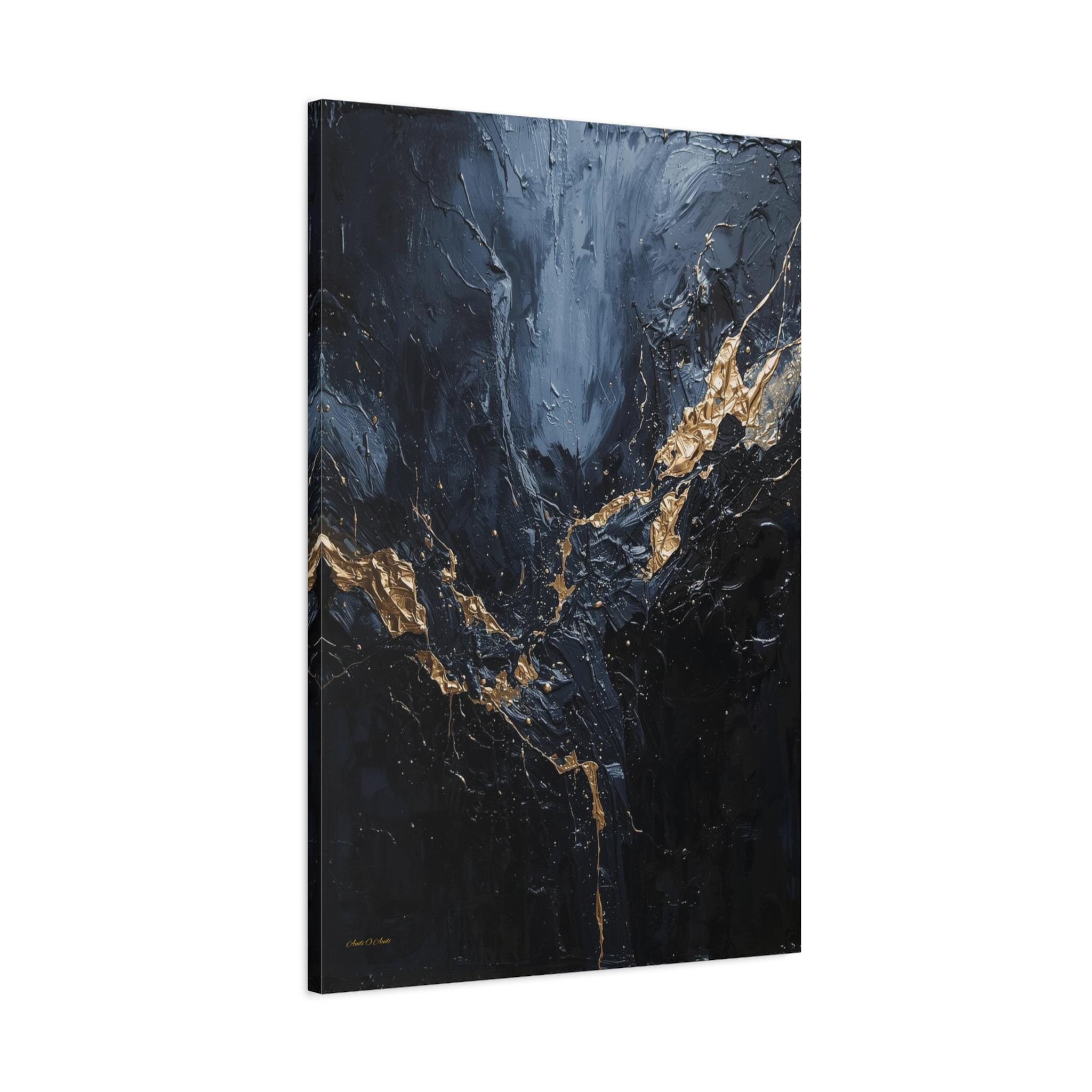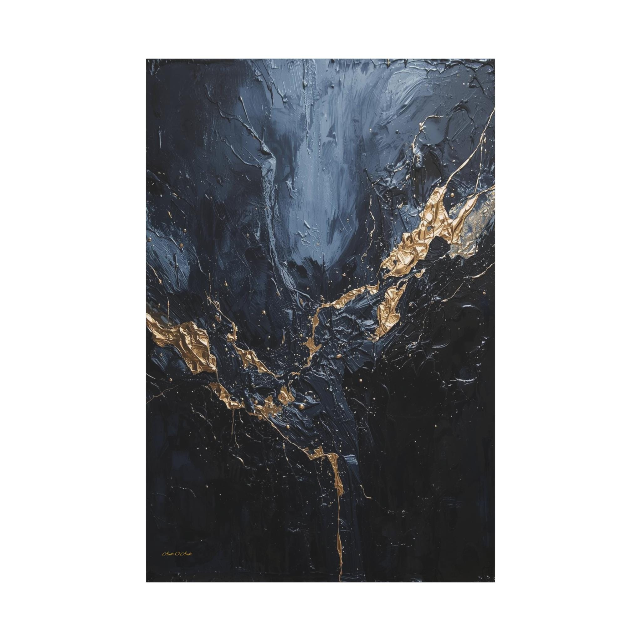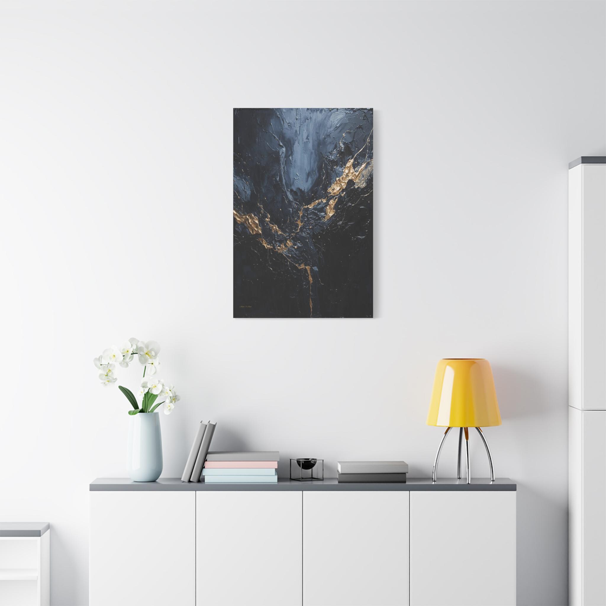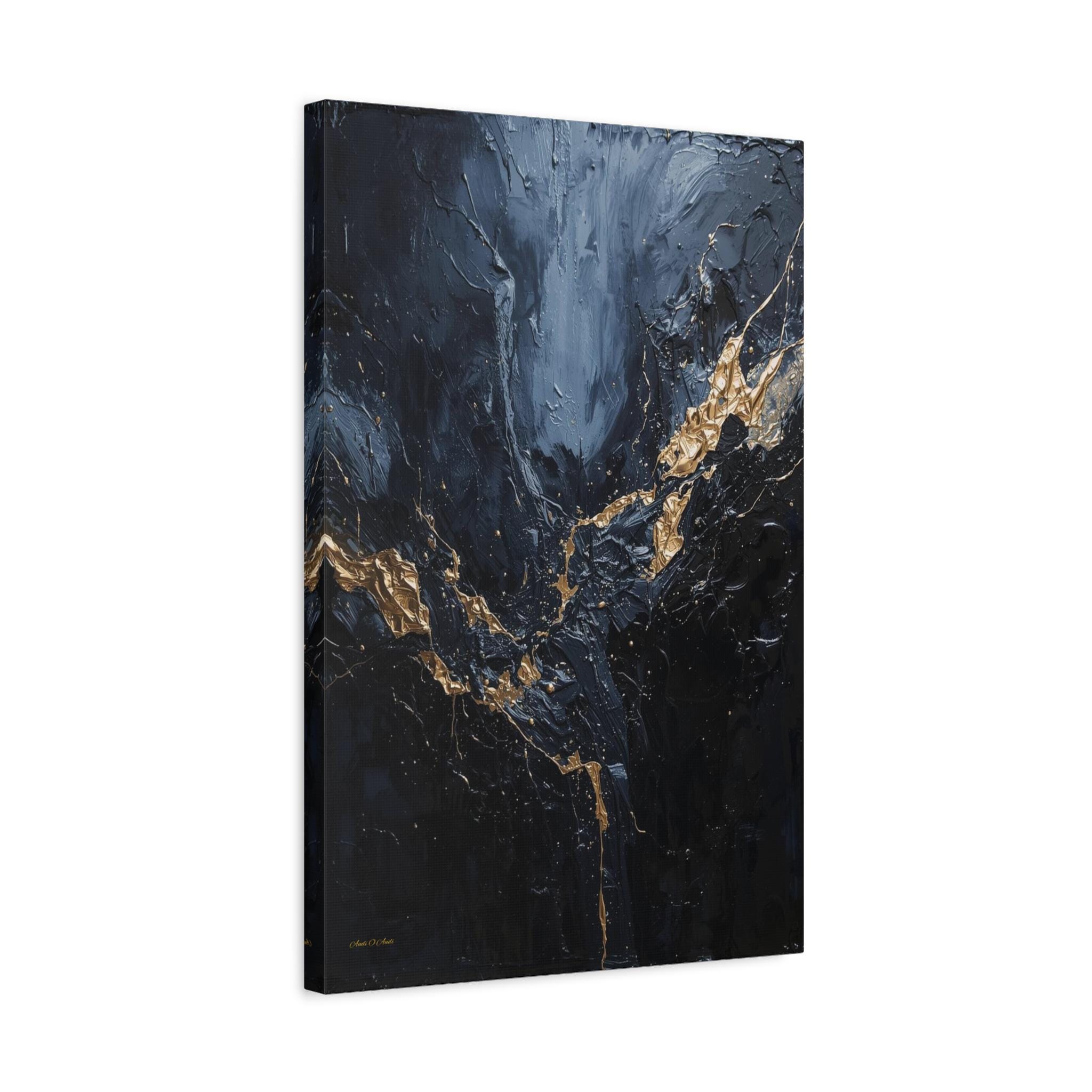 Add a touch of unapologetic luxury to your walls with this striking abstract canvas print of deep blue and gold. This sophisticated artwork features a rich, moody background of midnight blue and charcoal greys, torn apart by a jagged, electrifying vein of liquid gold.