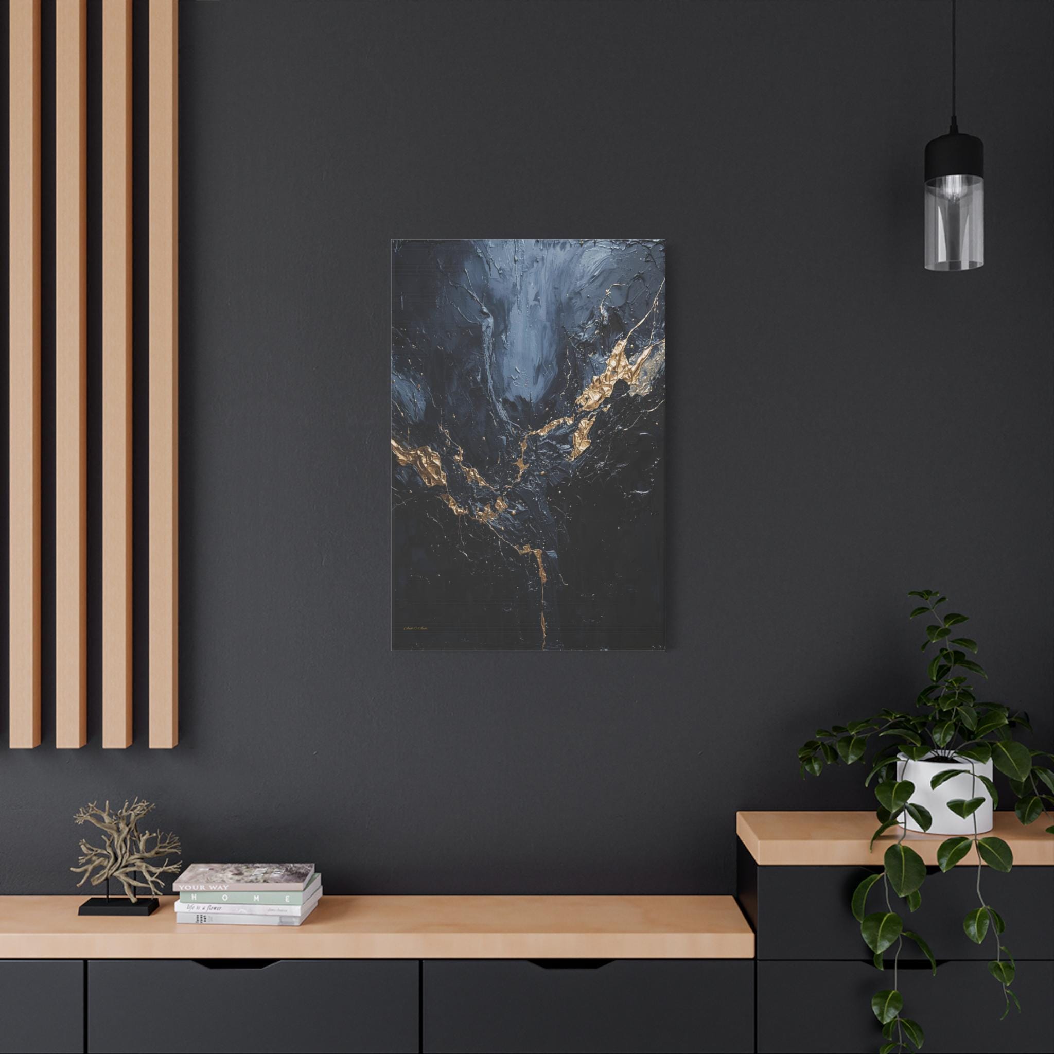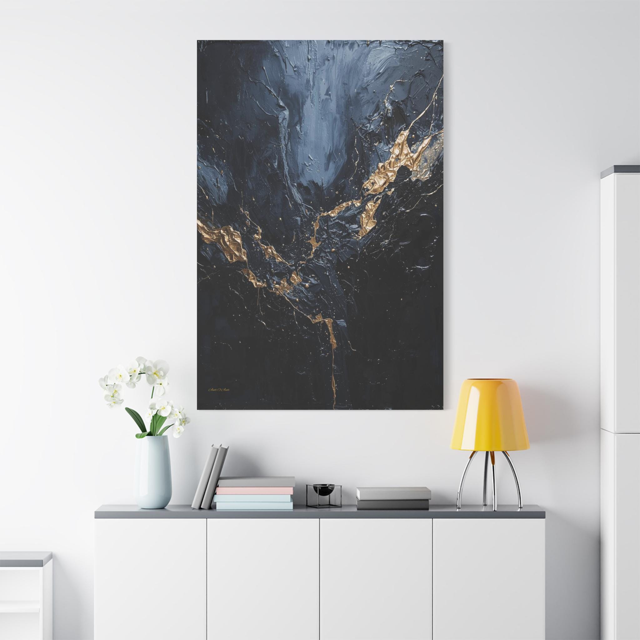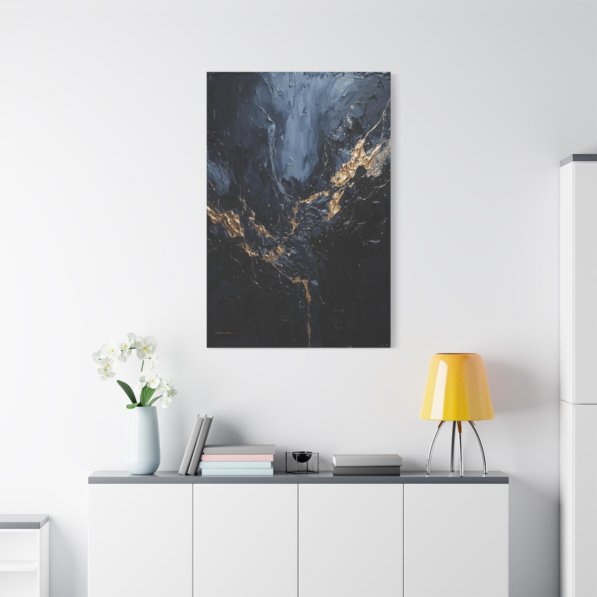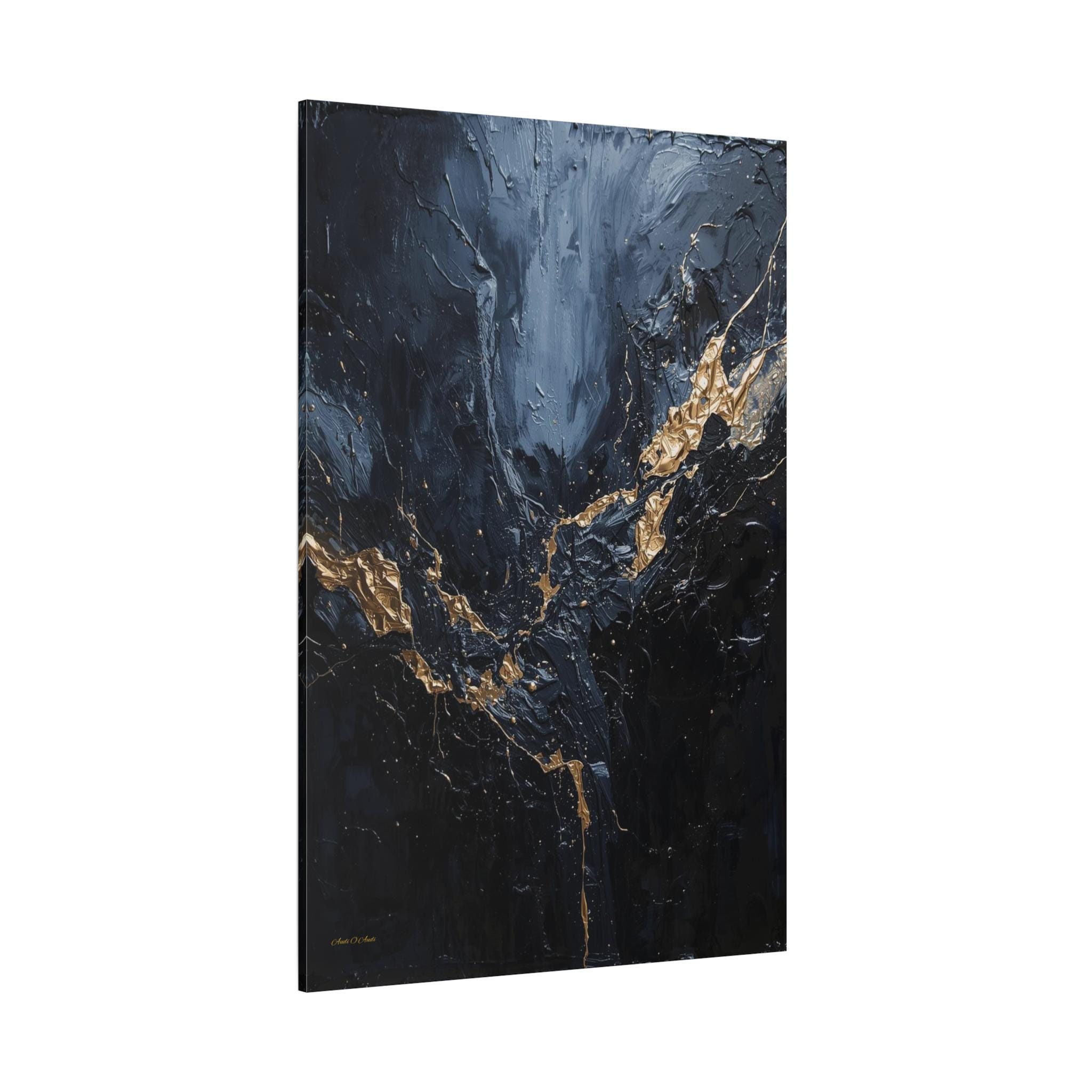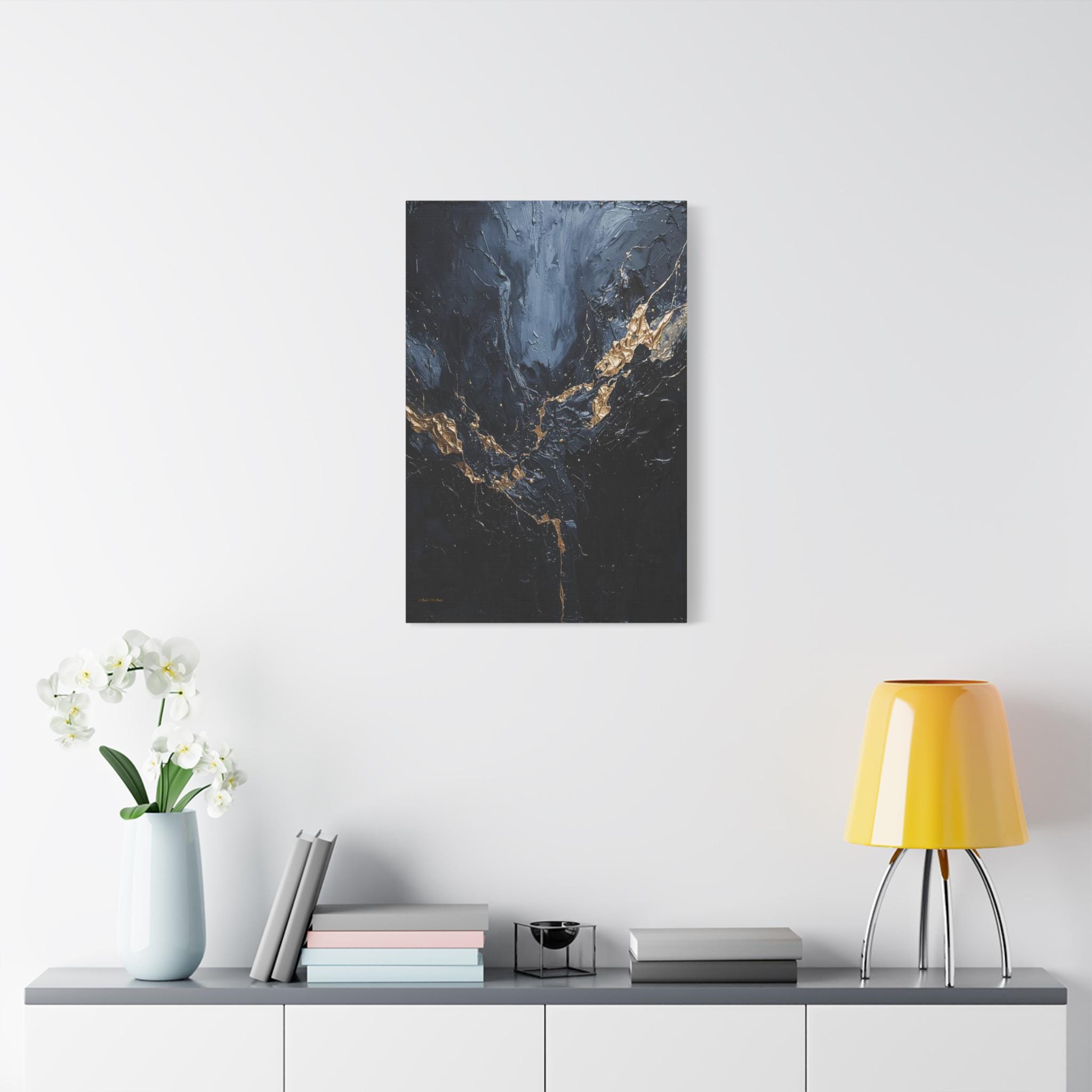 Add a touch of unapologetic luxury to your walls with this striking abstract canvas print of deep blue and gold. This sophisticated artwork features a rich, moody background of midnight blue and charcoal greys, torn apart by a jagged, electrifying vein of liquid gold.