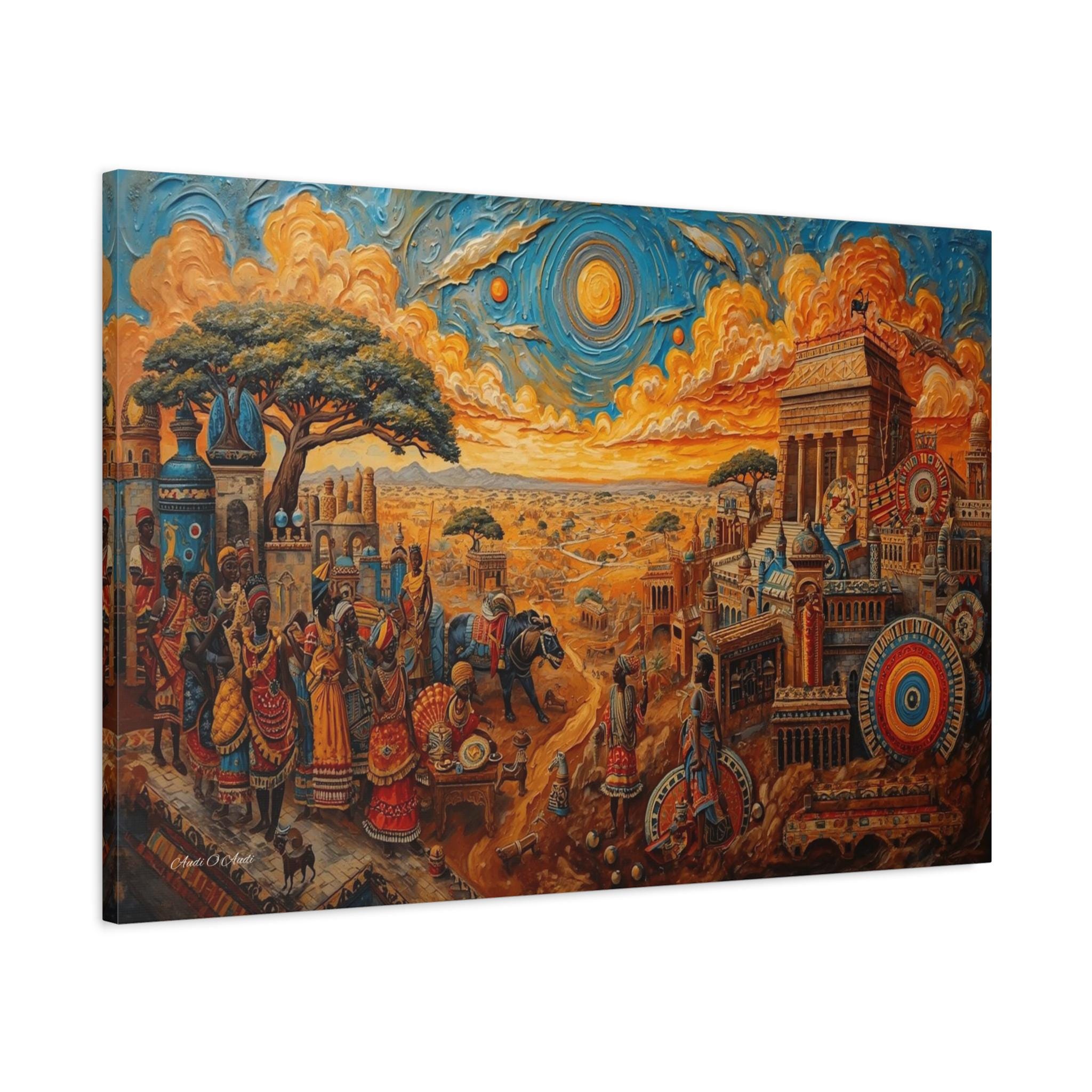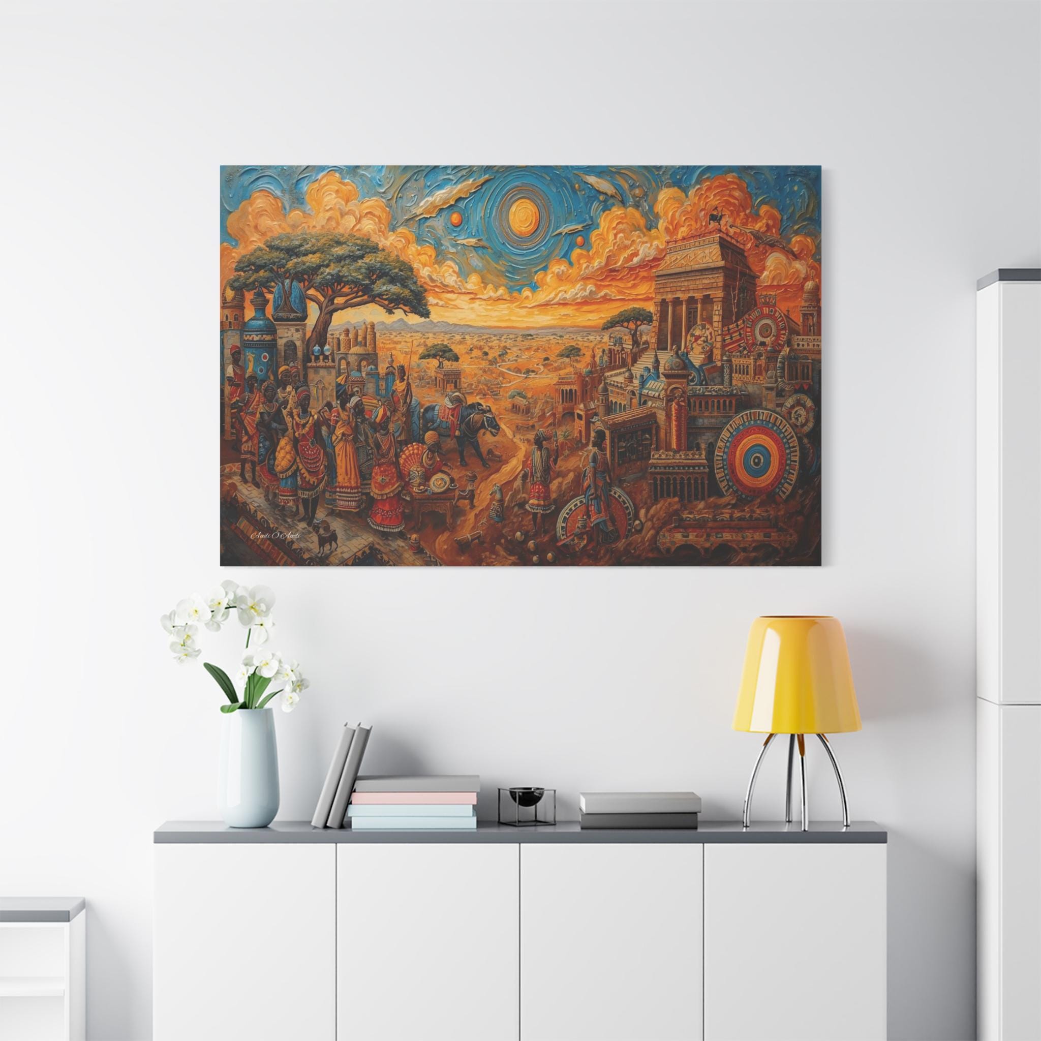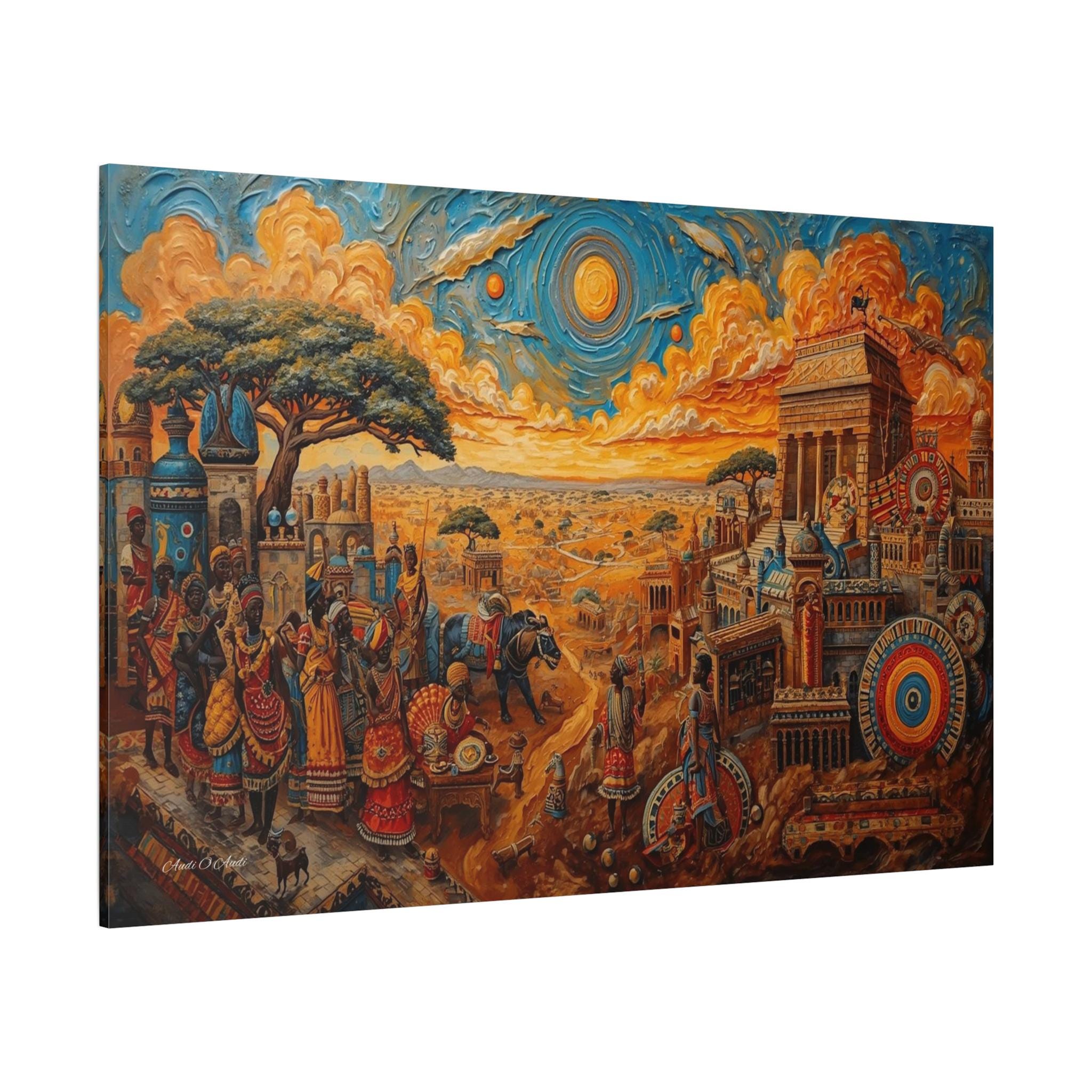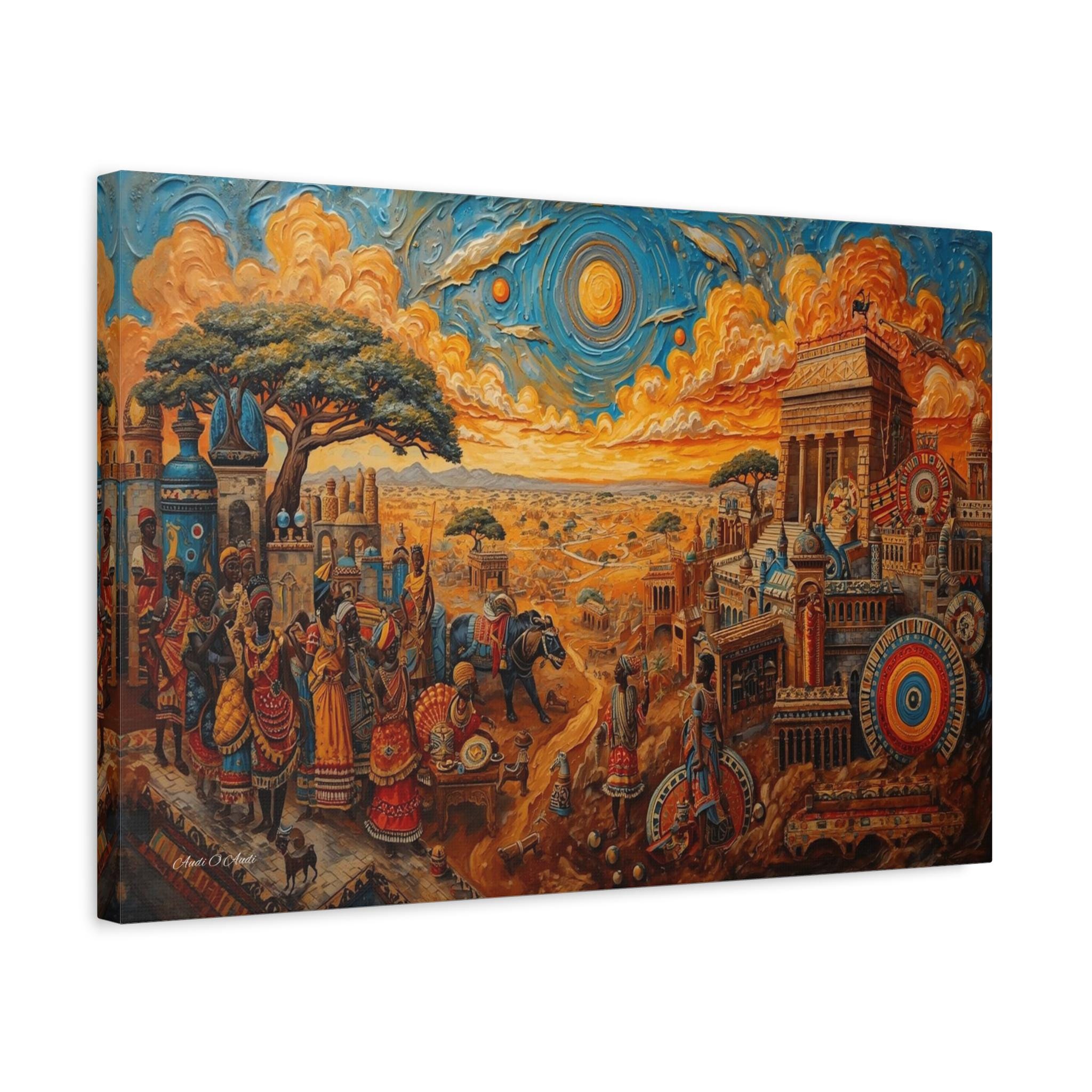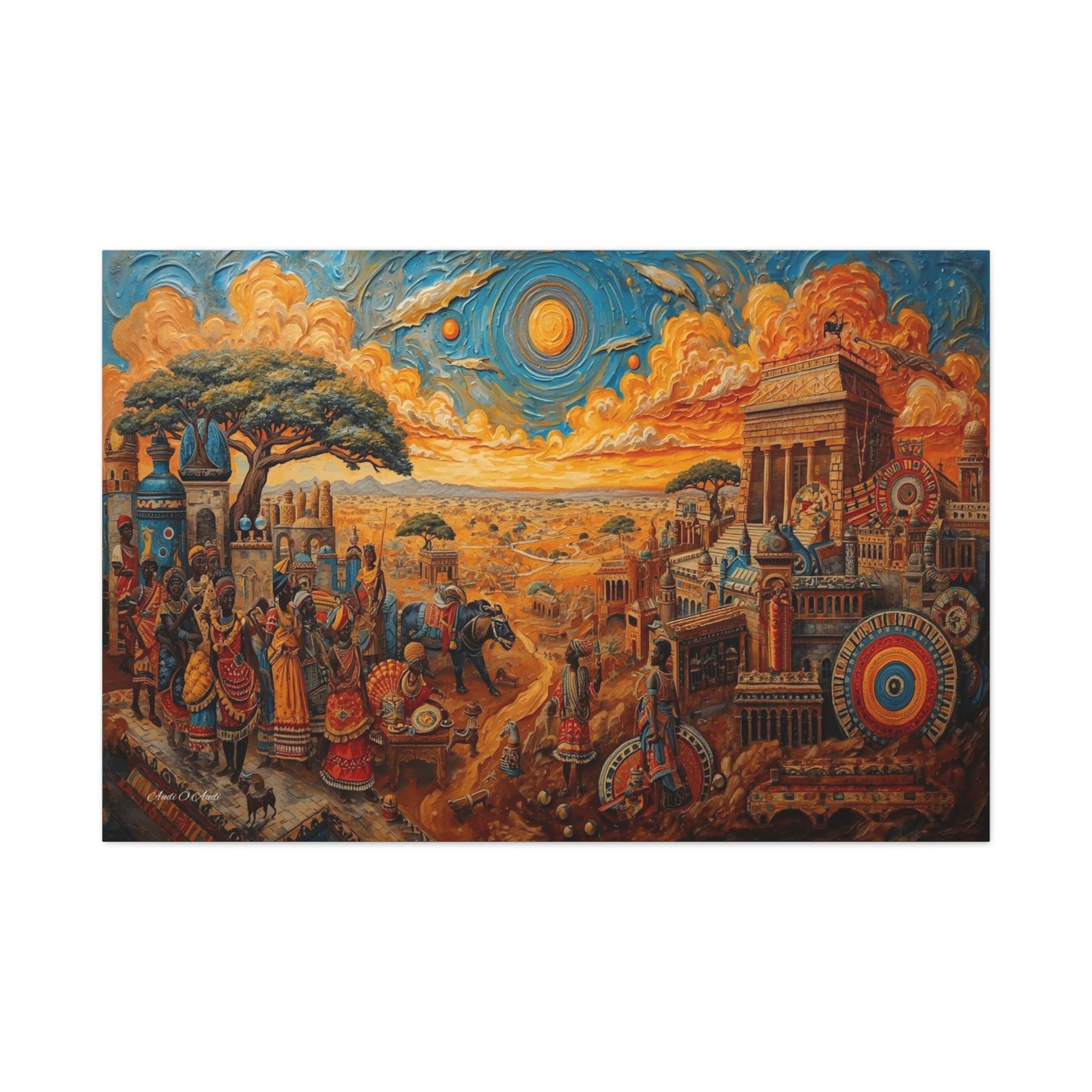 Step into a legendary world of prosperity and culture with this vibrant canvas print of a mythical African civilization. This epic landscape artwork captures the hustle and bustle of a thriving ancient city, complete with grand columned architecture, busy marketplaces, and citizens dressed in colorful, patterned regalia.