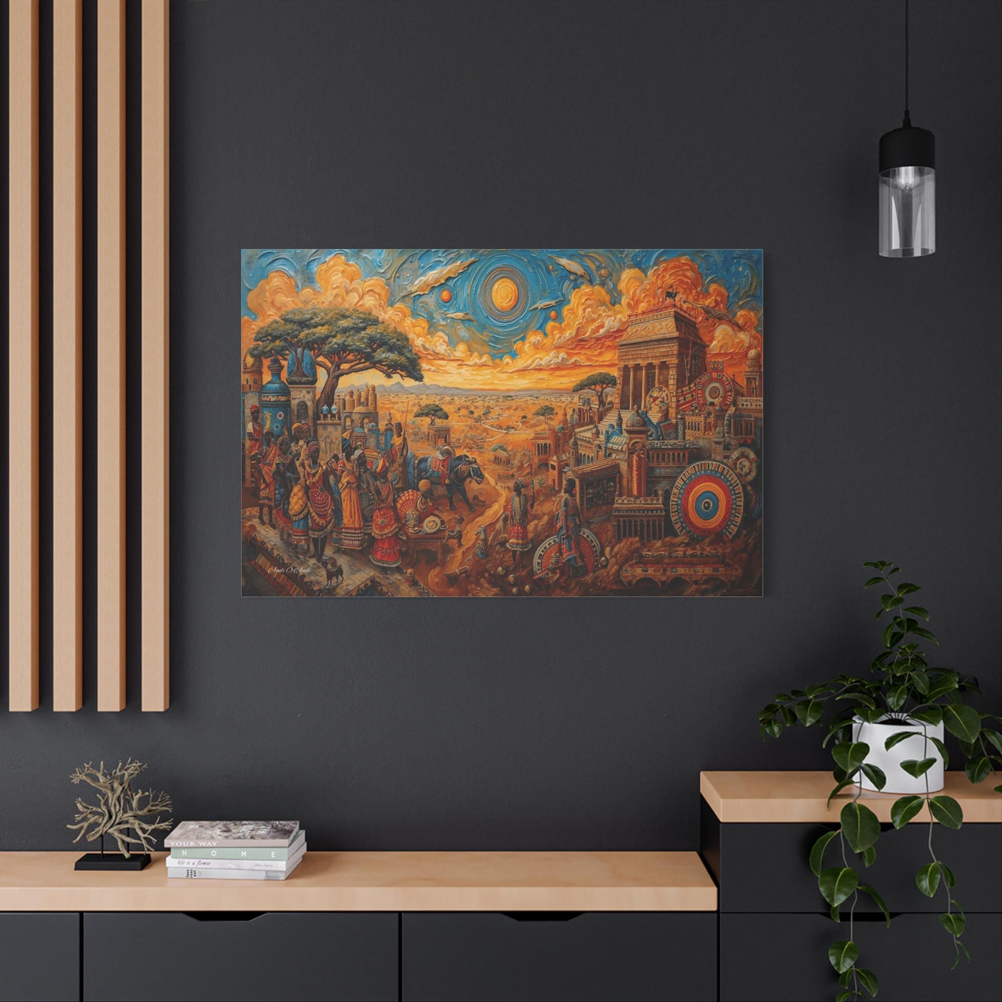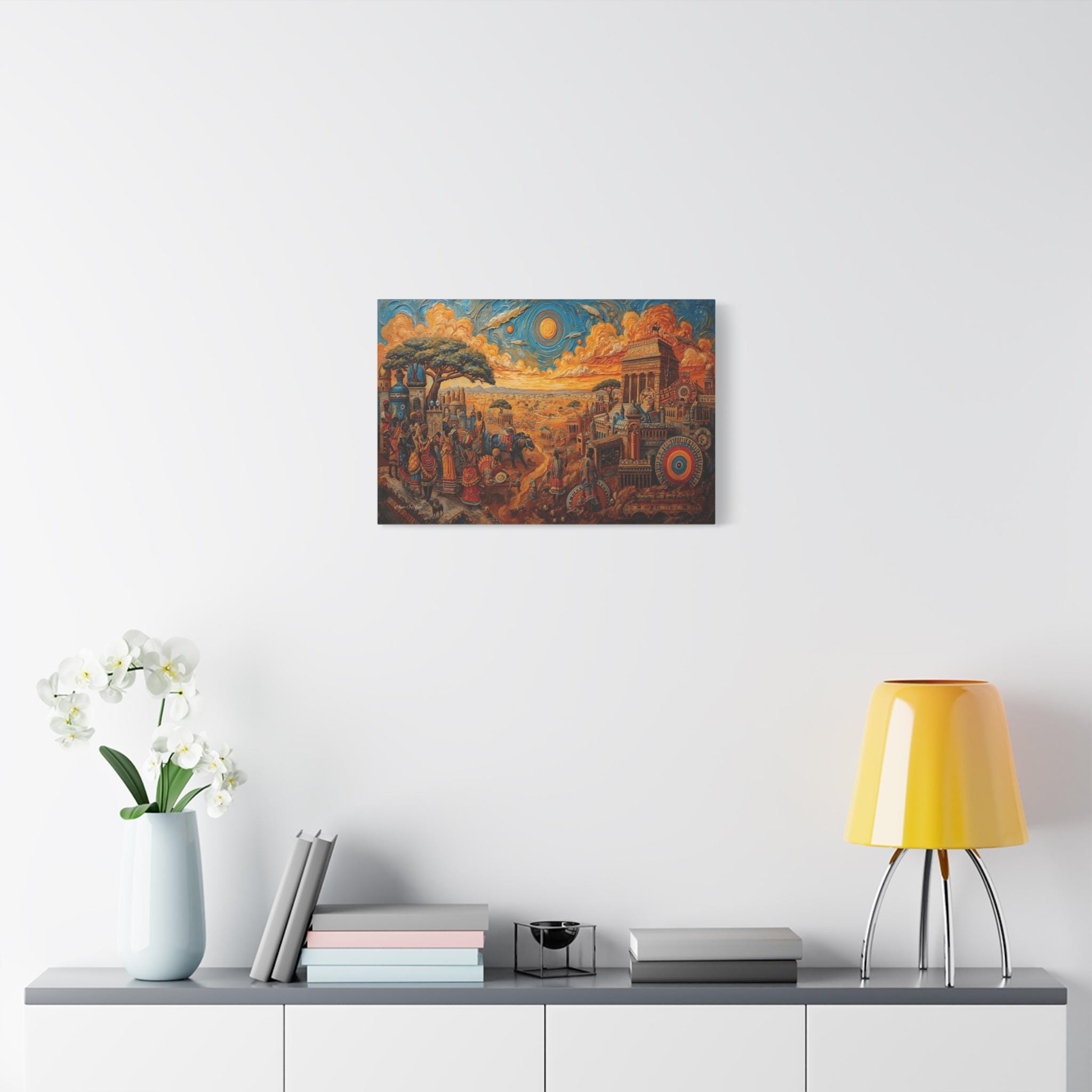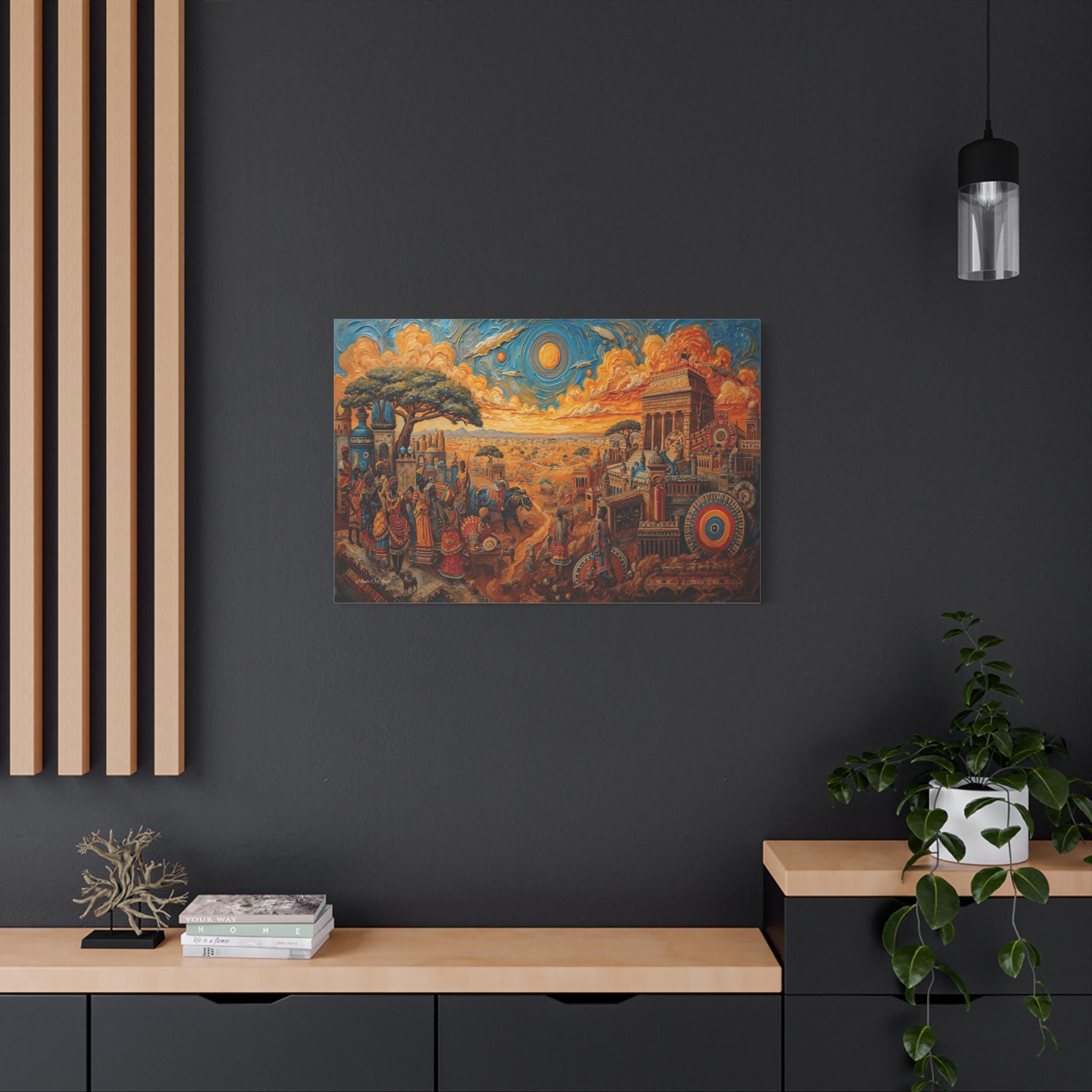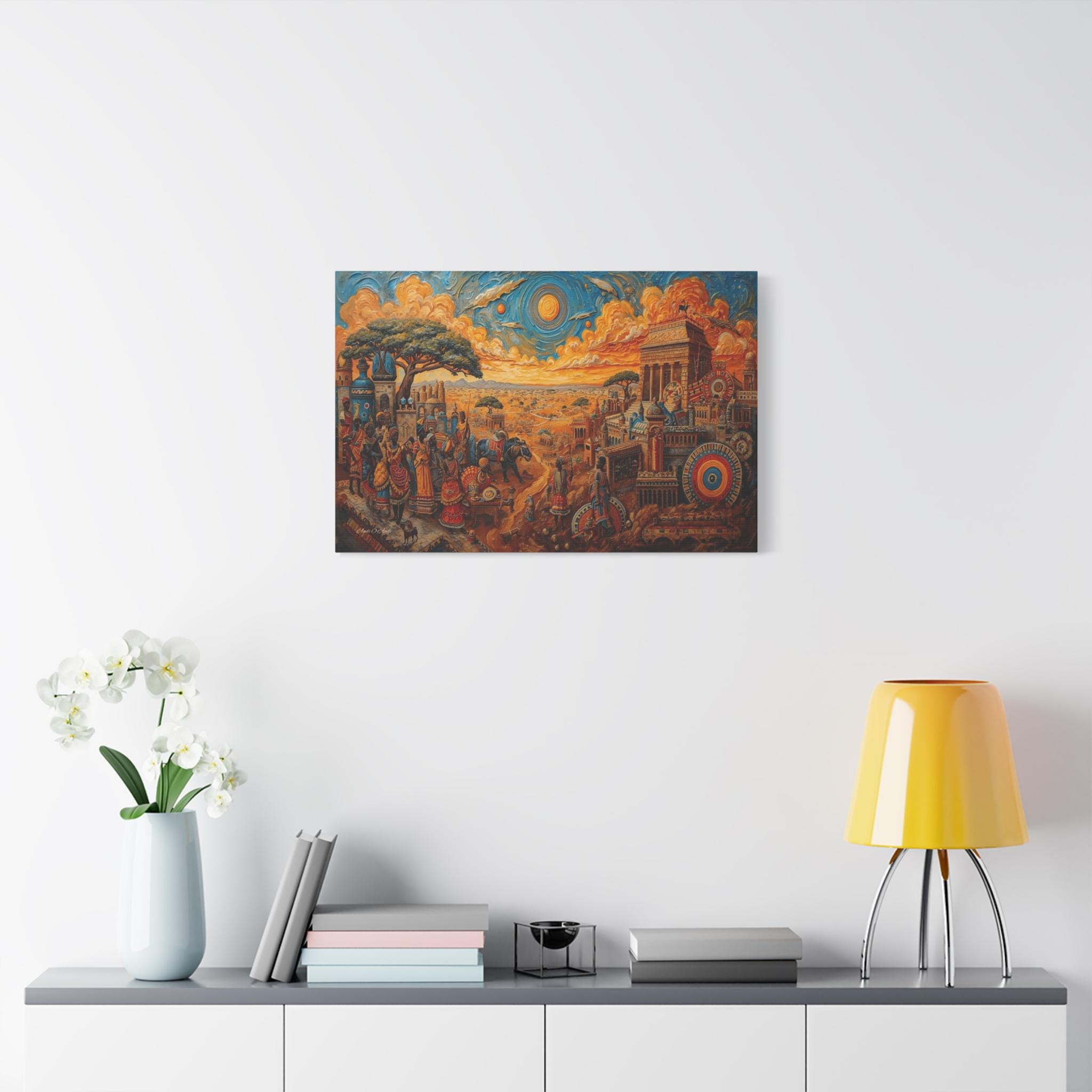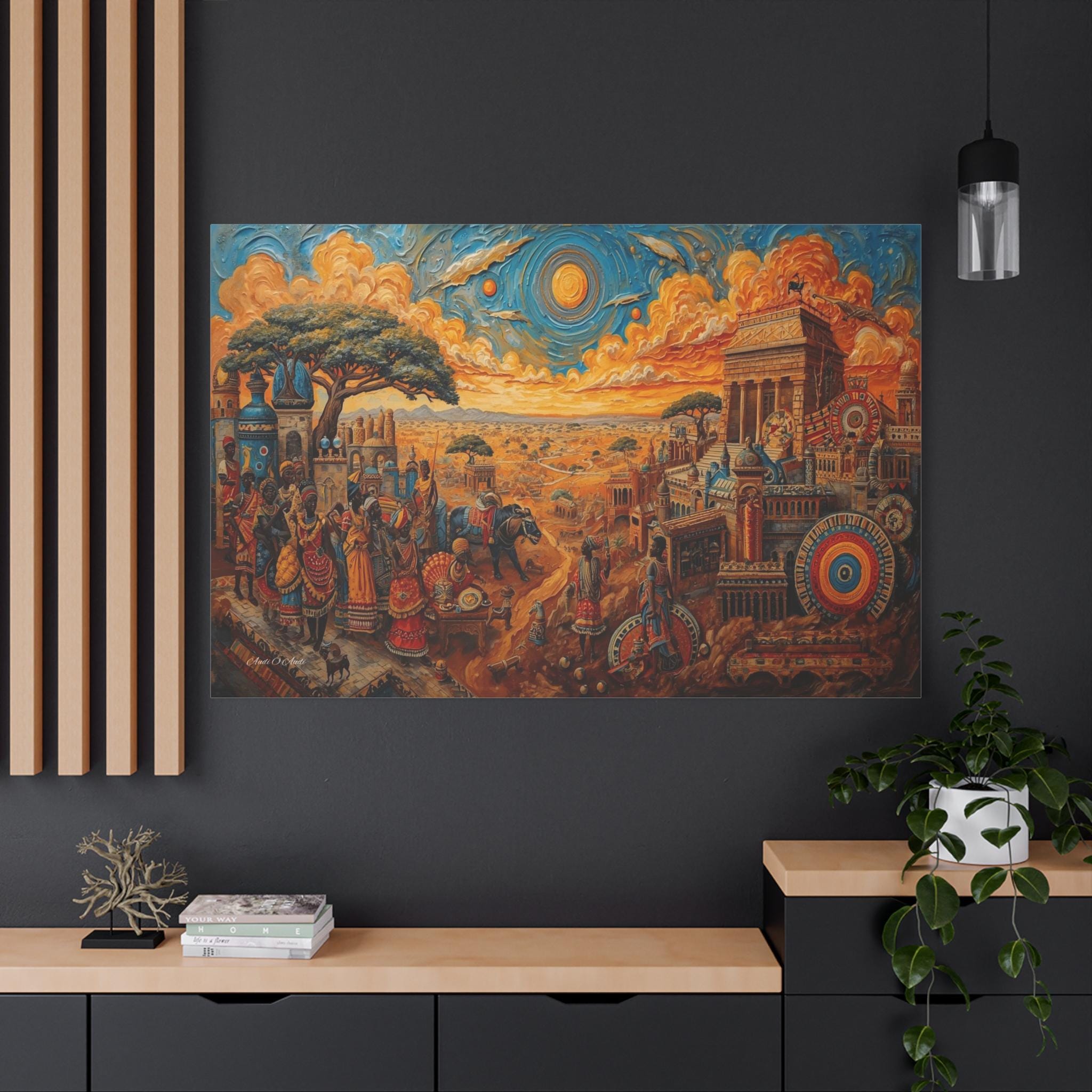 Step into a legendary world of prosperity and culture with this vibrant canvas print of a mythical African civilization. This epic landscape artwork captures the hustle and bustle of a thriving ancient city, complete with grand columned architecture, busy marketplaces, and citizens dressed in colorful, patterned regalia.