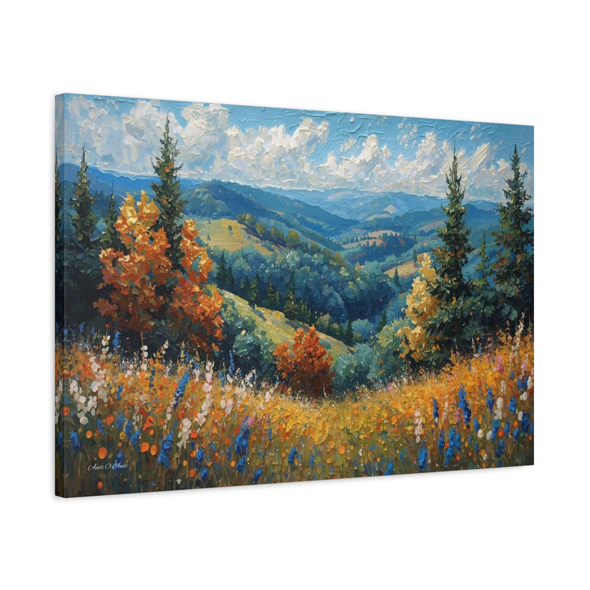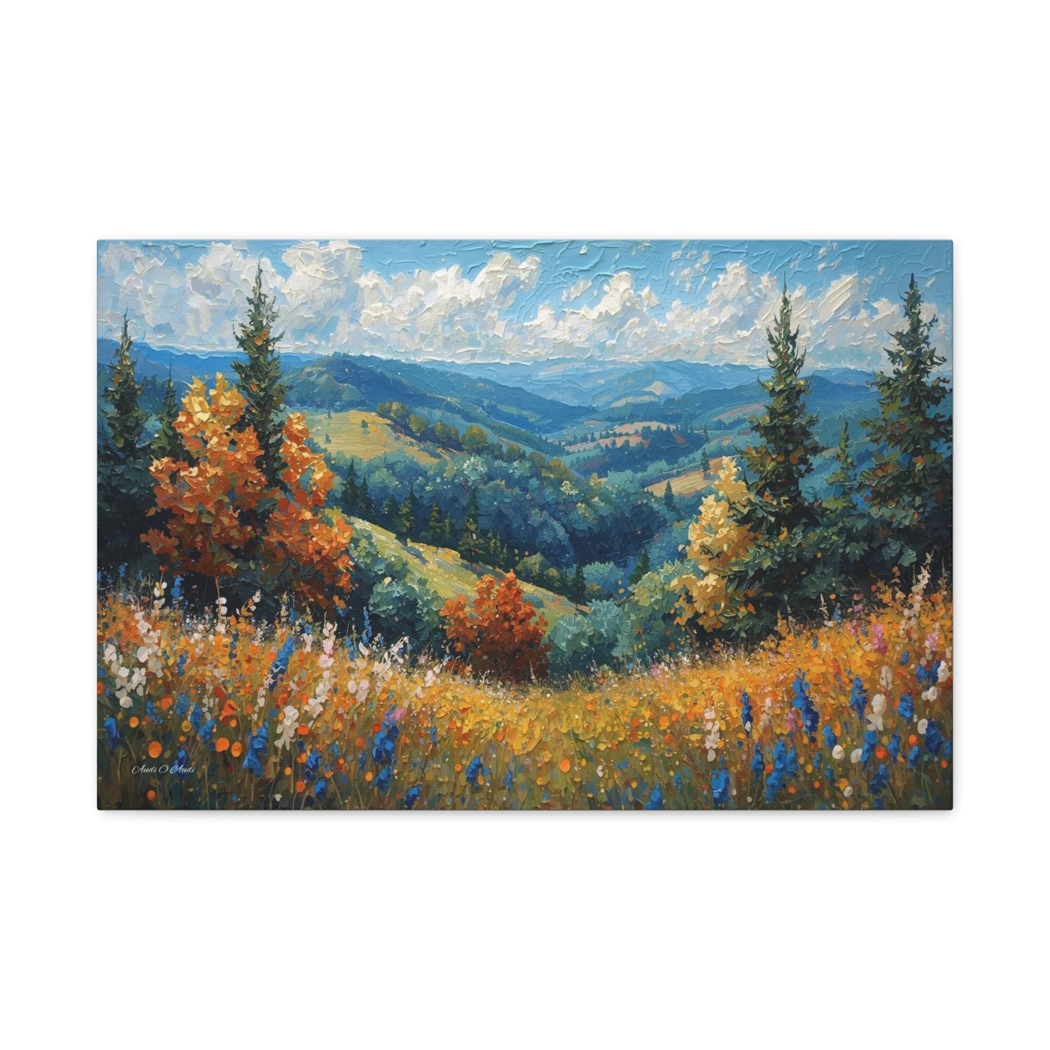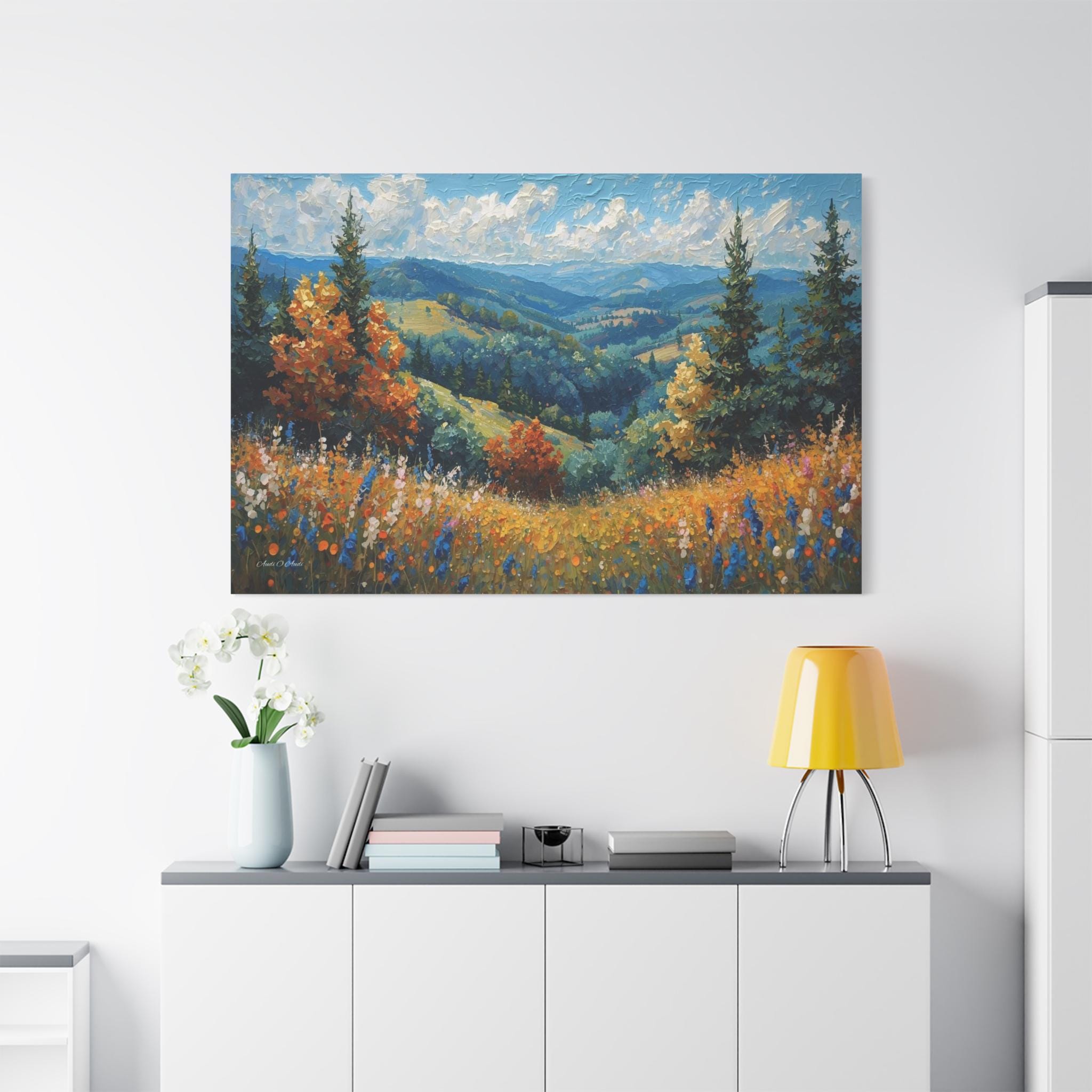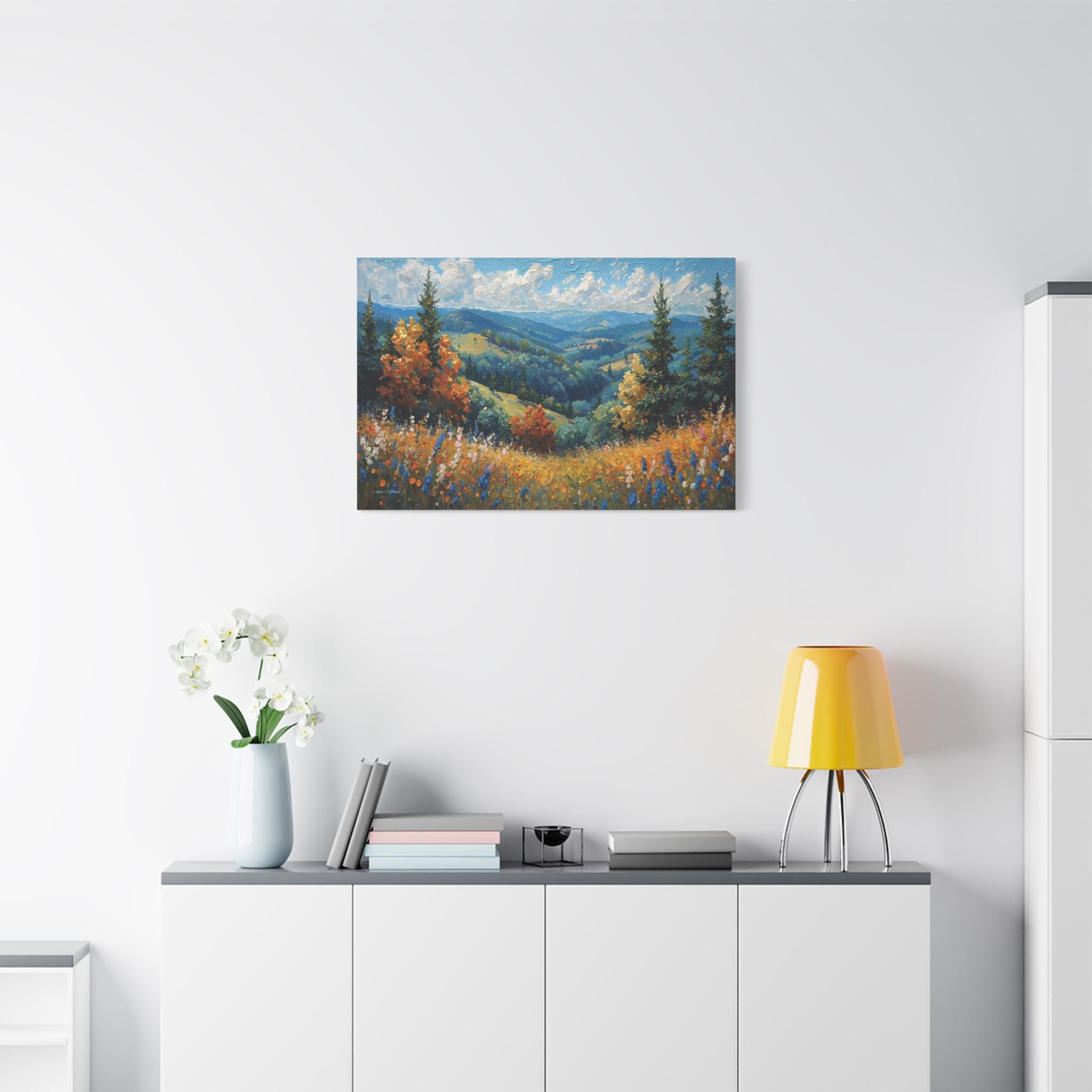 Bring the fresh, crisp beauty of the mountains into your home with this stunning canvas print of an alpine meadow. This scenic landscape artwork captures a breathtaking view of rolling green valleys and distant blue mountains, framed by towering pine trees and vibrant trees turning to autumn gold.