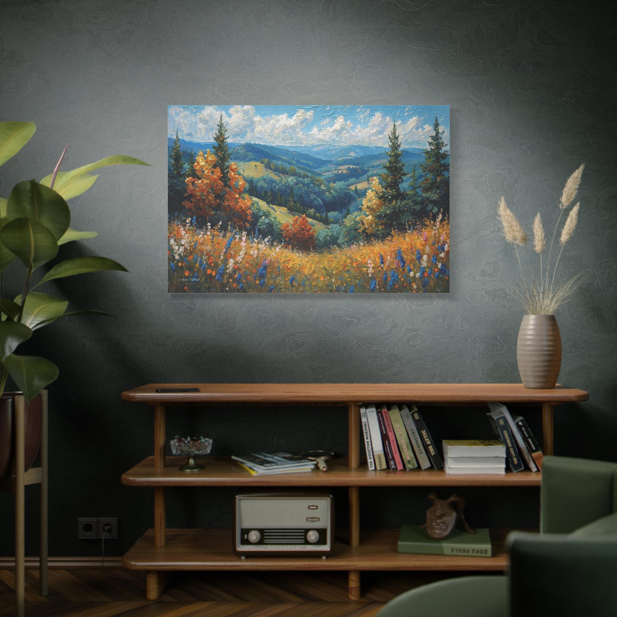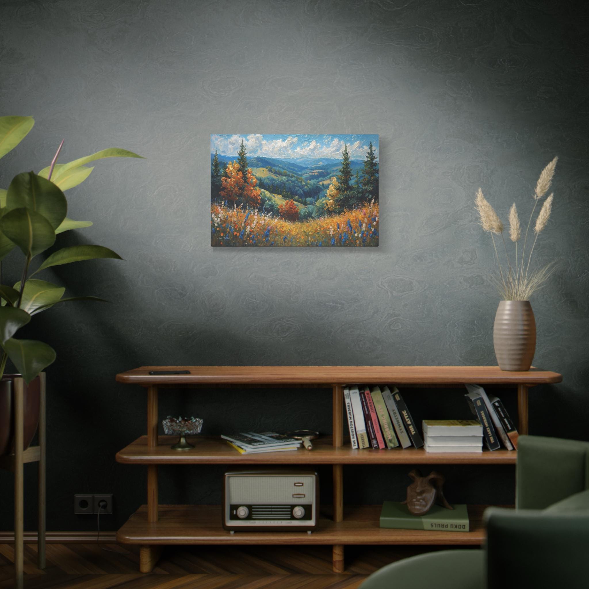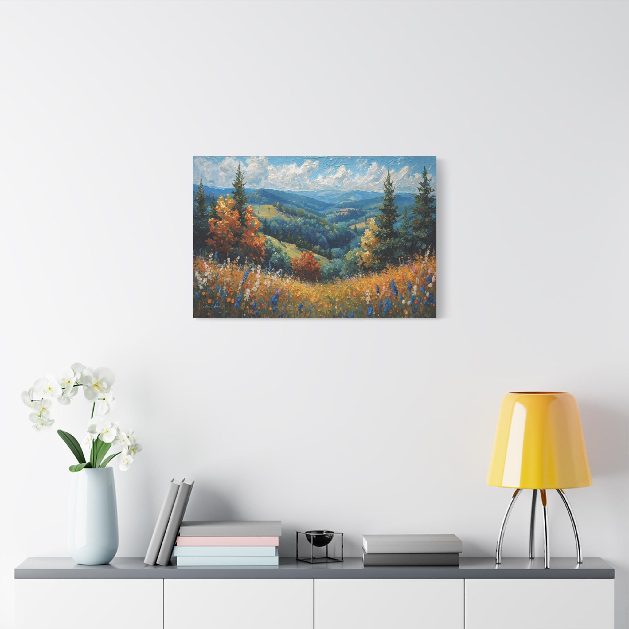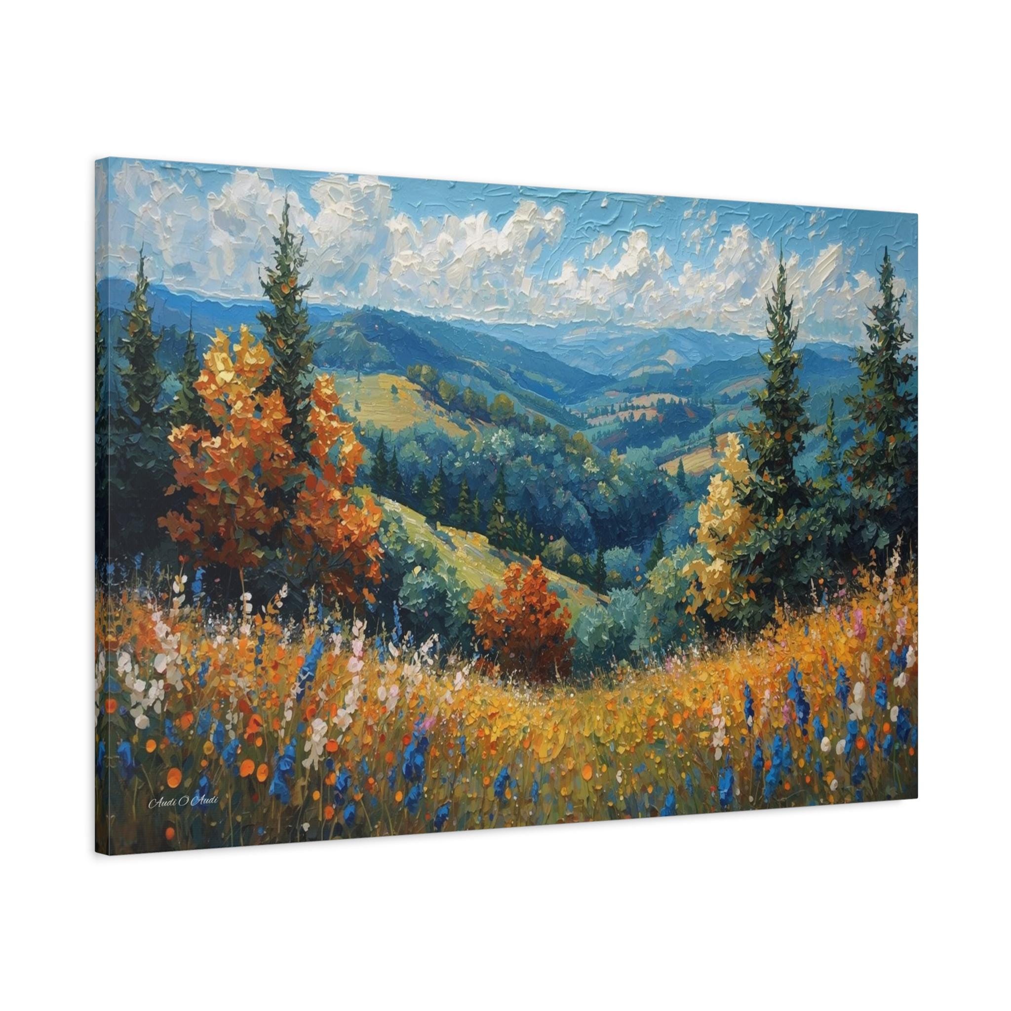 Bring the fresh, crisp beauty of the mountains into your home with this stunning canvas print of an alpine meadow. This scenic landscape artwork captures a breathtaking view of rolling green valleys and distant blue mountains, framed by towering pine trees and vibrant trees turning to autumn gold.