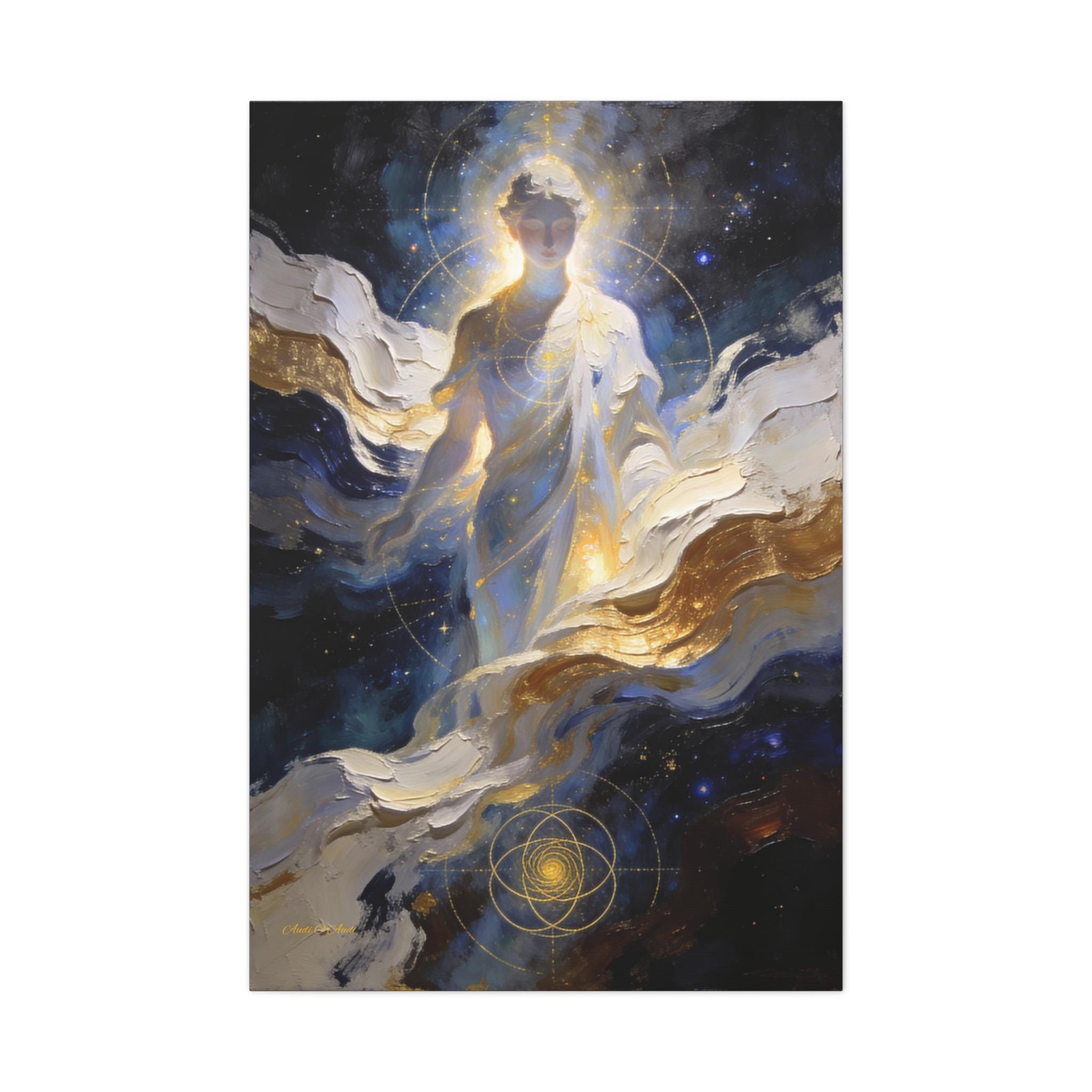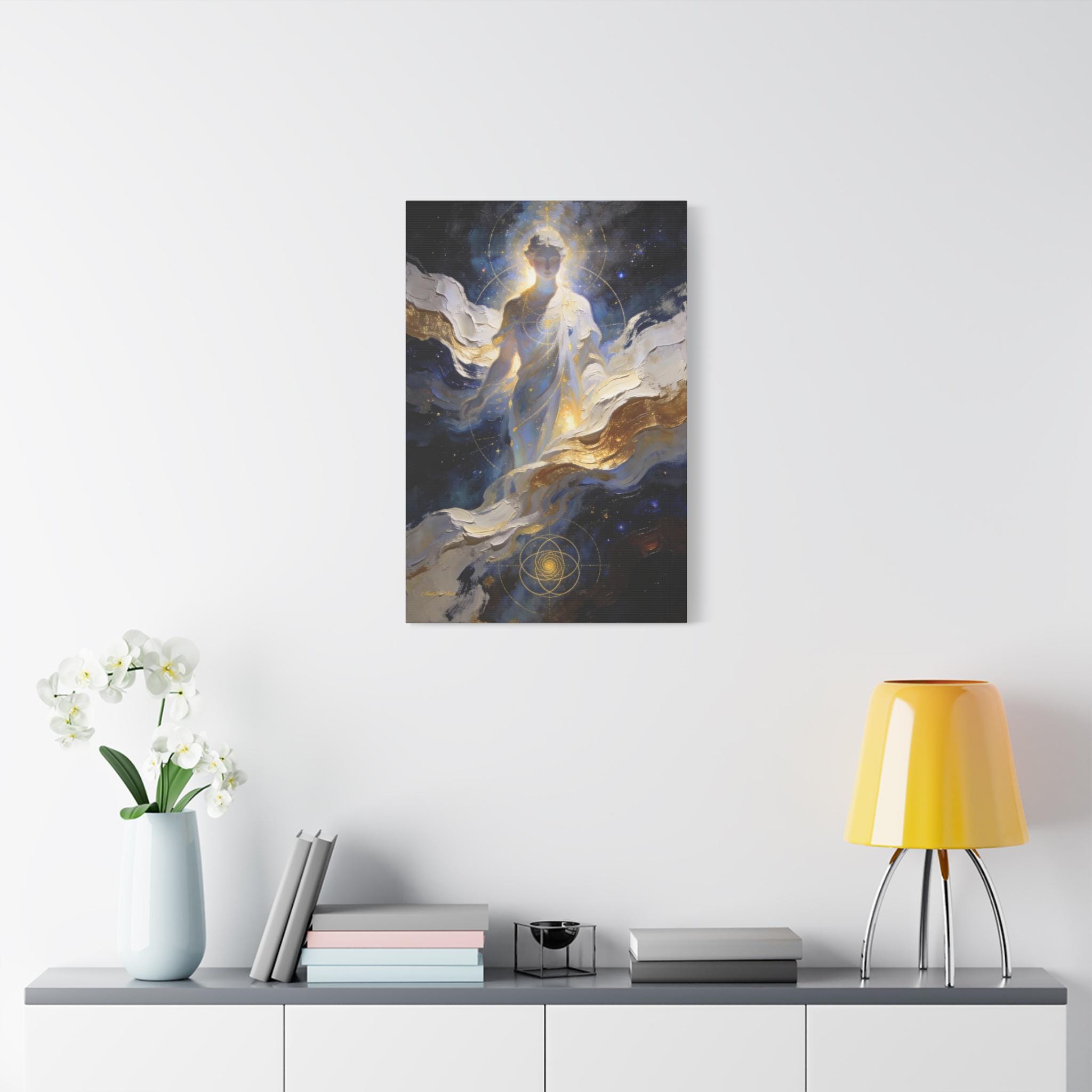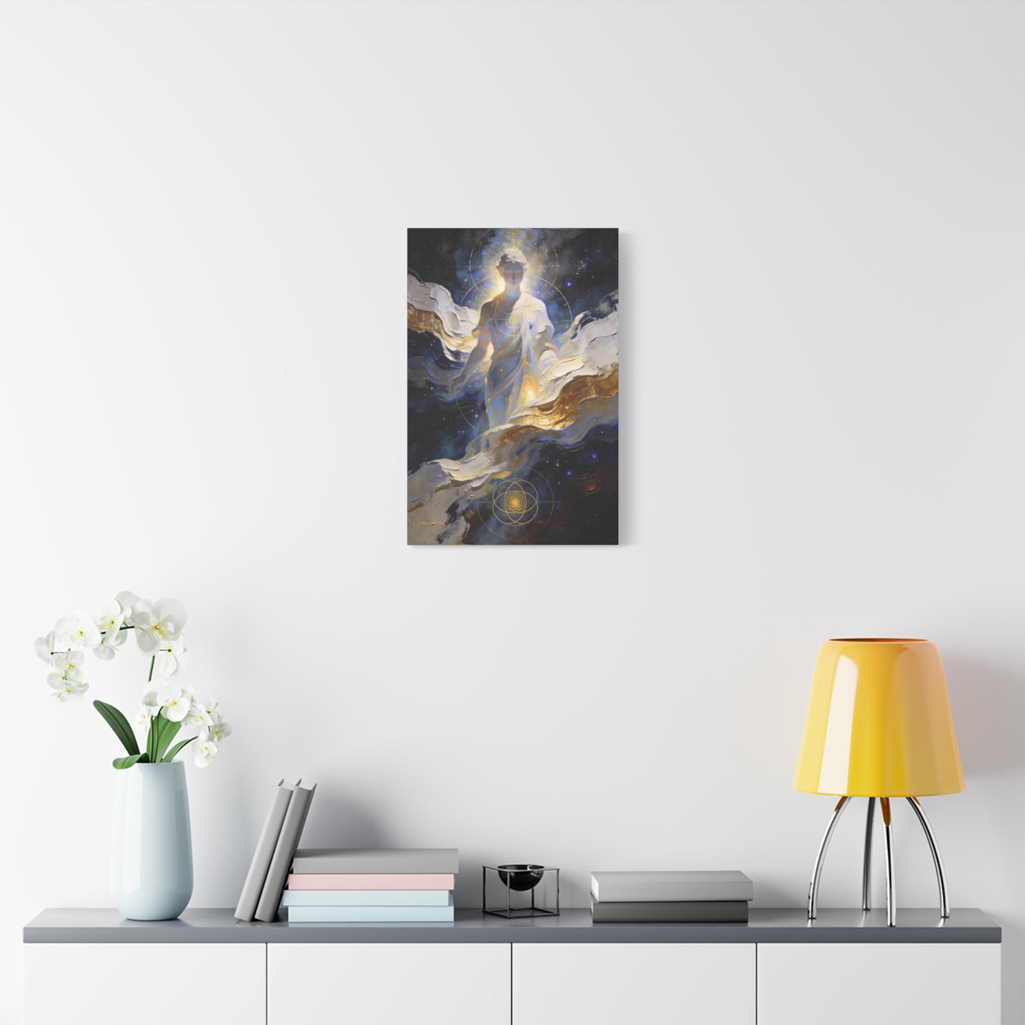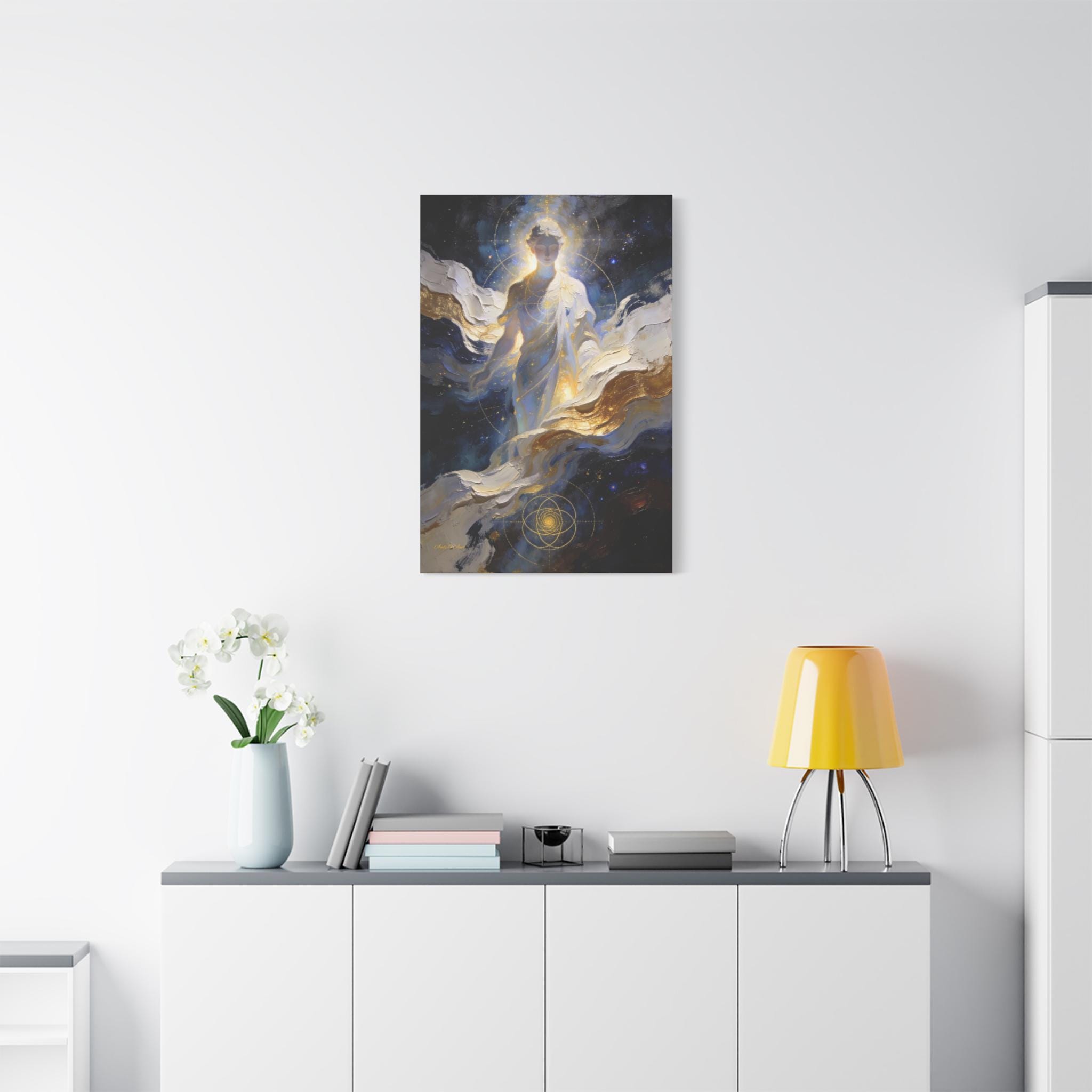 Illuminate your space with the divine presence of this ethereal canvas print. This mystical artwork depicts a glowing celestial figure emerging from swirling clouds of deep midnight blue, white, and gold. The figure is overlaid with delicate sacred geometry lines, symbolizing the hidden order and connection of the universe.