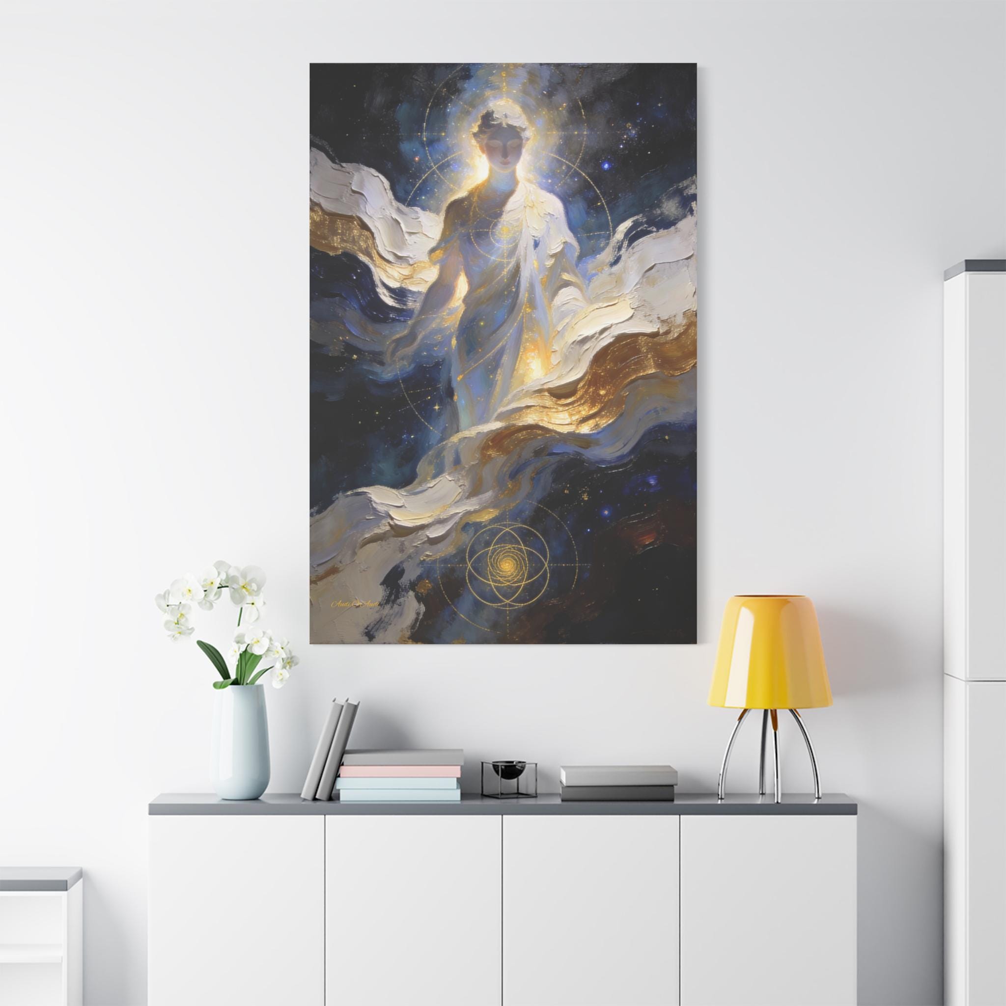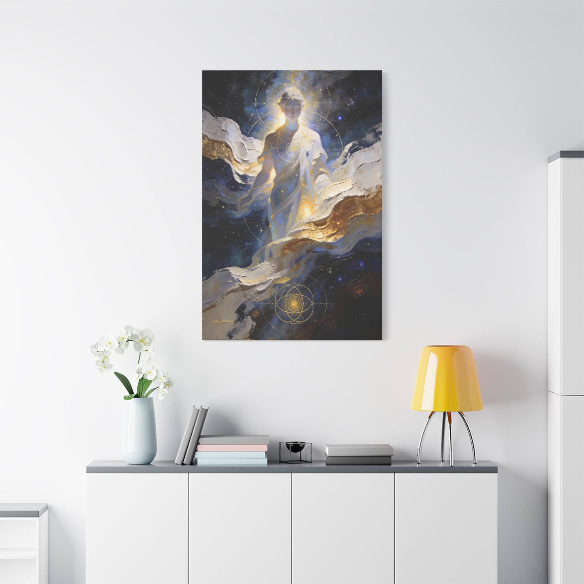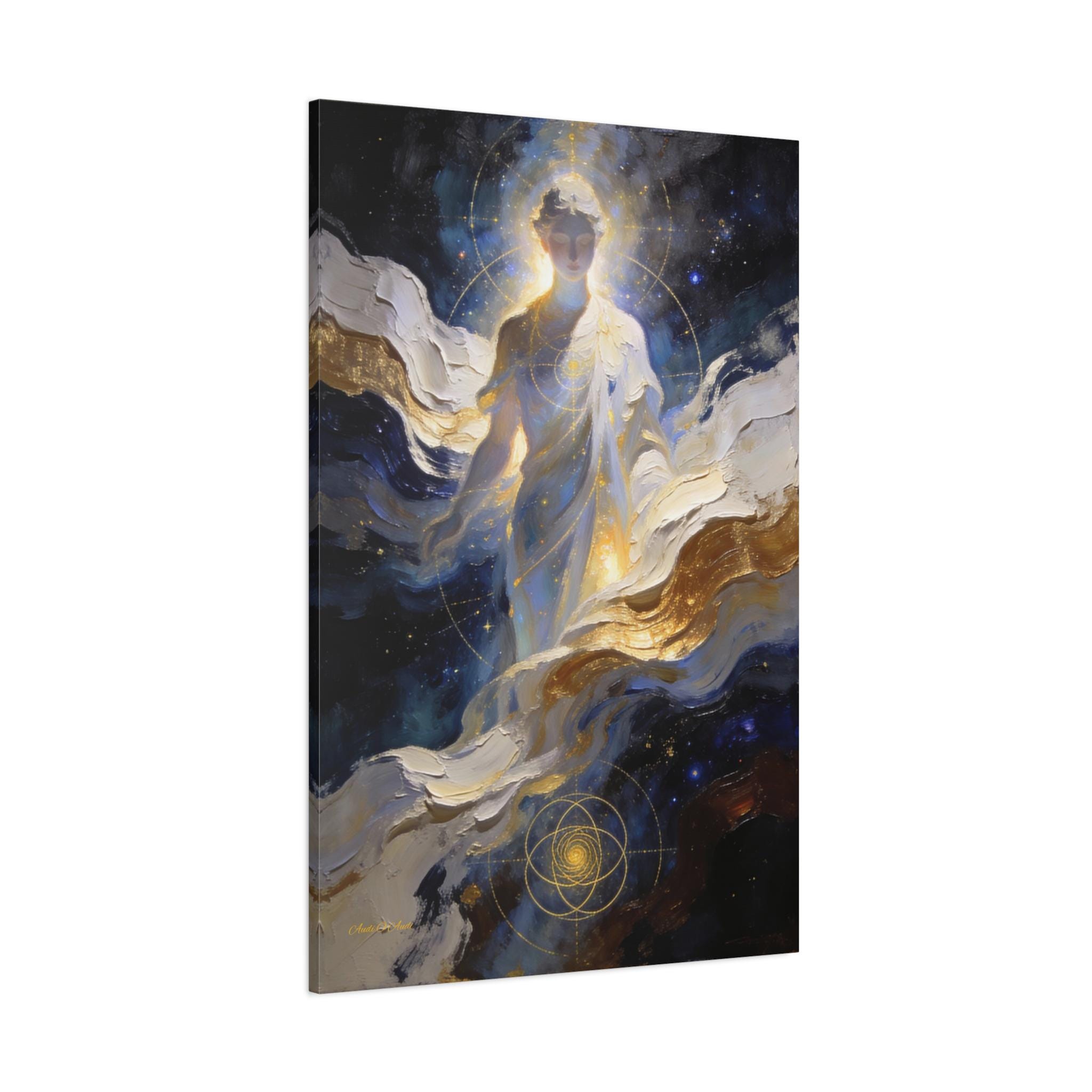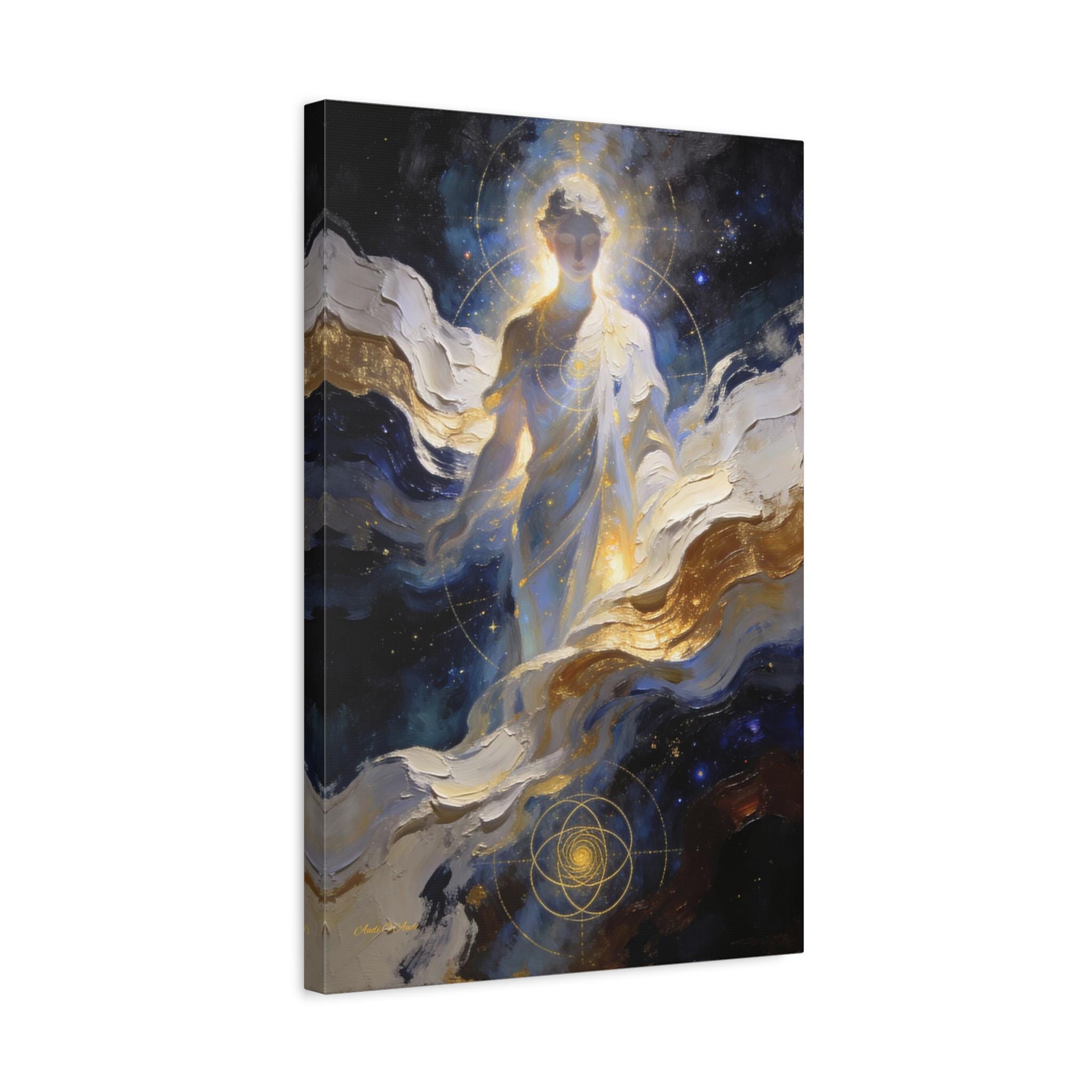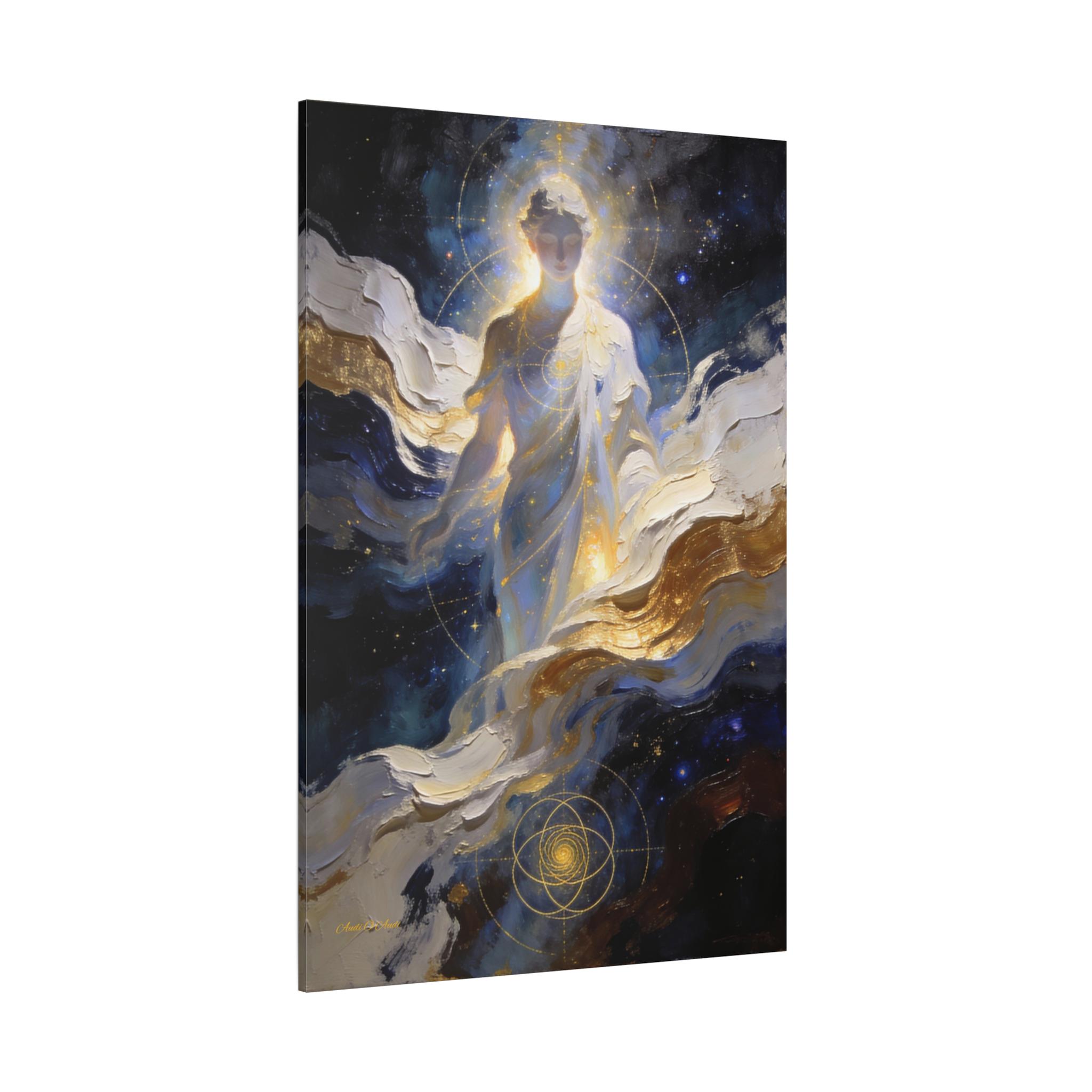 Illuminate your space with the divine presence of this ethereal canvas print. This mystical artwork depicts a glowing celestial figure emerging from swirling clouds of deep midnight blue, white, and gold. The figure is overlaid with delicate sacred geometry lines, symbolizing the hidden order and connection of the universe.