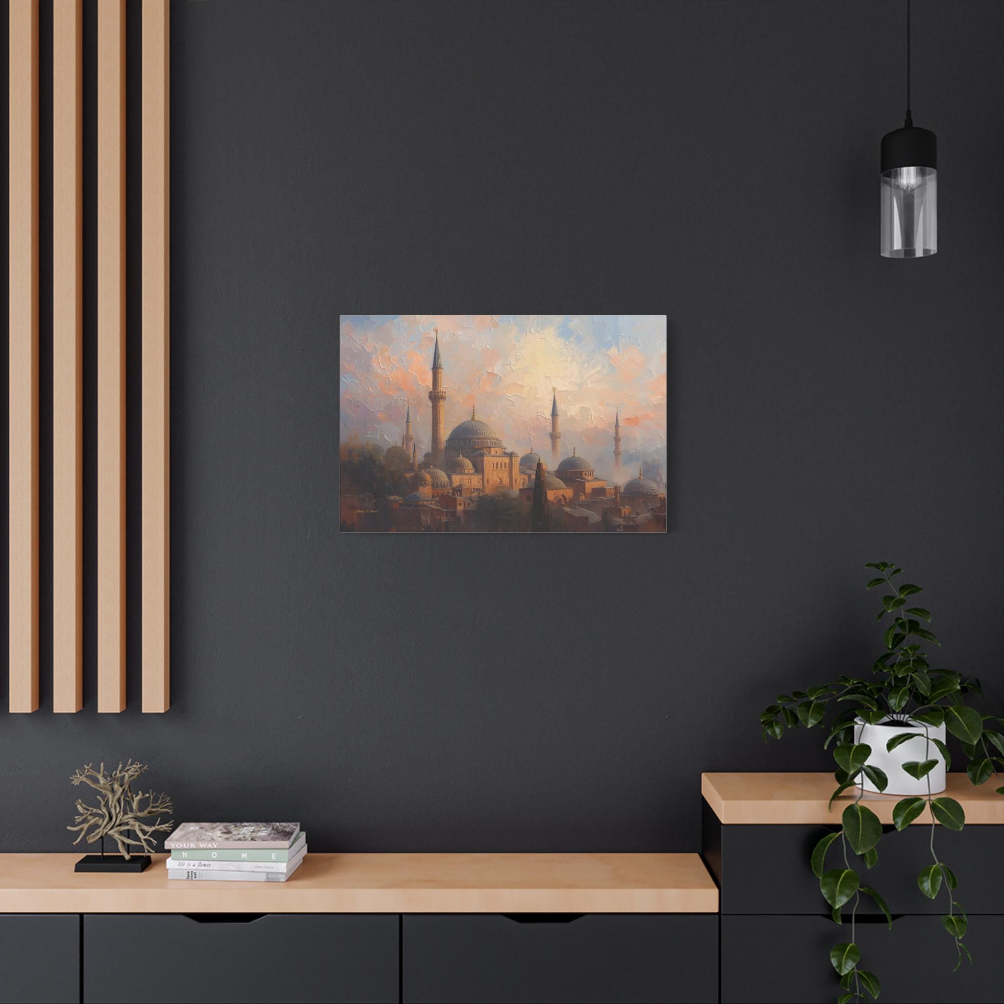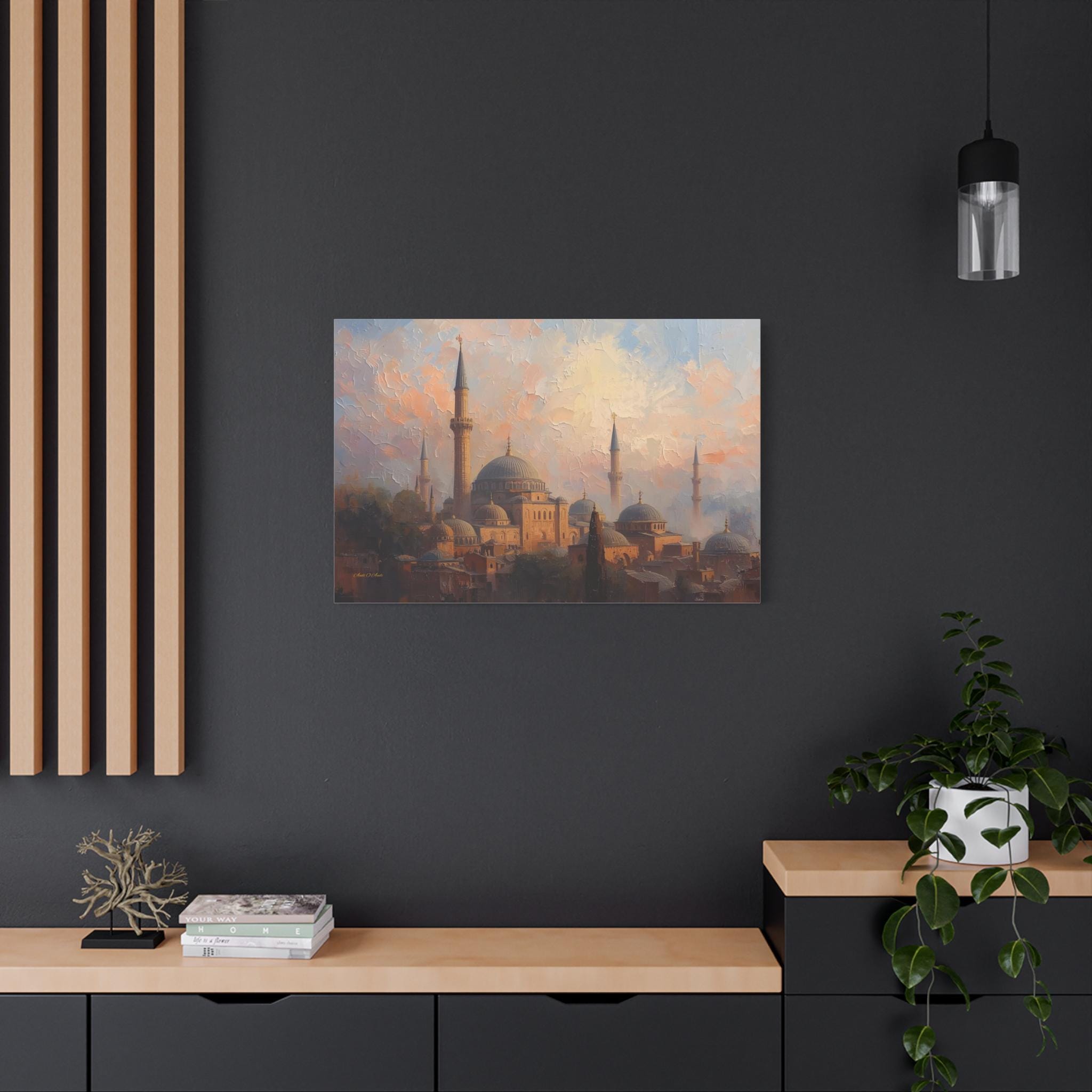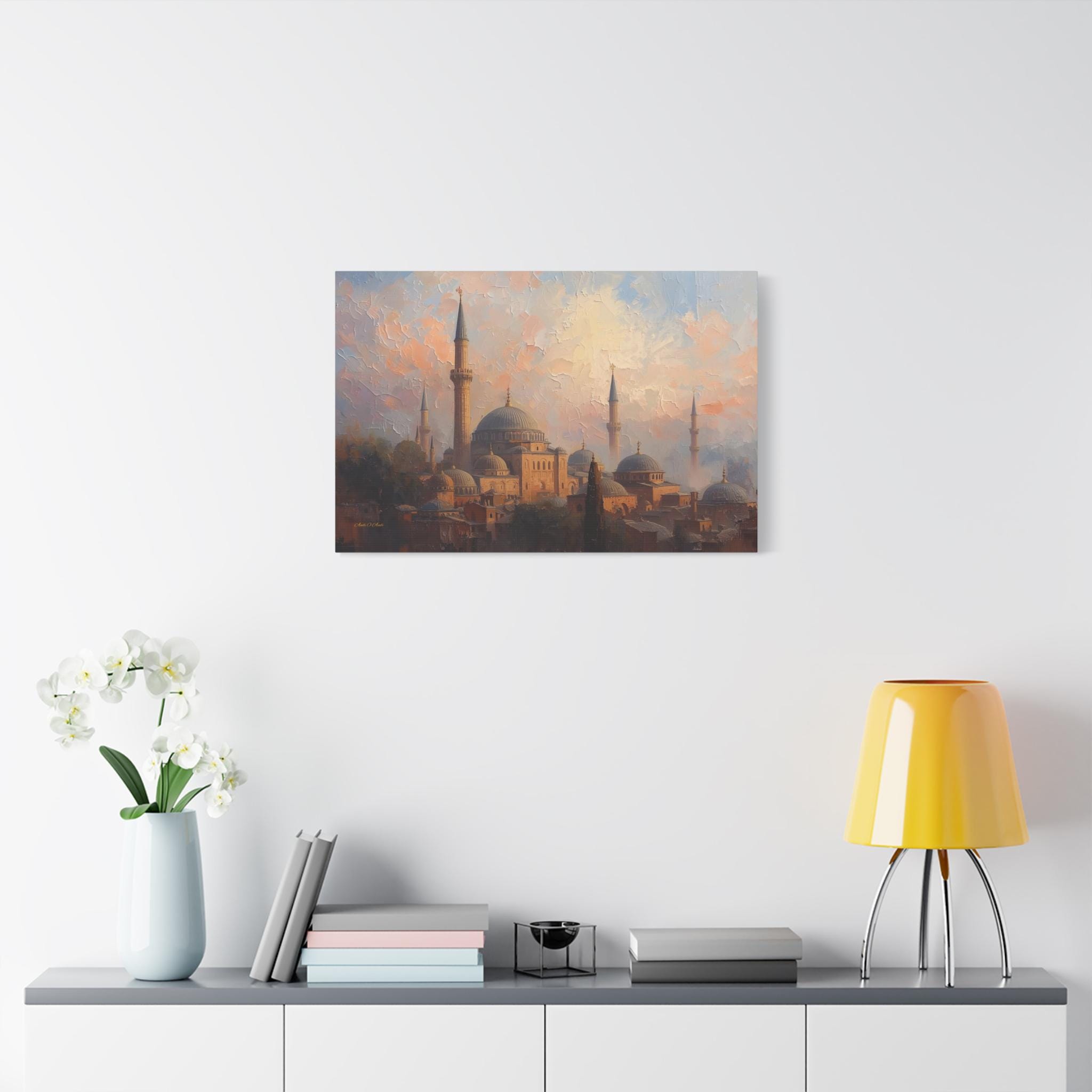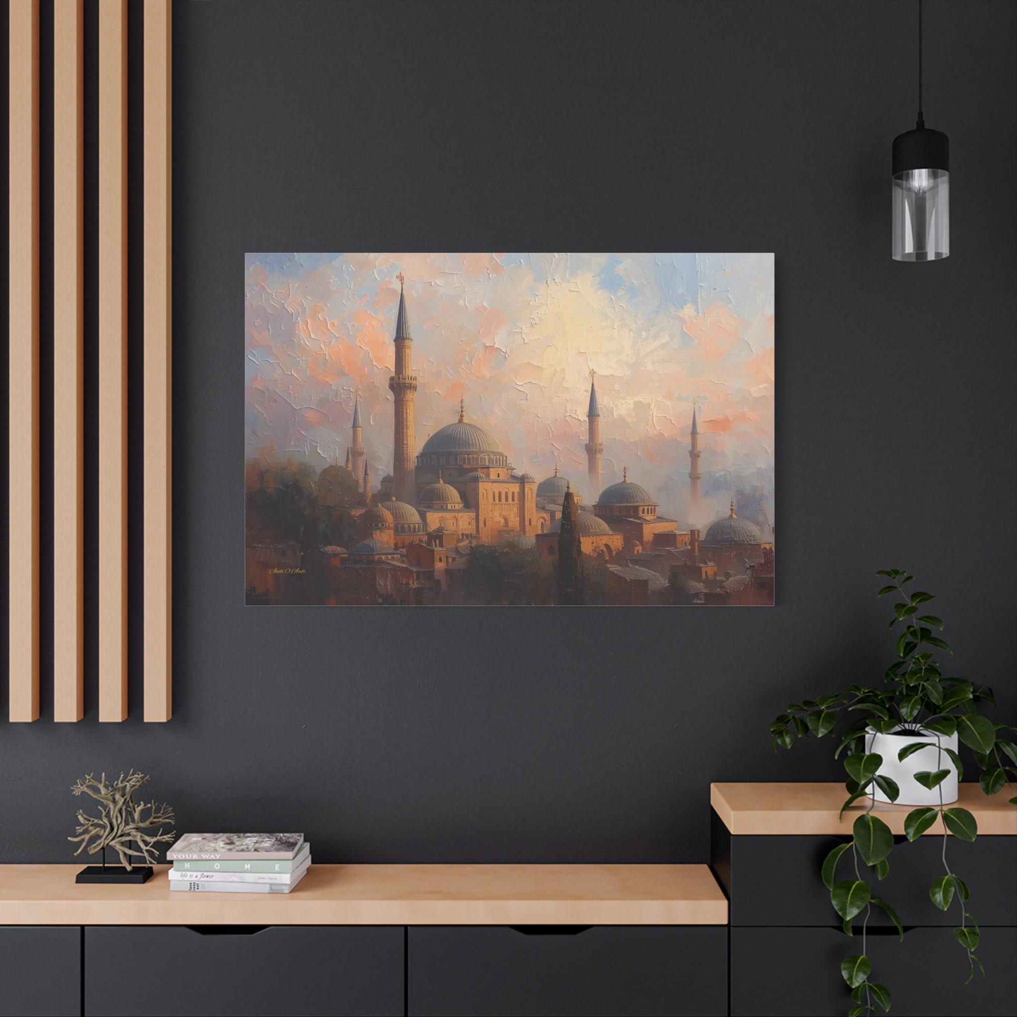 Bring the breathtaking beauty of the Orient into your home with this dreamy canvas print of a Great Mosque at sunset. This majestic artwork captures the iconic silhouette of Ottoman-style architecture, featuring a cascade of grand domes and towering minarets reaching up into a textured, cloud-filled sky.