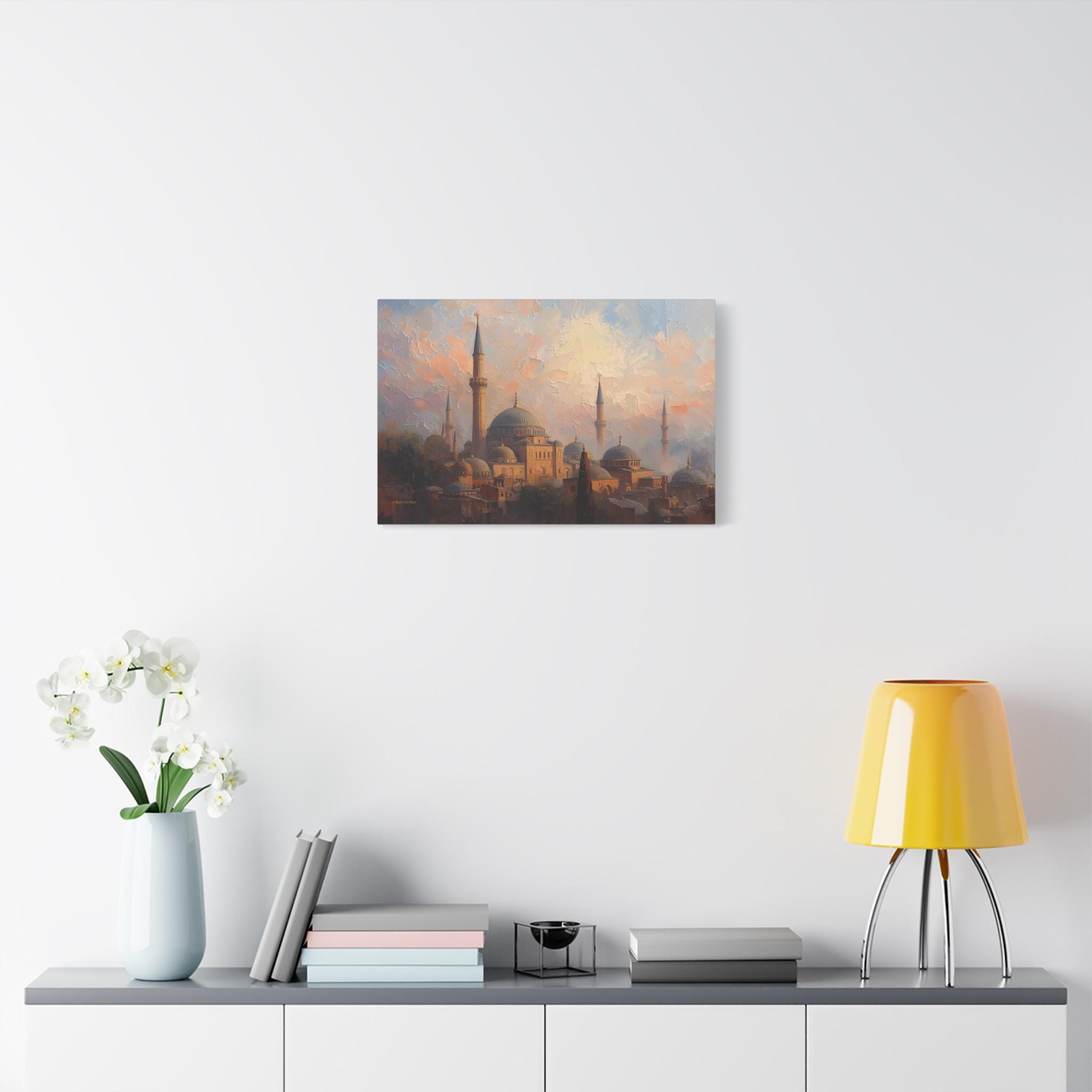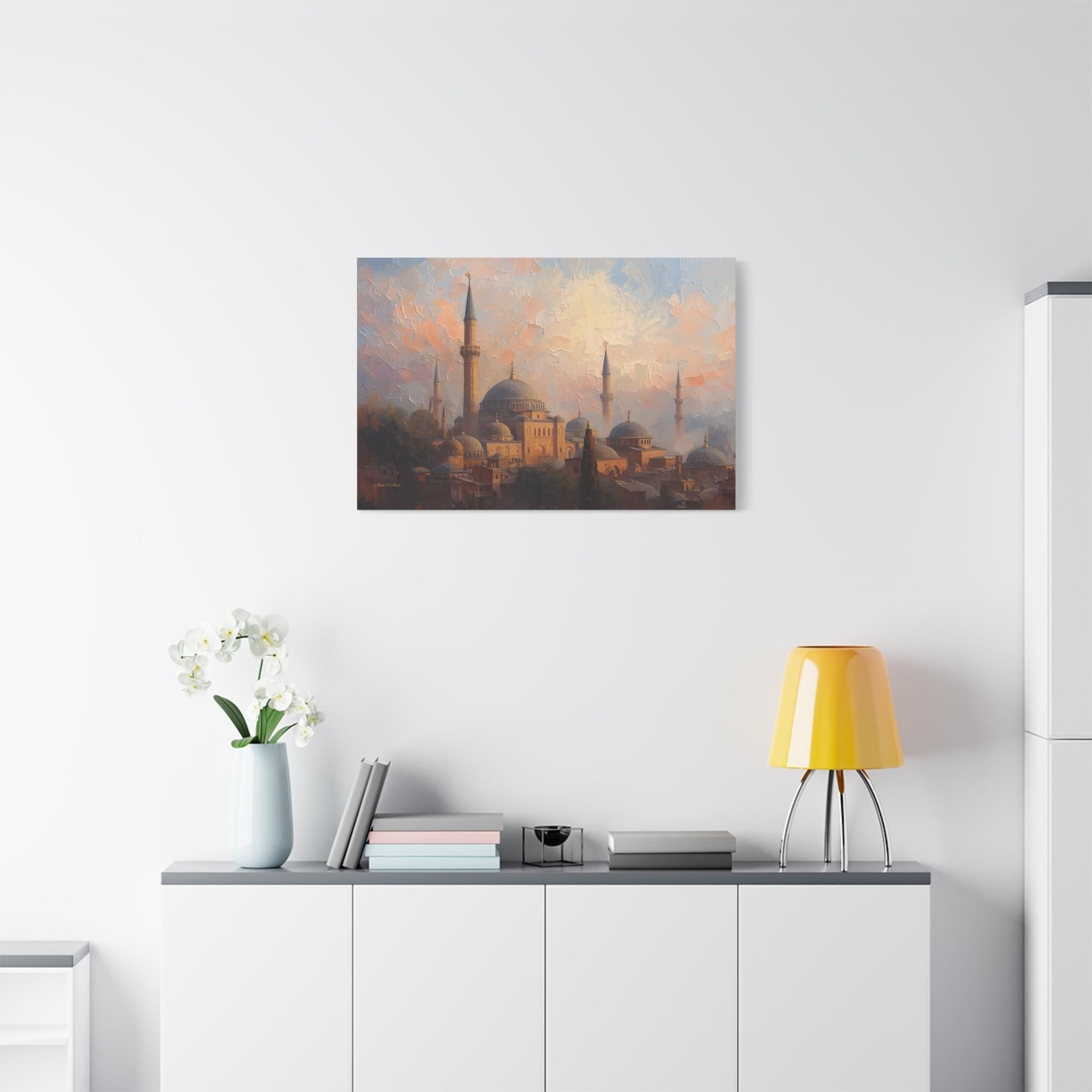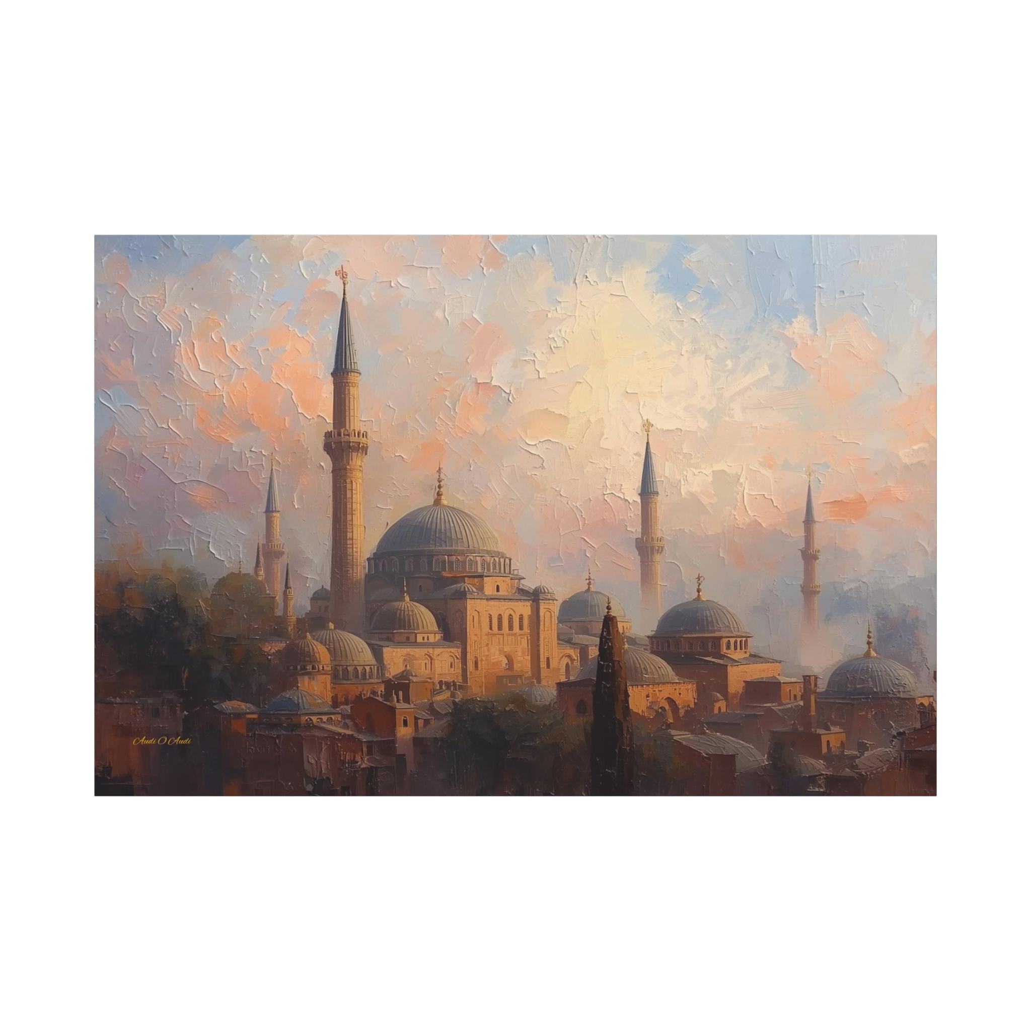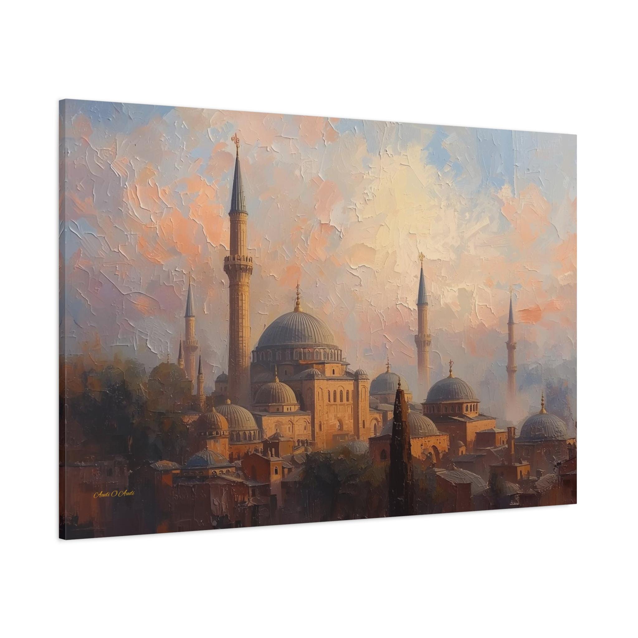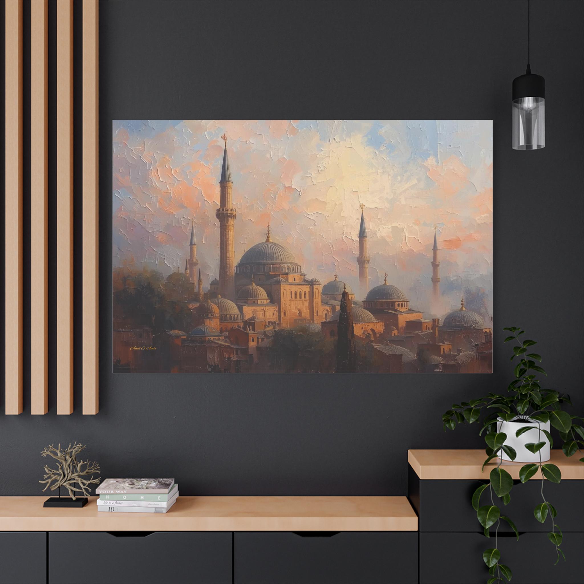 Bring the breathtaking beauty of the Orient into your home with this dreamy canvas print of a Great Mosque at sunset. This majestic artwork captures the iconic silhouette of Ottoman-style architecture, featuring a cascade of grand domes and towering minarets reaching up into a textured, cloud-filled sky.