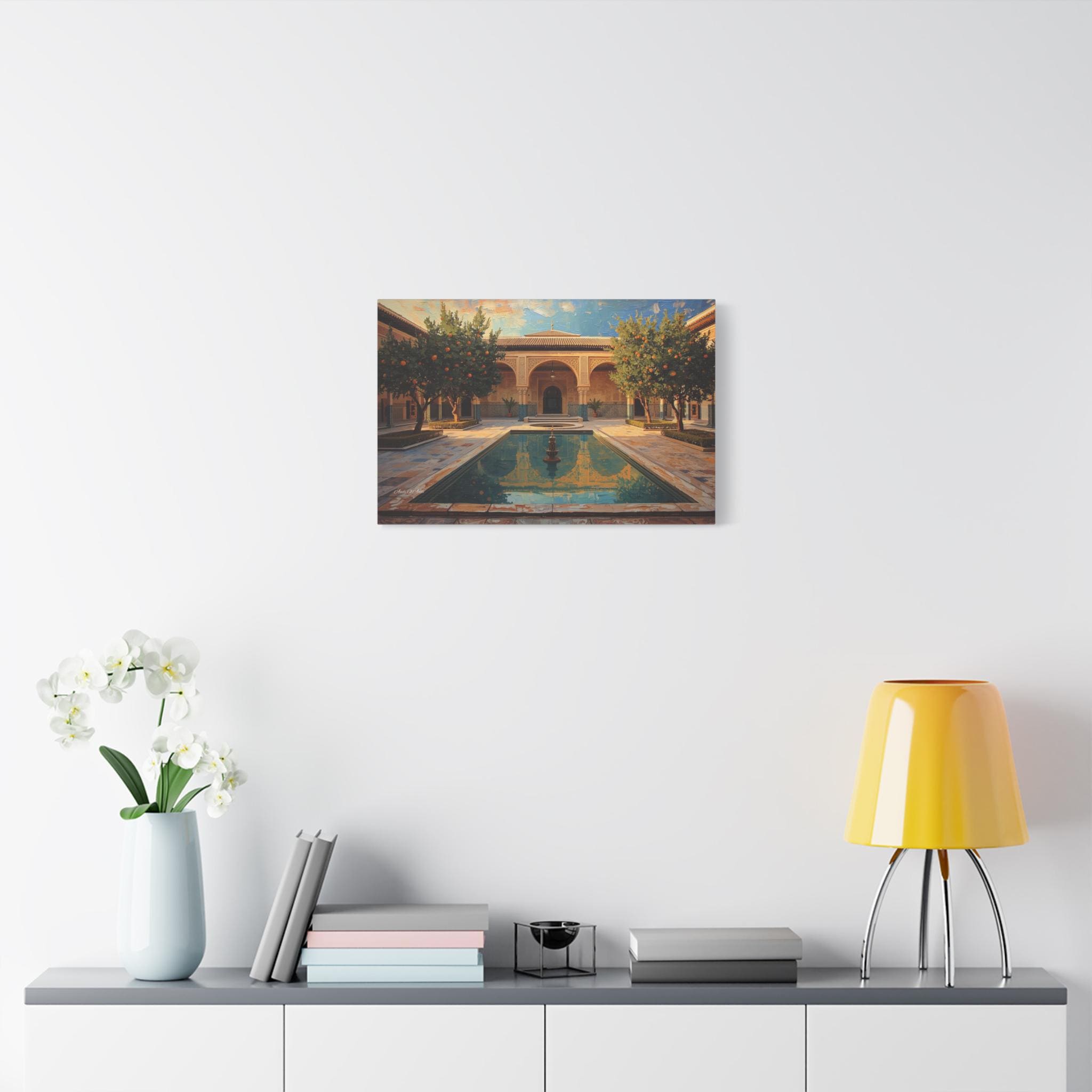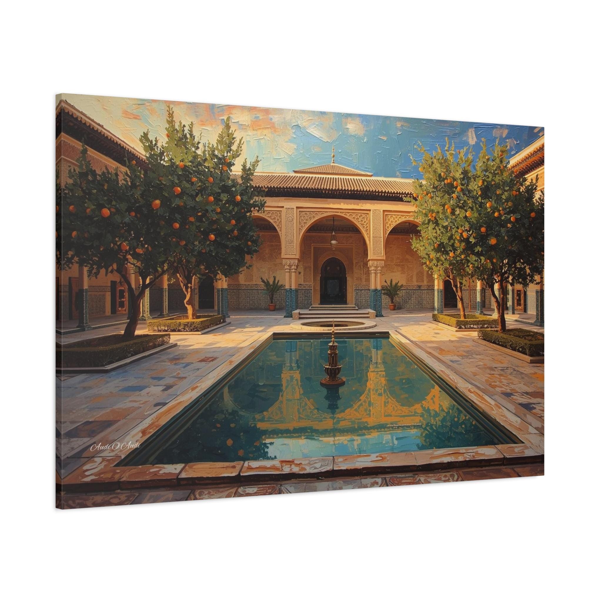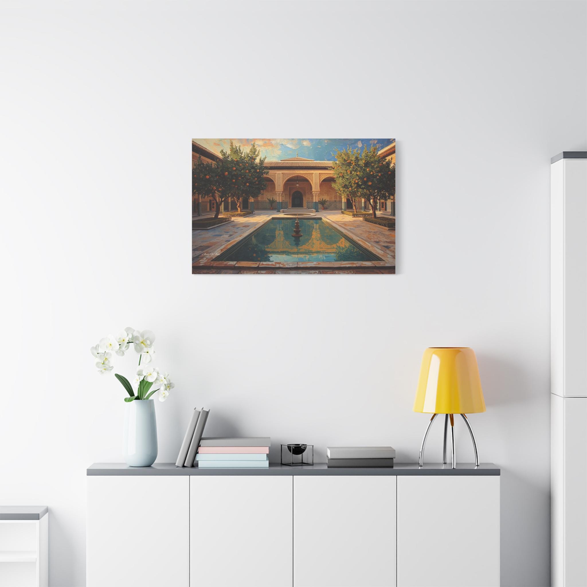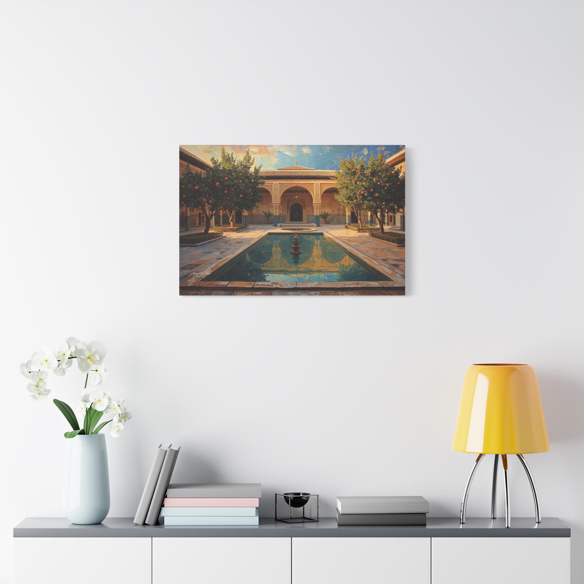 Escape to a sun-drenched paradise with this stunning canvas print of a hidden courtyard. This vibrant architectural artwork captures the beauty of a Moorish-style garden (reminiscent of the Alhambra or a Moroccan Riad), featuring intricate sandstone arches, lush orange trees heavy with fruit, and a tranquil central pool reflecting the blue sky.