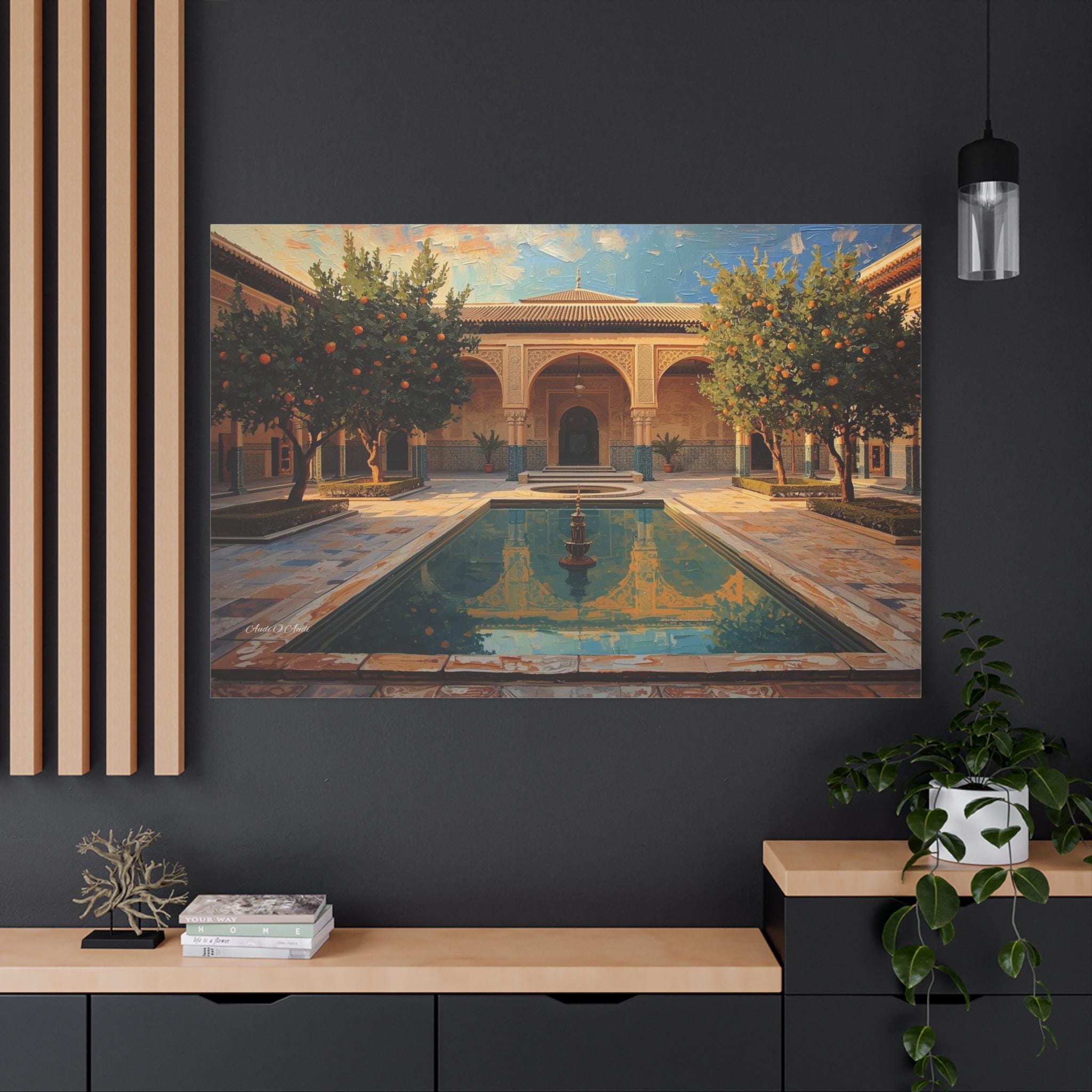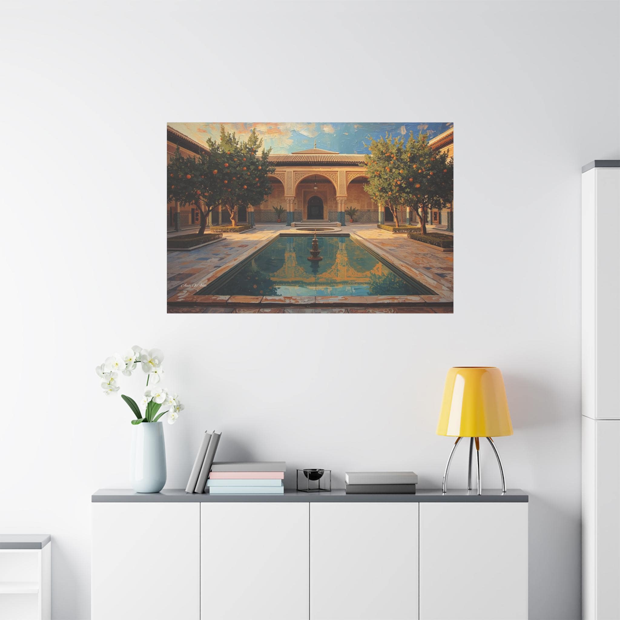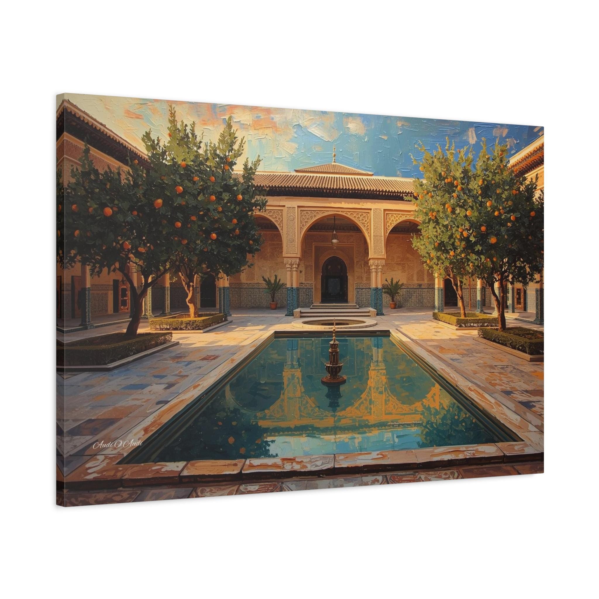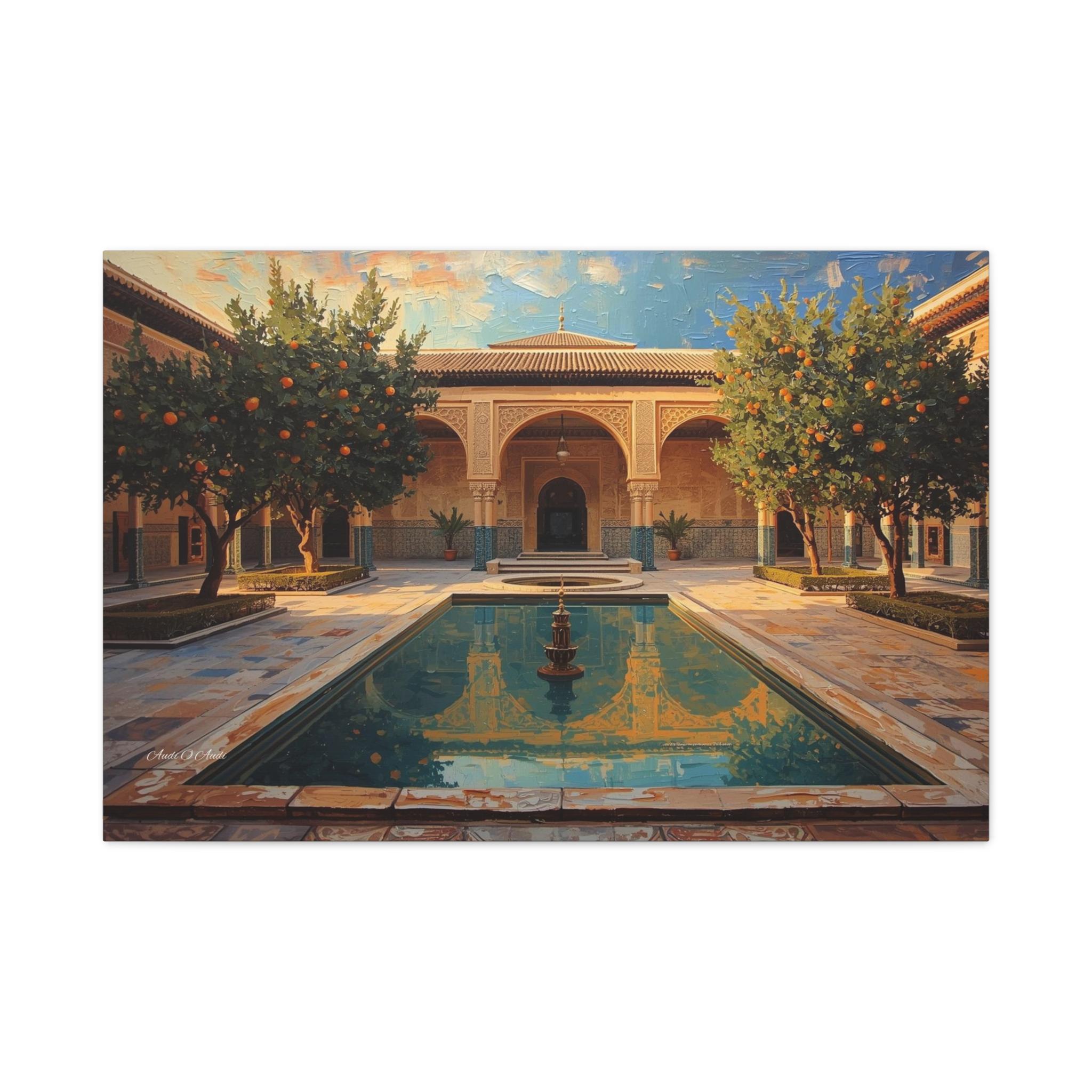 Escape to a sun-drenched paradise with this stunning canvas print of a hidden courtyard. This vibrant architectural artwork captures the beauty of a Moorish-style garden (reminiscent of the Alhambra or a Moroccan Riad), featuring intricate sandstone arches, lush orange trees heavy with fruit, and a tranquil central pool reflecting the blue sky.
