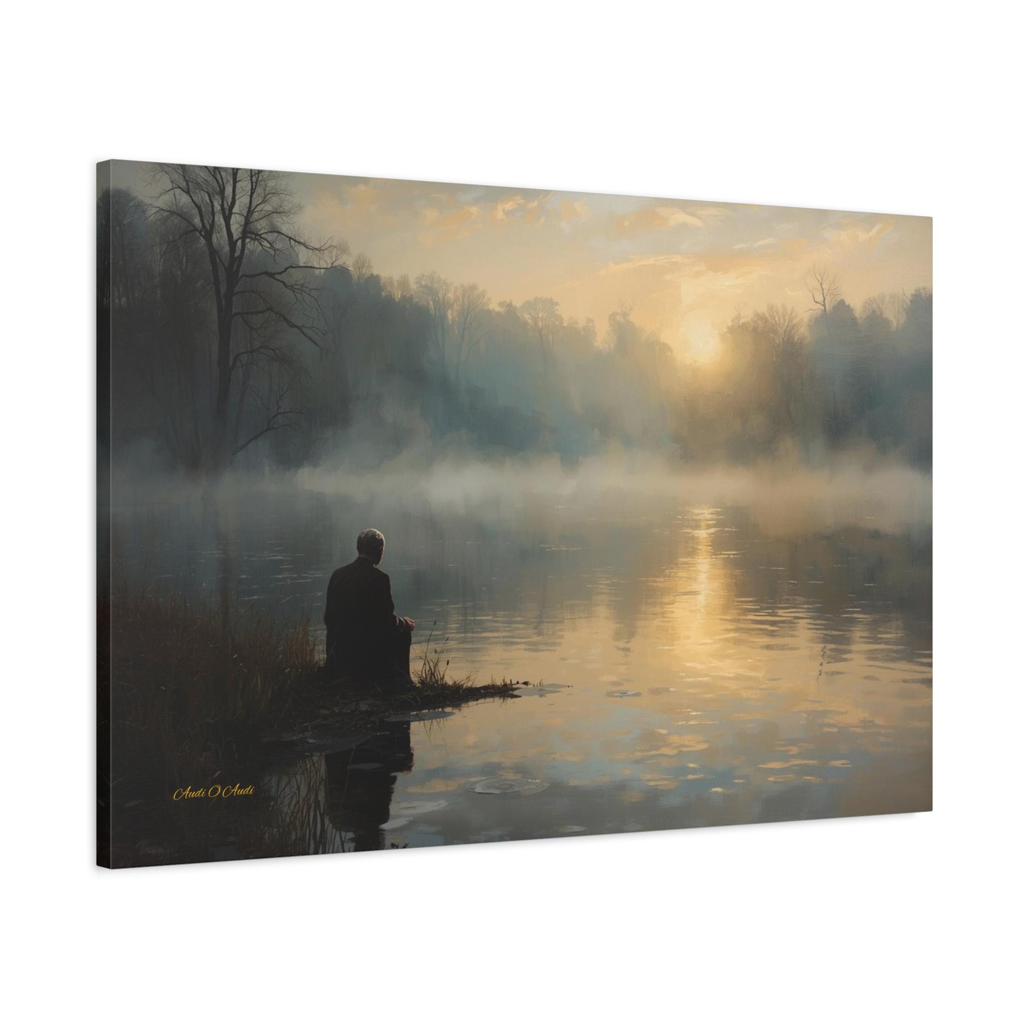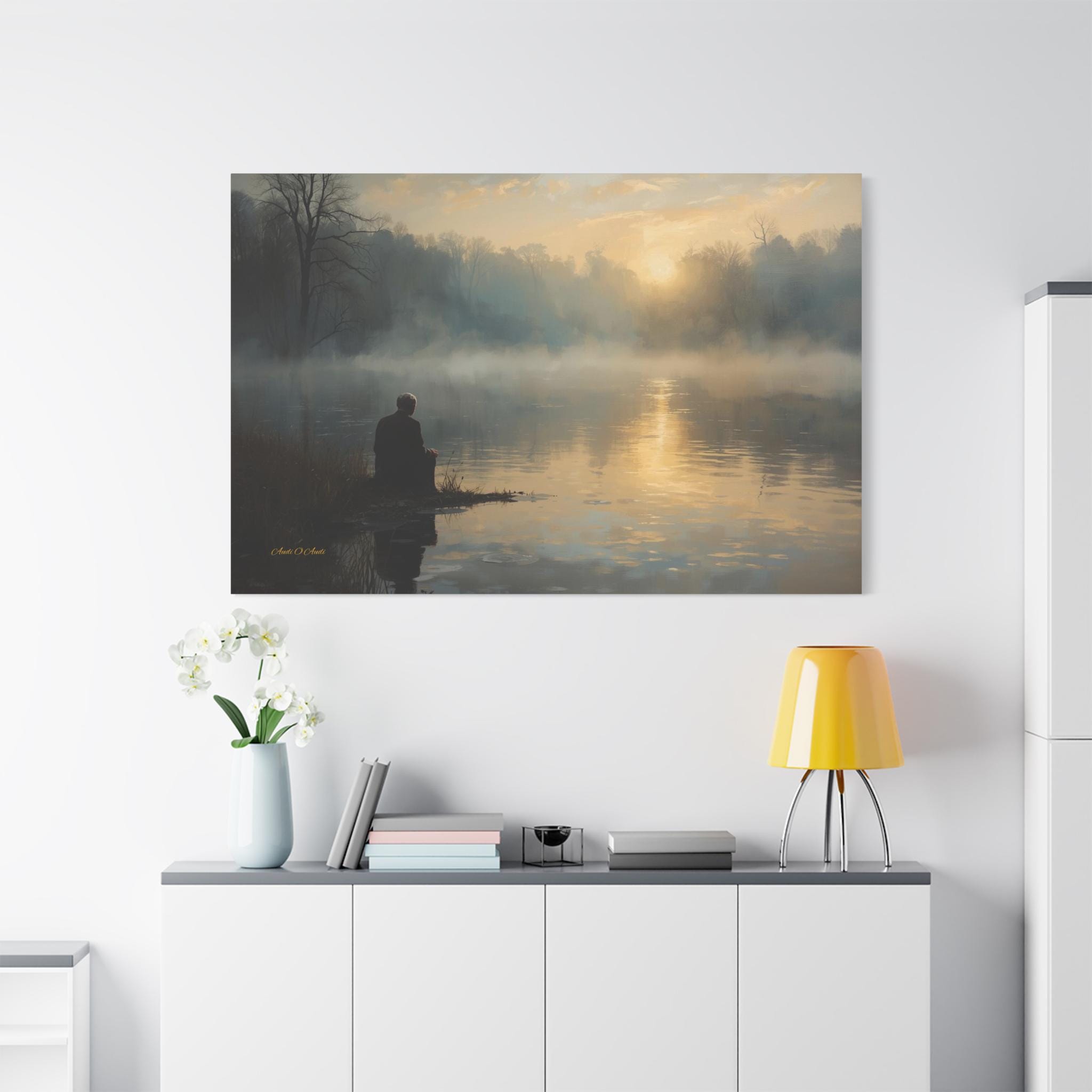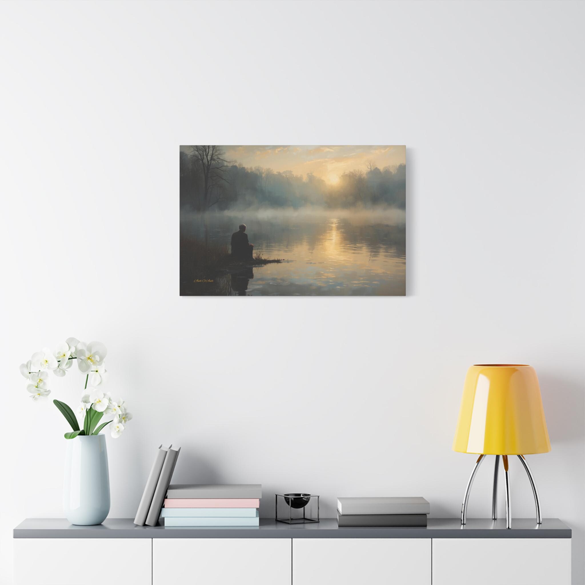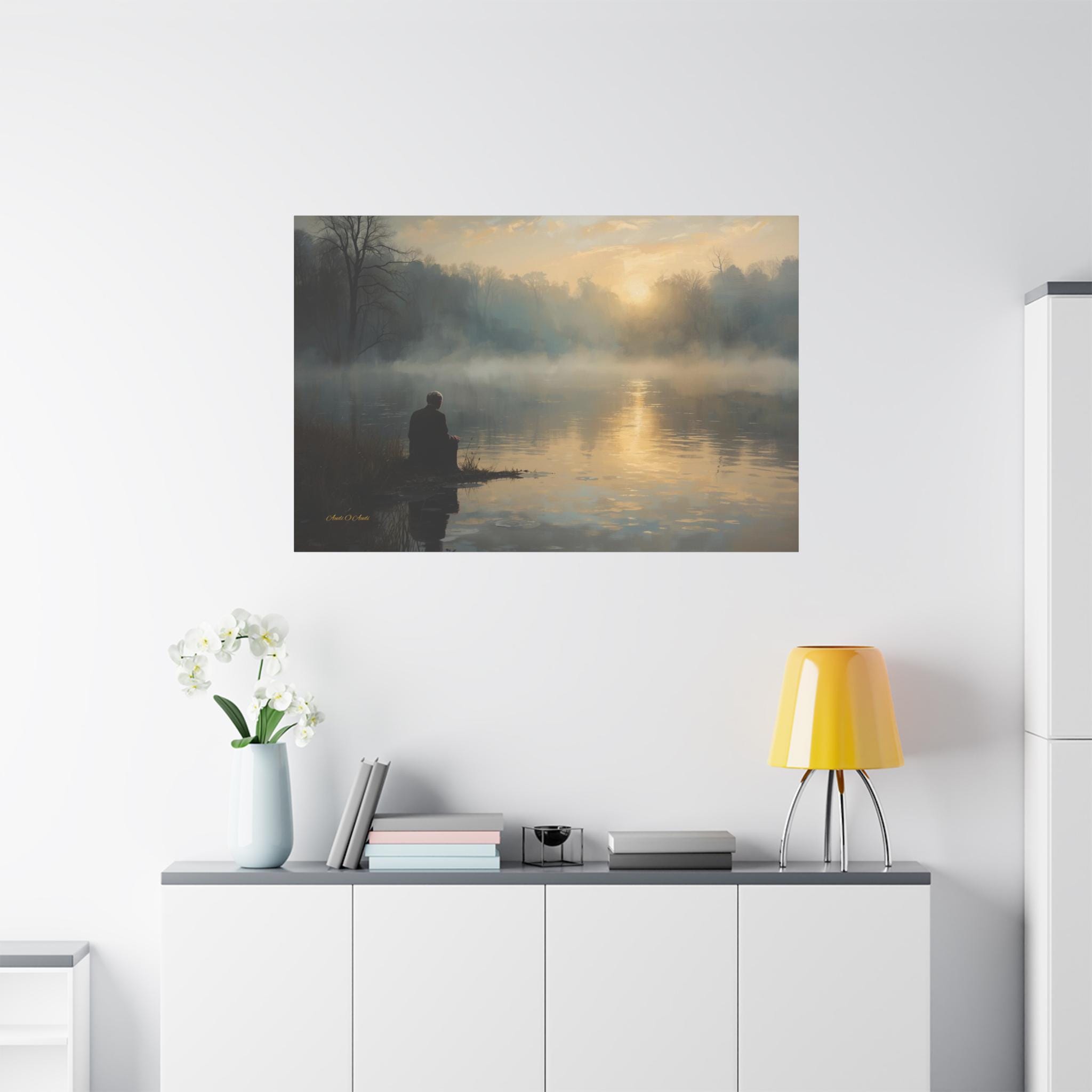 Find your inner silence with this deeply peaceful canvas print of a misty lake. This atmospheric artwork captures a solitary figure sitting at the water's edge, watching the golden sun struggle through the thick morning fog.