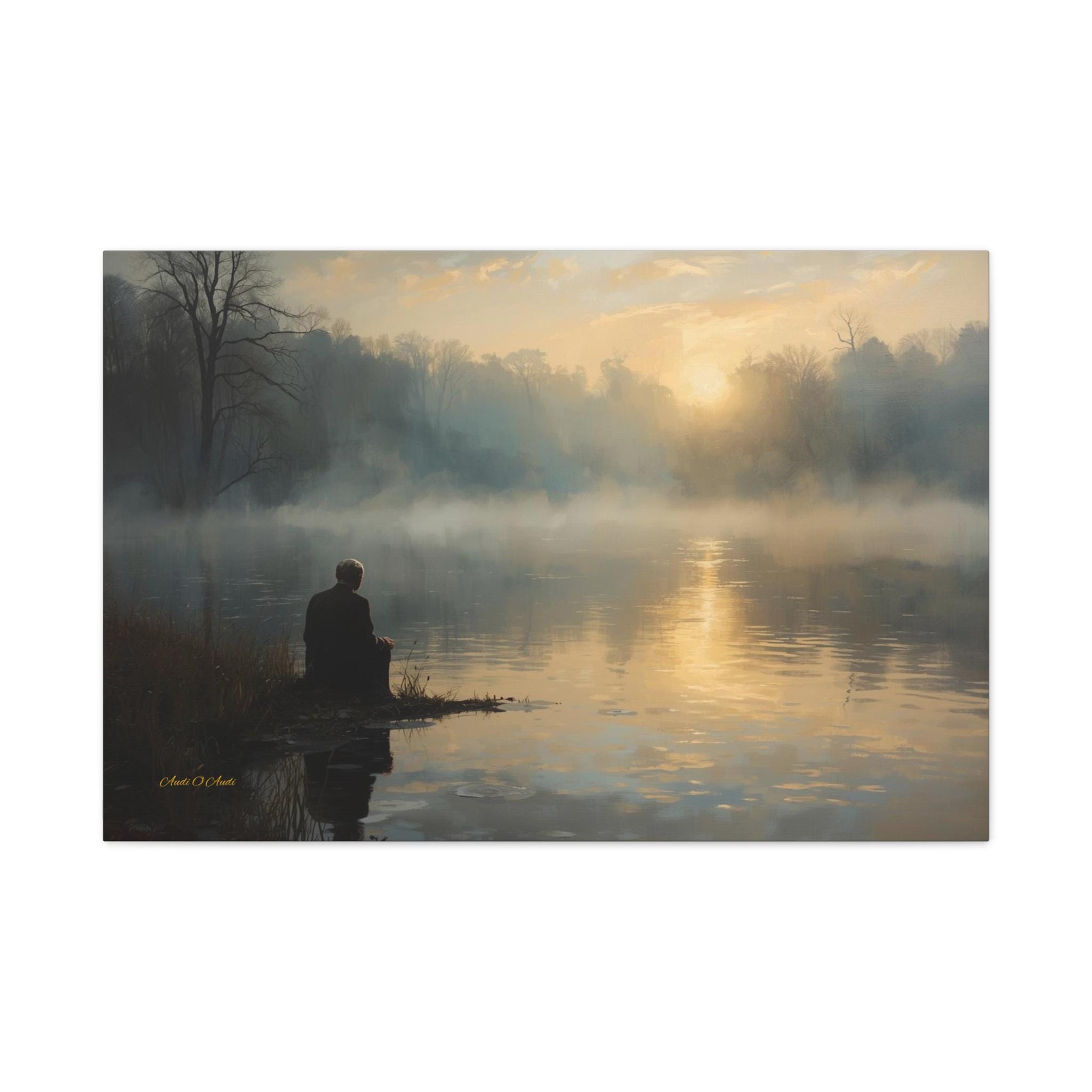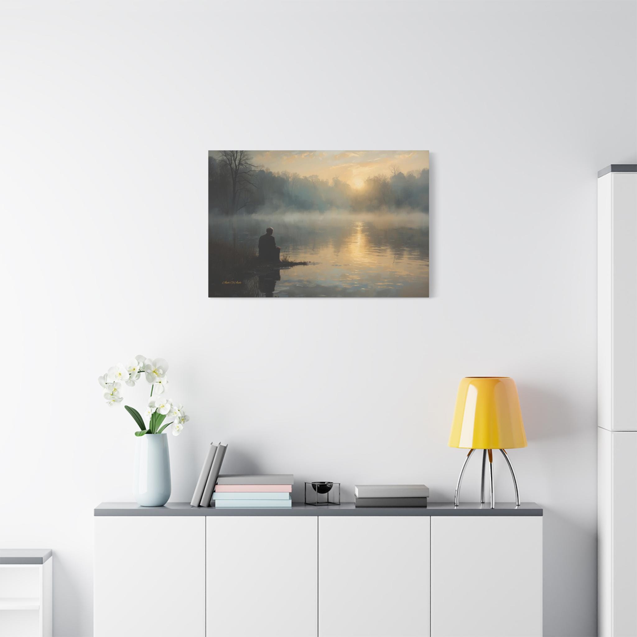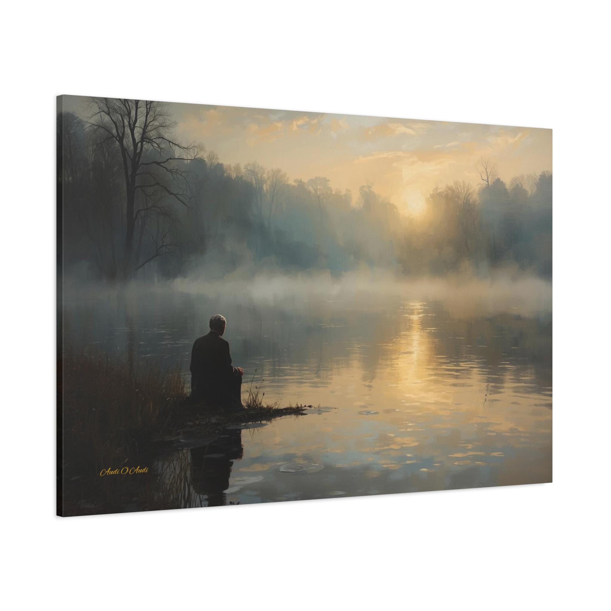 Find your inner silence with this deeply peaceful canvas print of a misty lake. This atmospheric artwork captures a solitary figure sitting at the water's edge, watching the golden sun struggle through the thick morning fog.