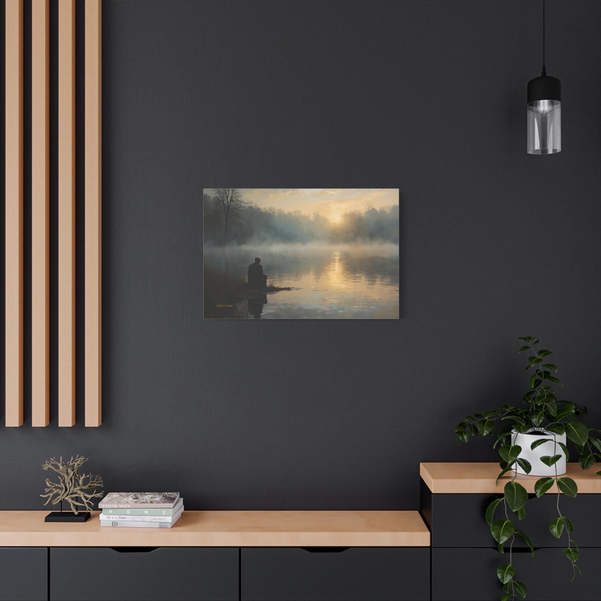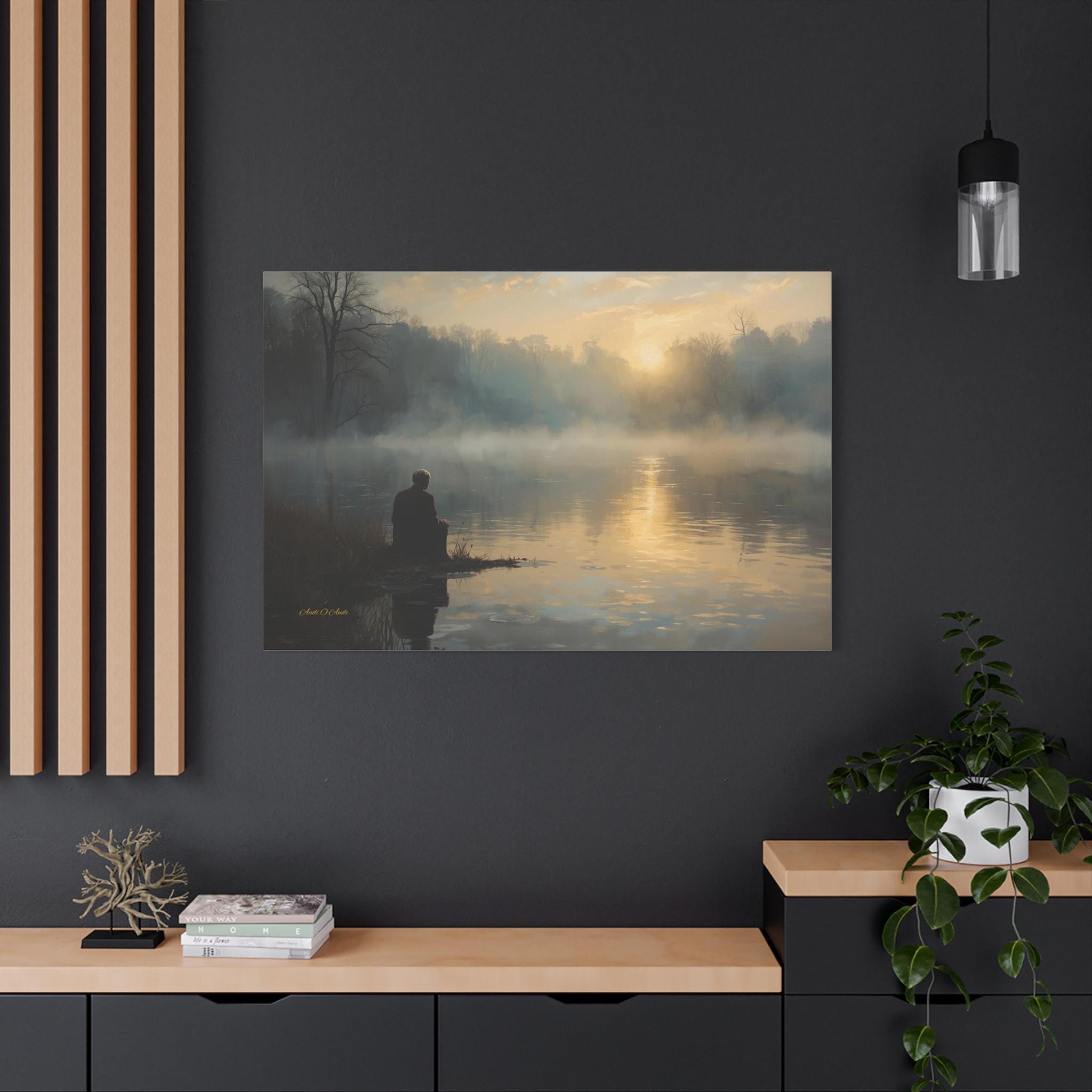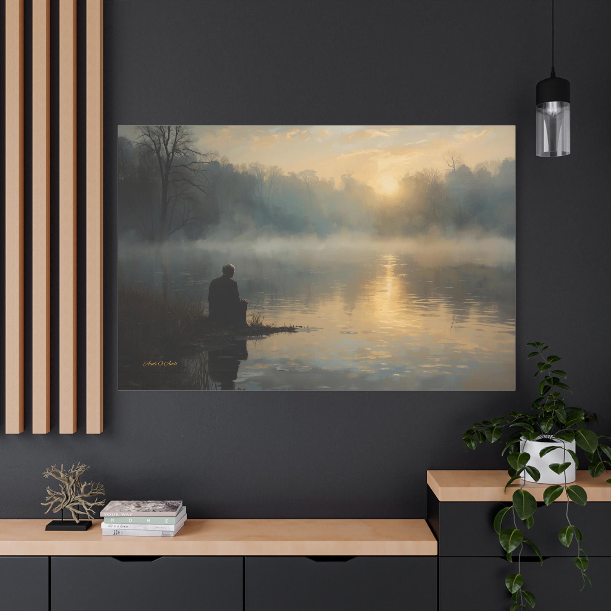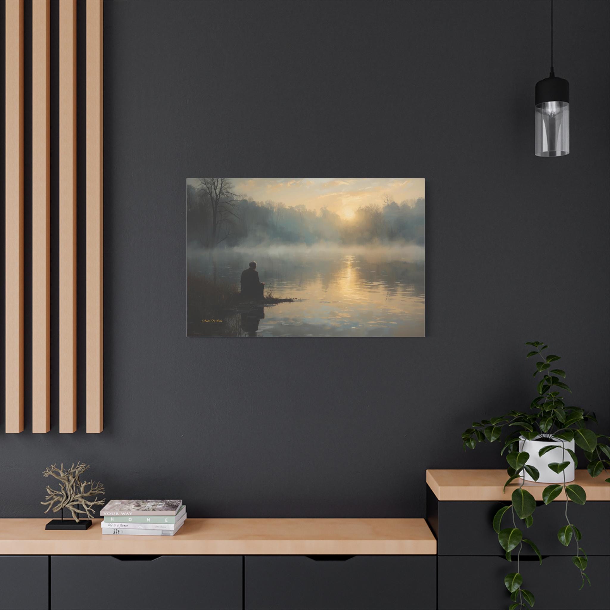 Find your inner silence with this deeply peaceful canvas print of a misty lake. This atmospheric artwork captures a solitary figure sitting at the water's edge, watching the golden sun struggle through the thick morning fog.