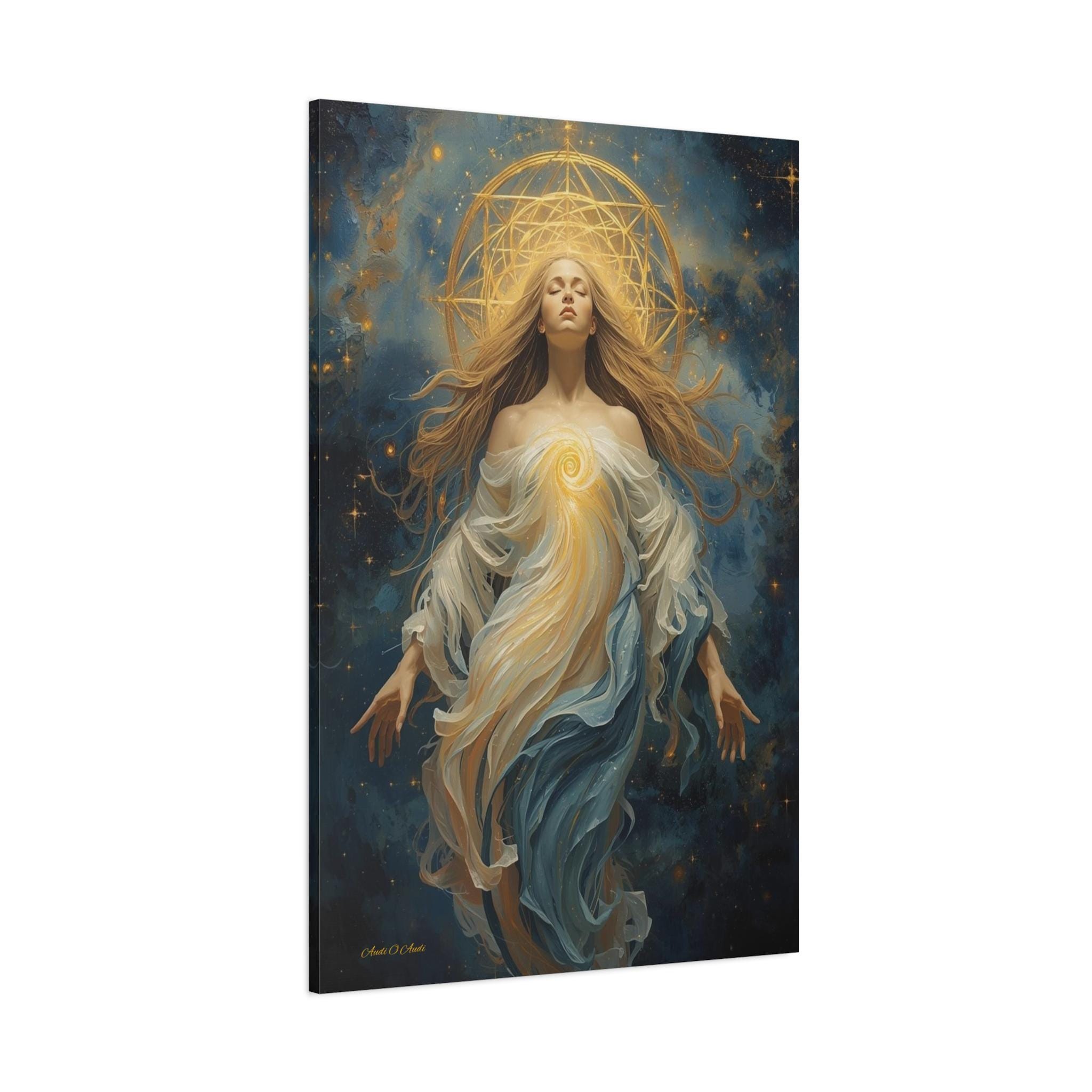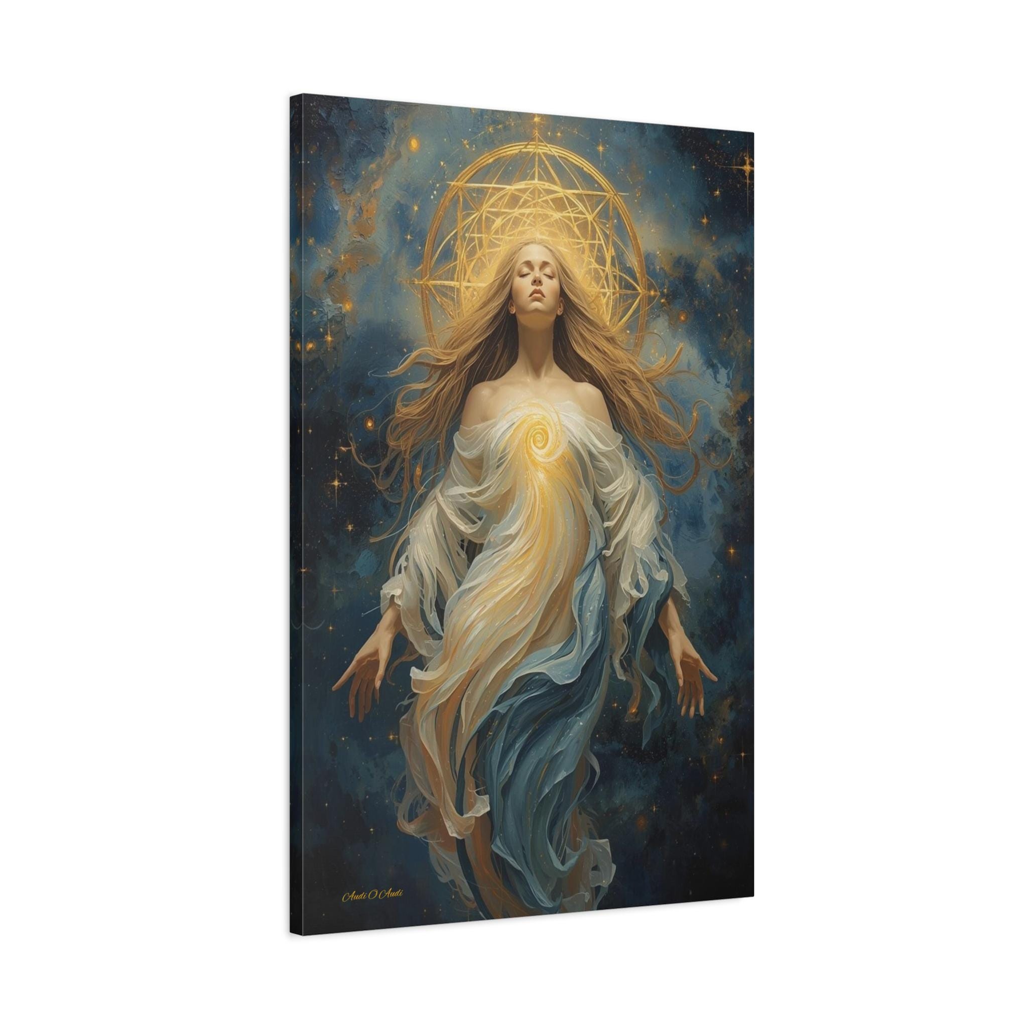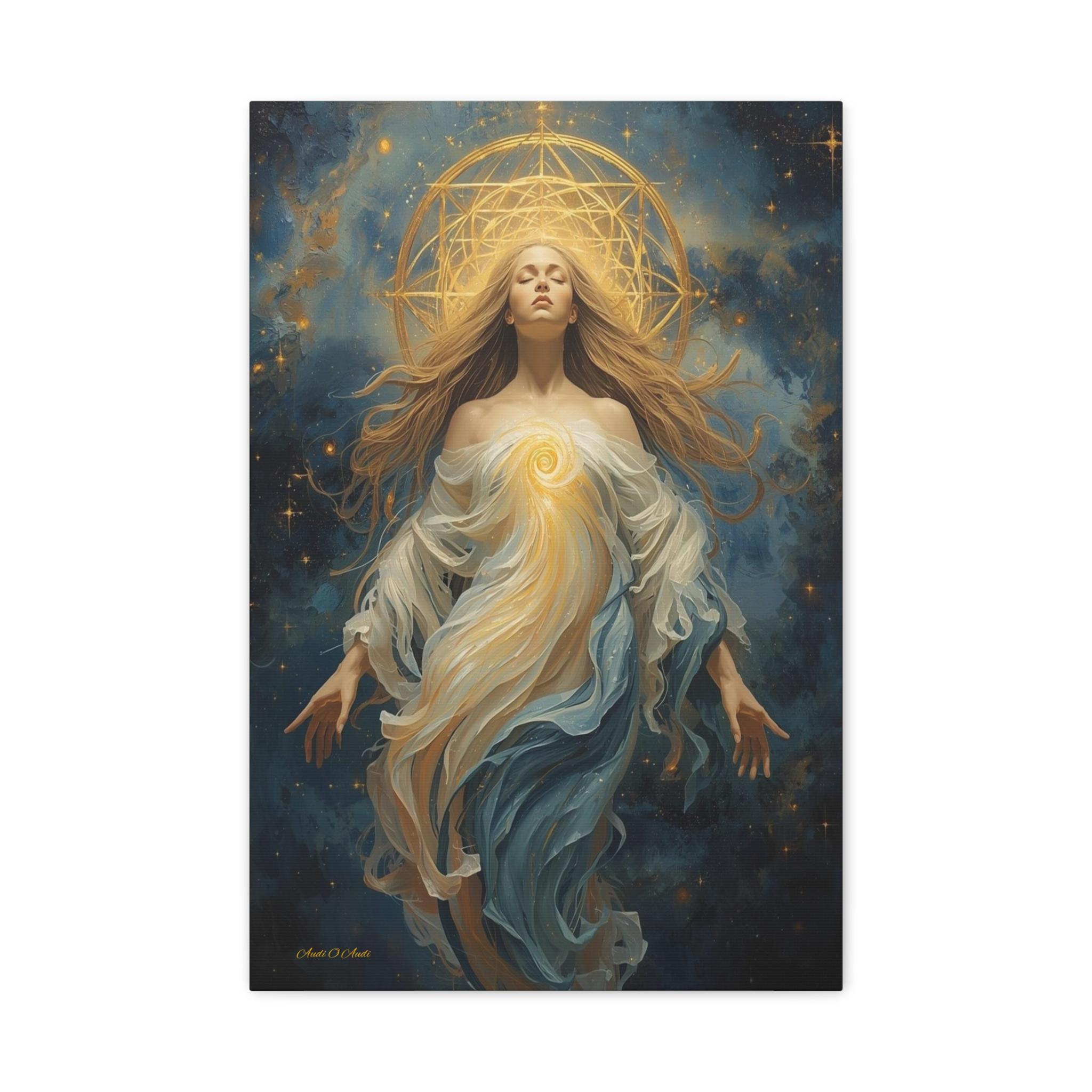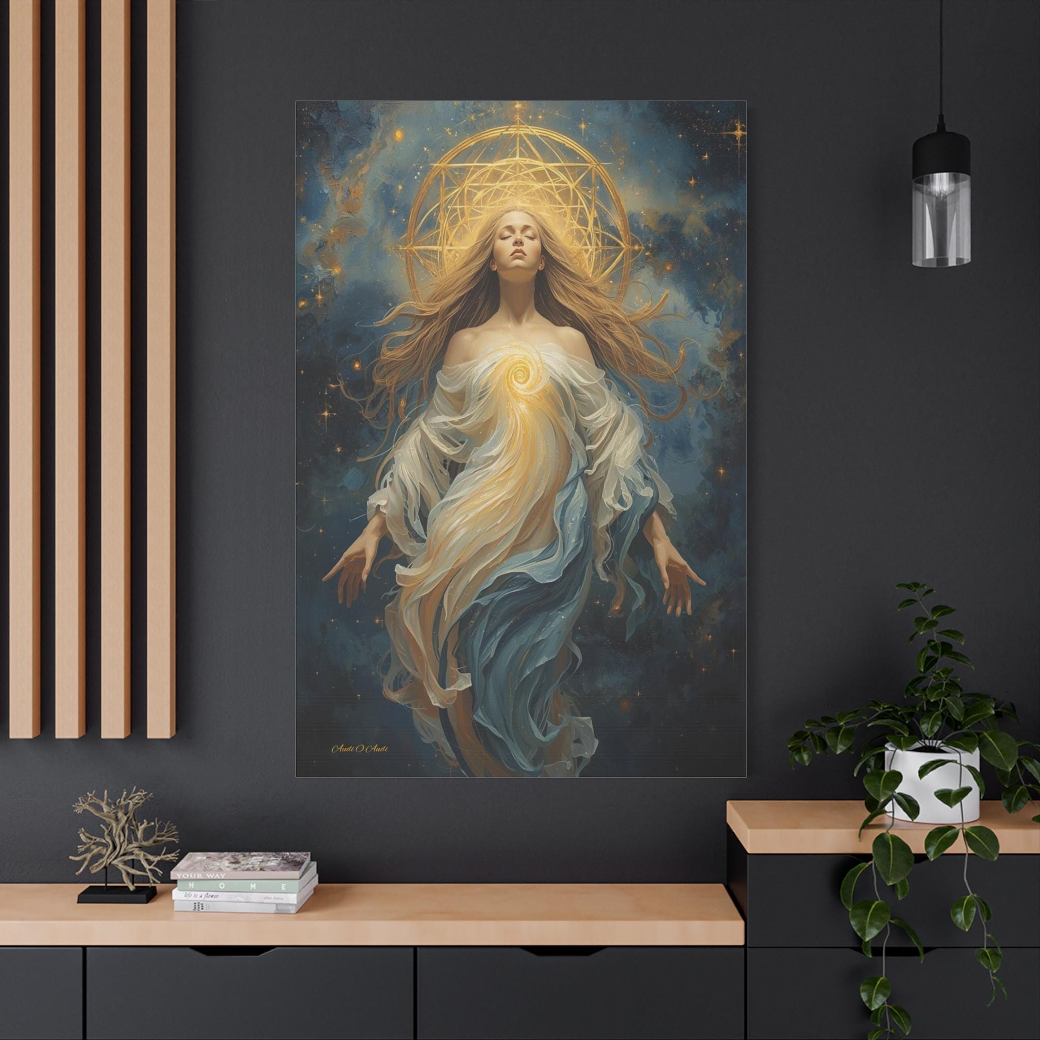 Awaken the light within with this breathtaking canvas print of the Divine Feminine. This mystical artwork depicts a serene, celestial figure rising through the cosmos, her flowing robes dissolving into stardust and energy.