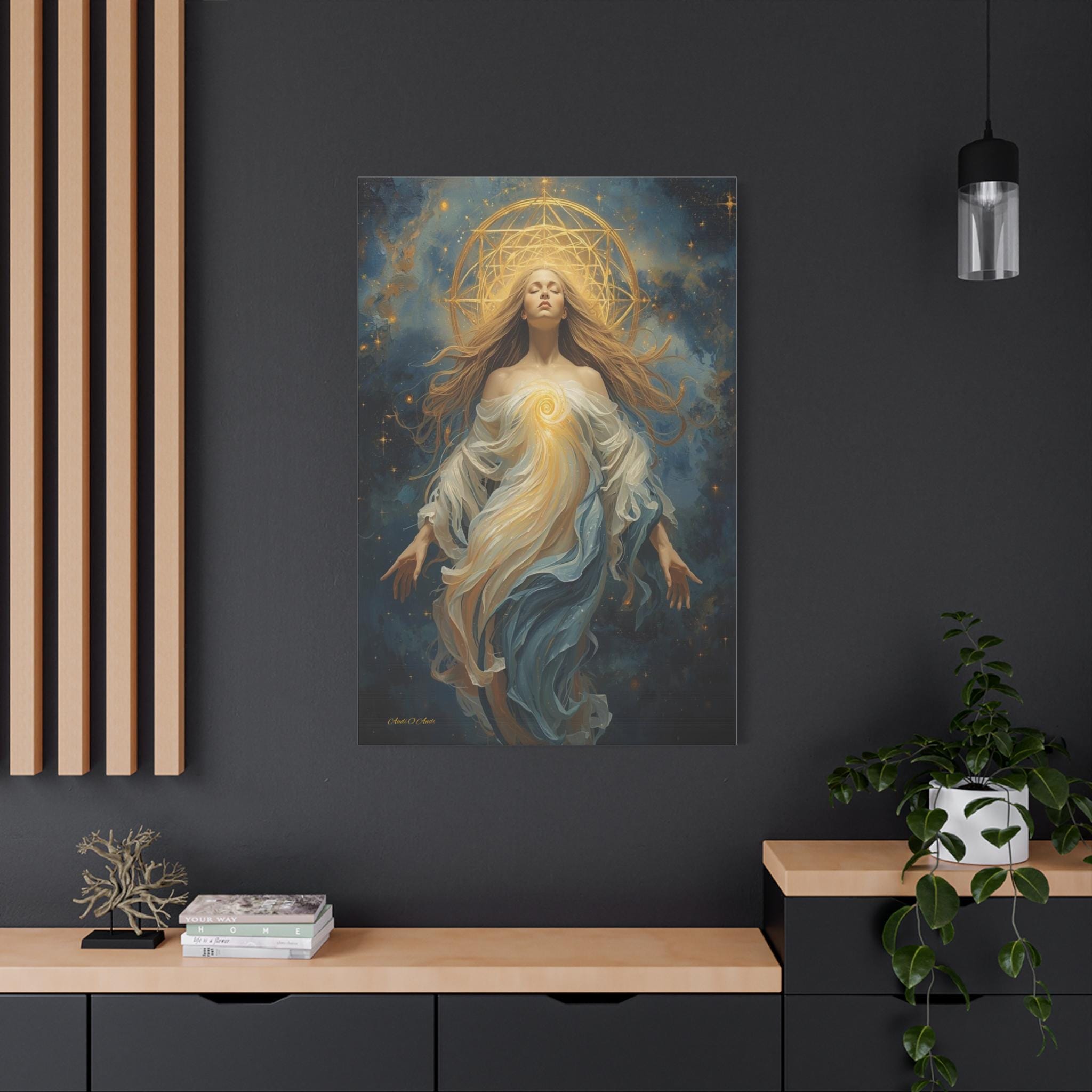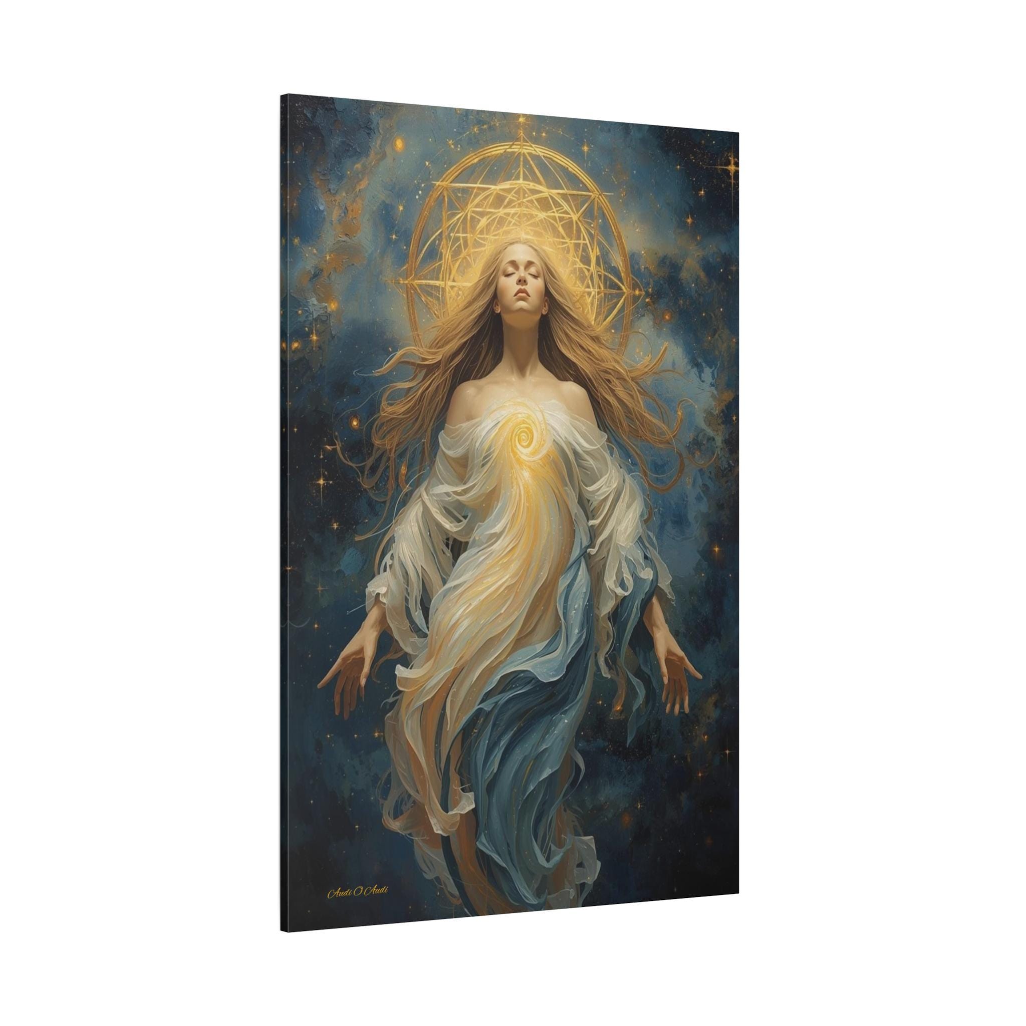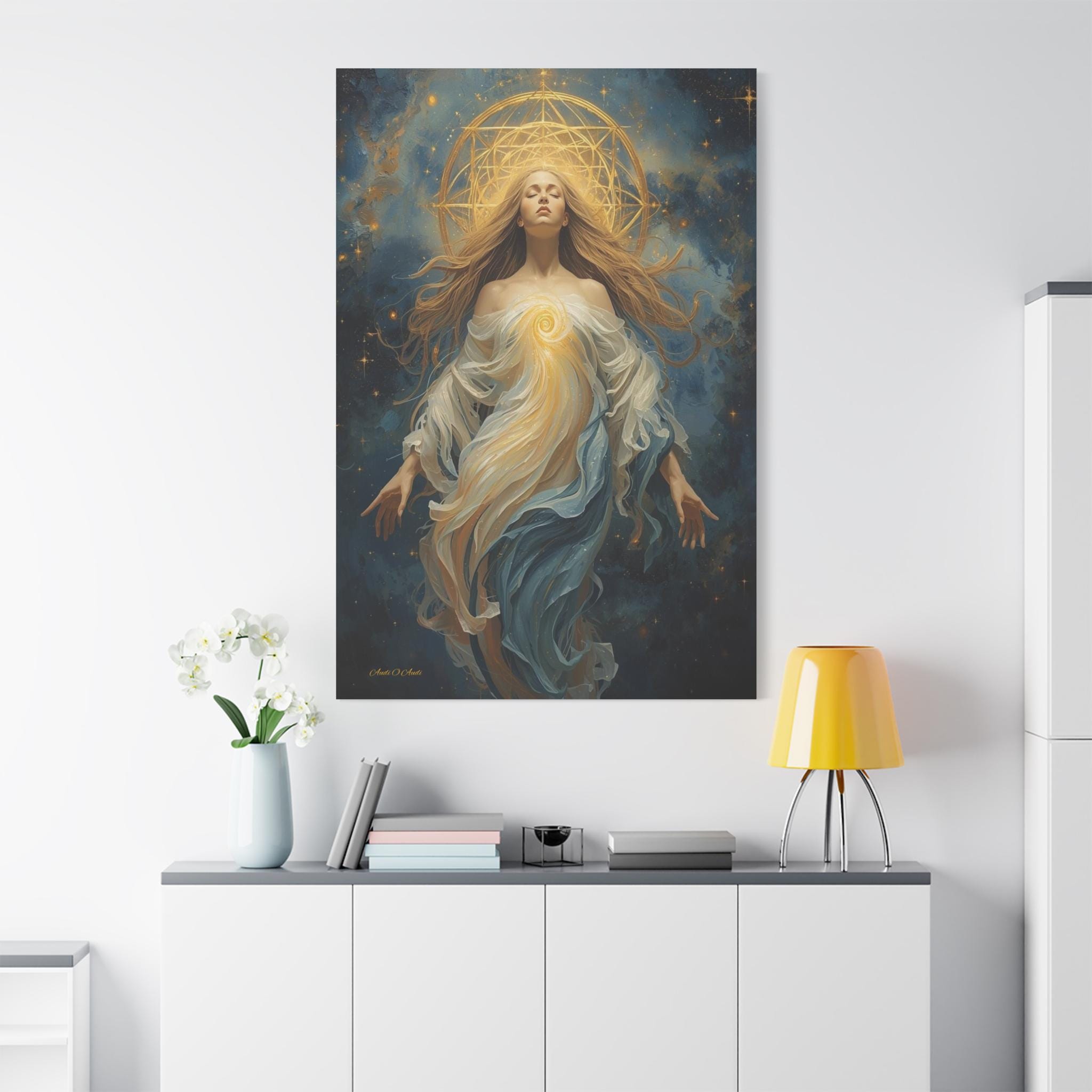 Awaken the light within with this breathtaking canvas print of the Divine Feminine. This mystical artwork depicts a serene, celestial figure rising through the cosmos, her flowing robes dissolving into stardust and energy.