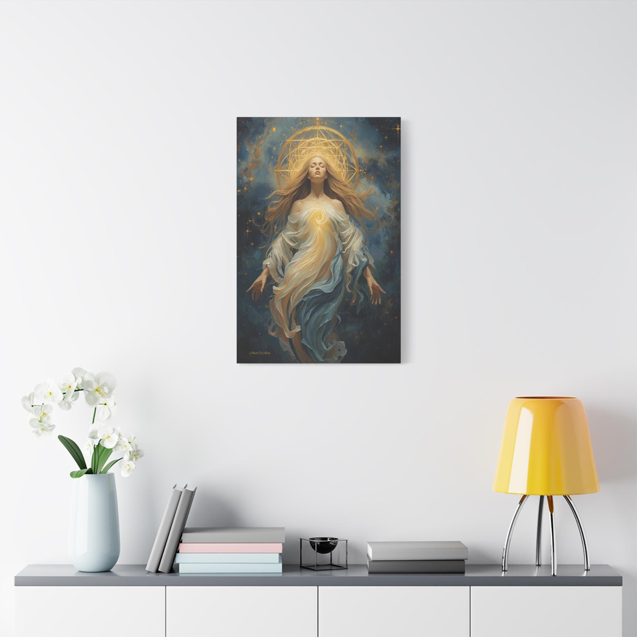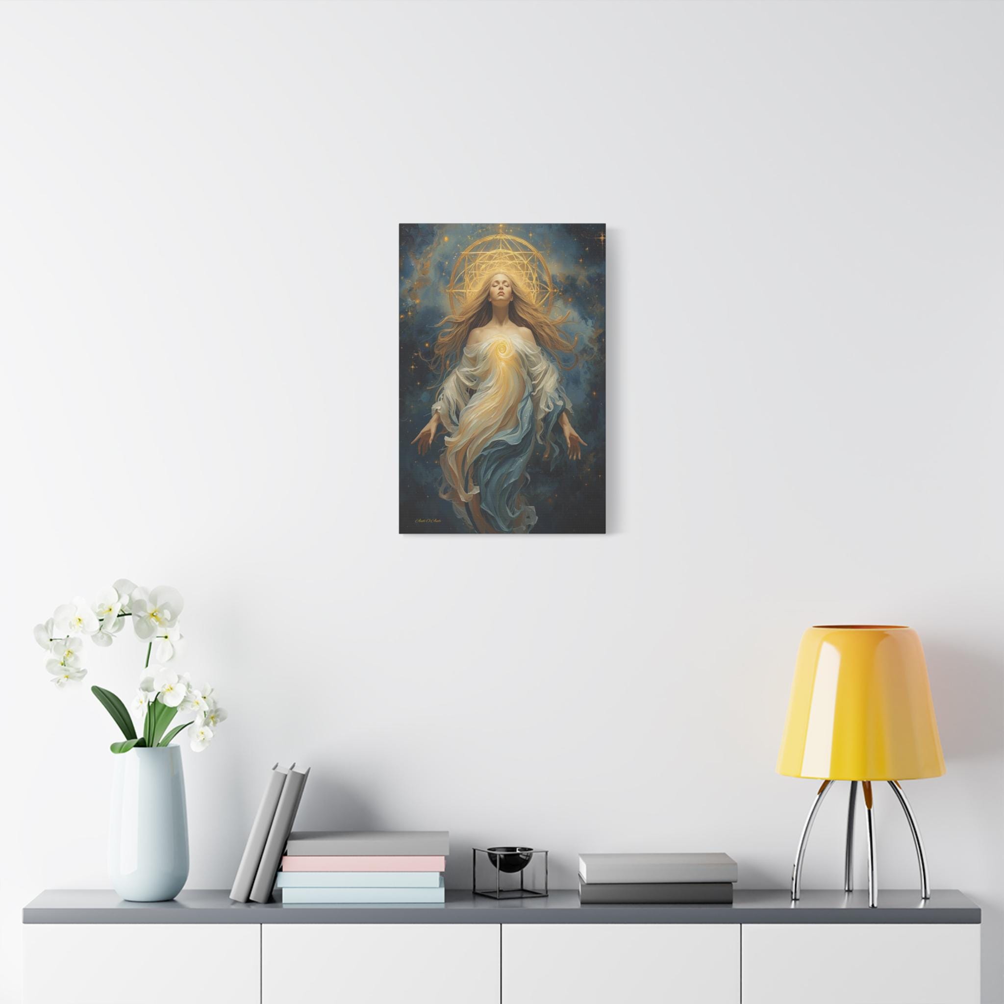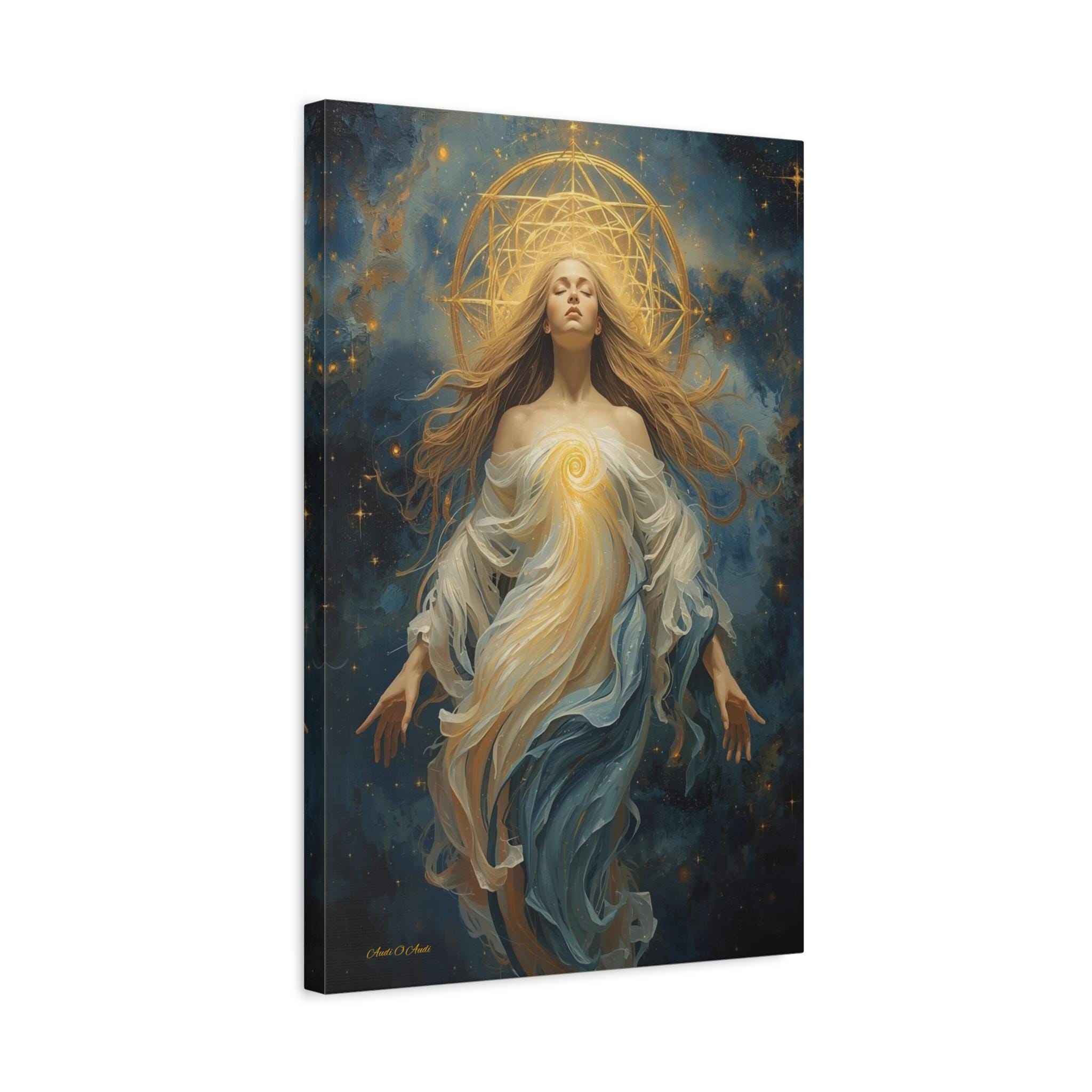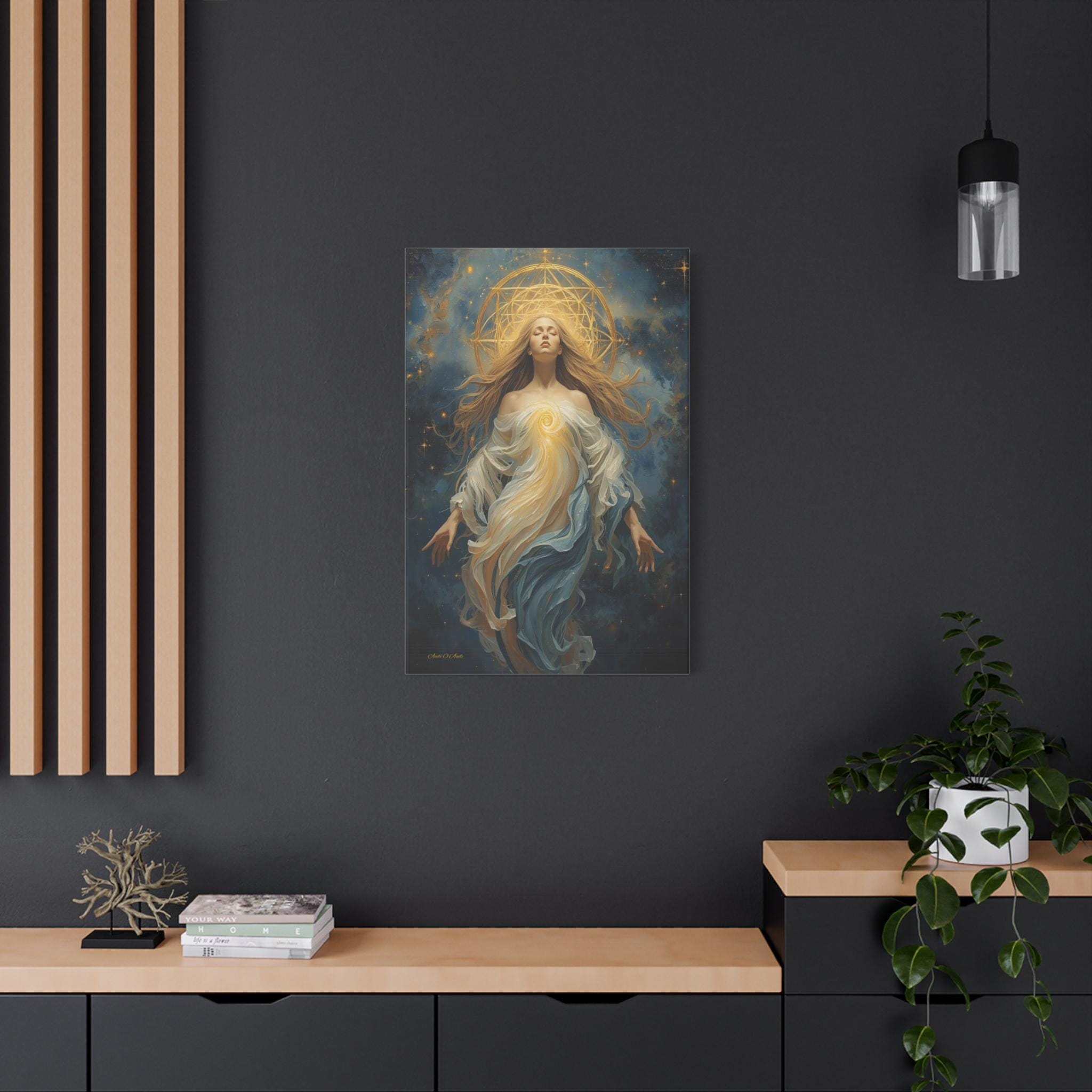 Awaken the light within with this breathtaking canvas print of the Divine Feminine. This mystical artwork depicts a serene, celestial figure rising through the cosmos, her flowing robes dissolving into stardust and energy.