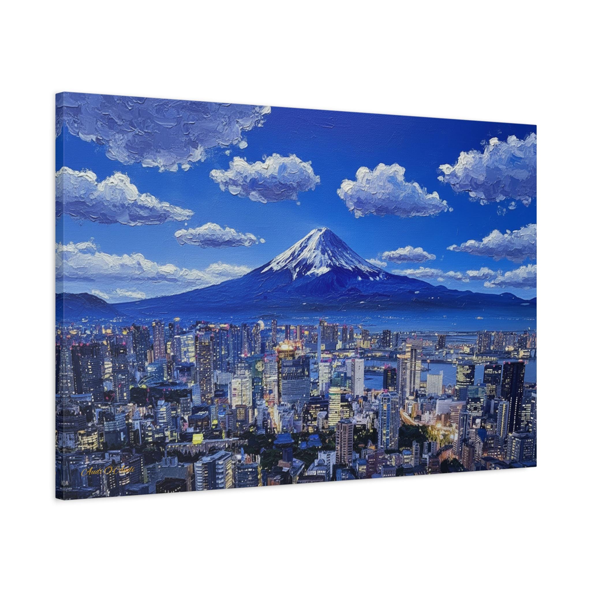 The deep indigo blues of the sky and the bay contrast spectacularly with the warm, golden glow of the city lights. The design utilizes a rich impasto oil painting style, where the thick, expressive brushstrokes give the puffy white clouds and the snowy mountain peak a rugged, realistic texture. It is a breathtaking tribute to the Land of the Rising Sun.