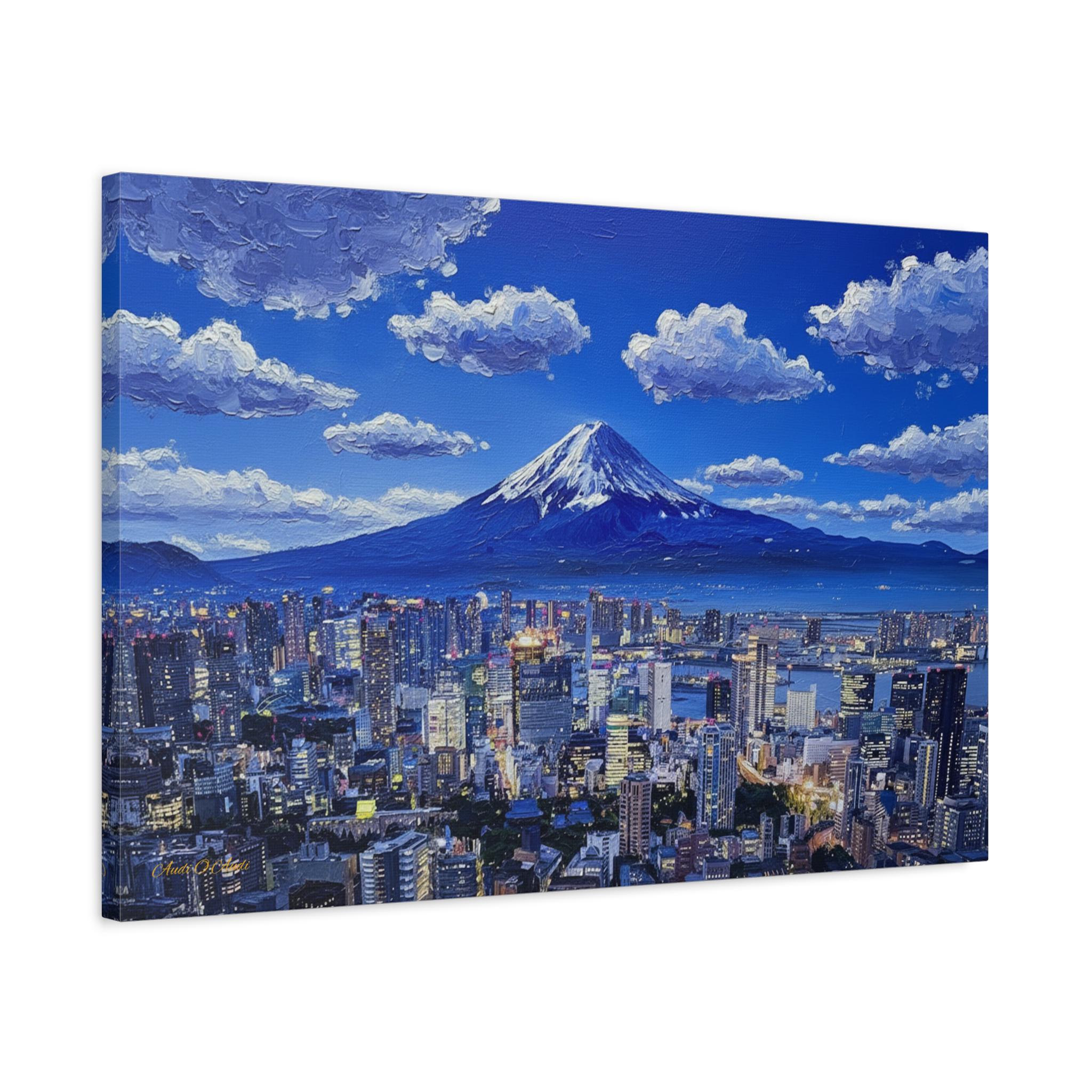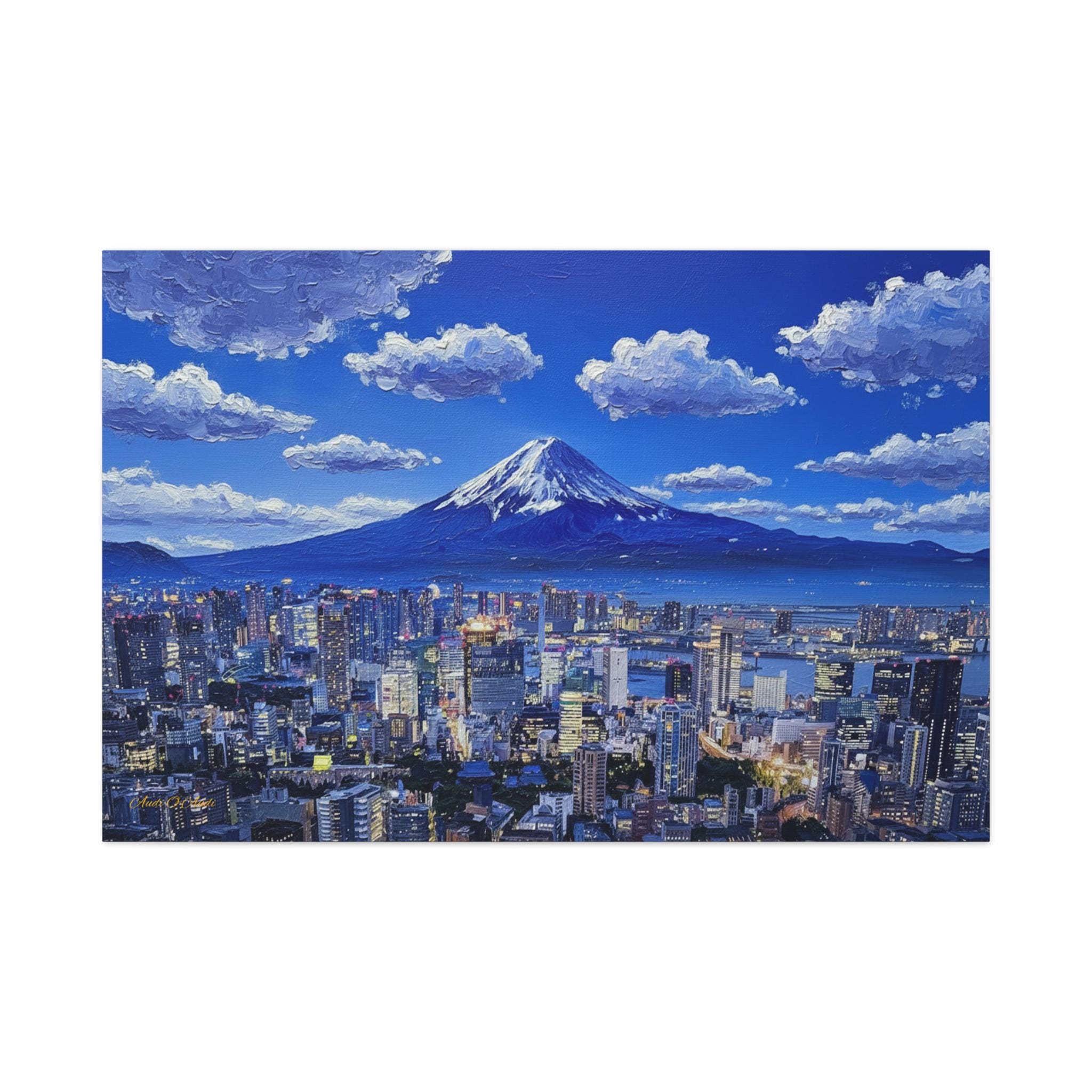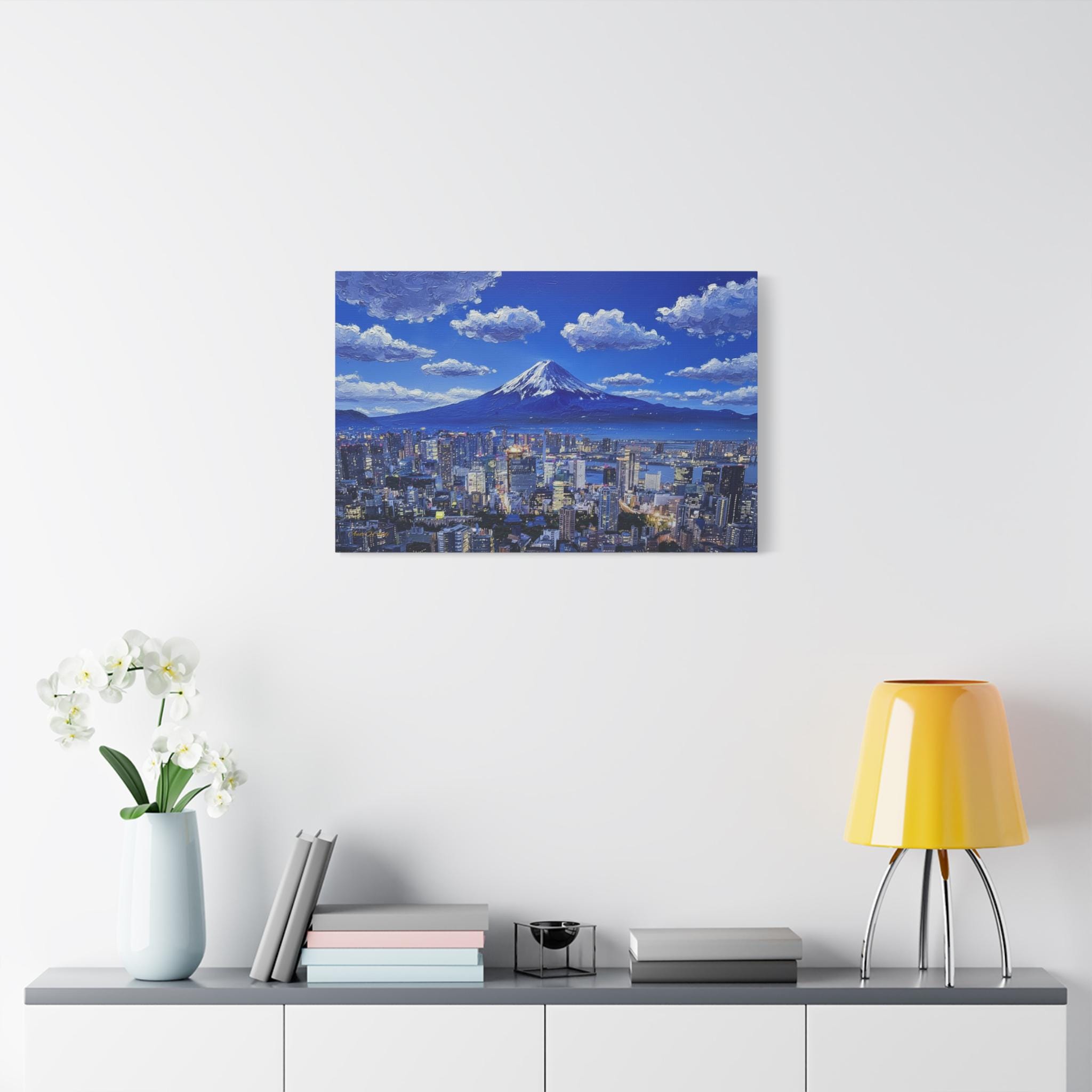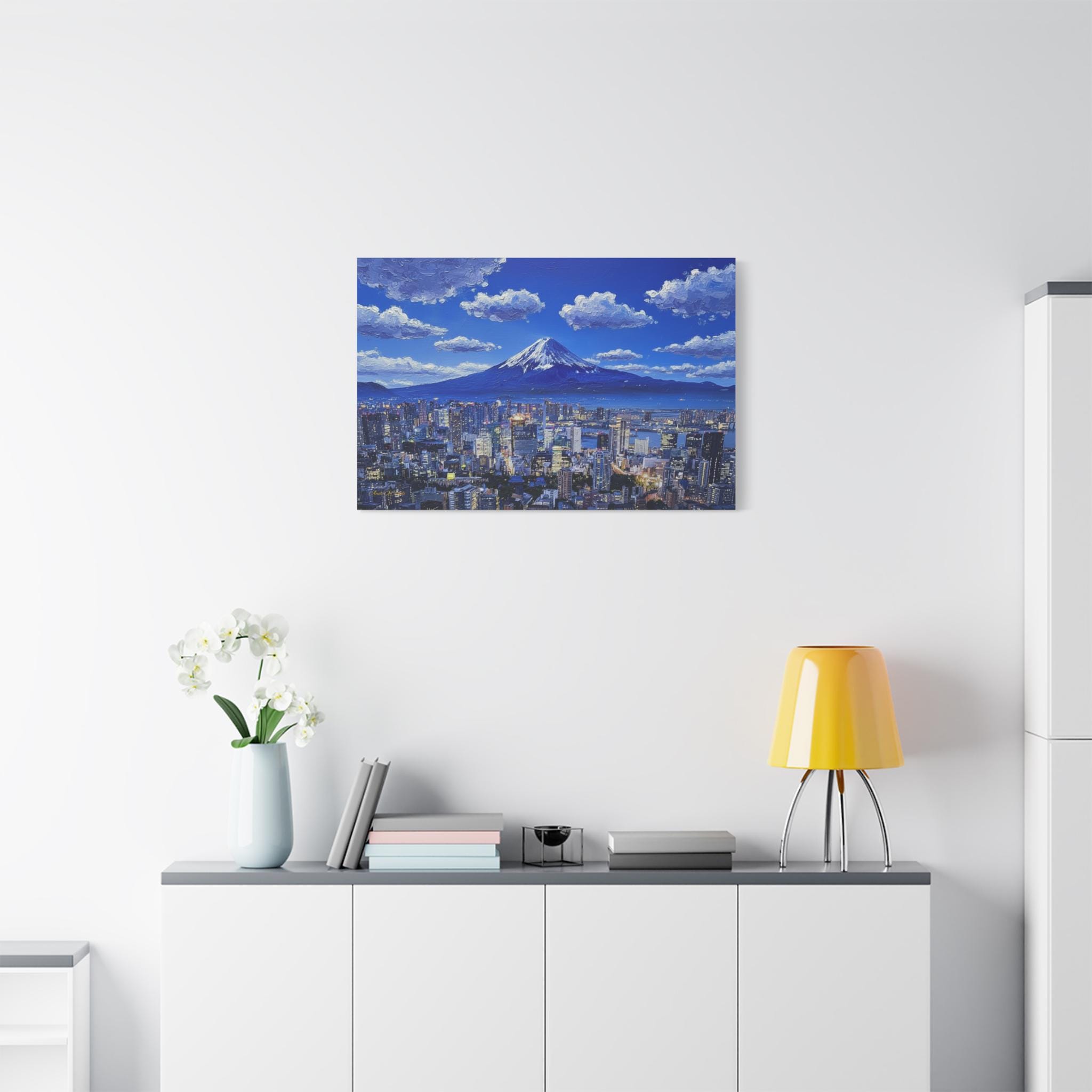 Bring the electric energy of Japan's capital and the serene majesty of its most famous mountain into your home with this stunning canvas print. This panoramic artwork captures the glittering skyline of Tokyo at night, stretching out endlessly below the towering, snow-capped peak of Mount Fuji.