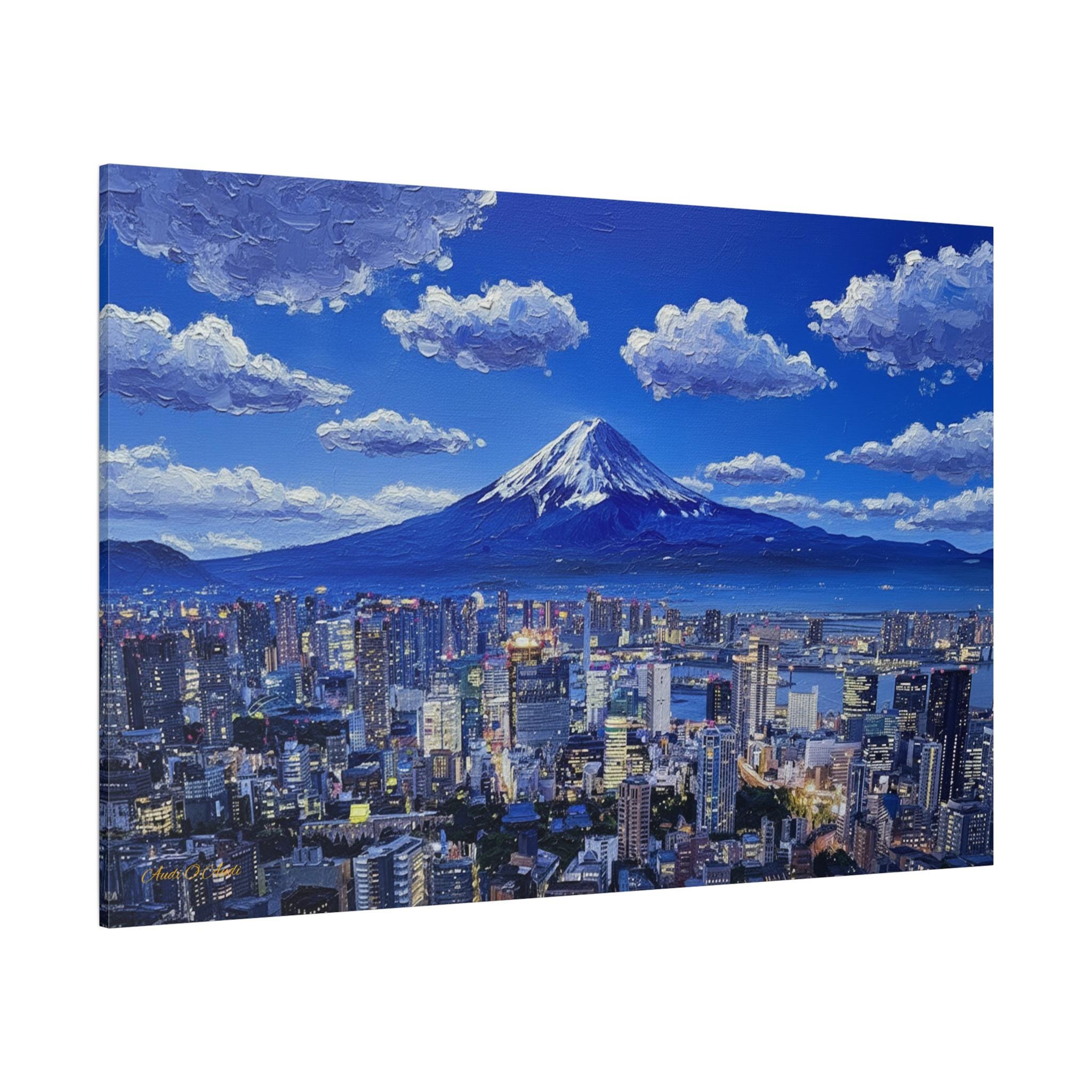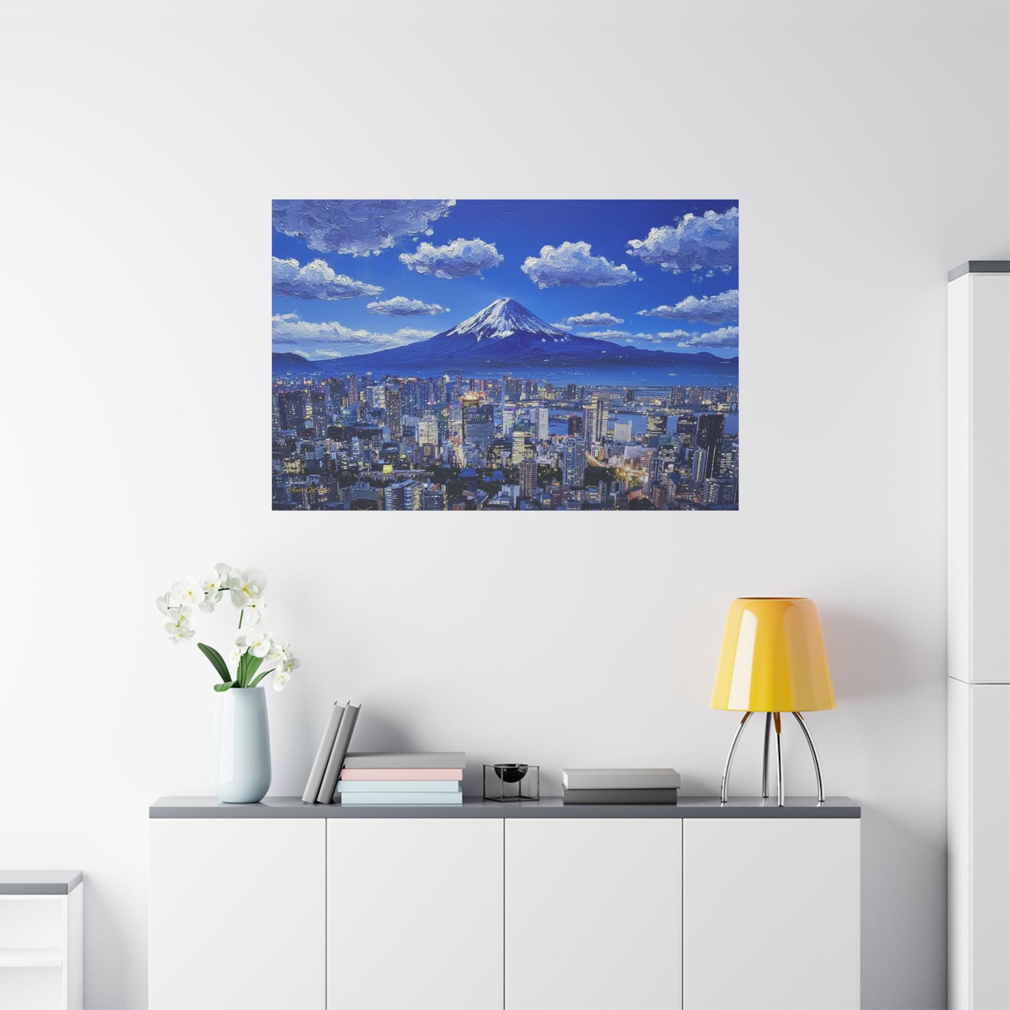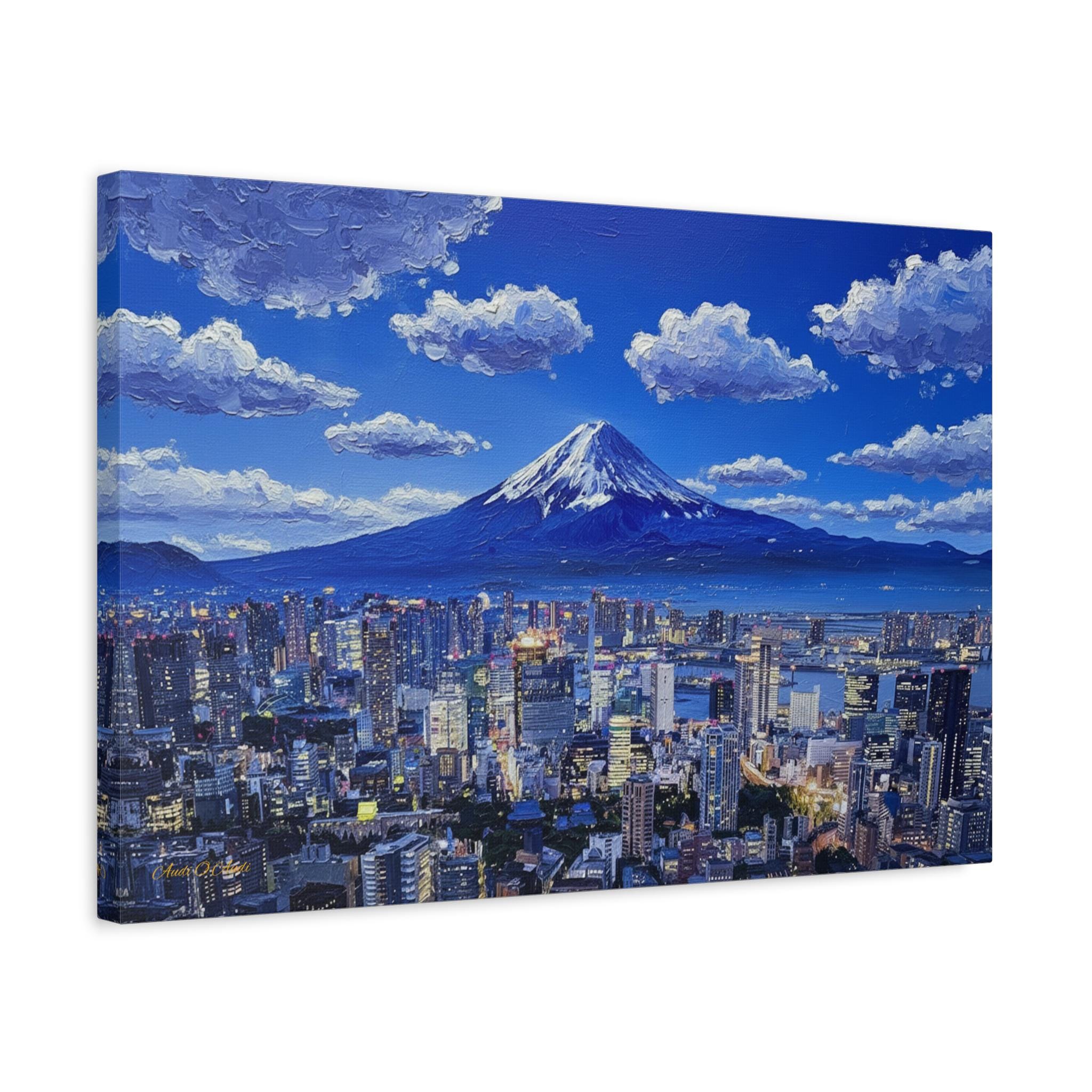 Bring the electric energy of Japan's capital and the serene majesty of its most famous mountain into your home with this stunning canvas print. This panoramic artwork captures the glittering skyline of Tokyo at night, stretching out endlessly below the towering, snow-capped peak of Mount Fuji.