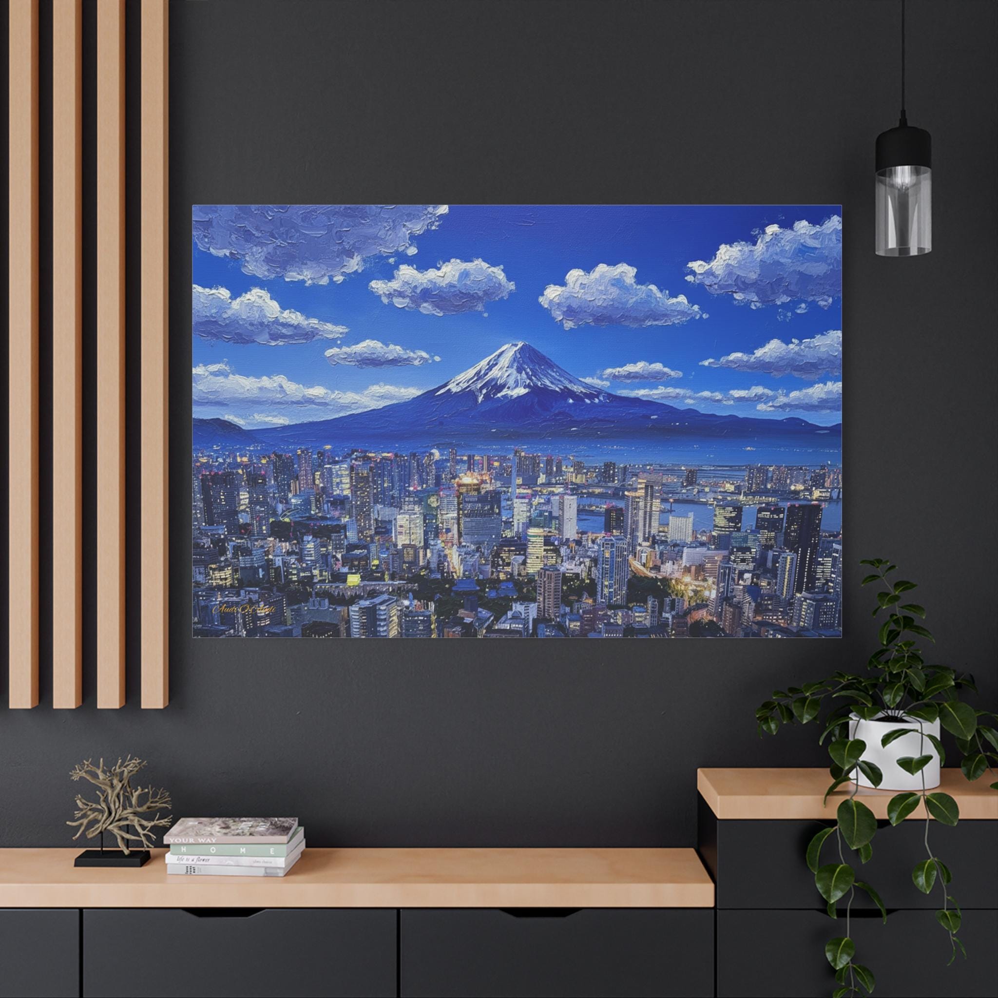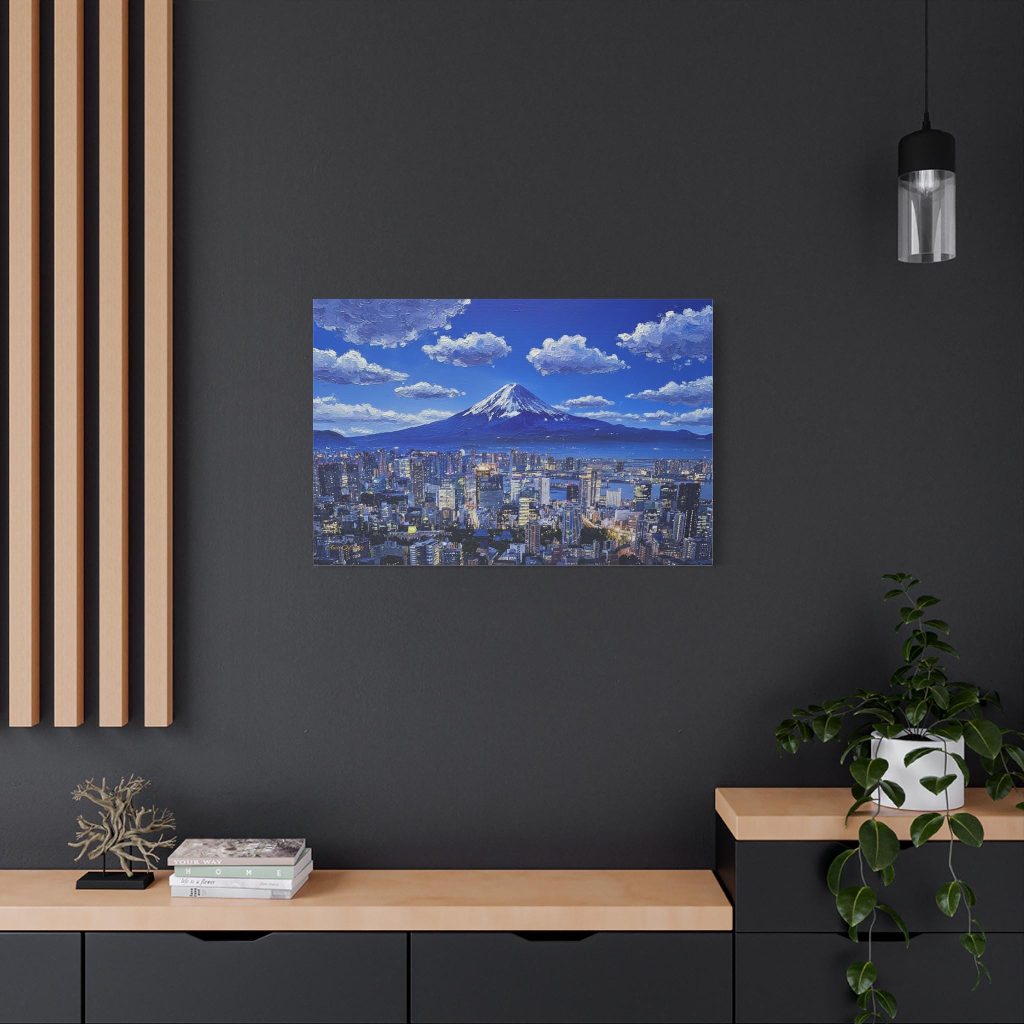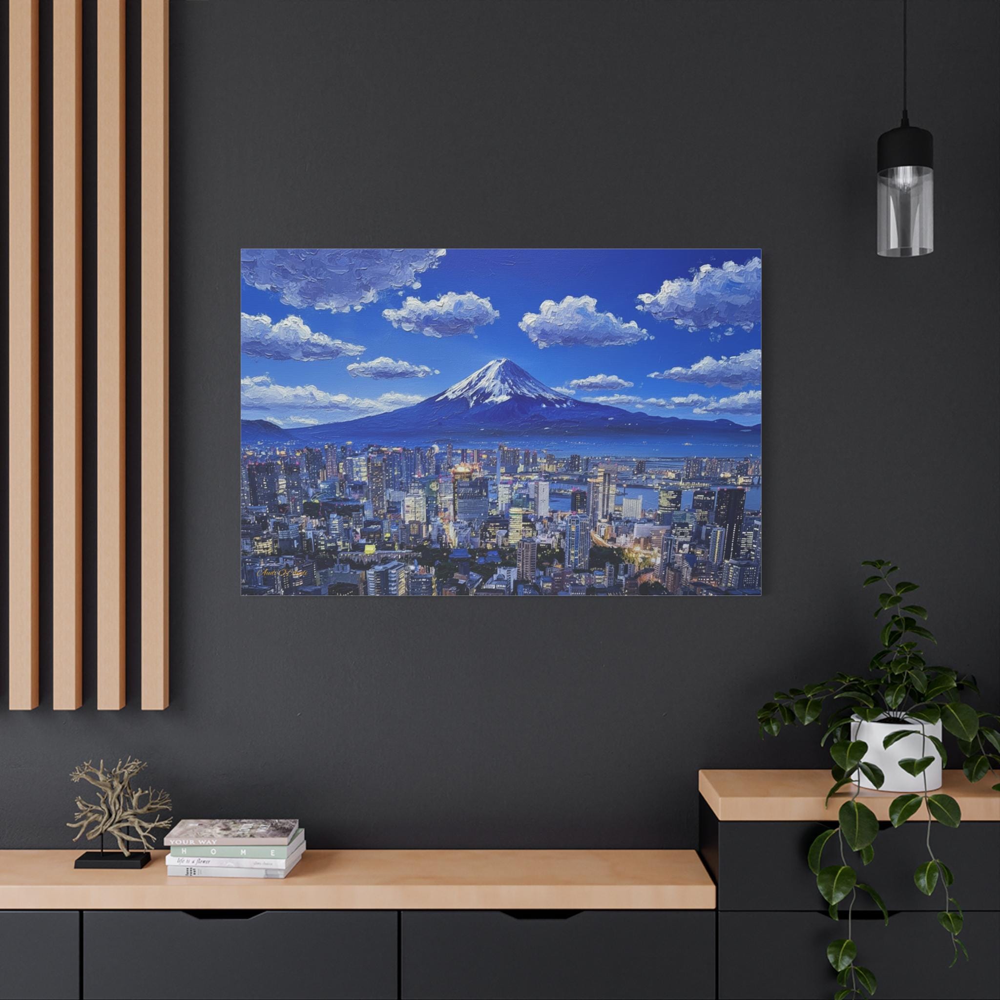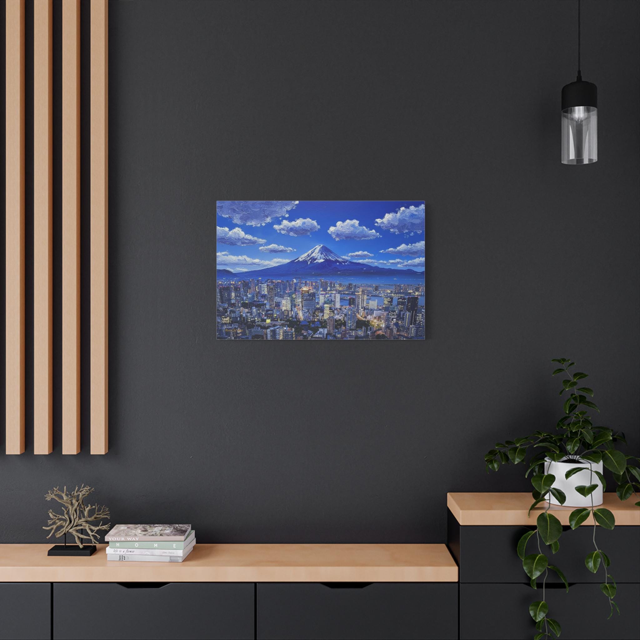Bring the electric energy of Japan's capital and the serene majesty of its most famous mountain into your home with this stunning canvas print. This panoramic artwork captures the glittering skyline of Tokyo at night, stretching out endlessly below the towering, snow-capped peak of Mount Fuji.