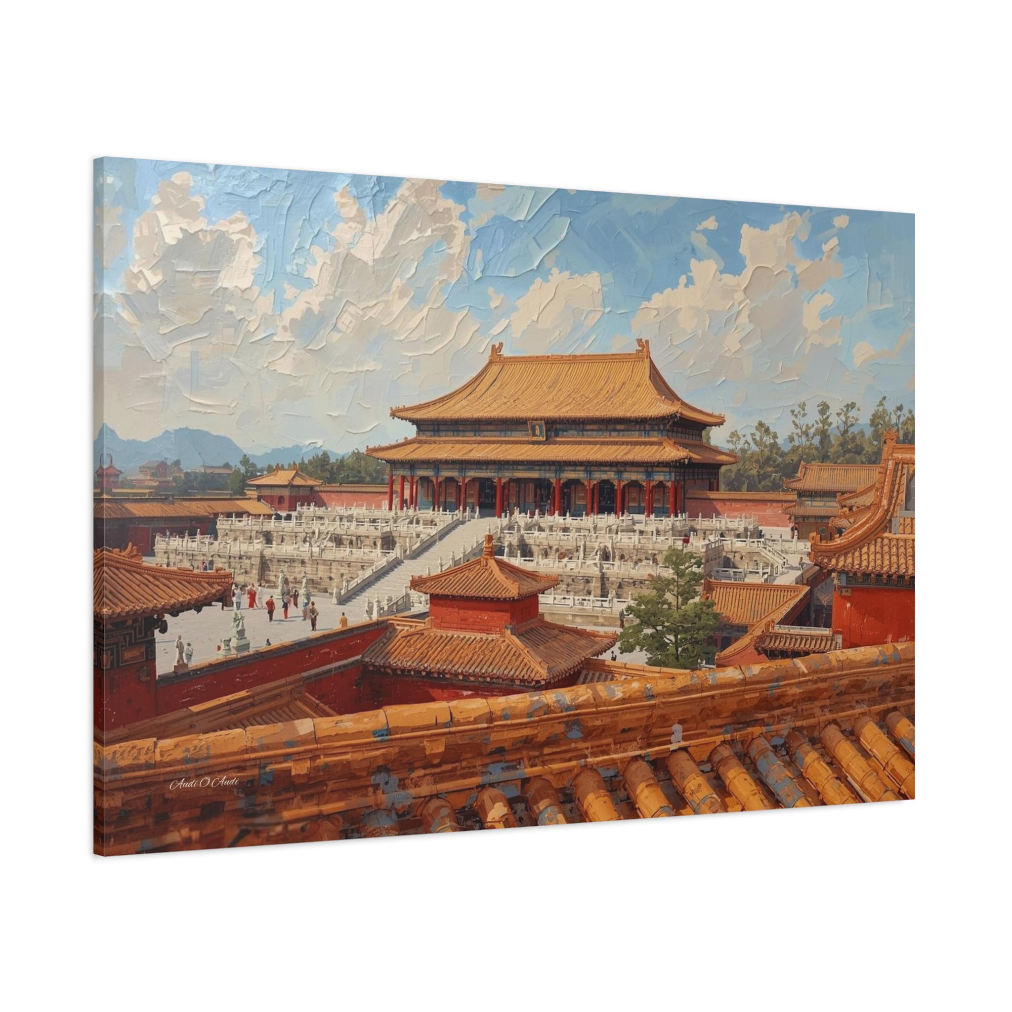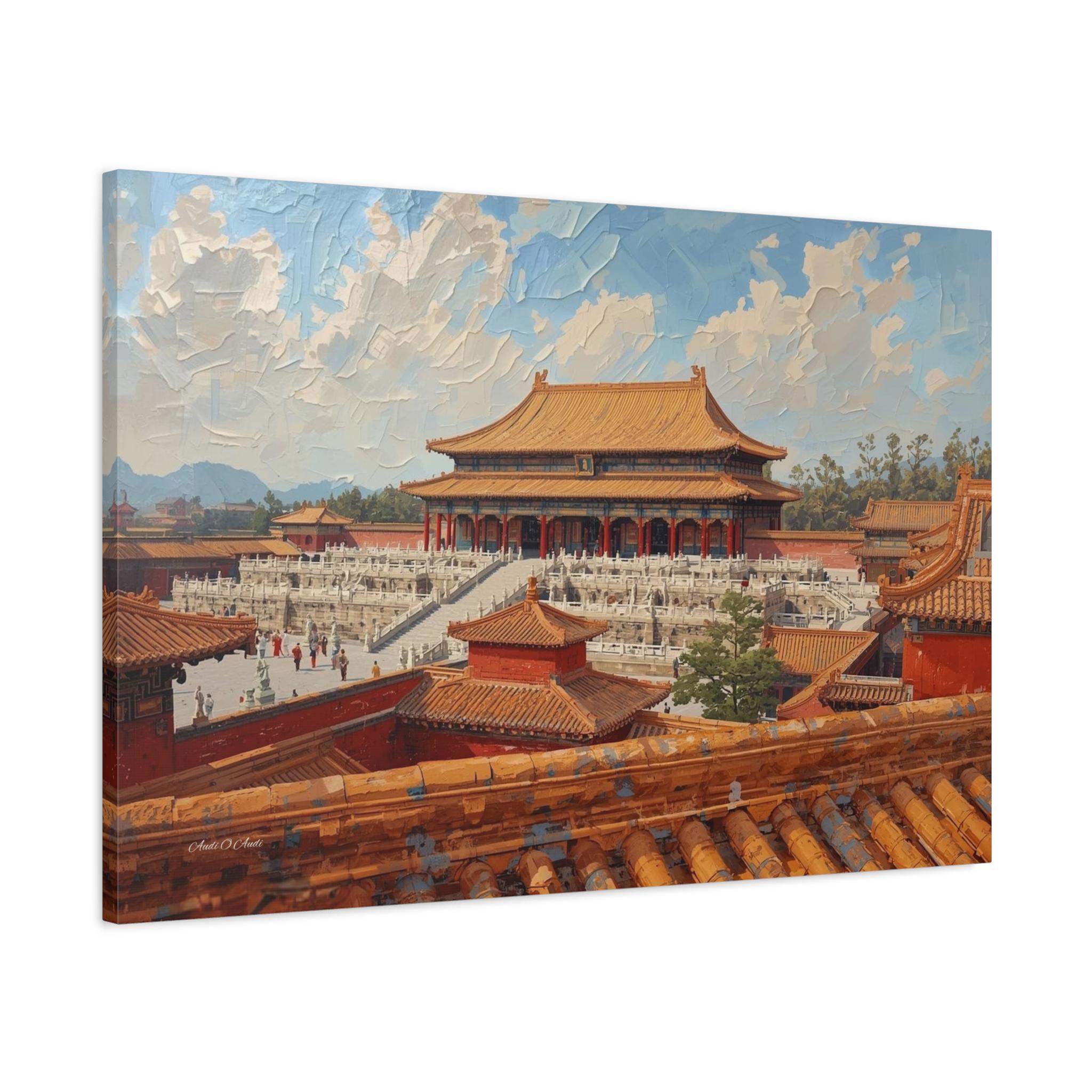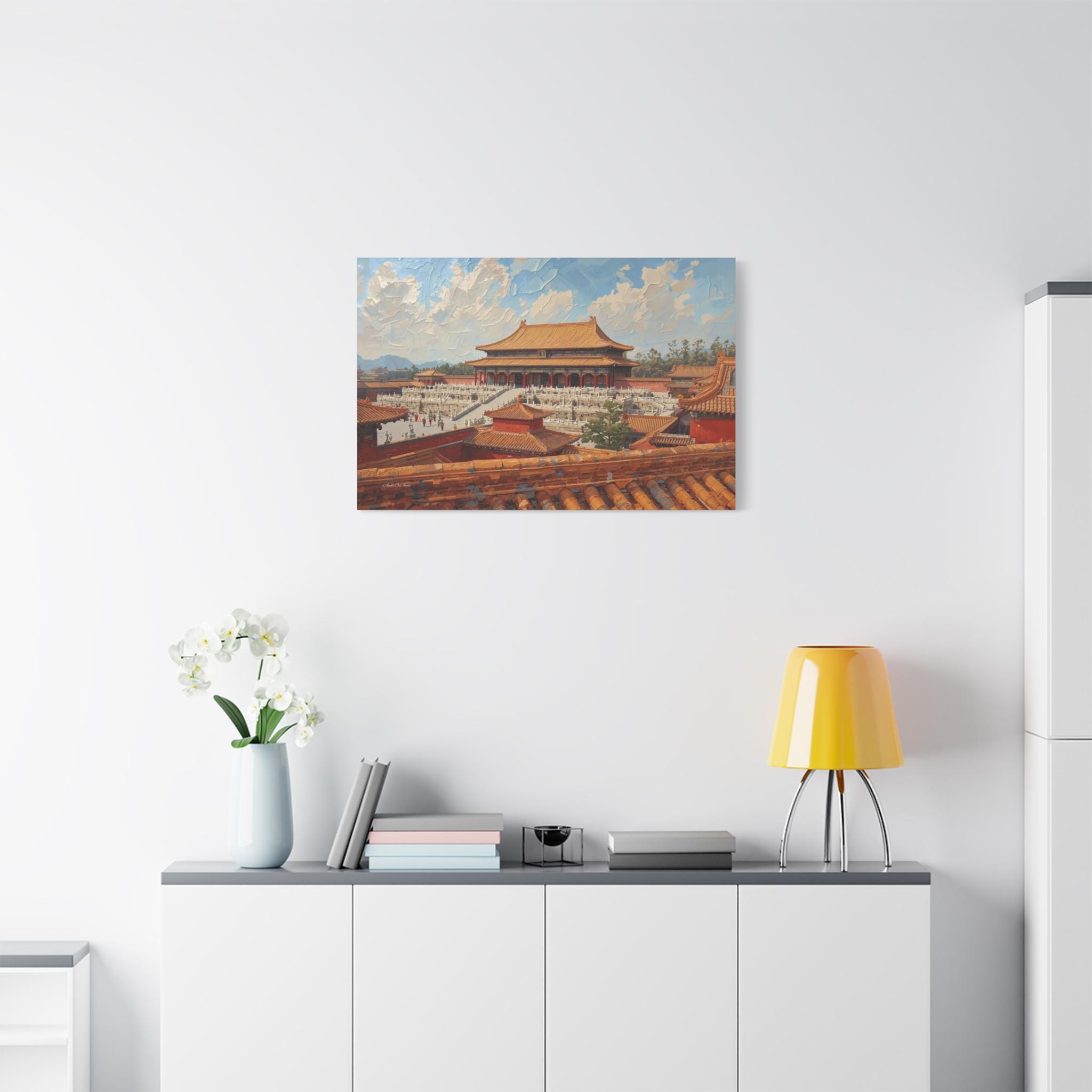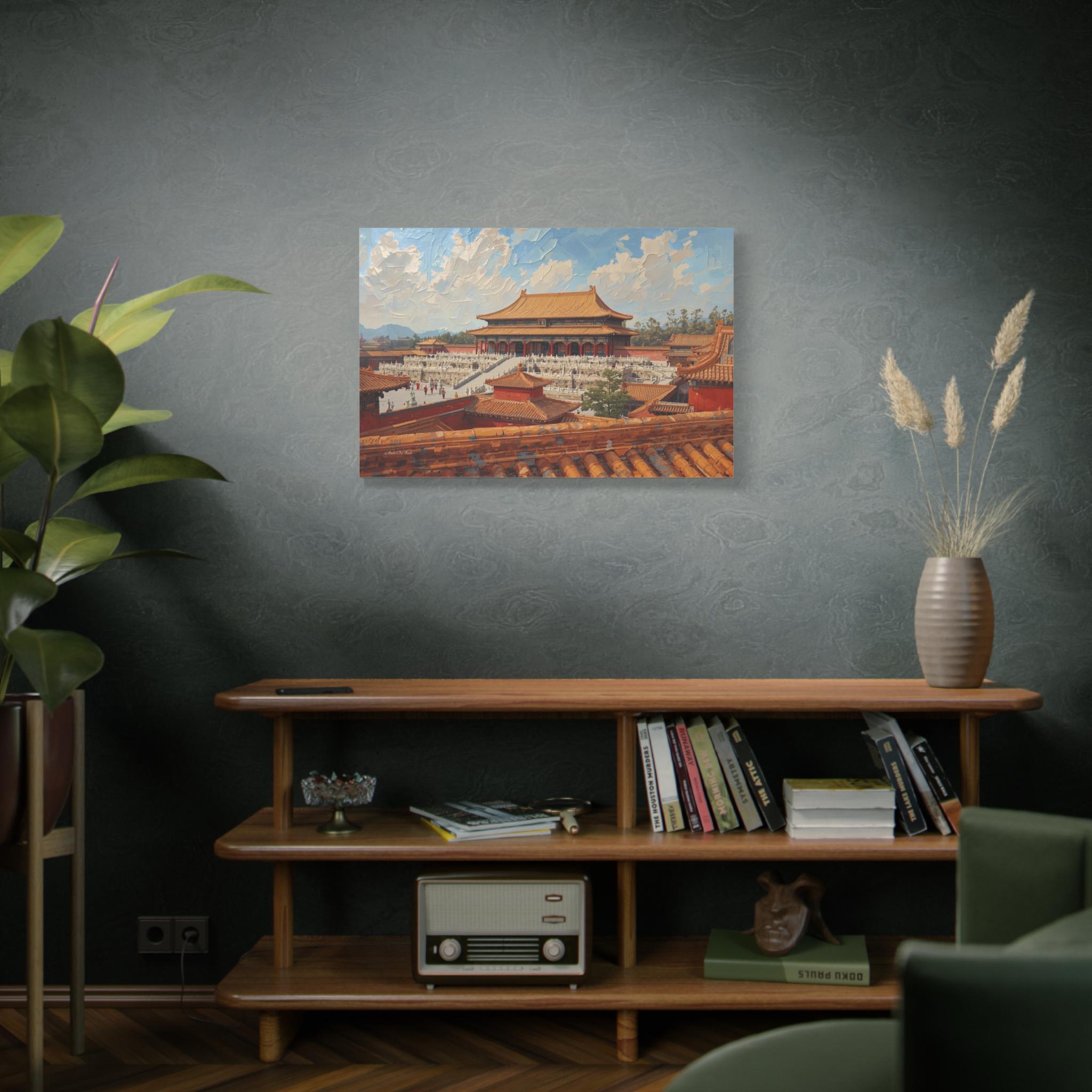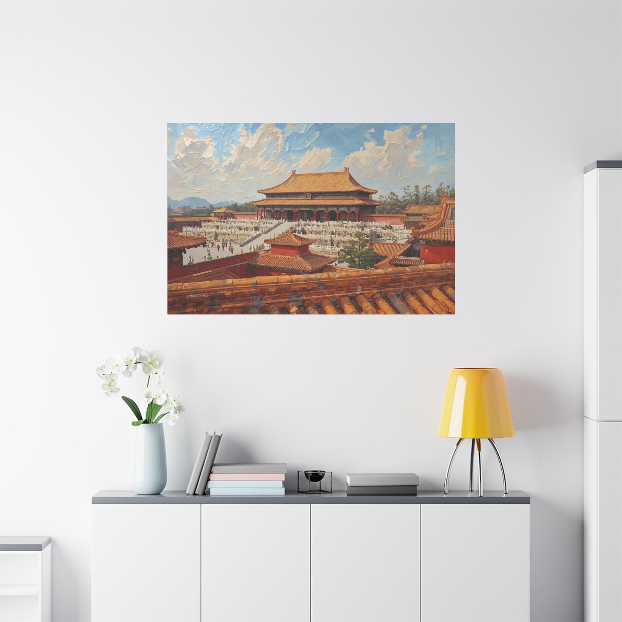 Experience the grandeur of the Orient with this immersive canvas print of the Forbidden City. This stunning architectural artwork offers a unique "rooftop view" perspective, looking out over the intricate orange tiles of the foreground toward the majestic Hall of Supreme Harmony.