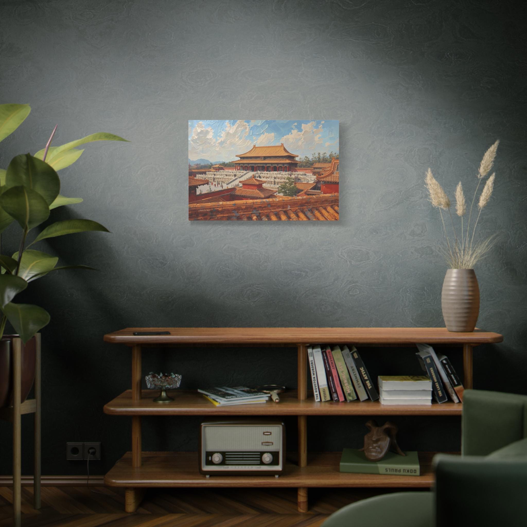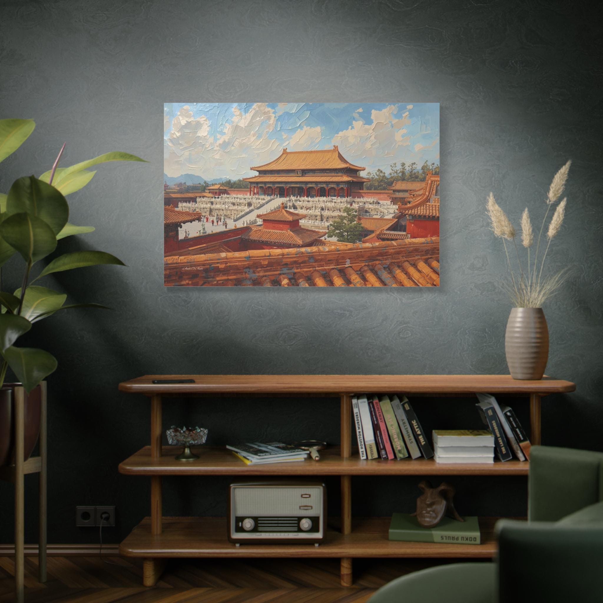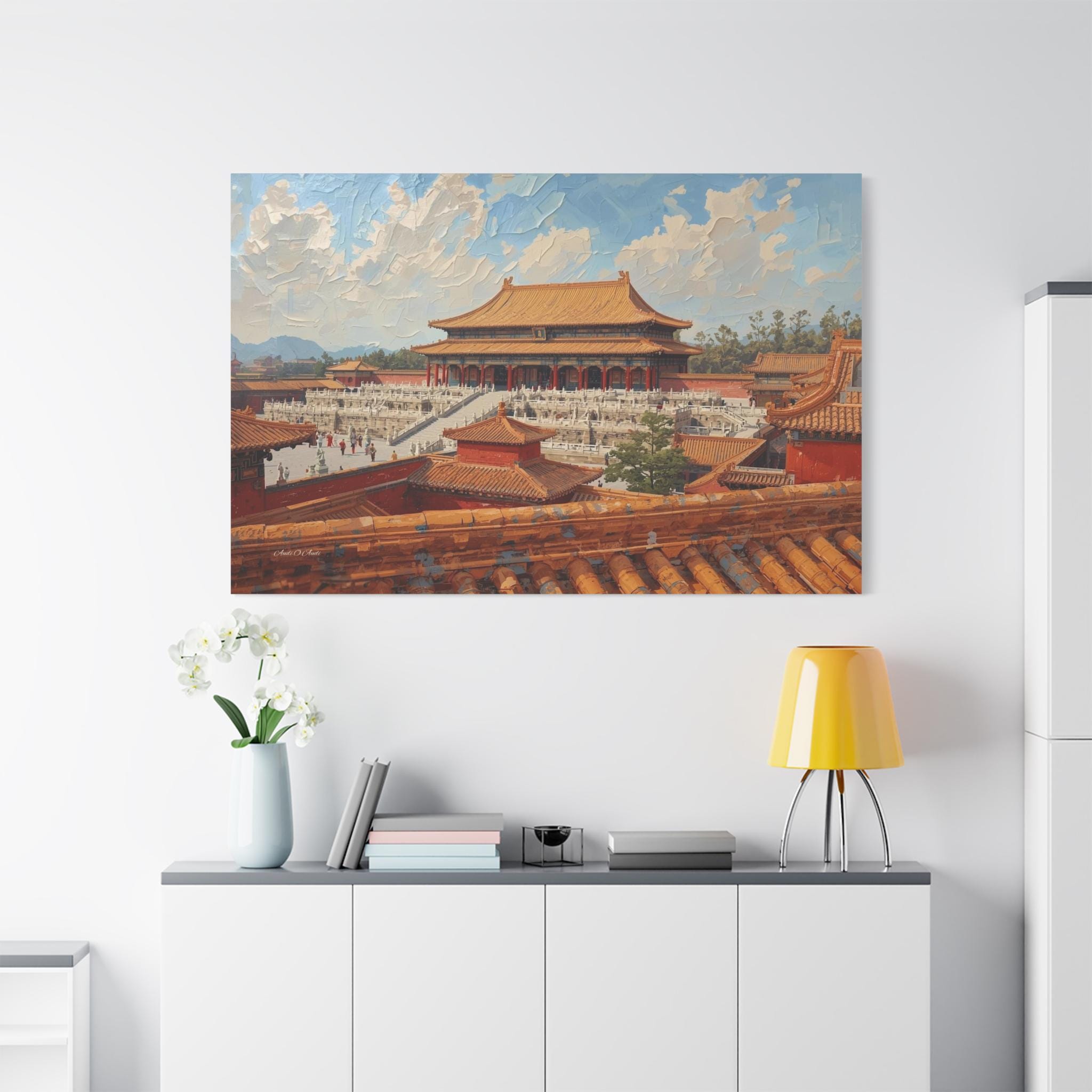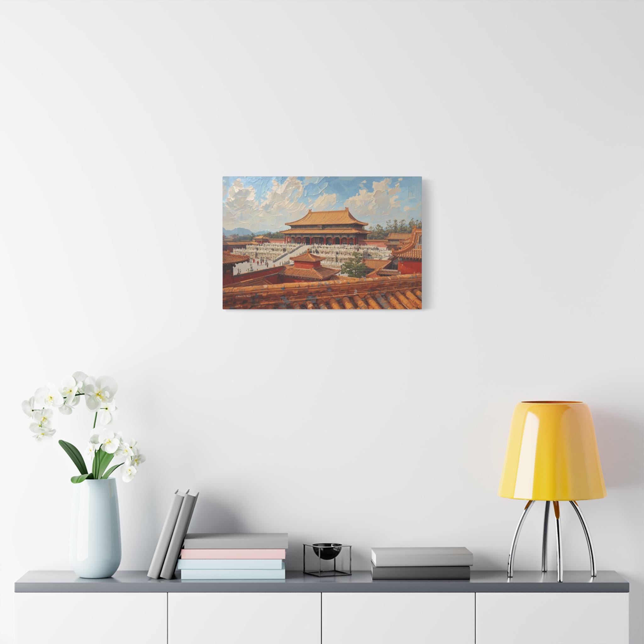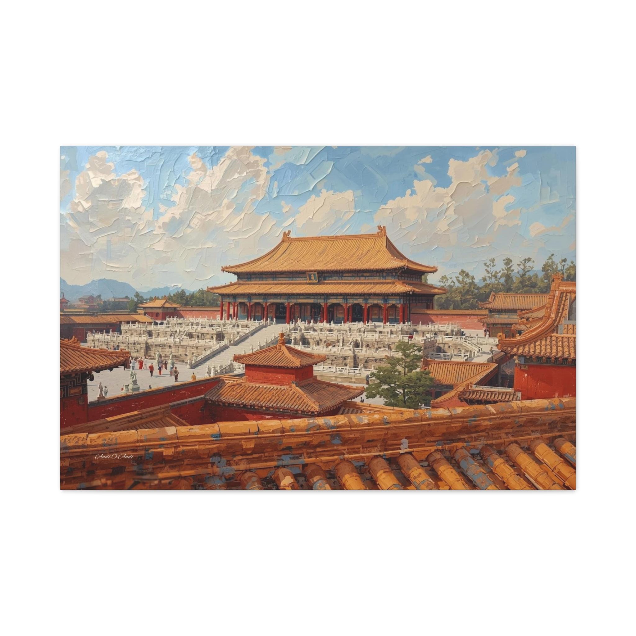 Experience the grandeur of the Orient with this immersive canvas print of the Forbidden City. This stunning architectural artwork offers a unique "rooftop view" perspective, looking out over the intricate orange tiles of the foreground toward the majestic Hall of Supreme Harmony.