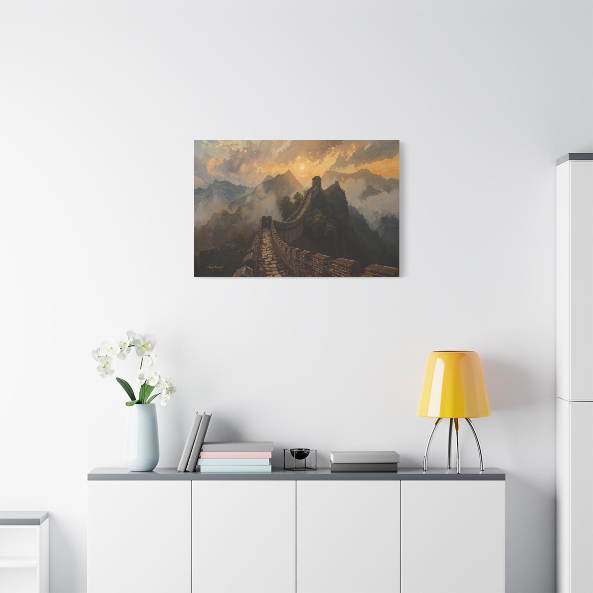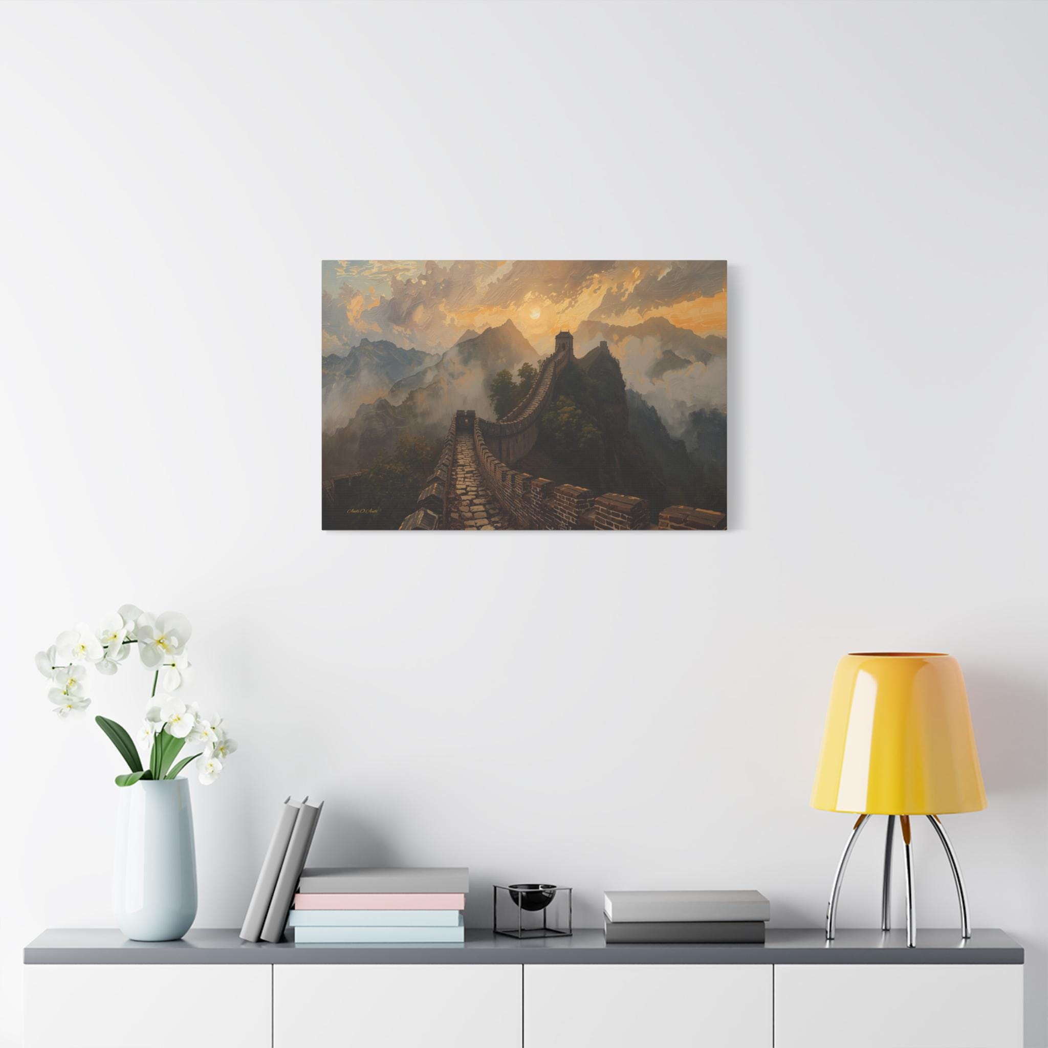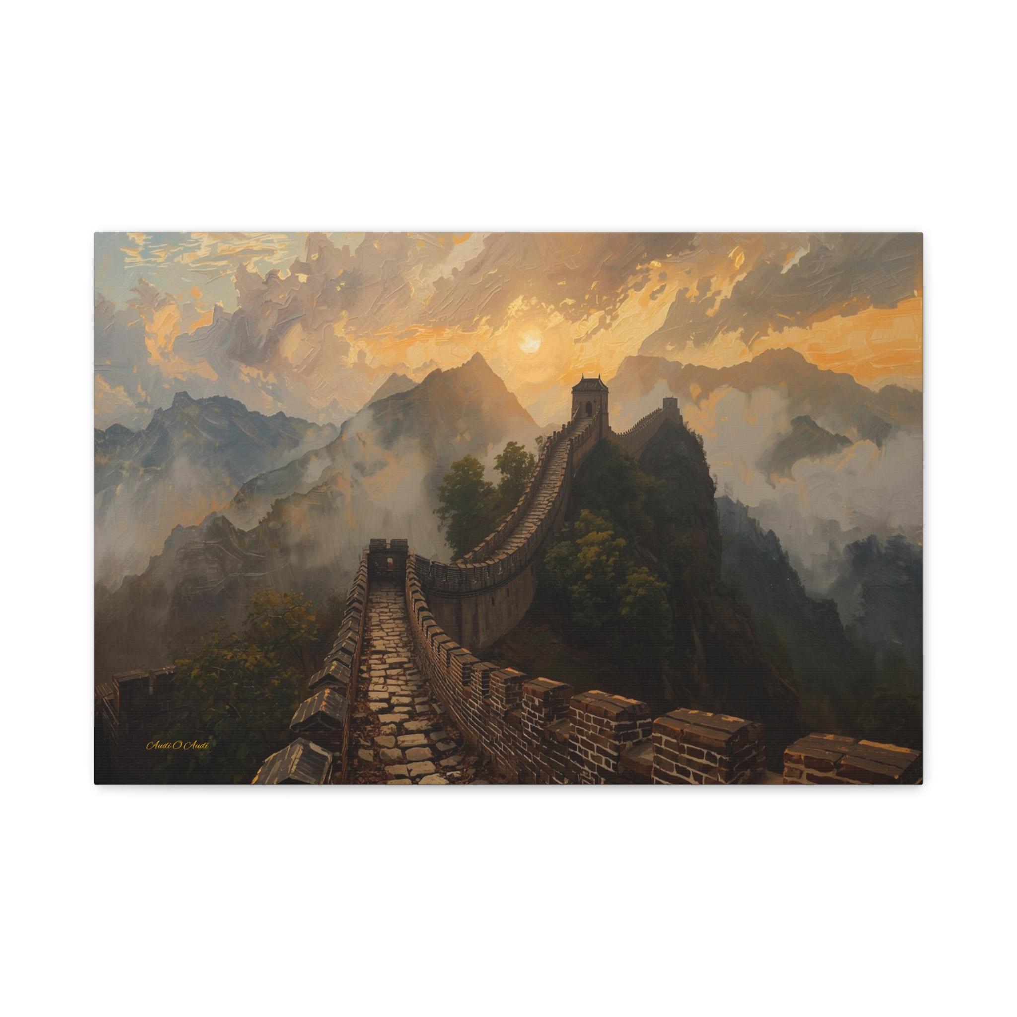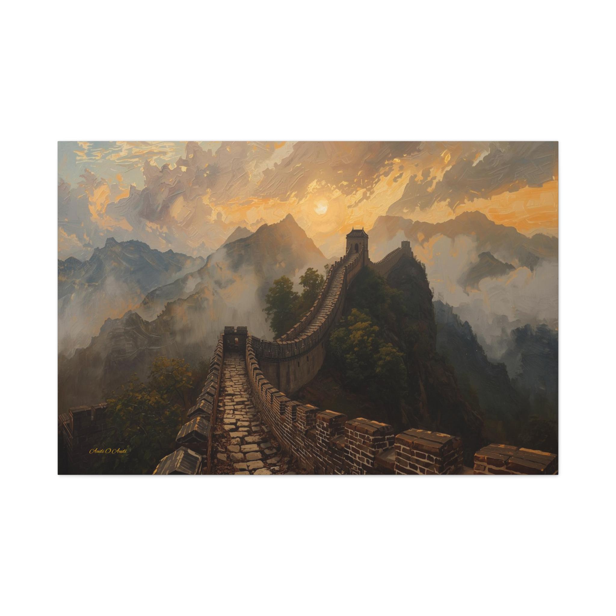 Embark on an epic journey through history with this breathtaking canvas print of the Great Wall of China. This majestic landscape artwork captures the ancient stone dragon winding its way over rugged mountain ridges, disappearing into a sea of golden mist and clouds at sunset.
