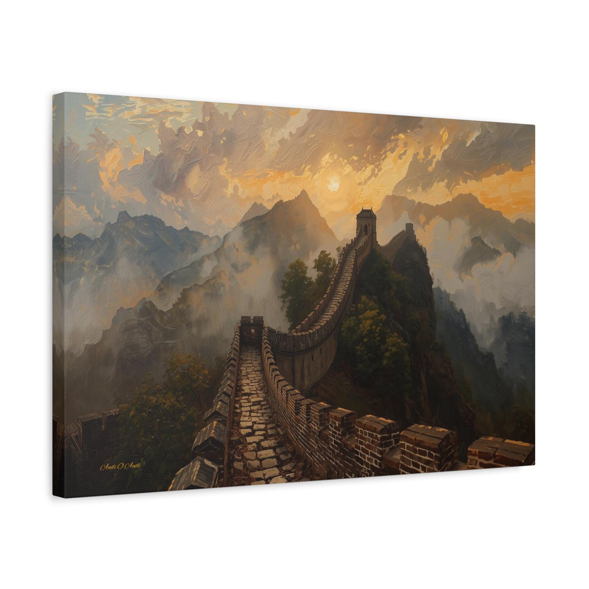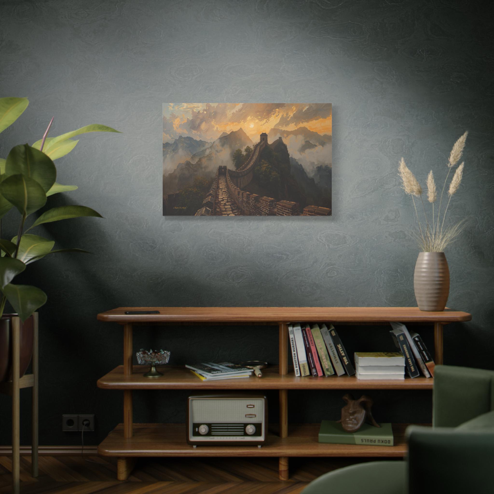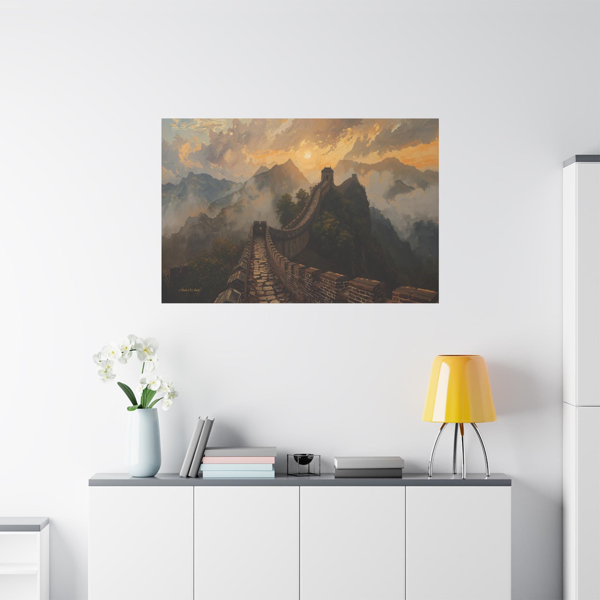 Embark on an epic journey through history with this breathtaking canvas print of the Great Wall of China. This majestic landscape artwork captures the ancient stone dragon winding its way over rugged mountain ridges, disappearing into a sea of golden mist and clouds at sunset.