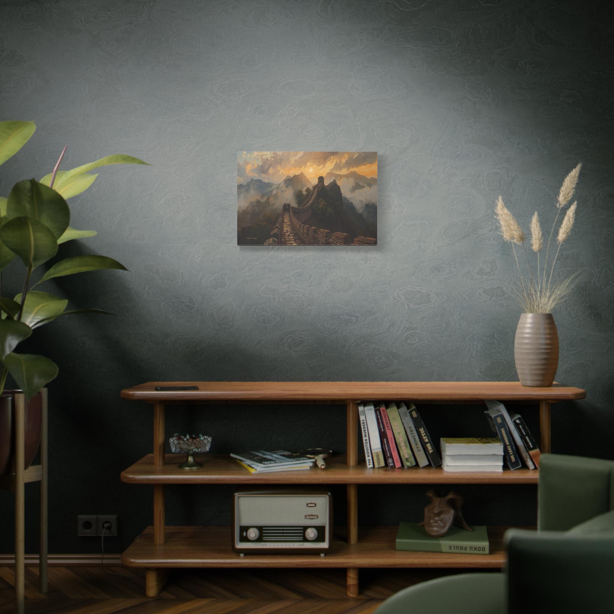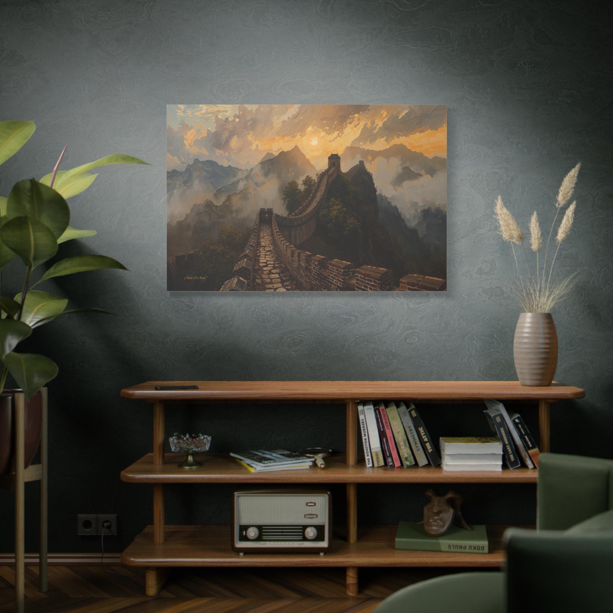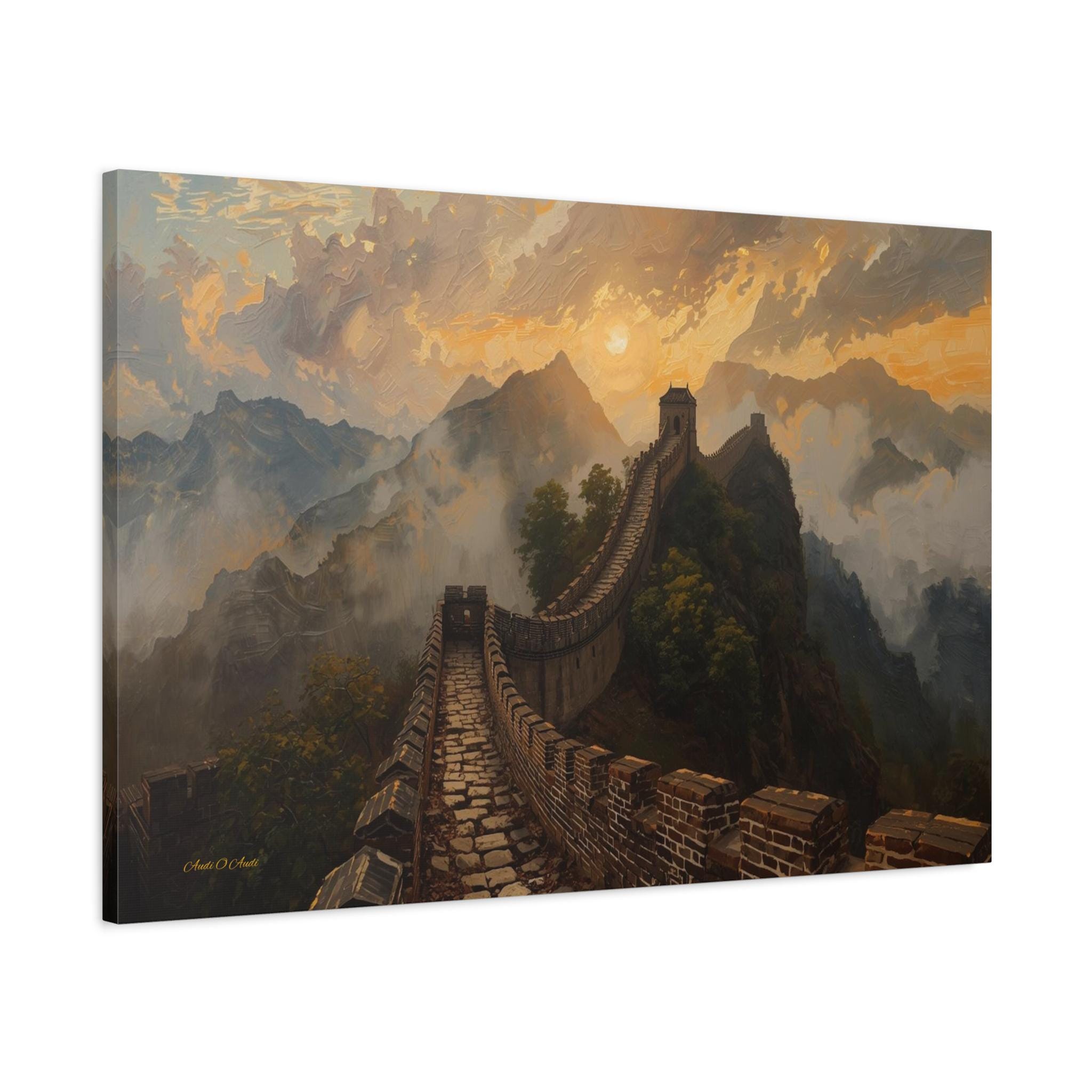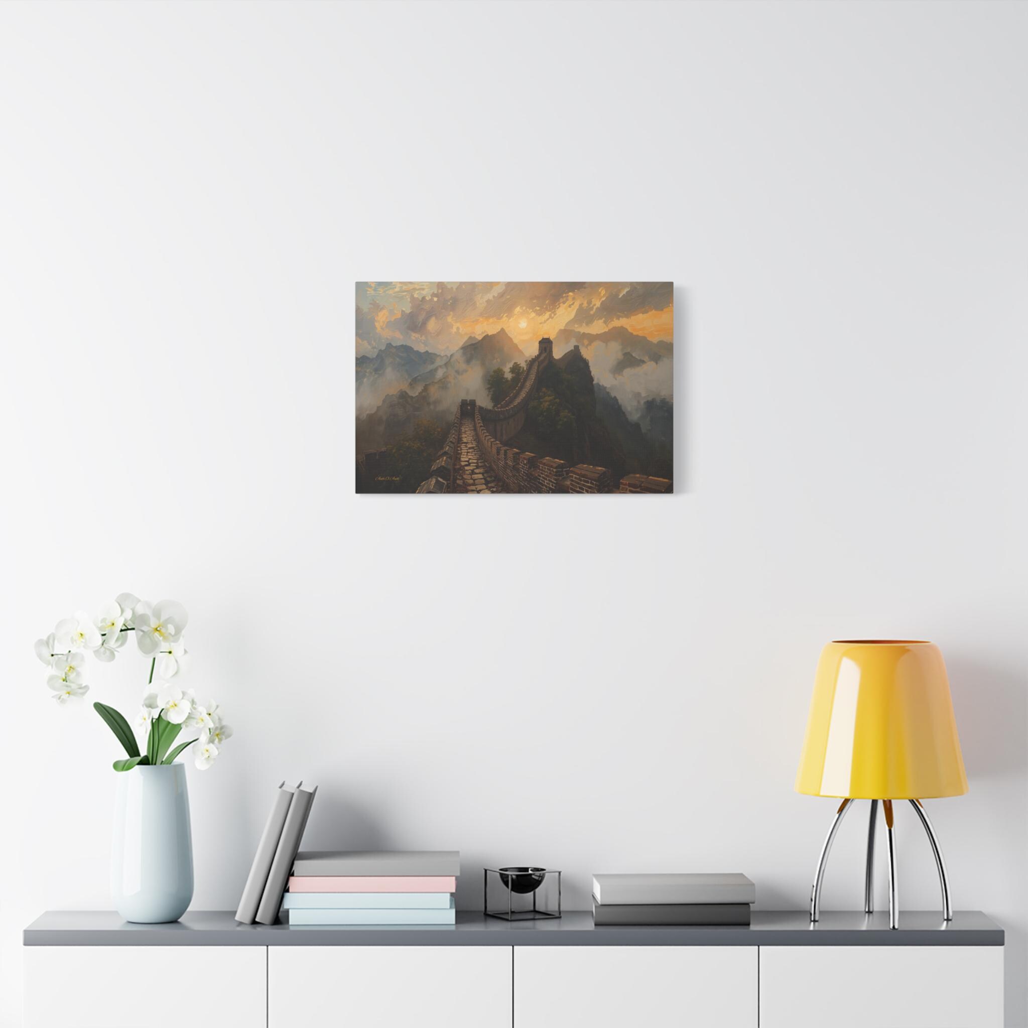 Embark on an epic journey through history with this breathtaking canvas print of the Great Wall of China. This majestic landscape artwork captures the ancient stone dragon winding its way over rugged mountain ridges, disappearing into a sea of golden mist and clouds at sunset.