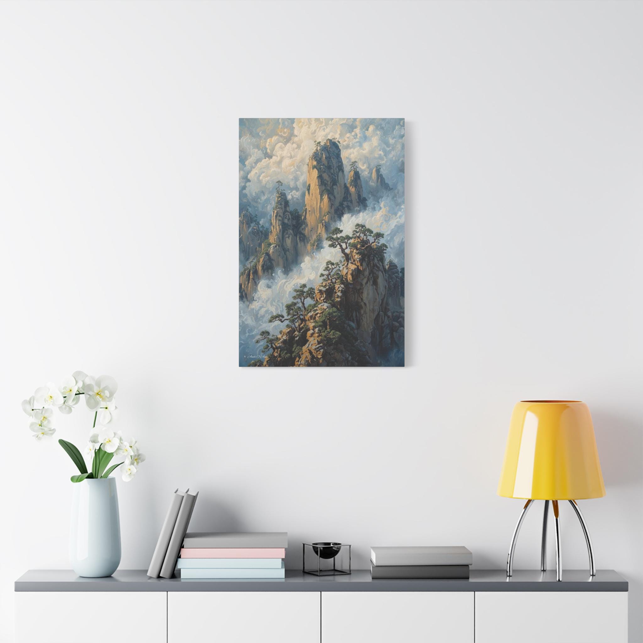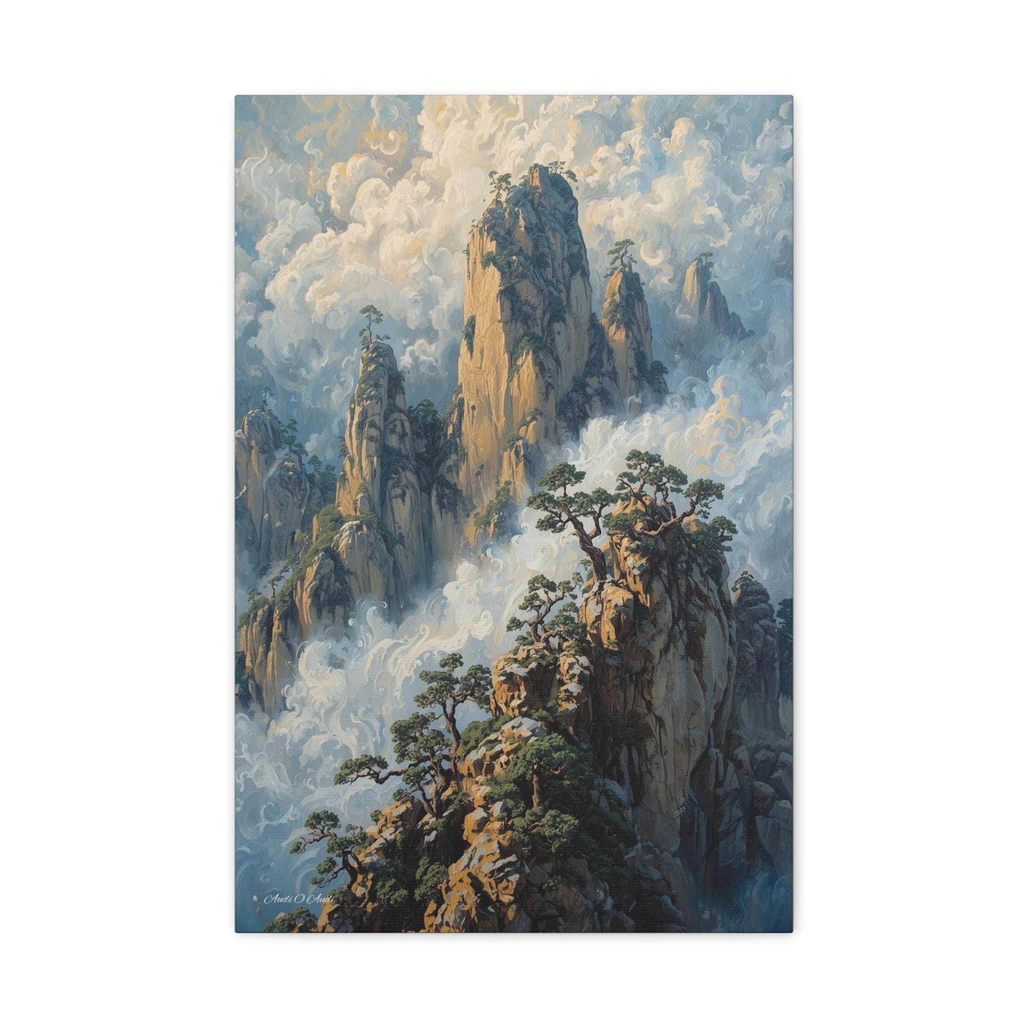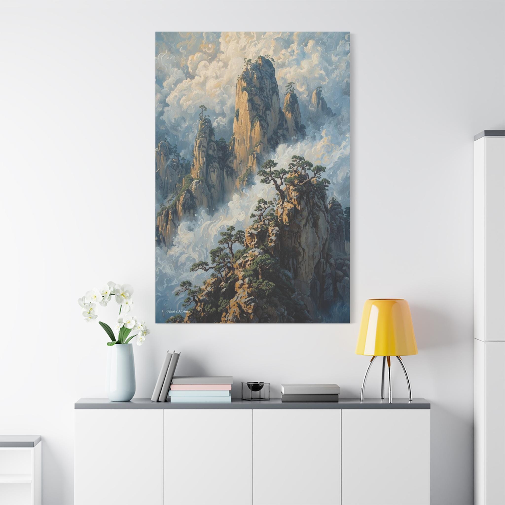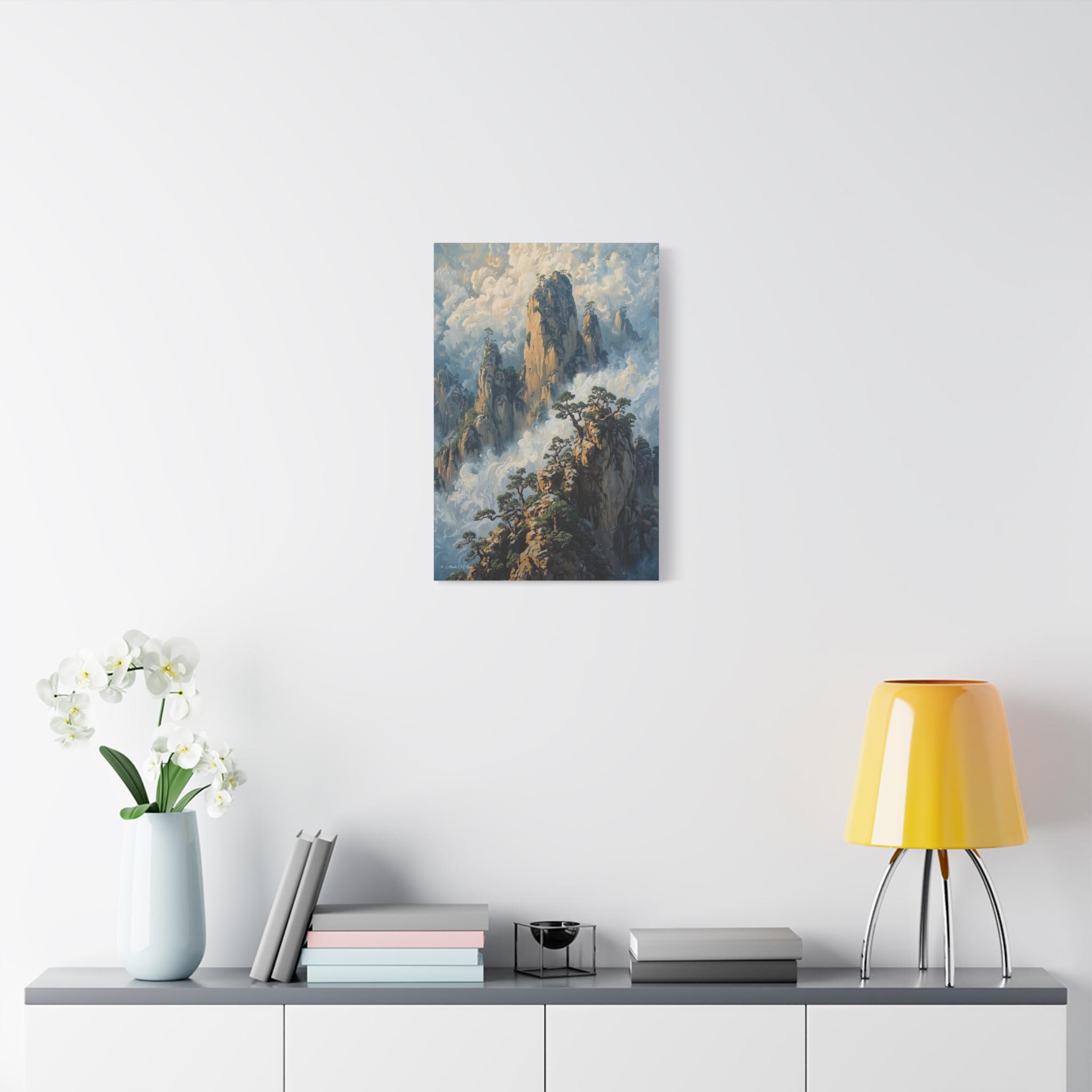 Transport your home to a realm of ancient mystery with this breathtaking canvas print of misty mountain peaks. Inspired by the legendary "Yellow Mountains" of China, this vertical artwork features towering jagged rock formations rising majestically from a swirling sea of clouds.