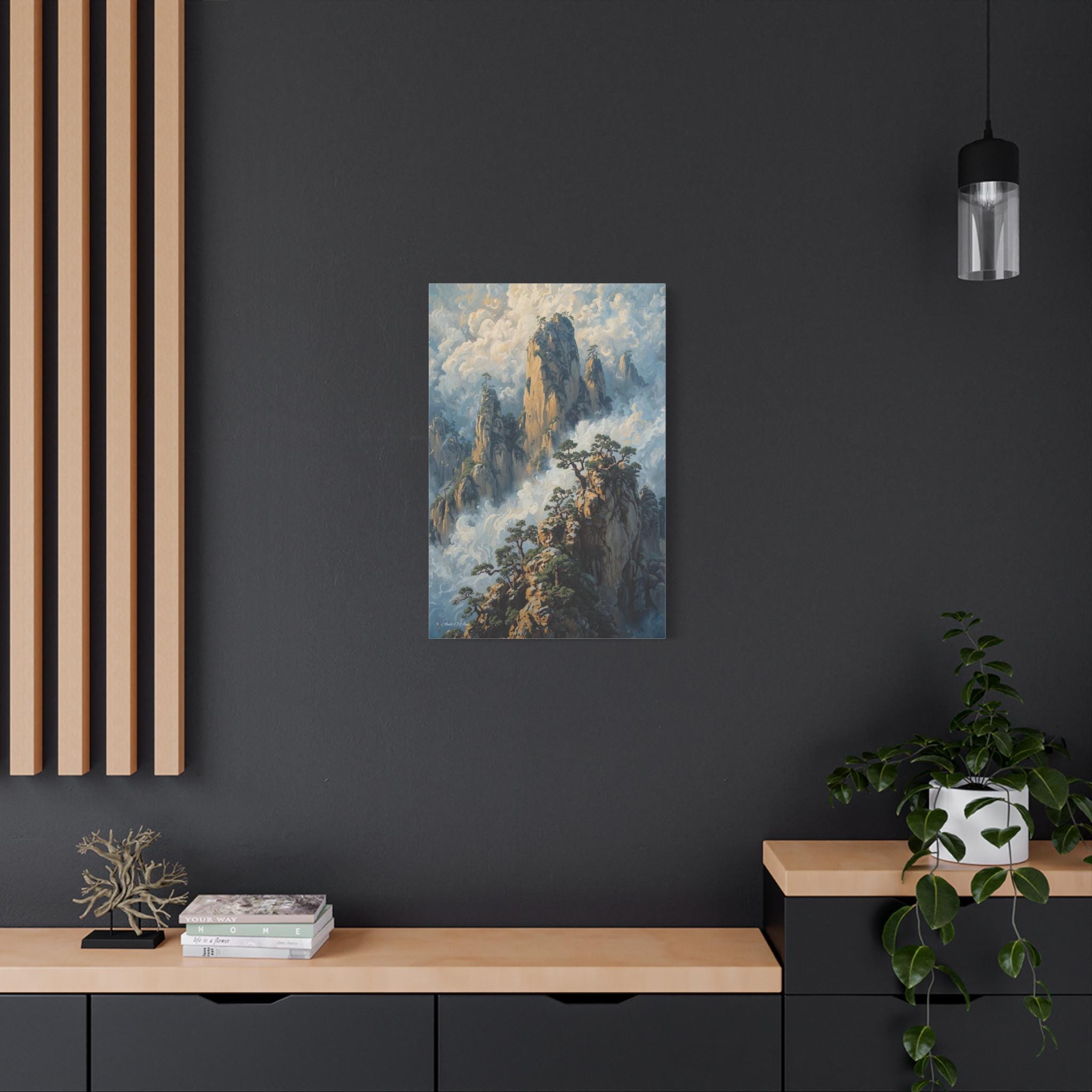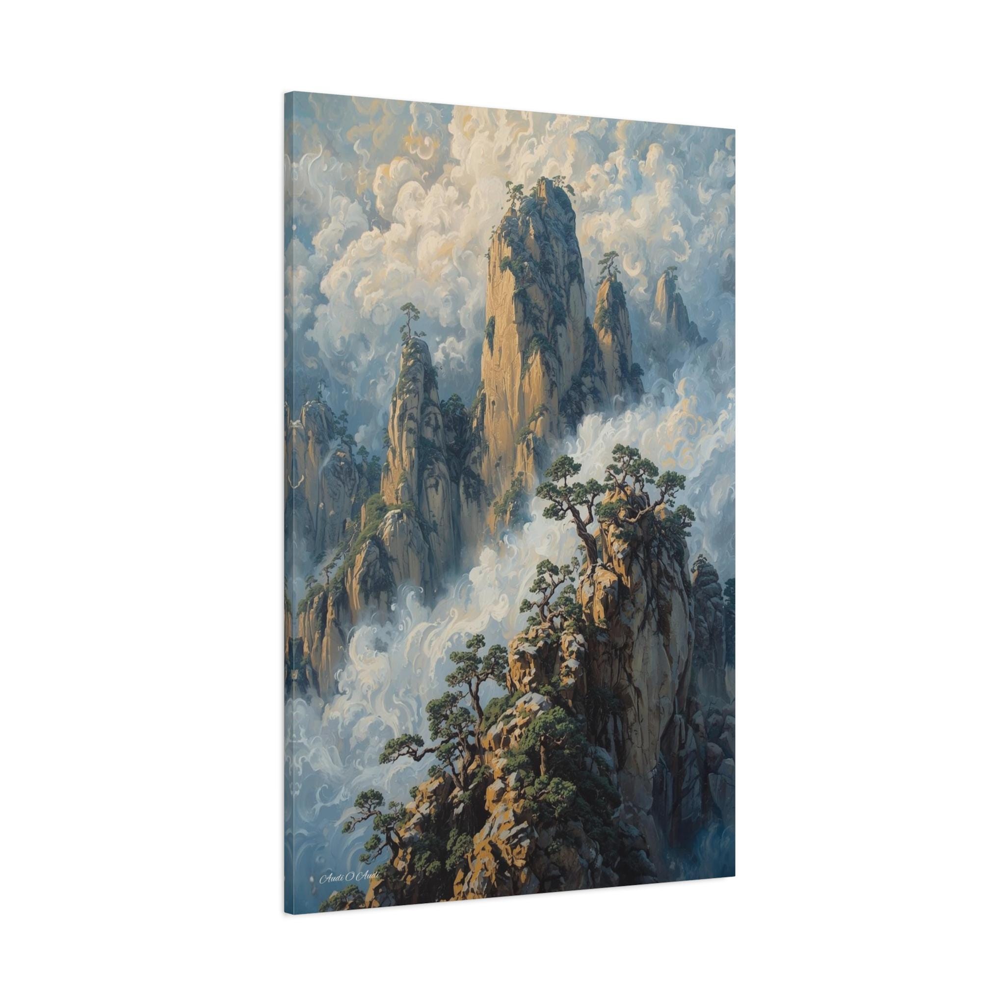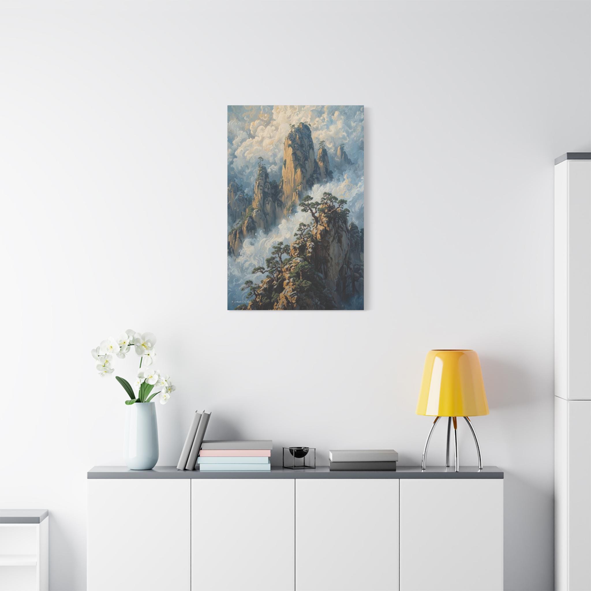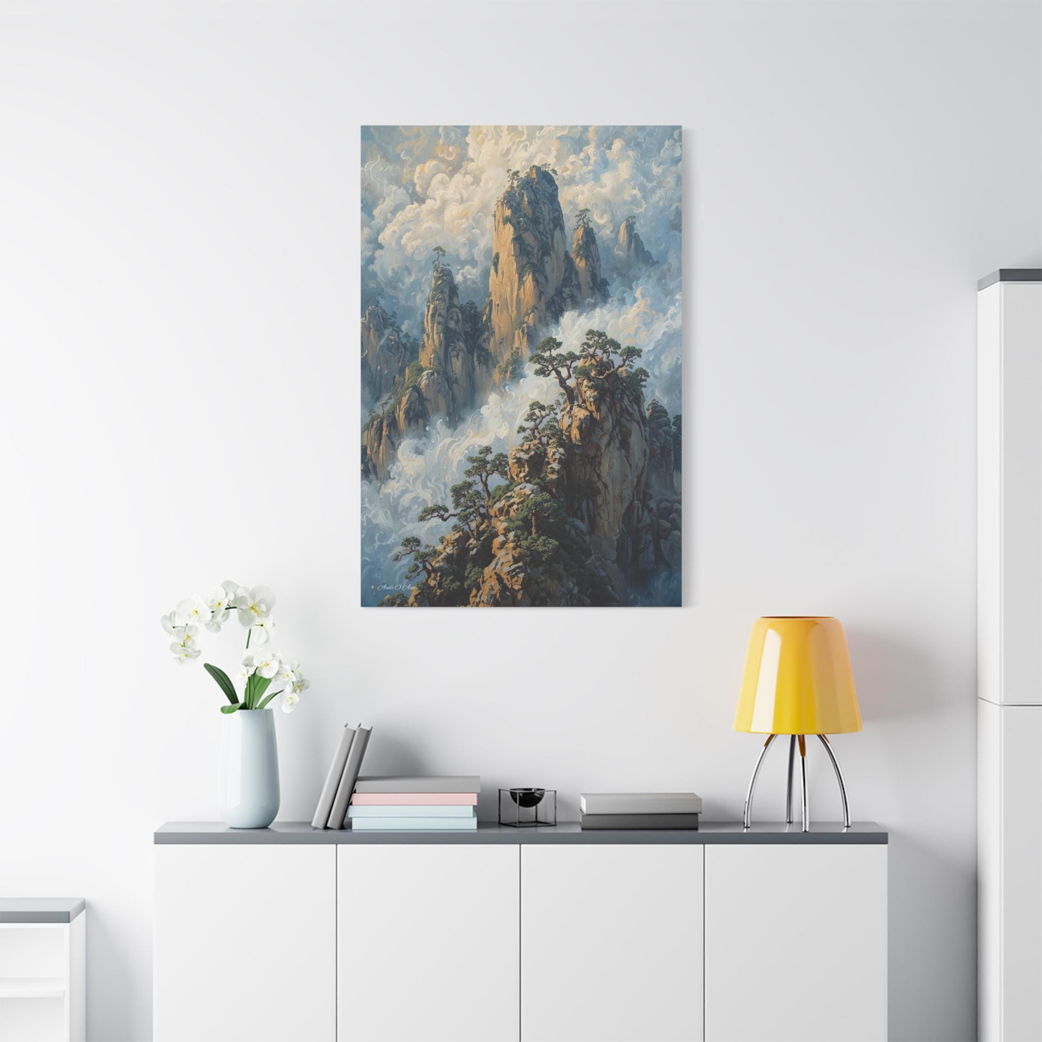 Transport your home to a realm of ancient mystery with this breathtaking canvas print of misty mountain peaks. Inspired by the legendary "Yellow Mountains" of China, this vertical artwork features towering jagged rock formations rising majestically from a swirling sea of clouds.