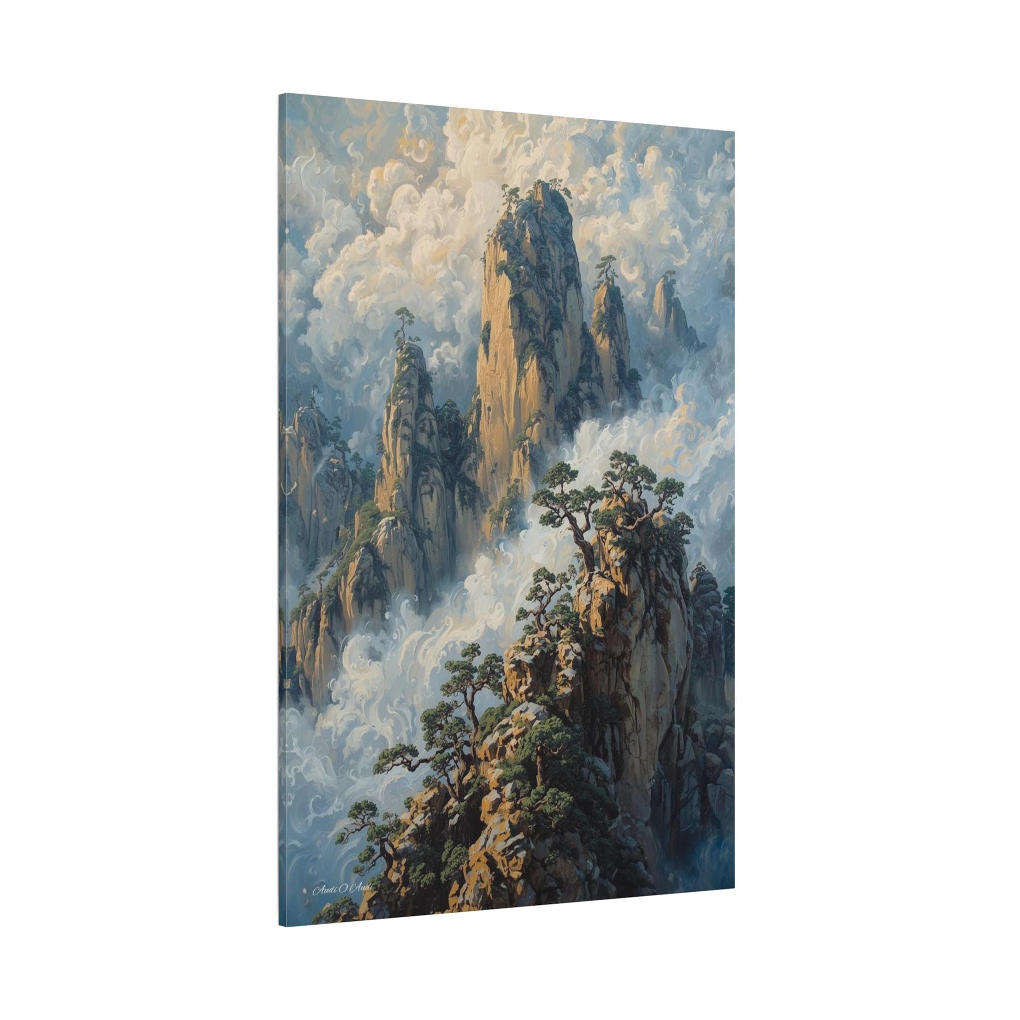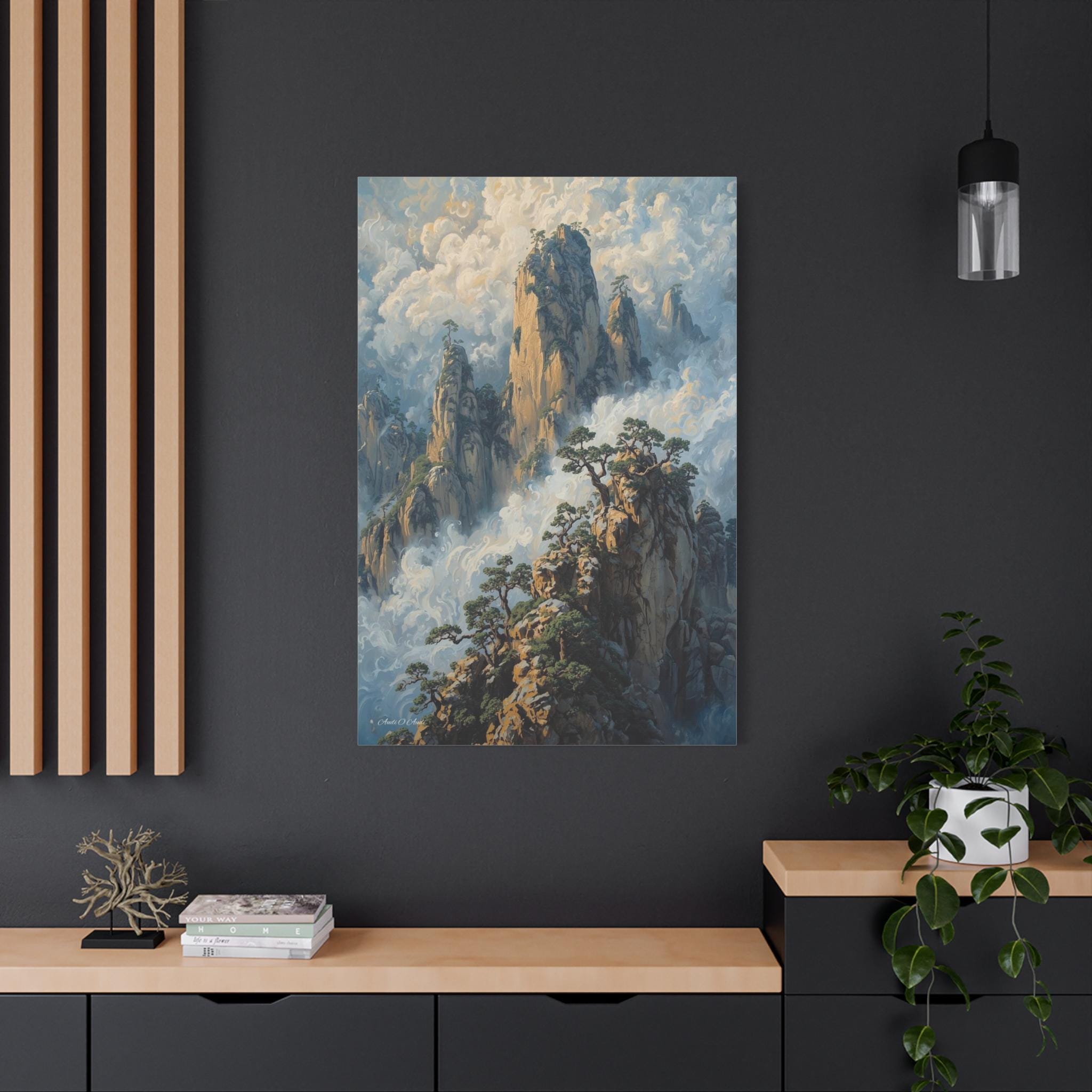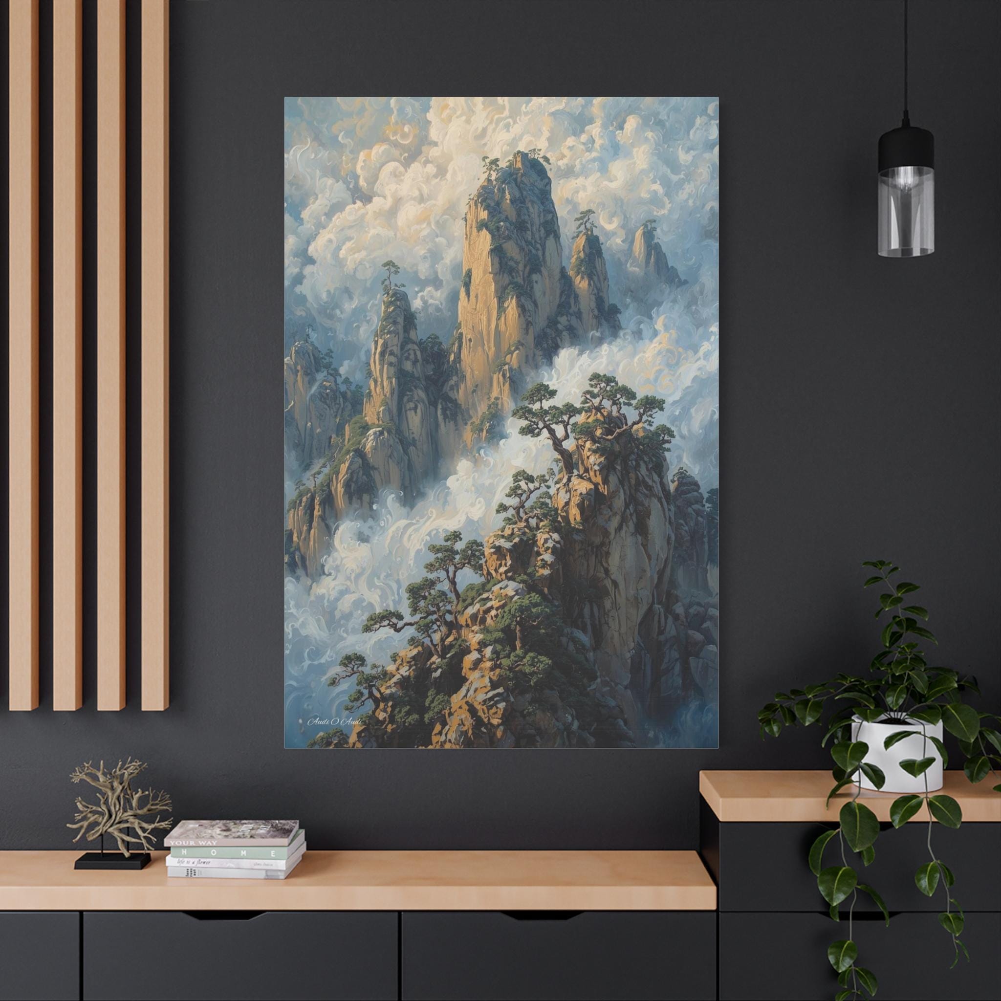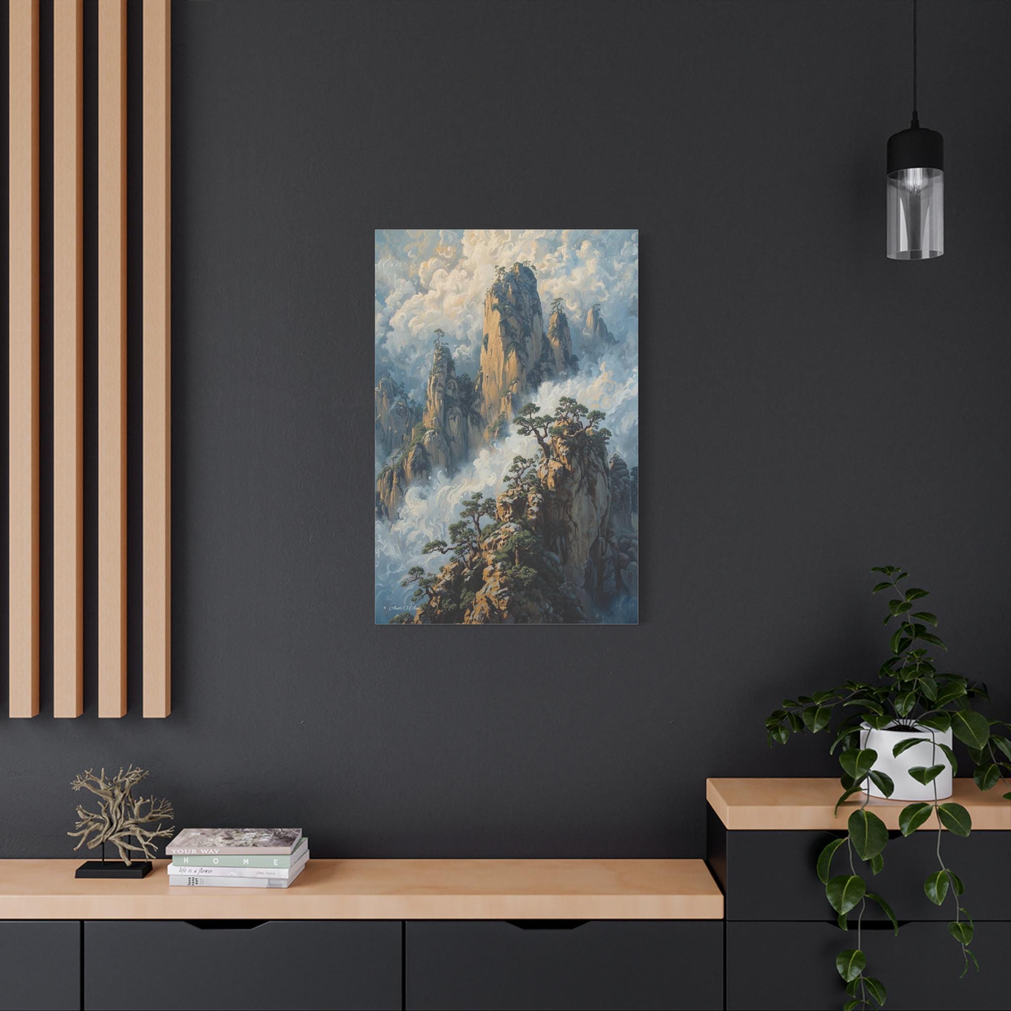 Transport your home to a realm of ancient mystery with this breathtaking canvas print of misty mountain peaks. Inspired by the legendary "Yellow Mountains" of China, this vertical artwork features towering jagged rock formations rising majestically from a swirling sea of clouds.
