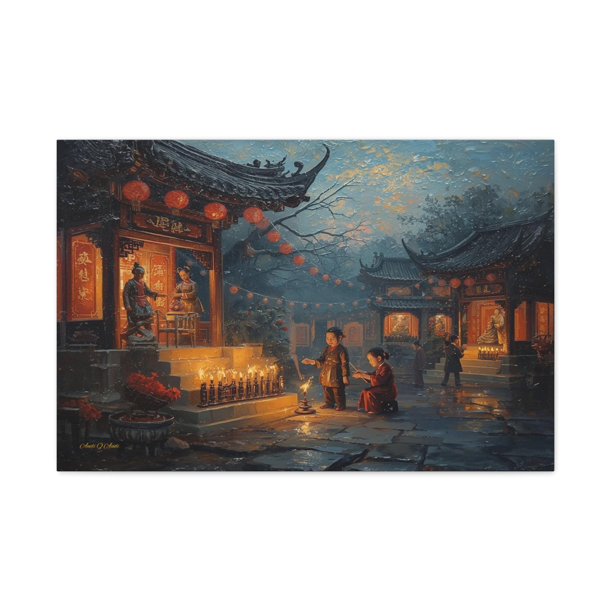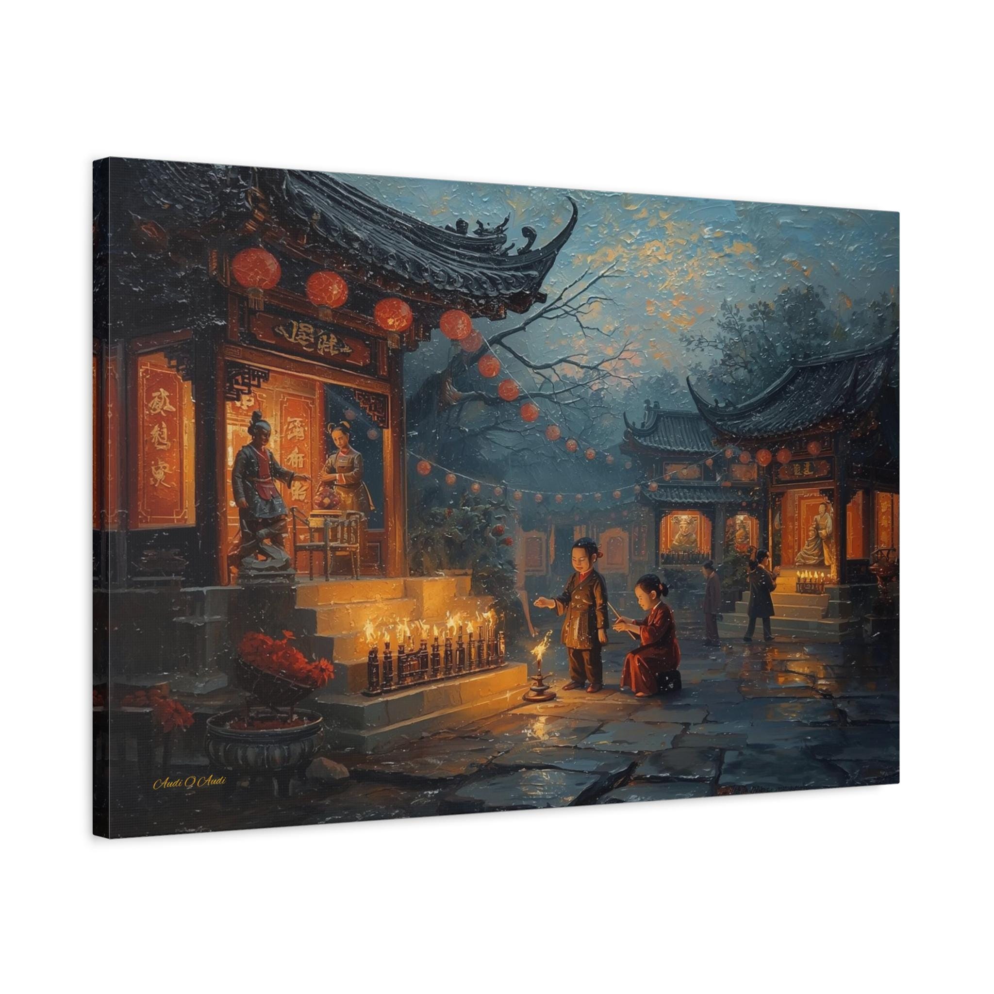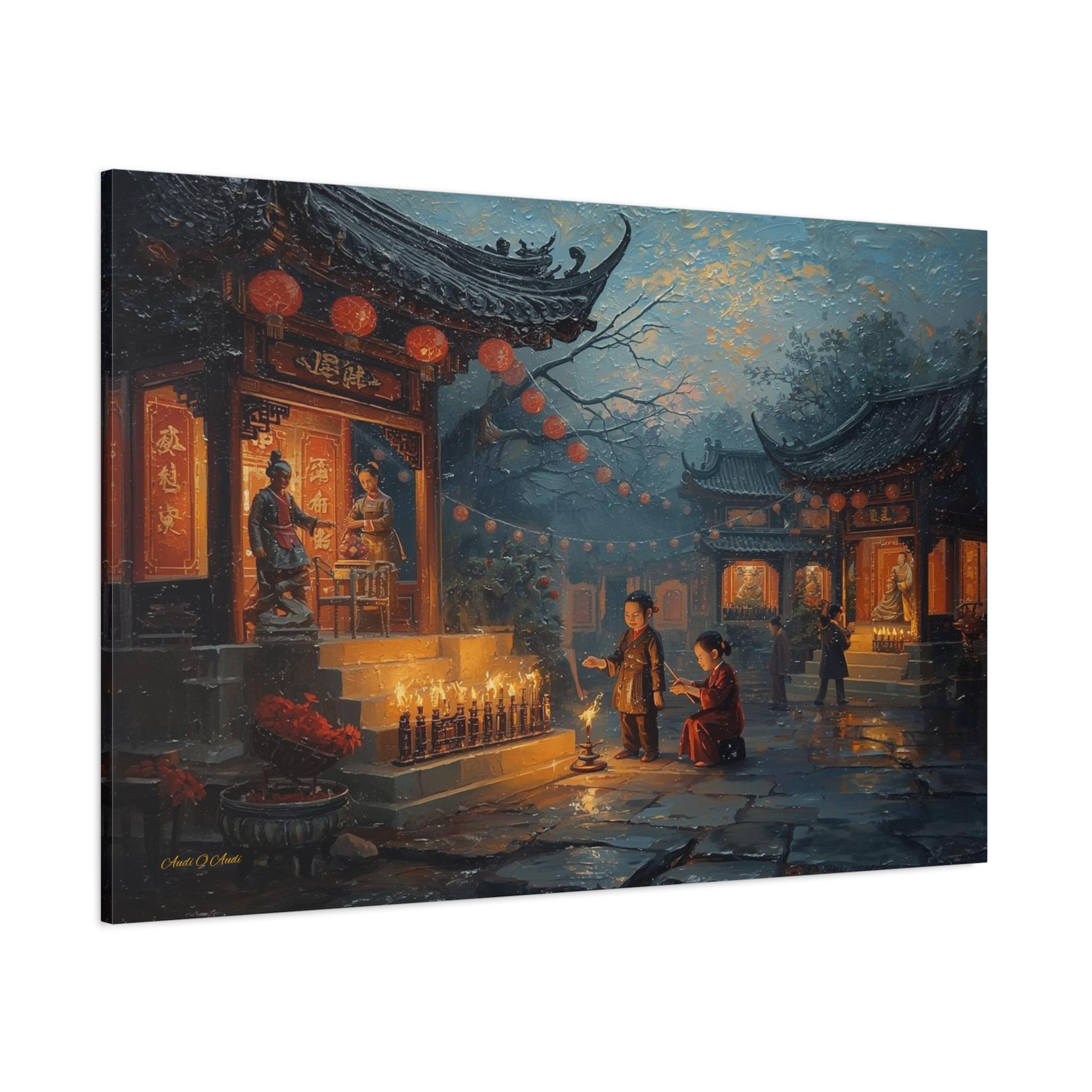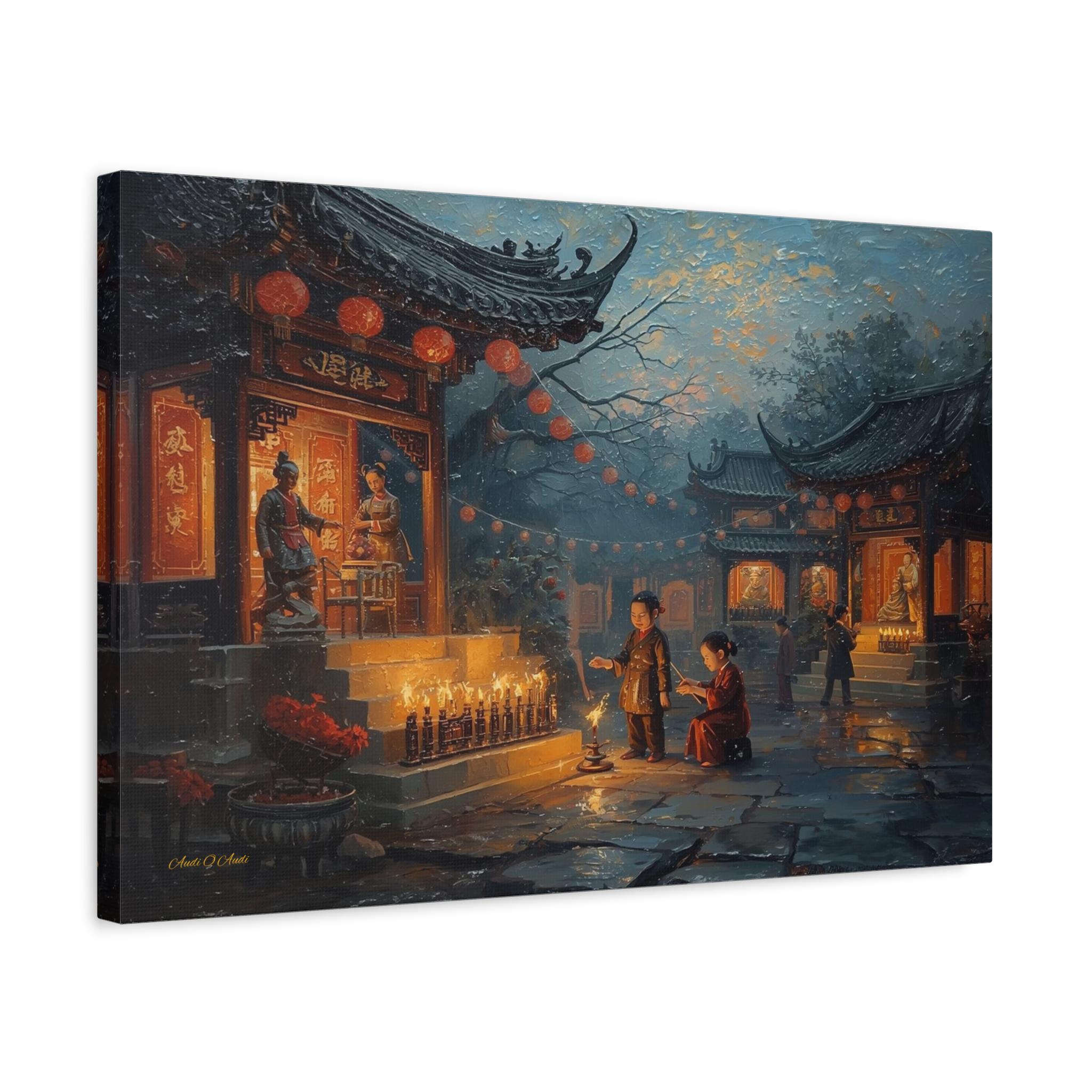 Honor the past and celebrate the light of memory with this moving canvas print of an Ancestors' Festival. This atmospheric artwork captures a tender moment in a snowy temple courtyard, where the next generation participates in the timeless ritual of remembrance.