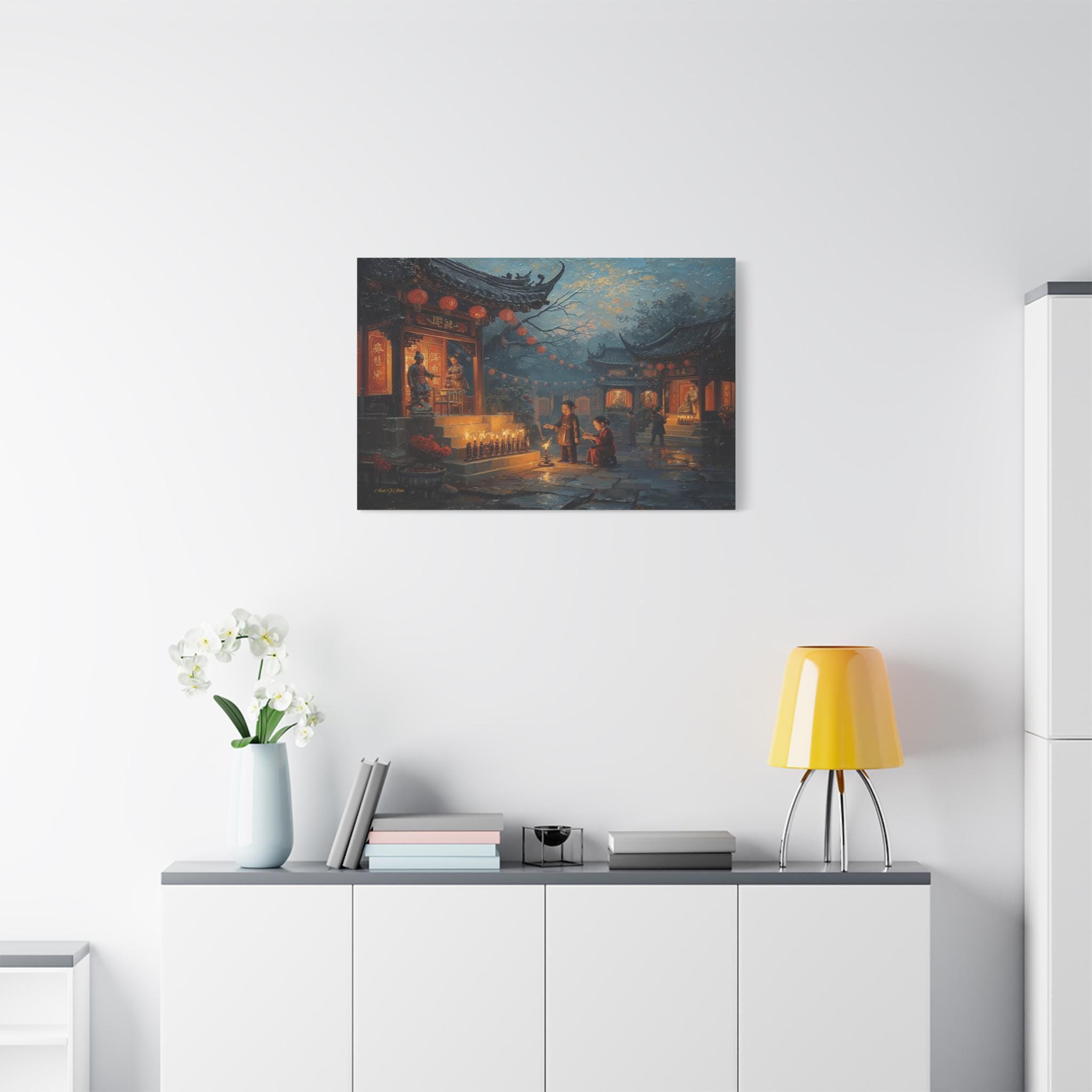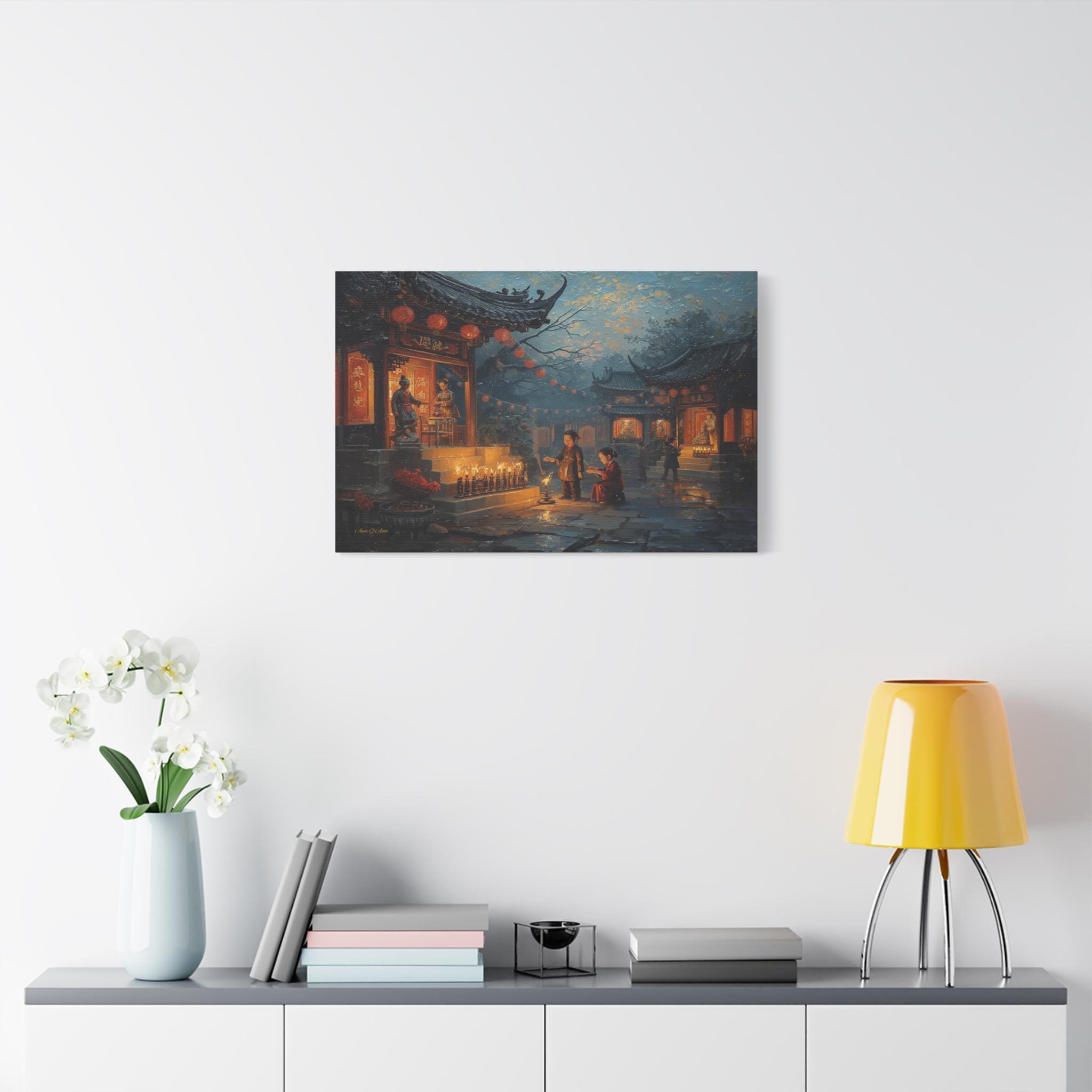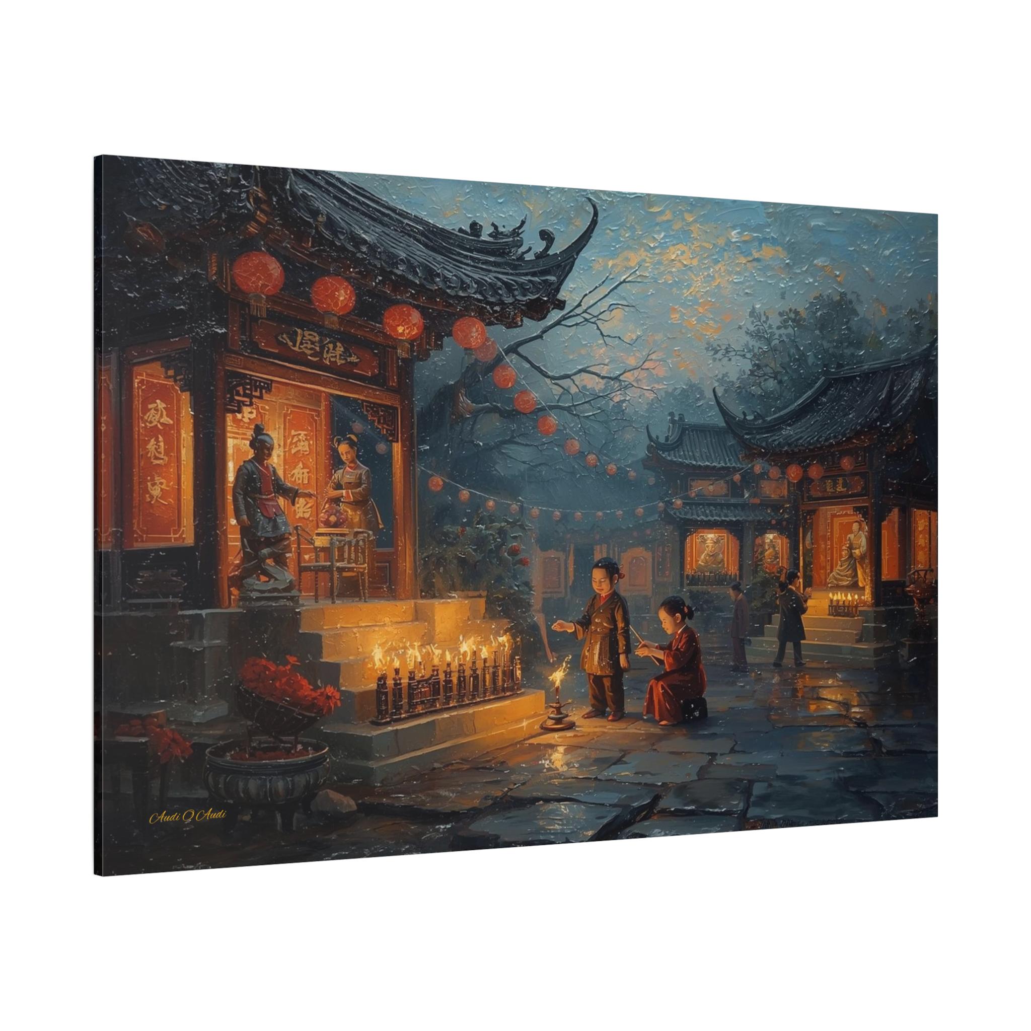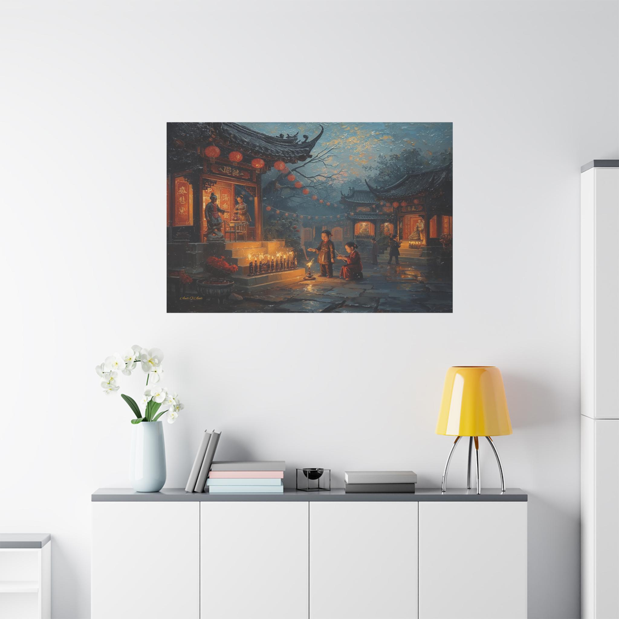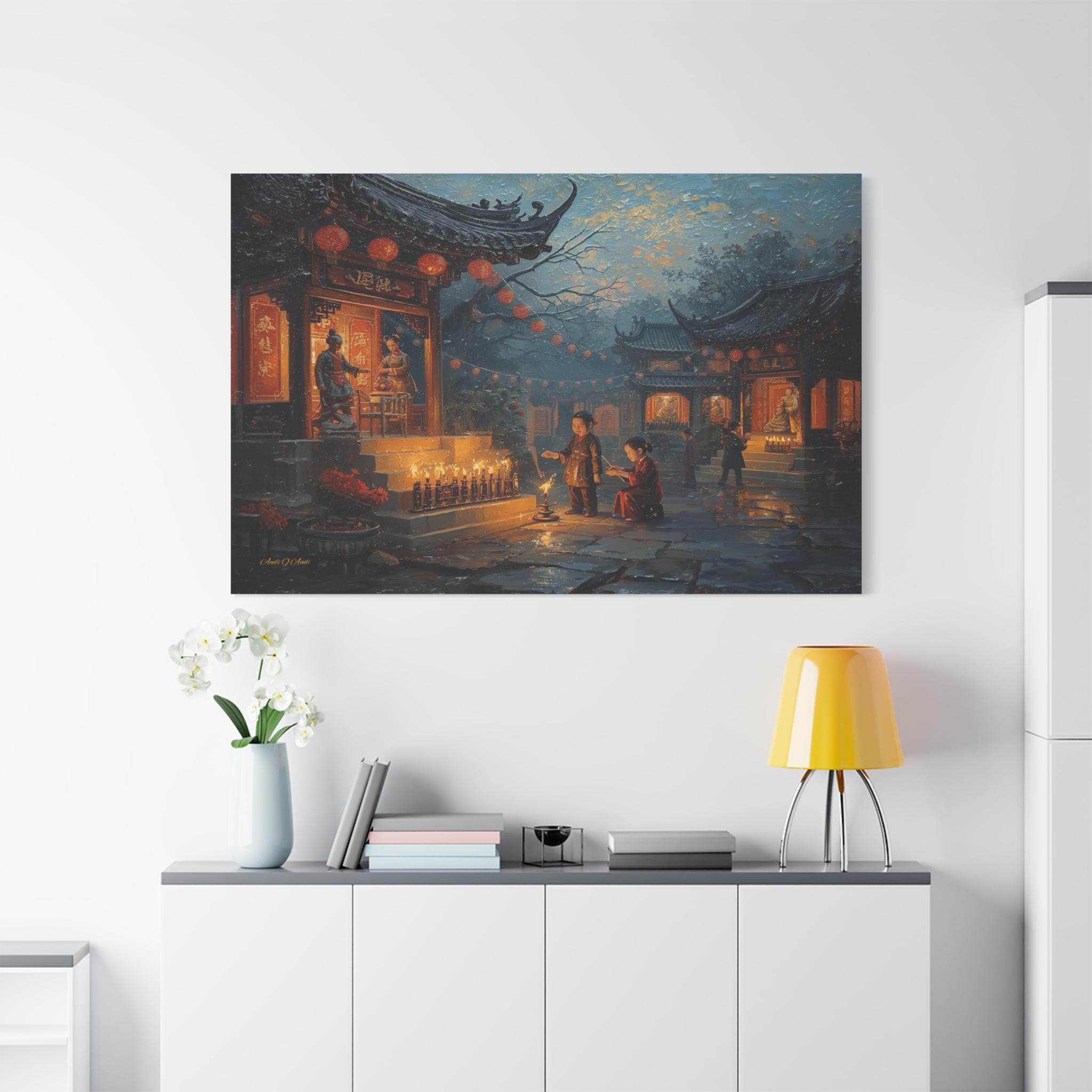 Honor the past and celebrate the light of memory with this moving canvas print of an Ancestors' Festival. This atmospheric artwork captures a tender moment in a snowy temple courtyard, where the next generation participates in the timeless ritual of remembrance.