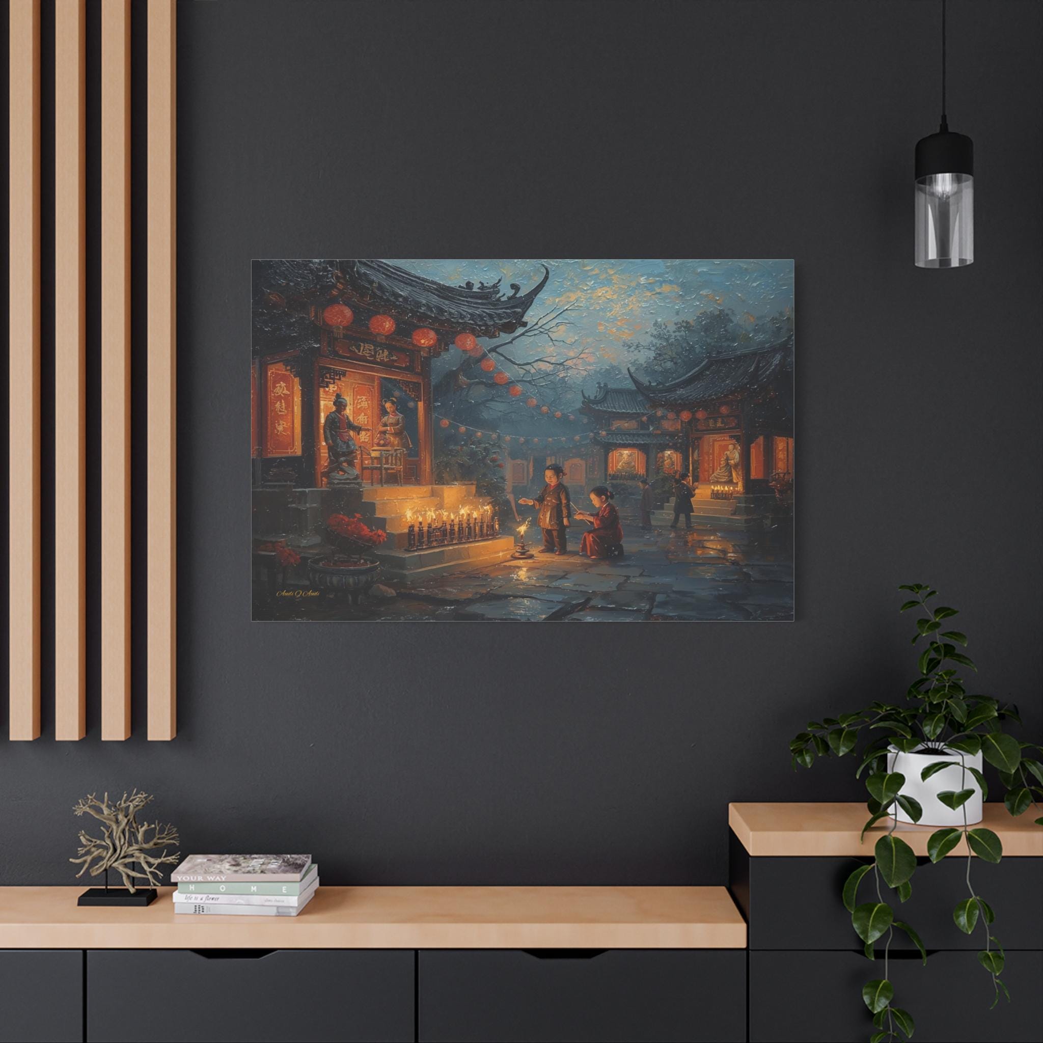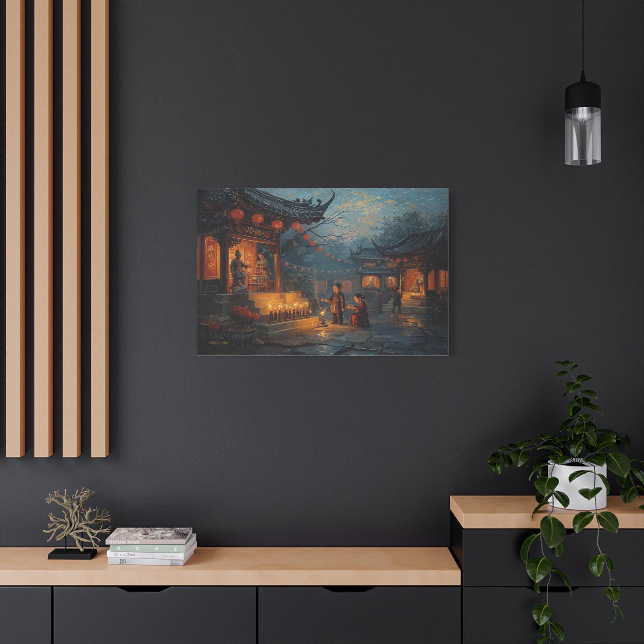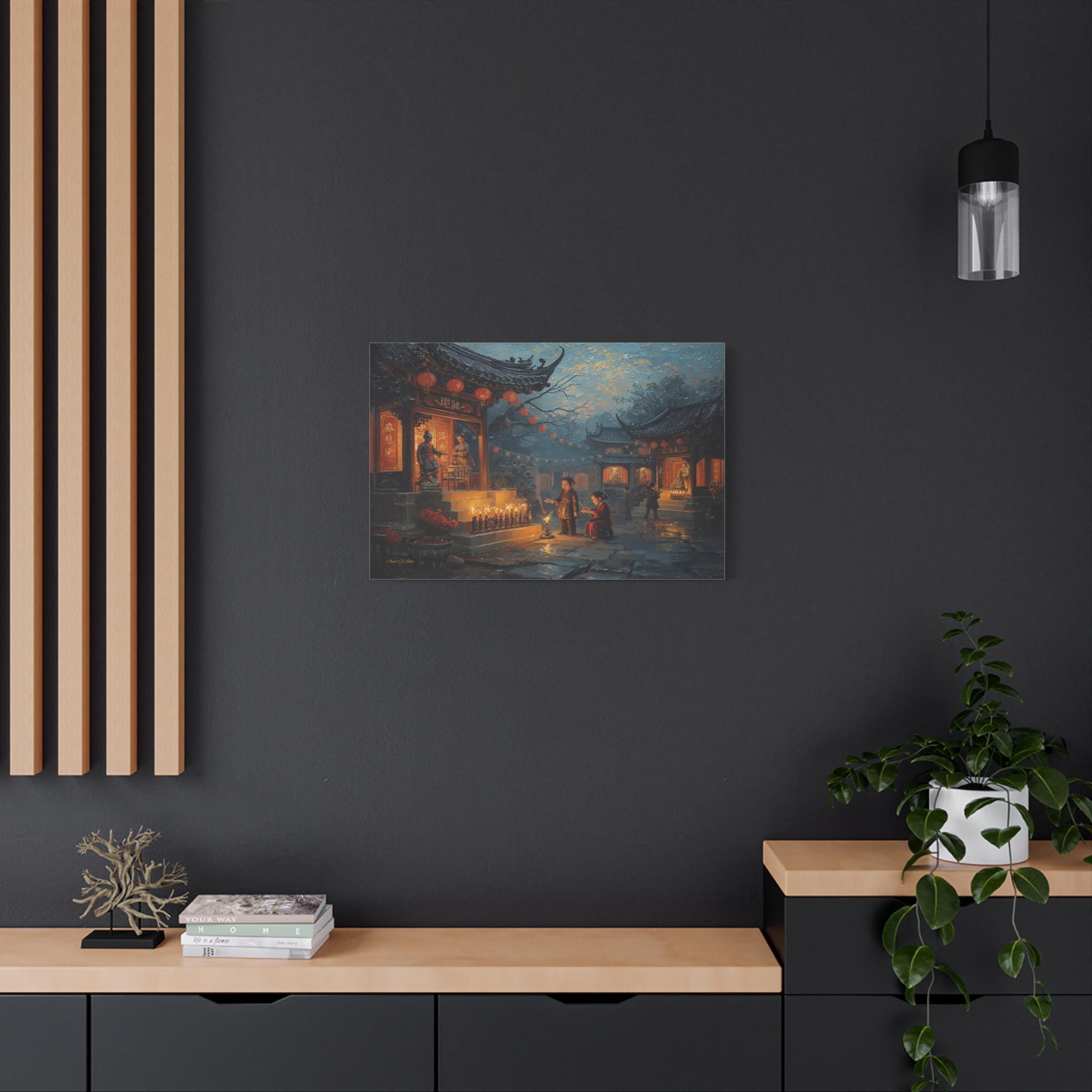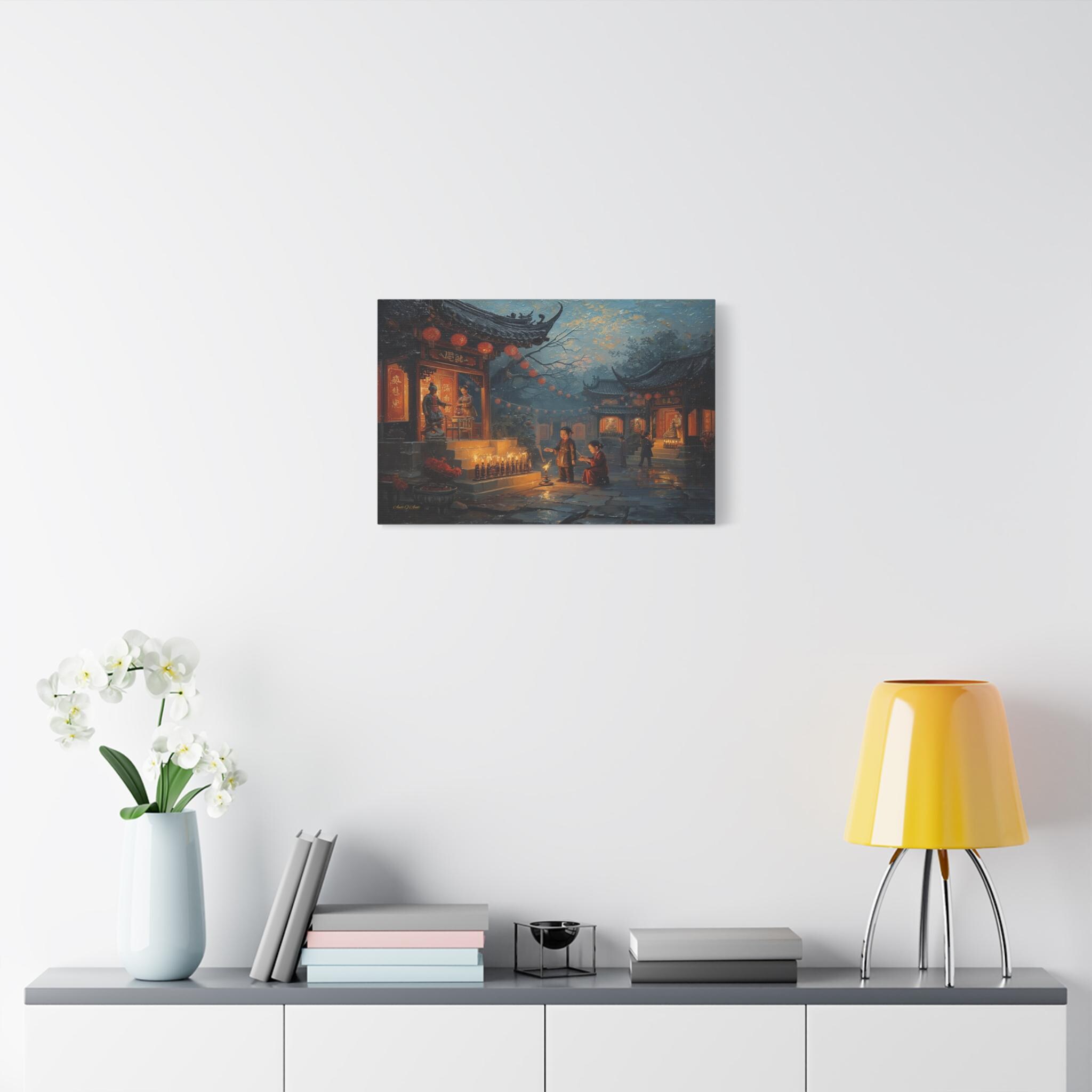 Honor the past and celebrate the light of memory with this moving canvas print of an Ancestors' Festival. This atmospheric artwork captures a tender moment in a snowy temple courtyard, where the next generation participates in the timeless ritual of remembrance.