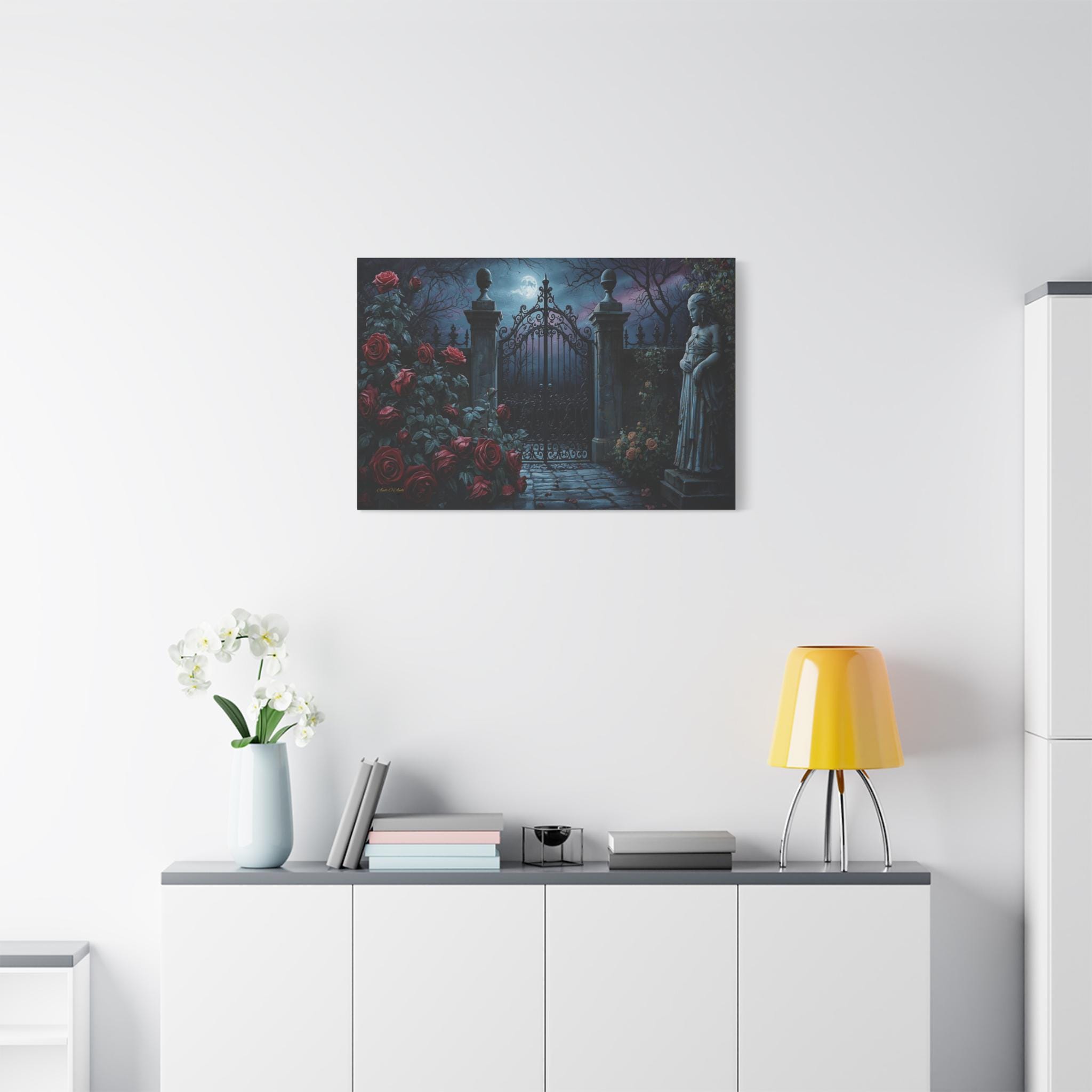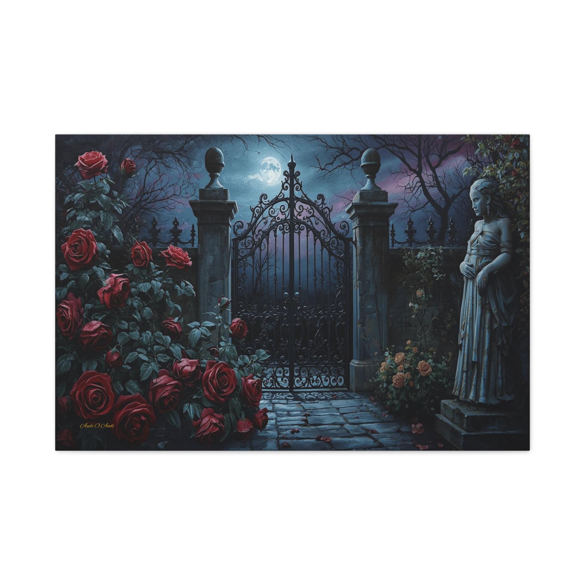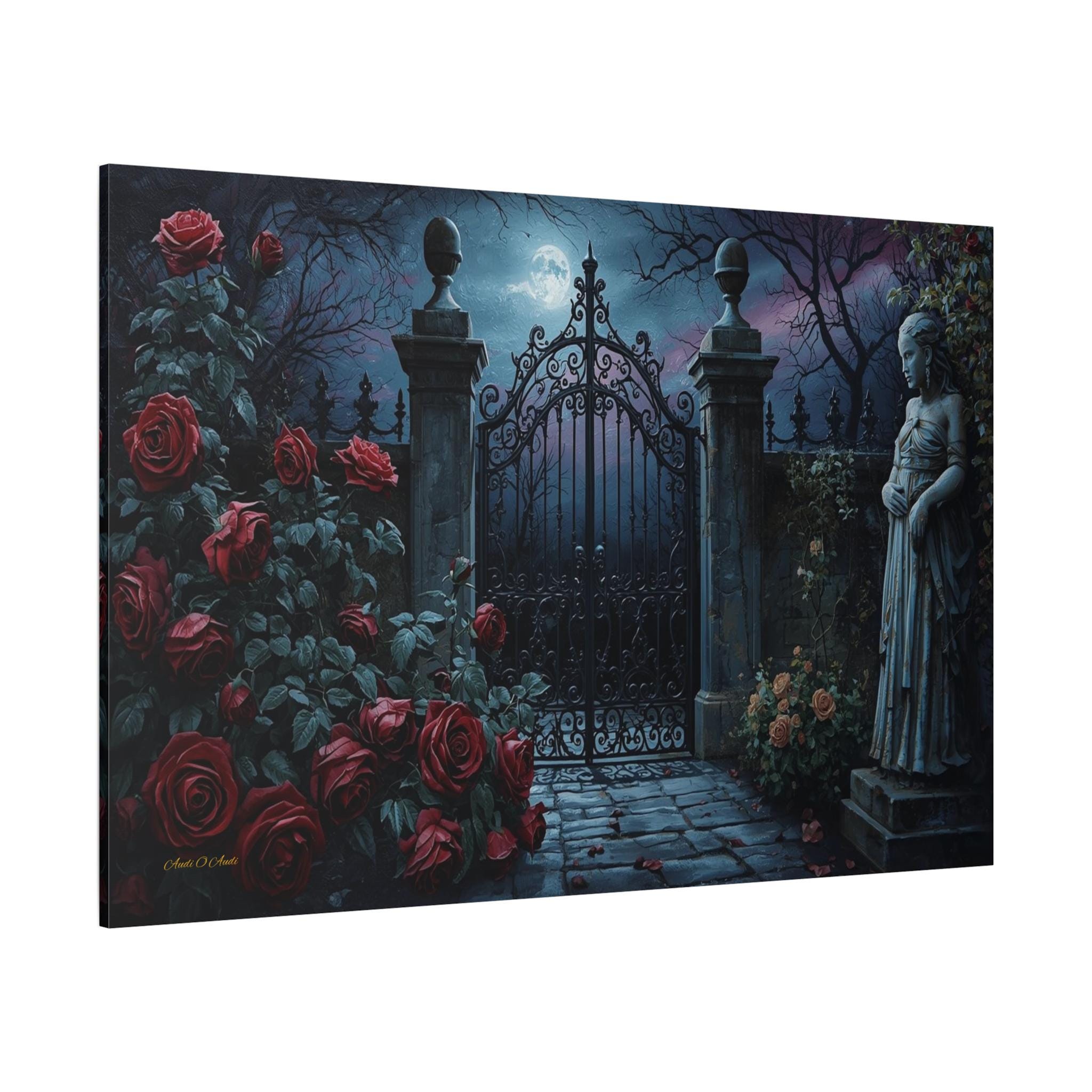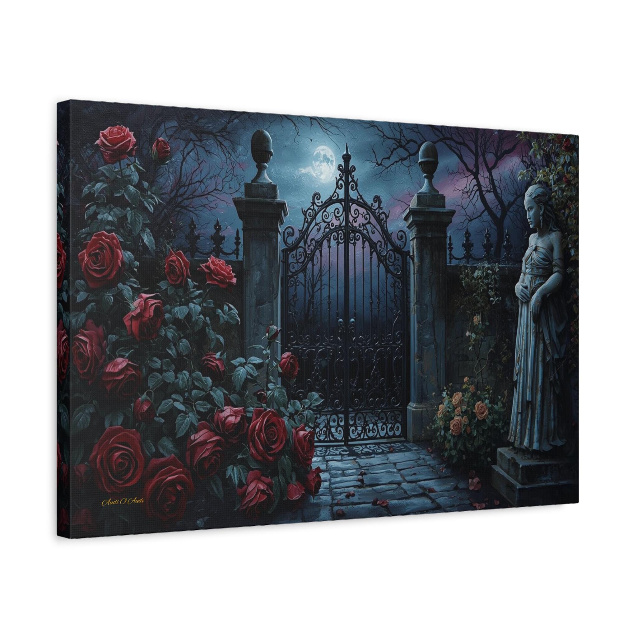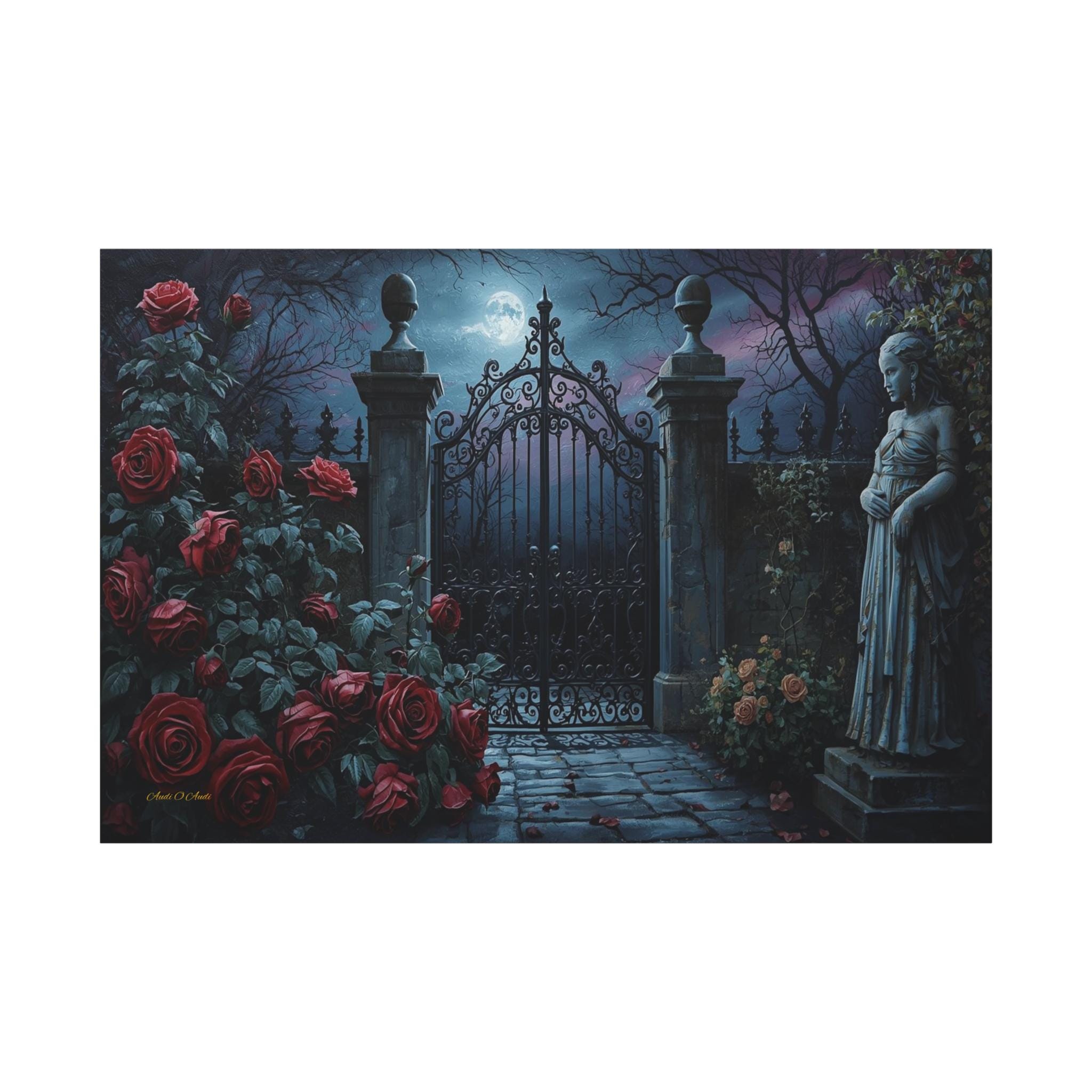 Unlock the mystery of the night with this enchanting canvas print of a secret garden gate. This moody, atmospheric artwork captures a heavy, ornate iron gate standing closed under the light of a full moon, shrouded in midnight mist.