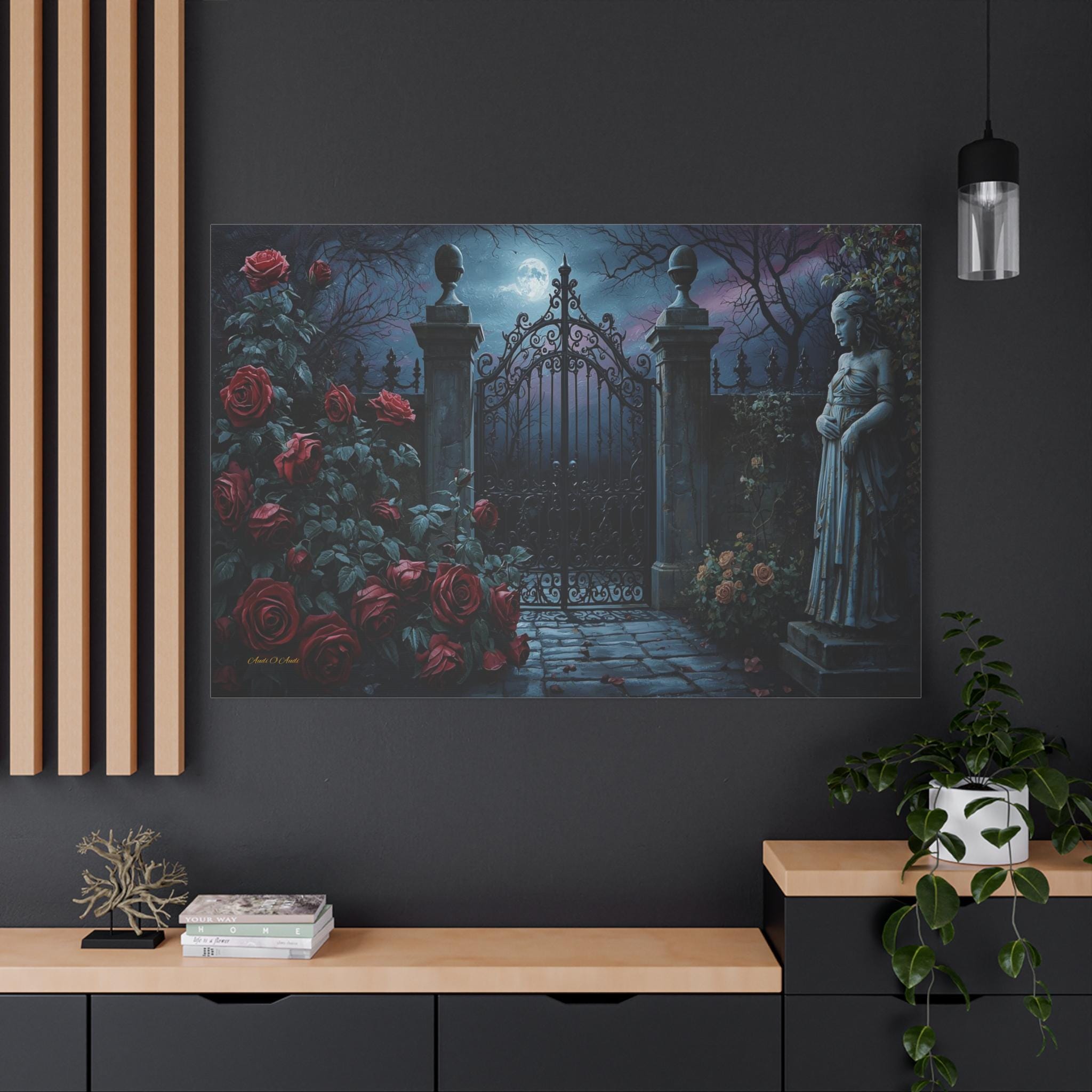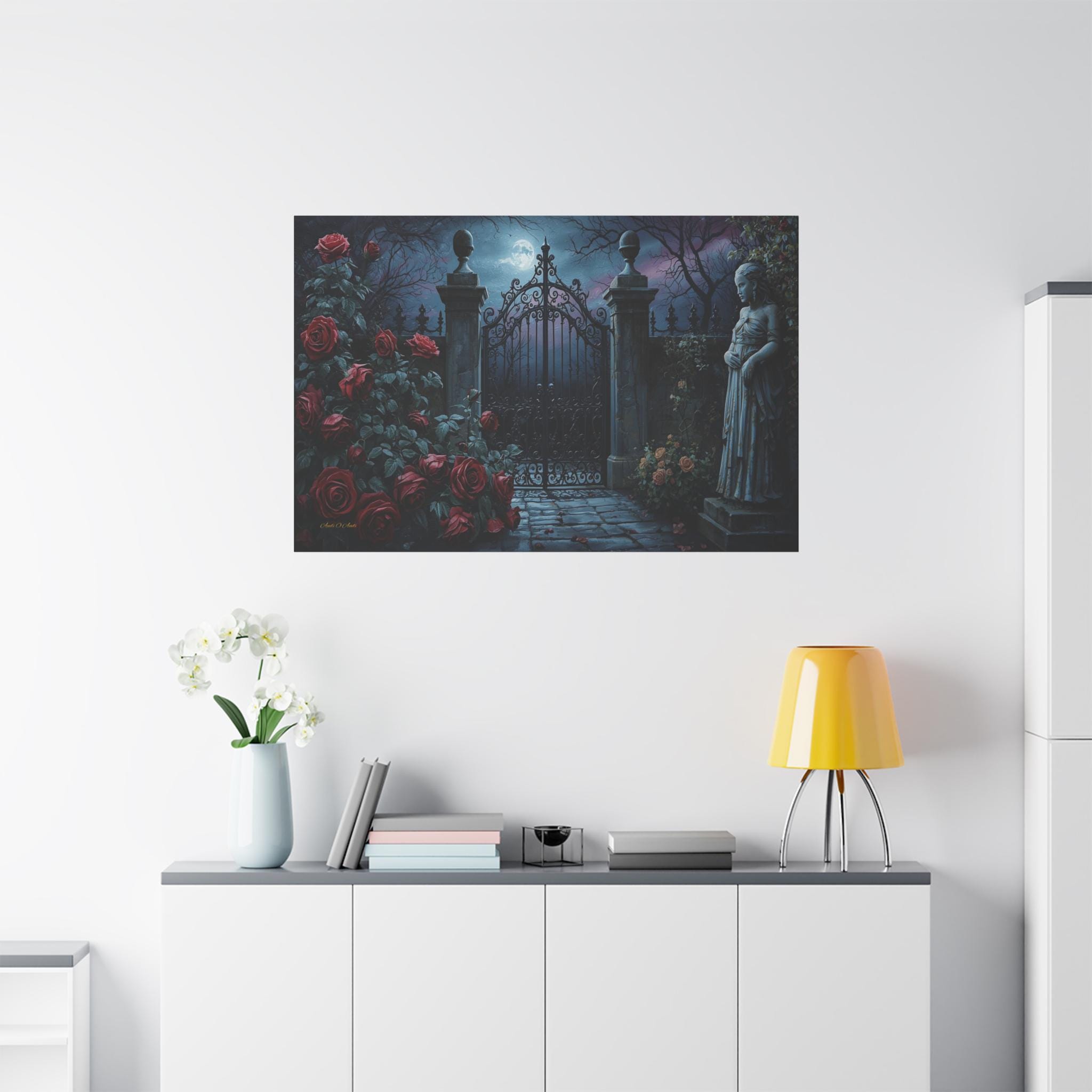 60" x 40" (Tip: The detailed storytelling of this piece looks best in larger formats like 48" x 32", where the roses and the moon really stand out.)