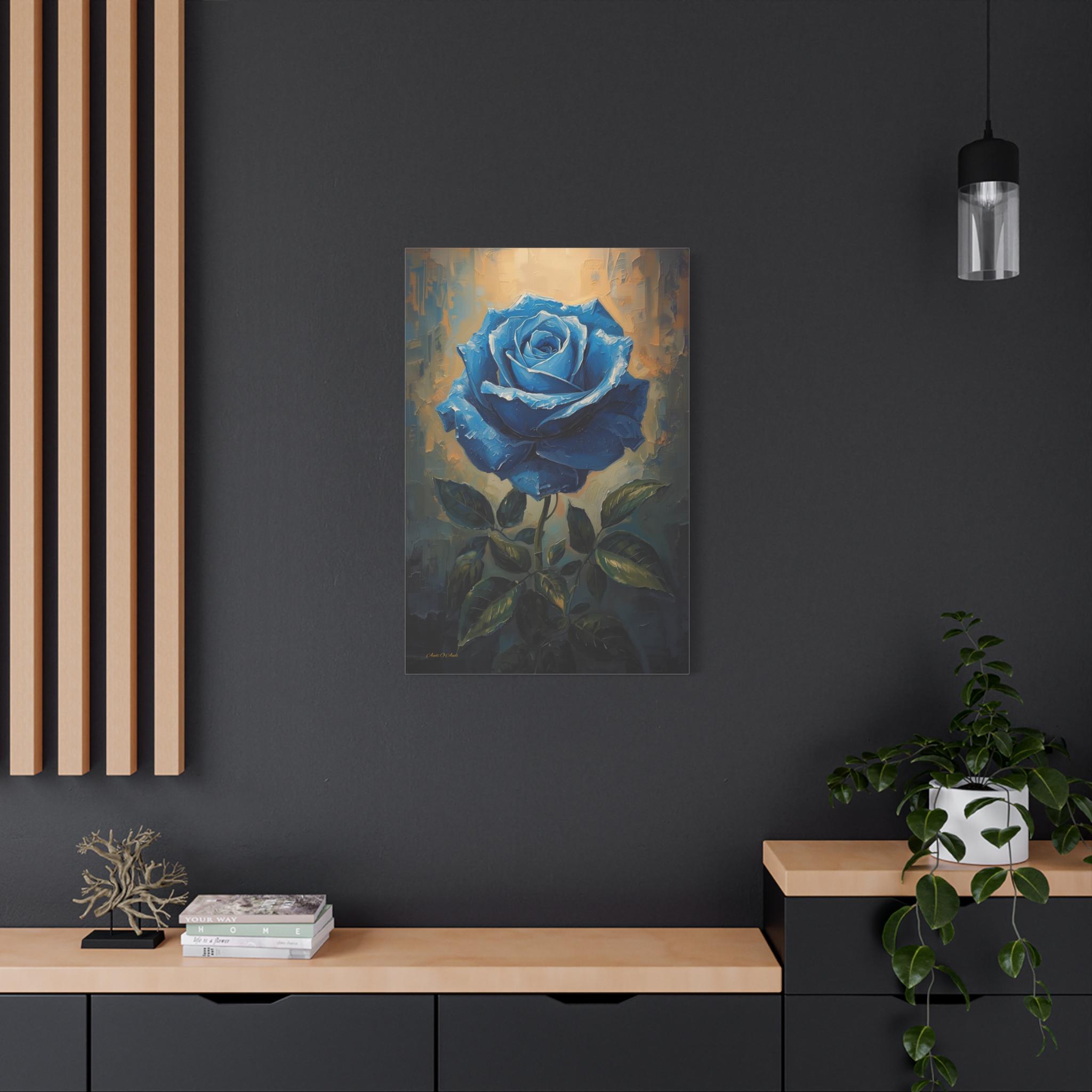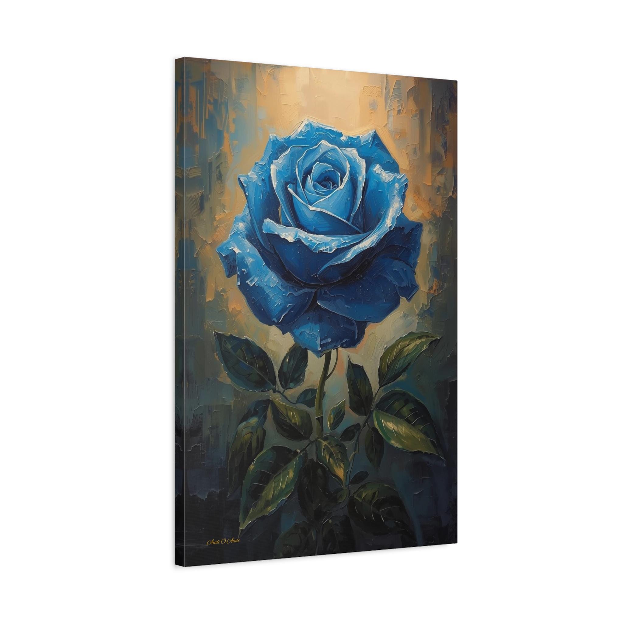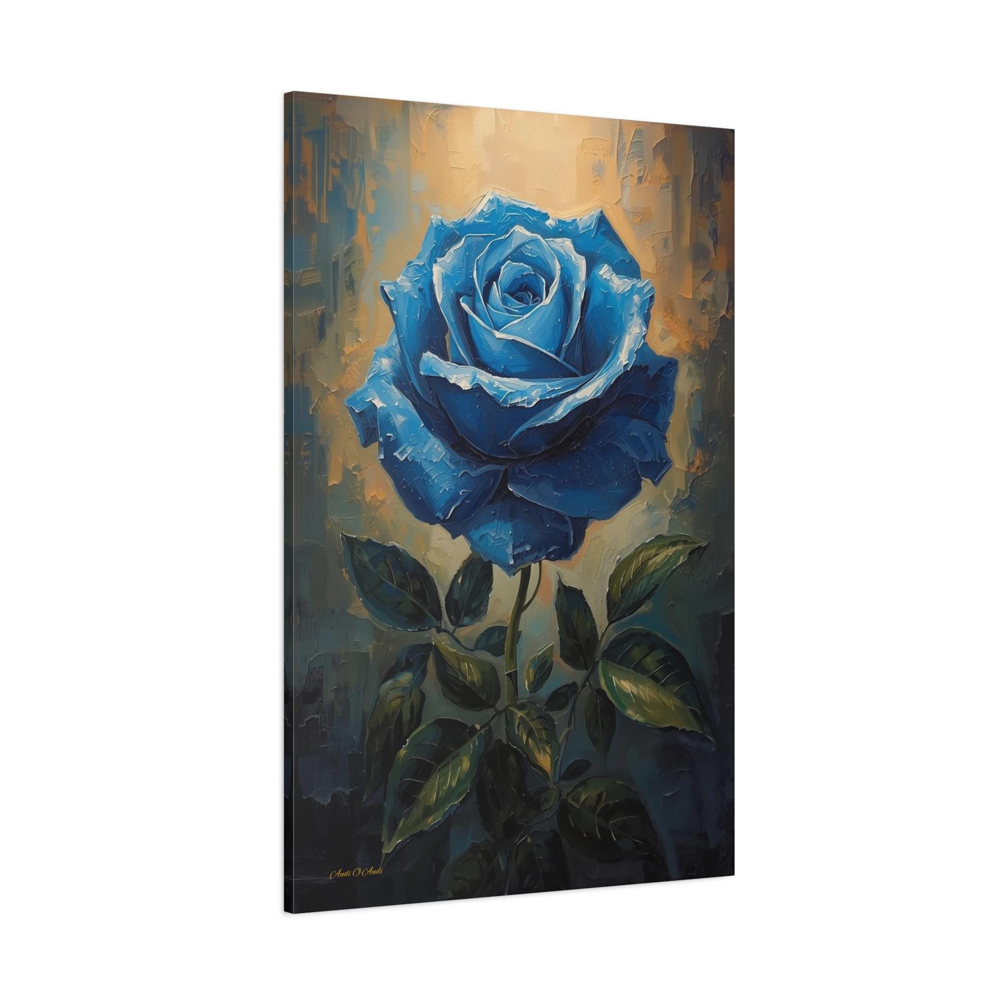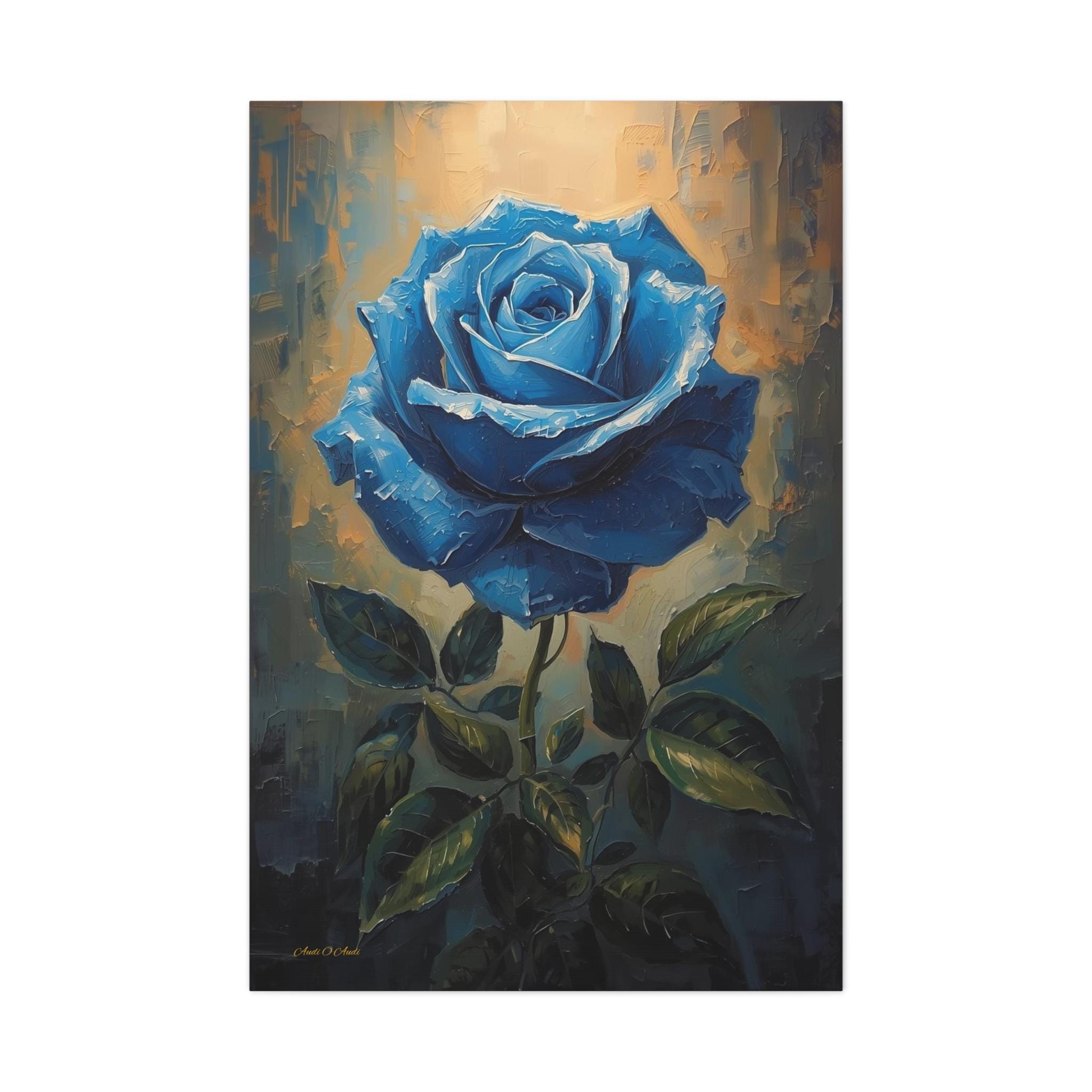Capture the allure of the impossible with this stunning canvas print of a blooming Blue Rose. A symbol of mystery and unique beauty, this artwork features a large, majestic rose in shades of deep sapphire, cerulean, and icy blue, set against a warm, abstract background of gold and ochre.